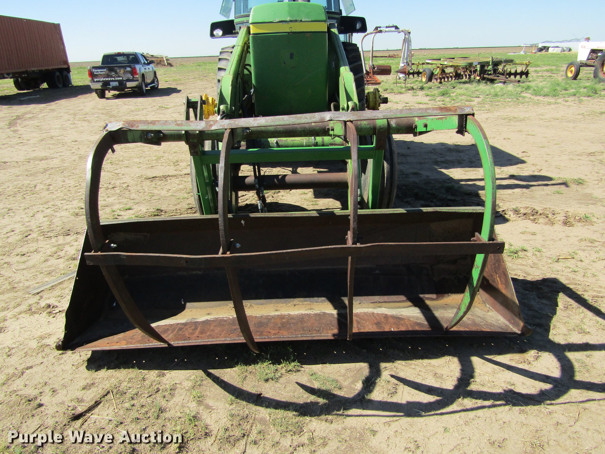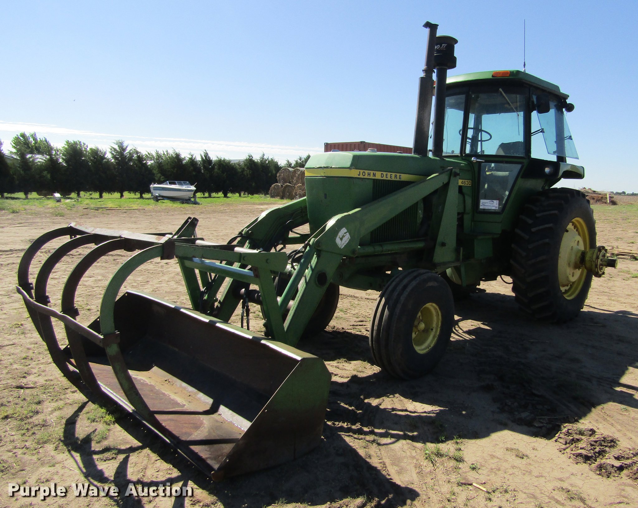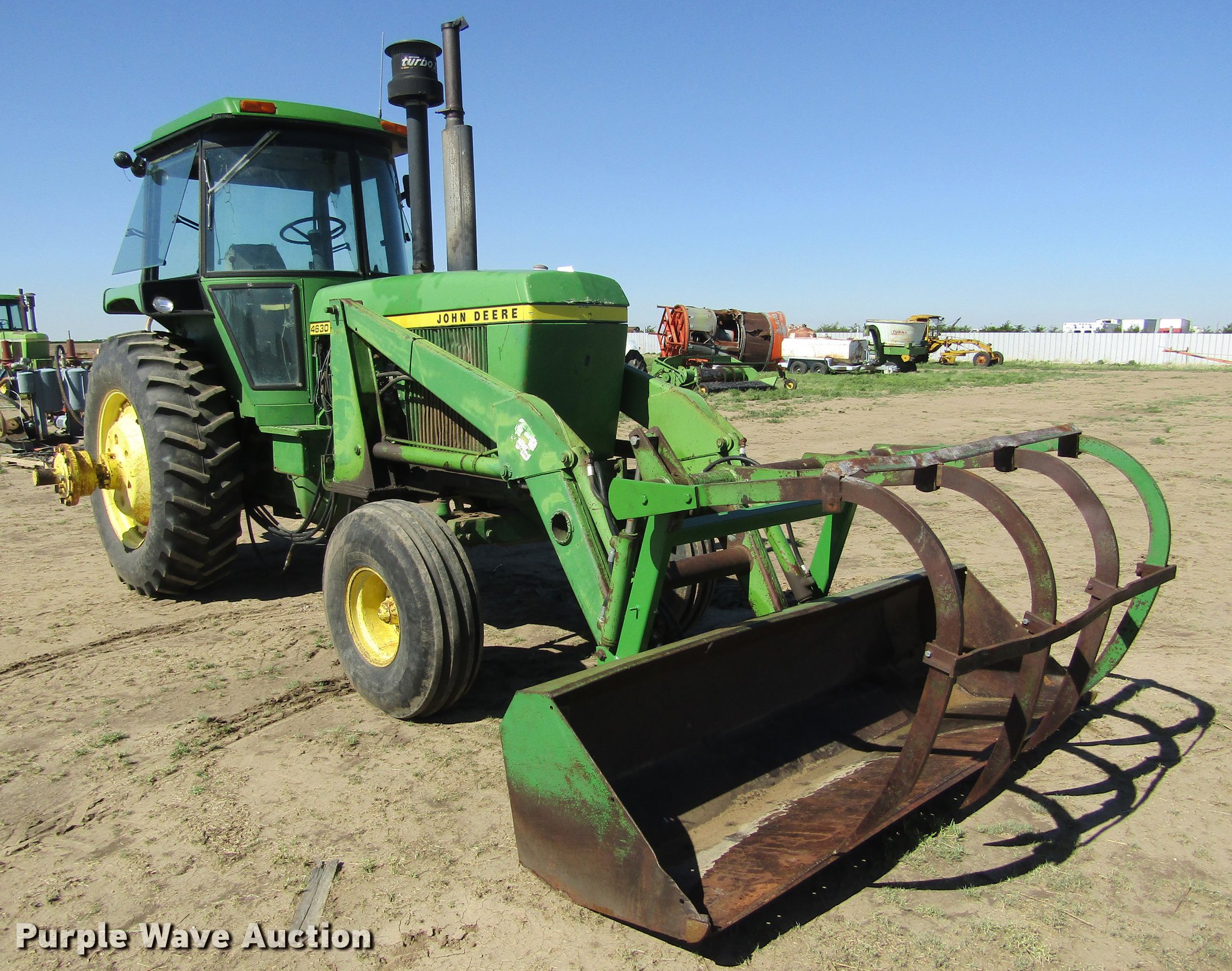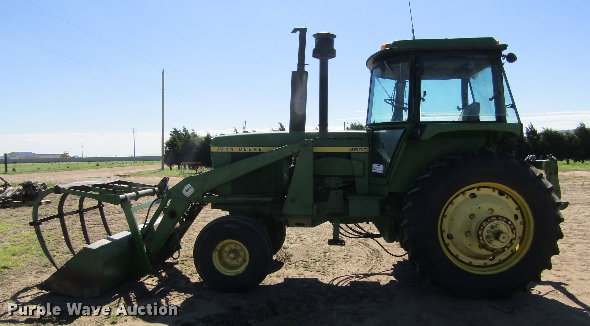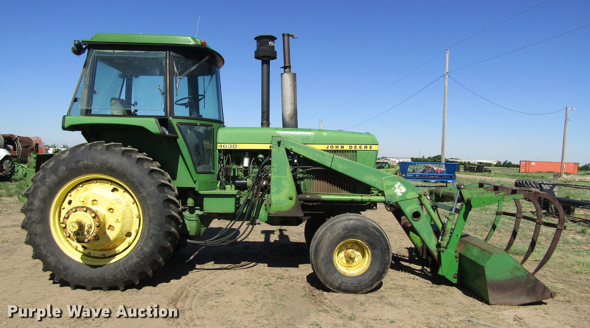 Purple Wave is selling a used Tractor in Kansas. This item is a 1977 John Deere 4630 tractor with the following: 3,495 hours on meter, John Deere 6404 six cylinder turbo diesel engine, Serial 539353RG, Quad-Range transmission, Tilt steering wheel, AM/FM, Suspension seat, John Deere 158 loader, 96"W grapple bucket, Three-lever controls, Three point, Top link, Quick attach, 540 PTO, (3) rear hydraulic remote sets, 11.00-16L front tires, 18.4-38 dual rear tires, Dual tires are not installed, Serial 028912R