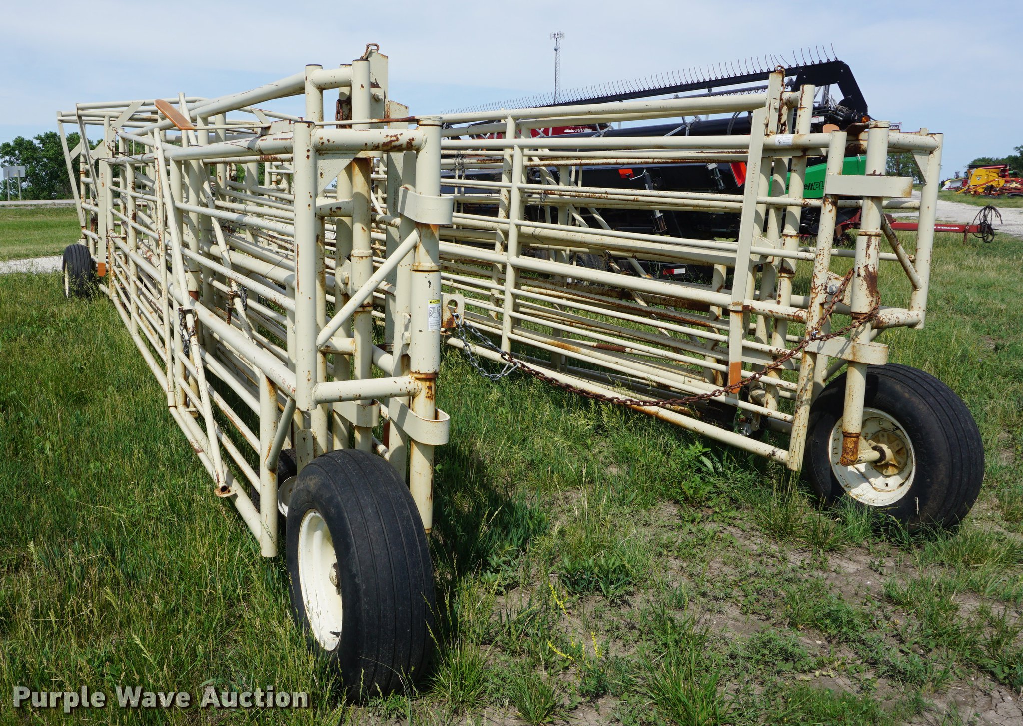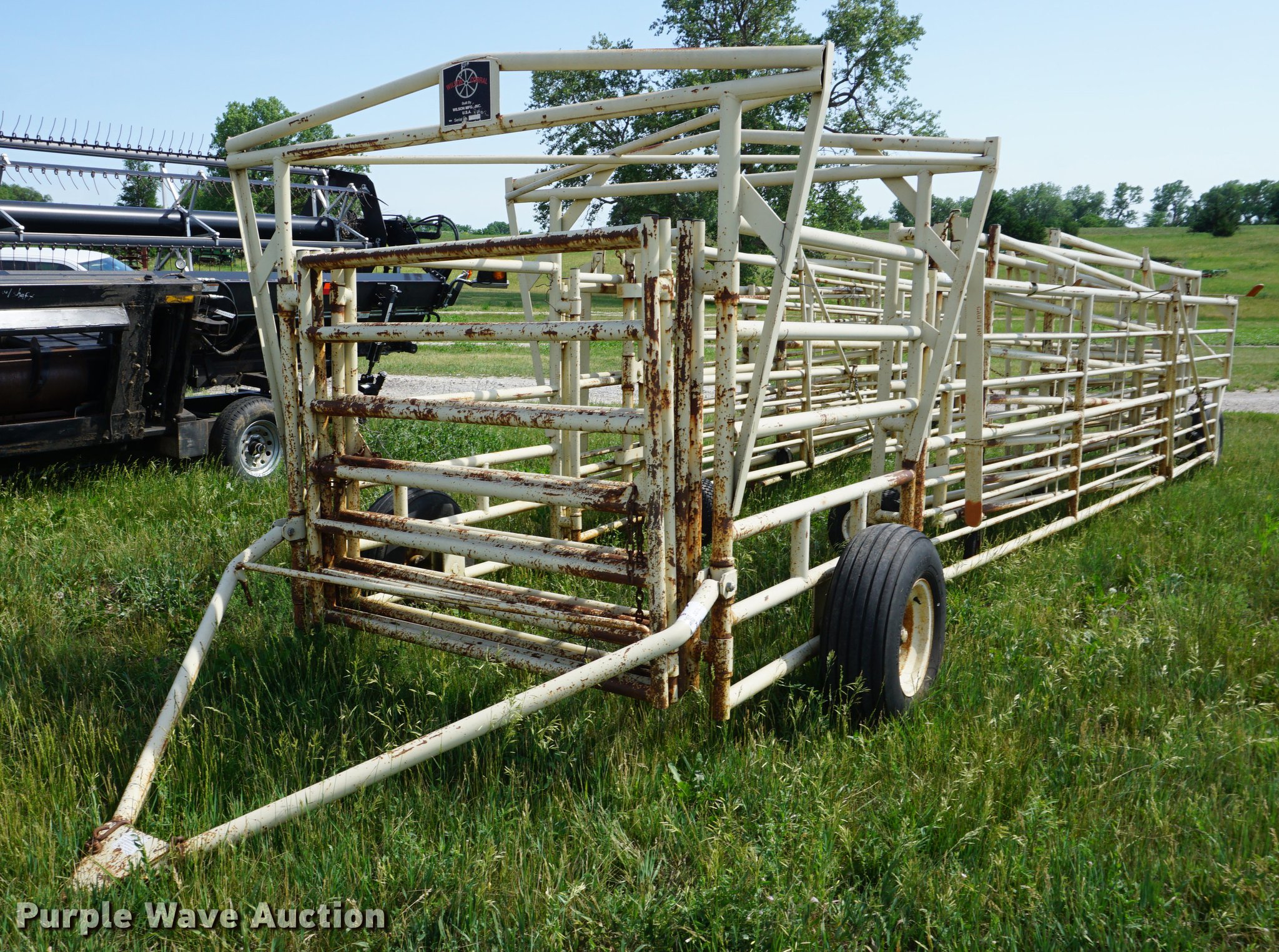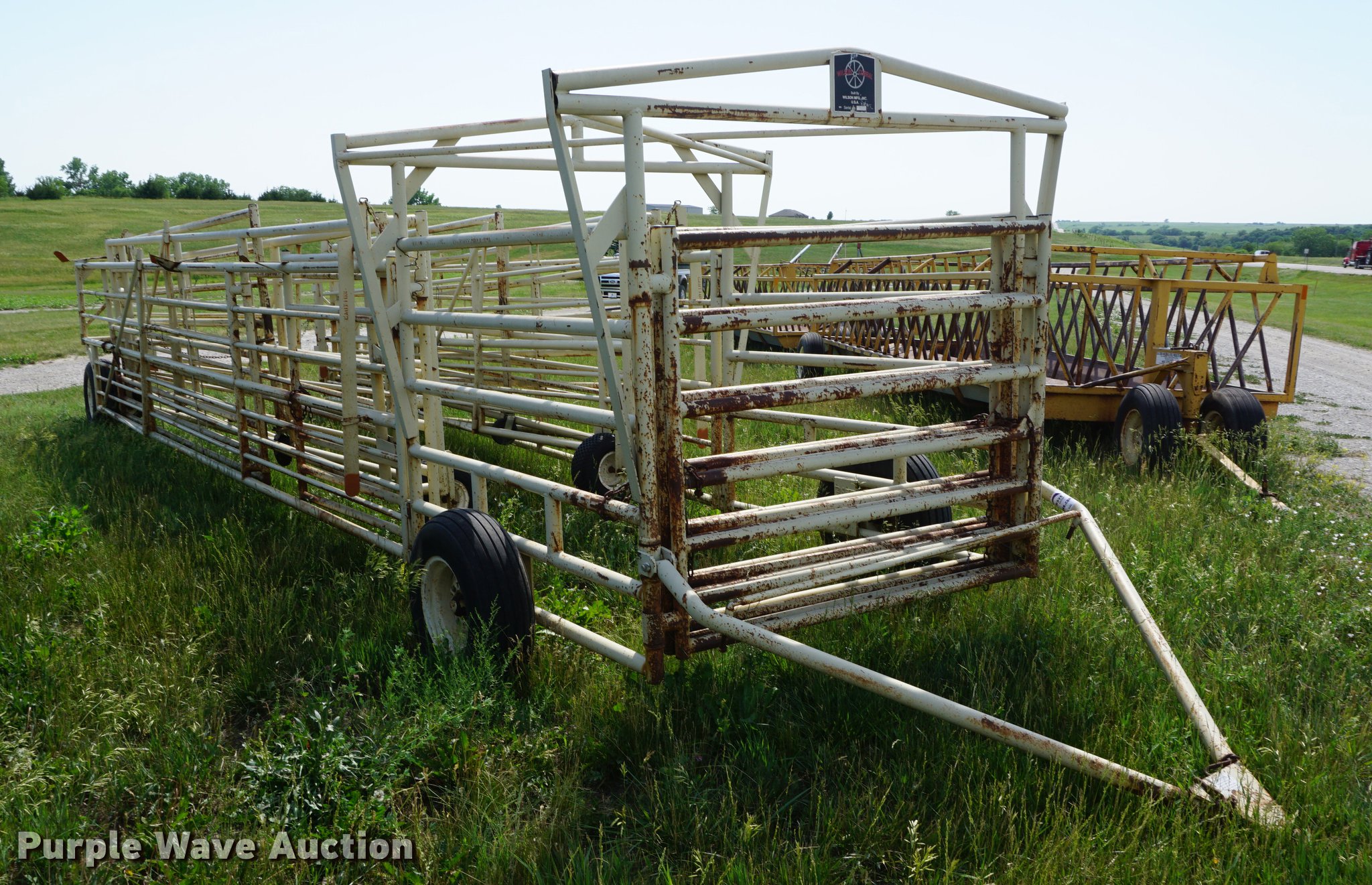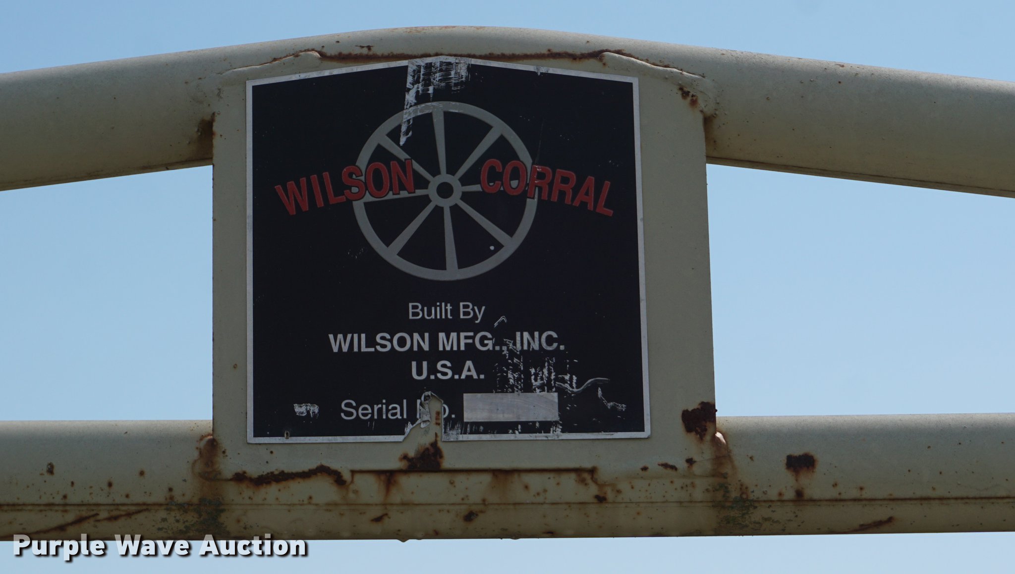 Purple Wave is selling a used Livestock Equip. in Kansas. This item is a Wilson wheel corral with the following: Approx. 80' wing length, Fold-away tongue, 11L-15 tires, Serial 3898