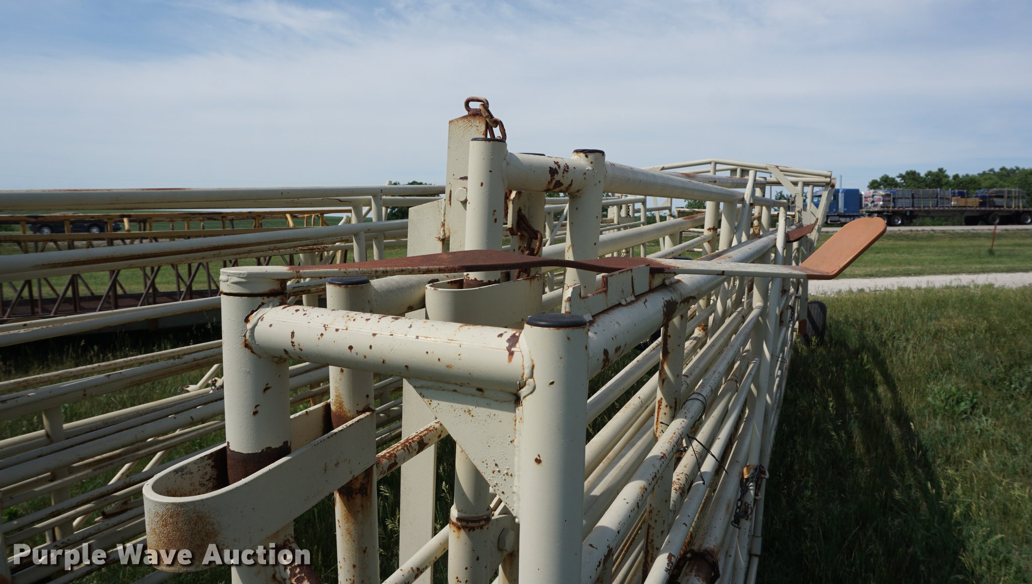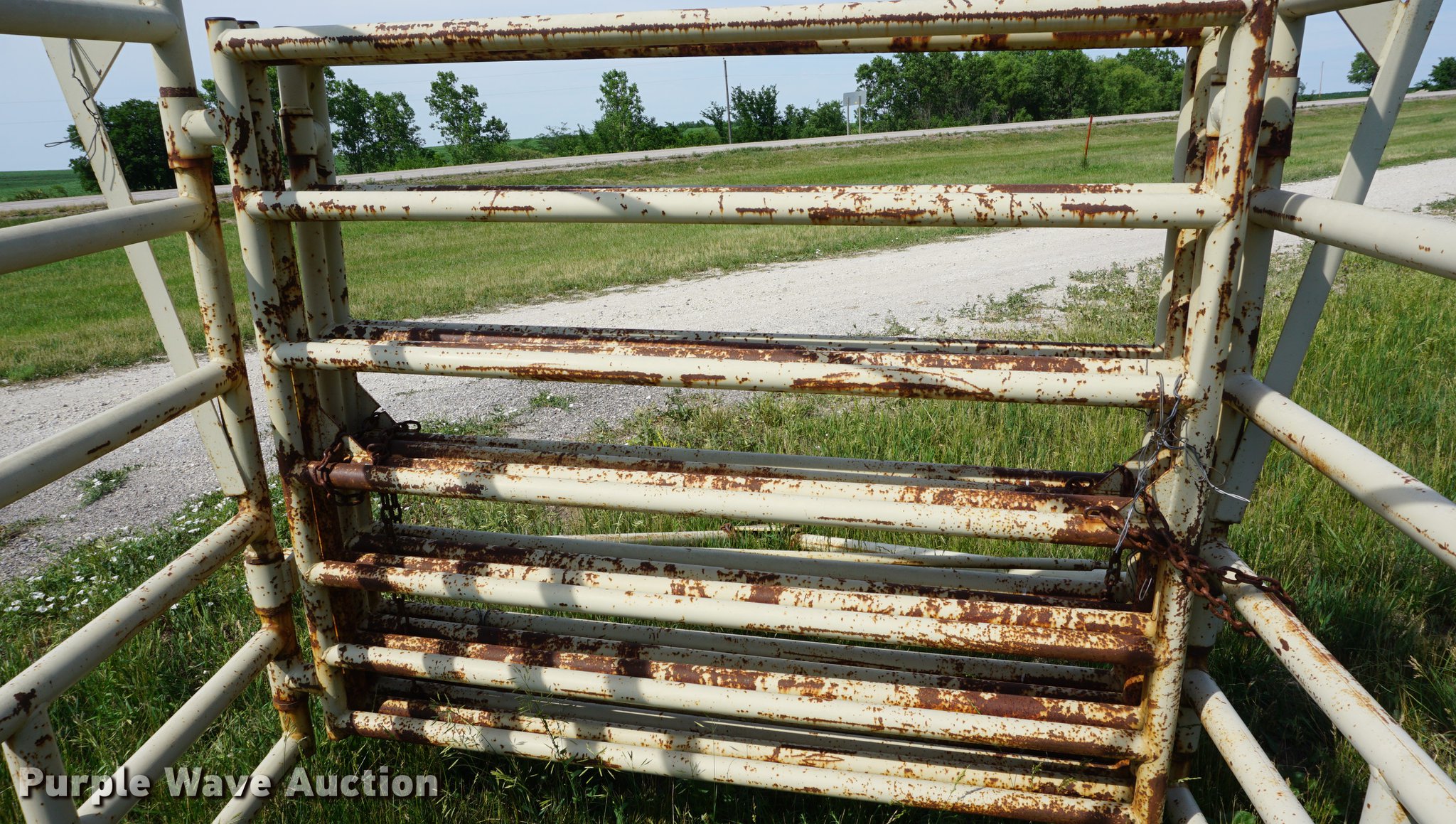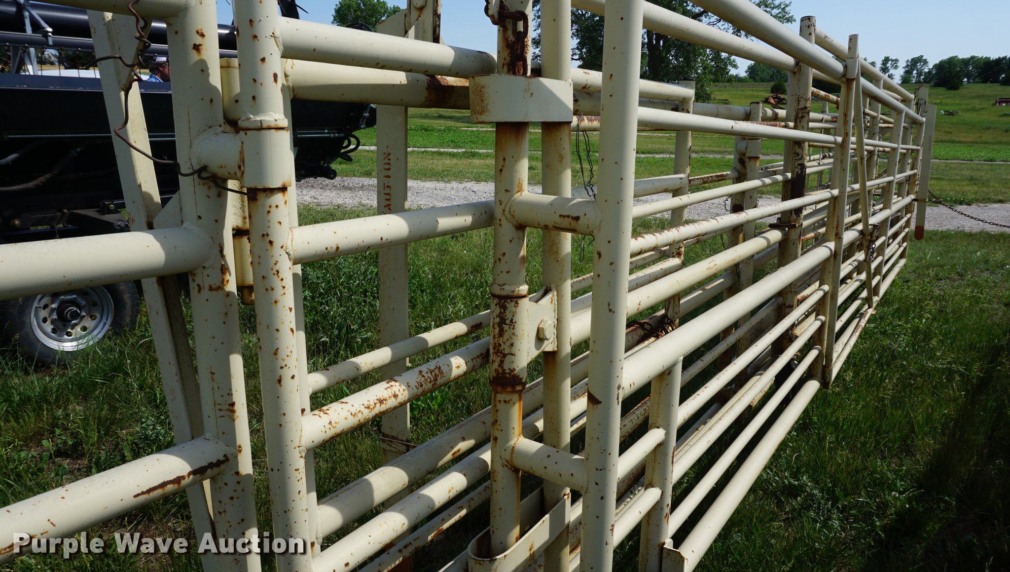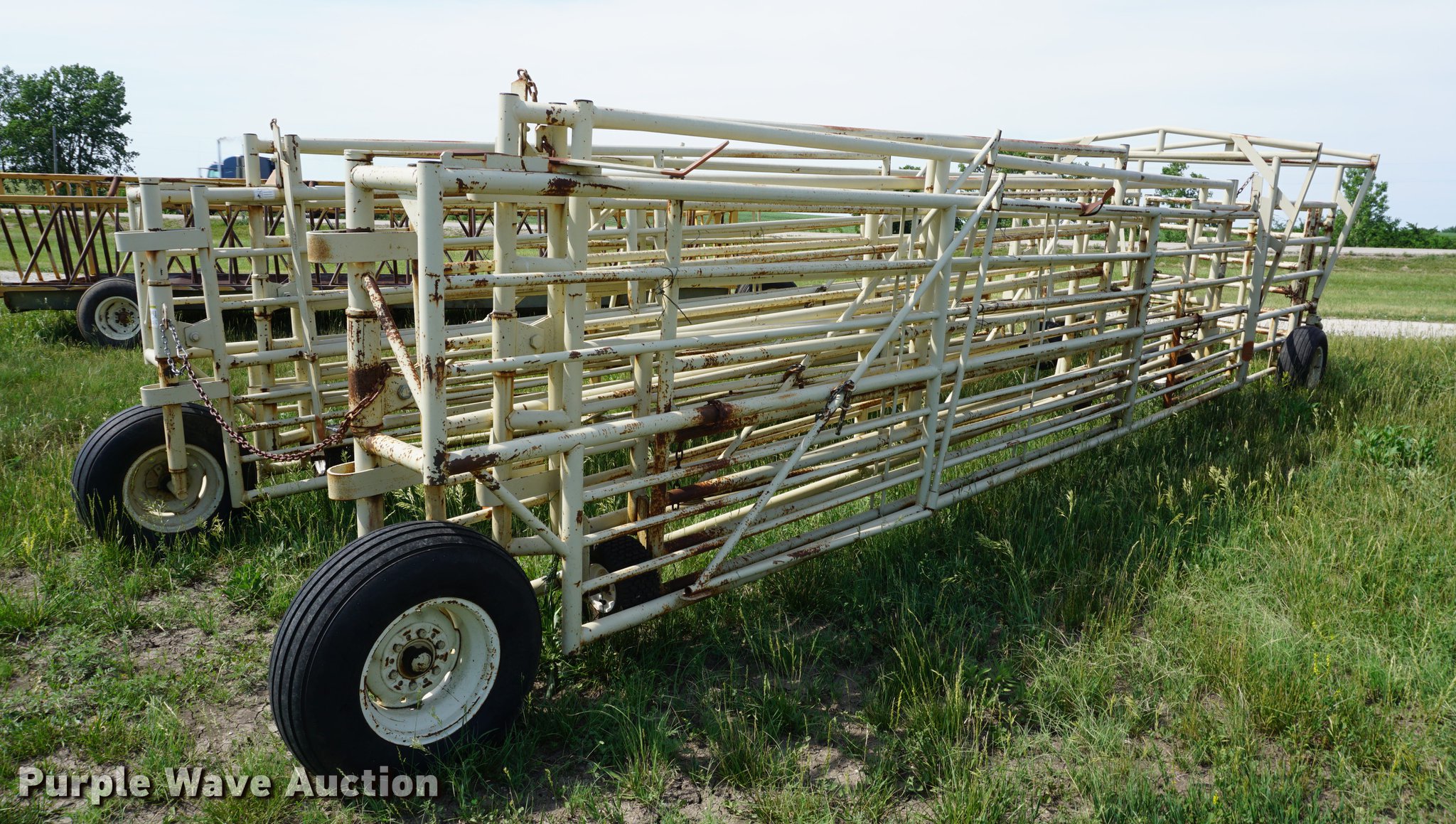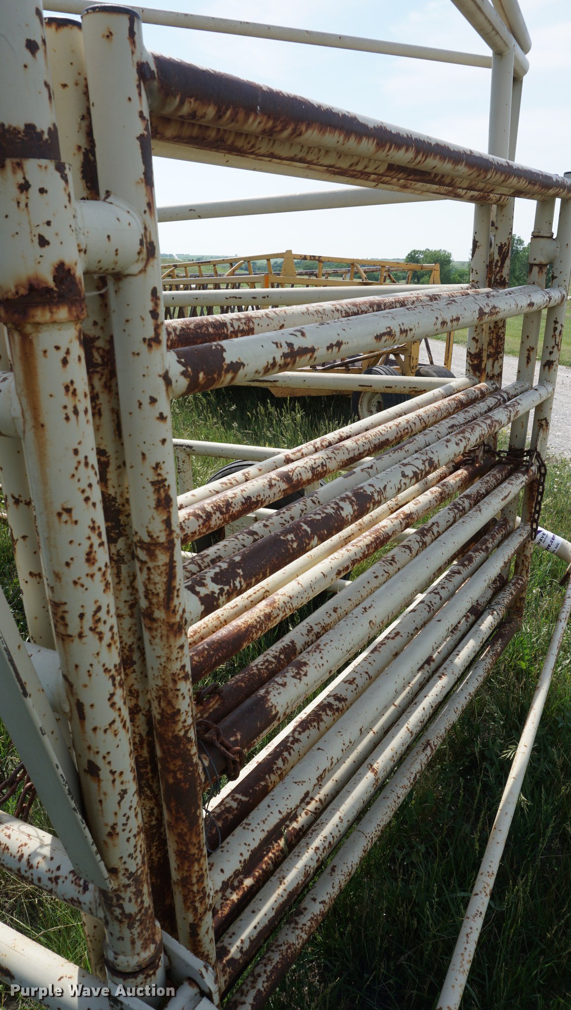Purple Wave is selling a used Livestock Equip. in Kansas. This item is a Wilson wheel corral with the following: Approx. 80' wing length, Fold-away tongue, 11L-15 tires, Serial 3898