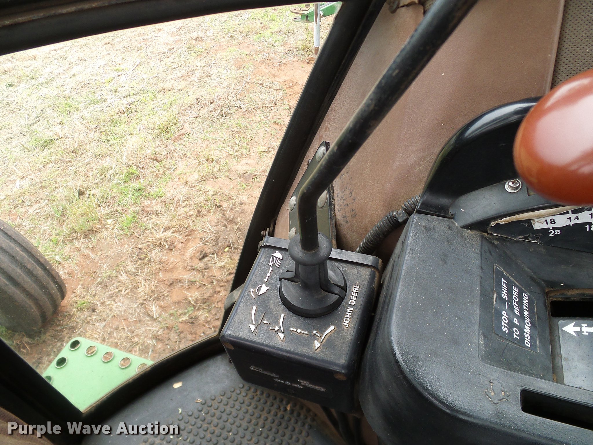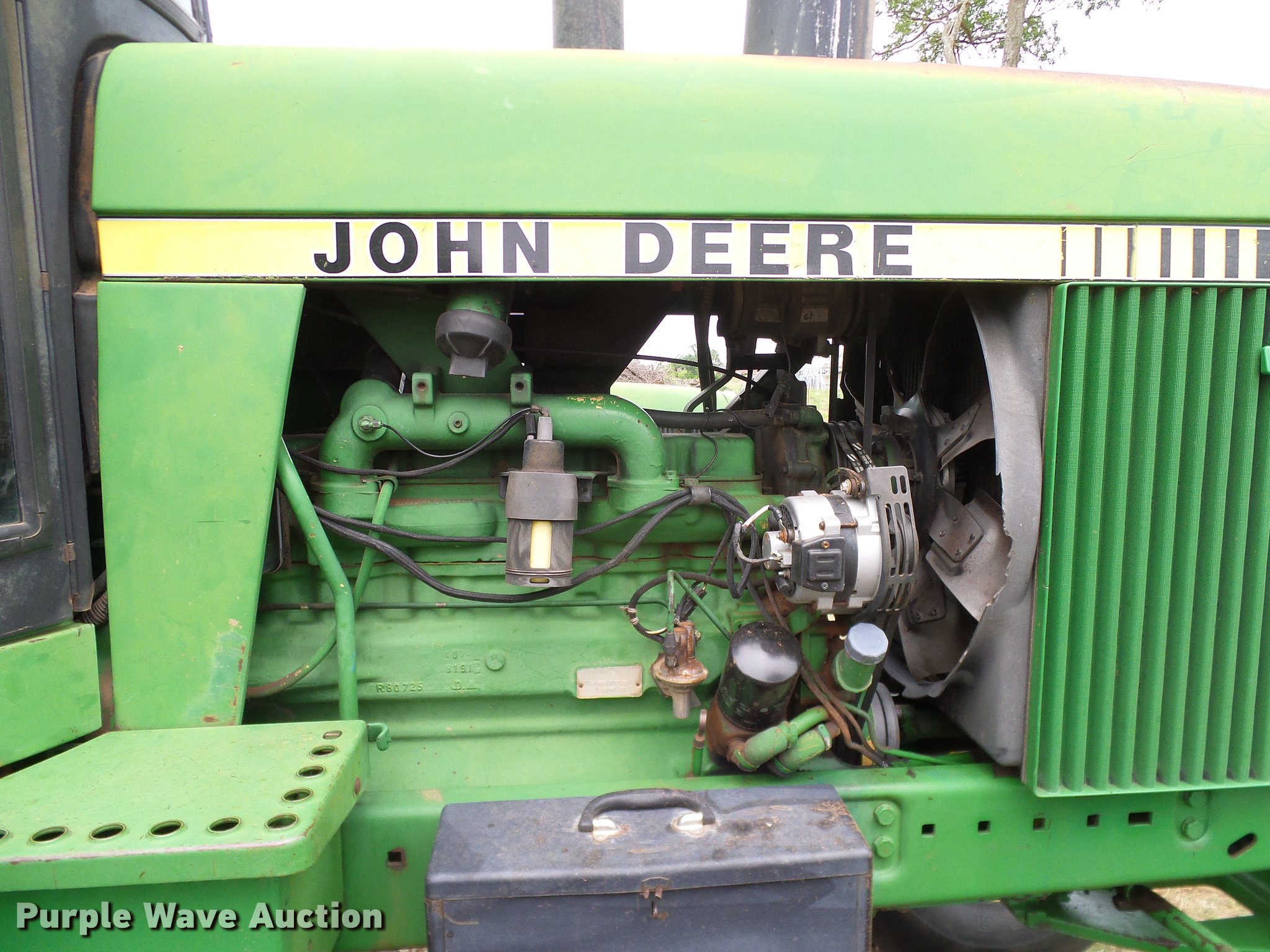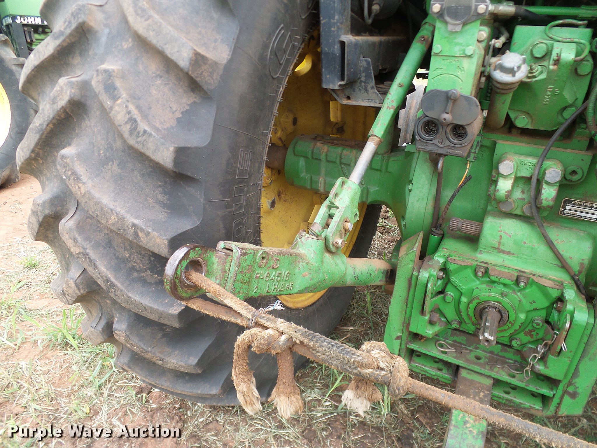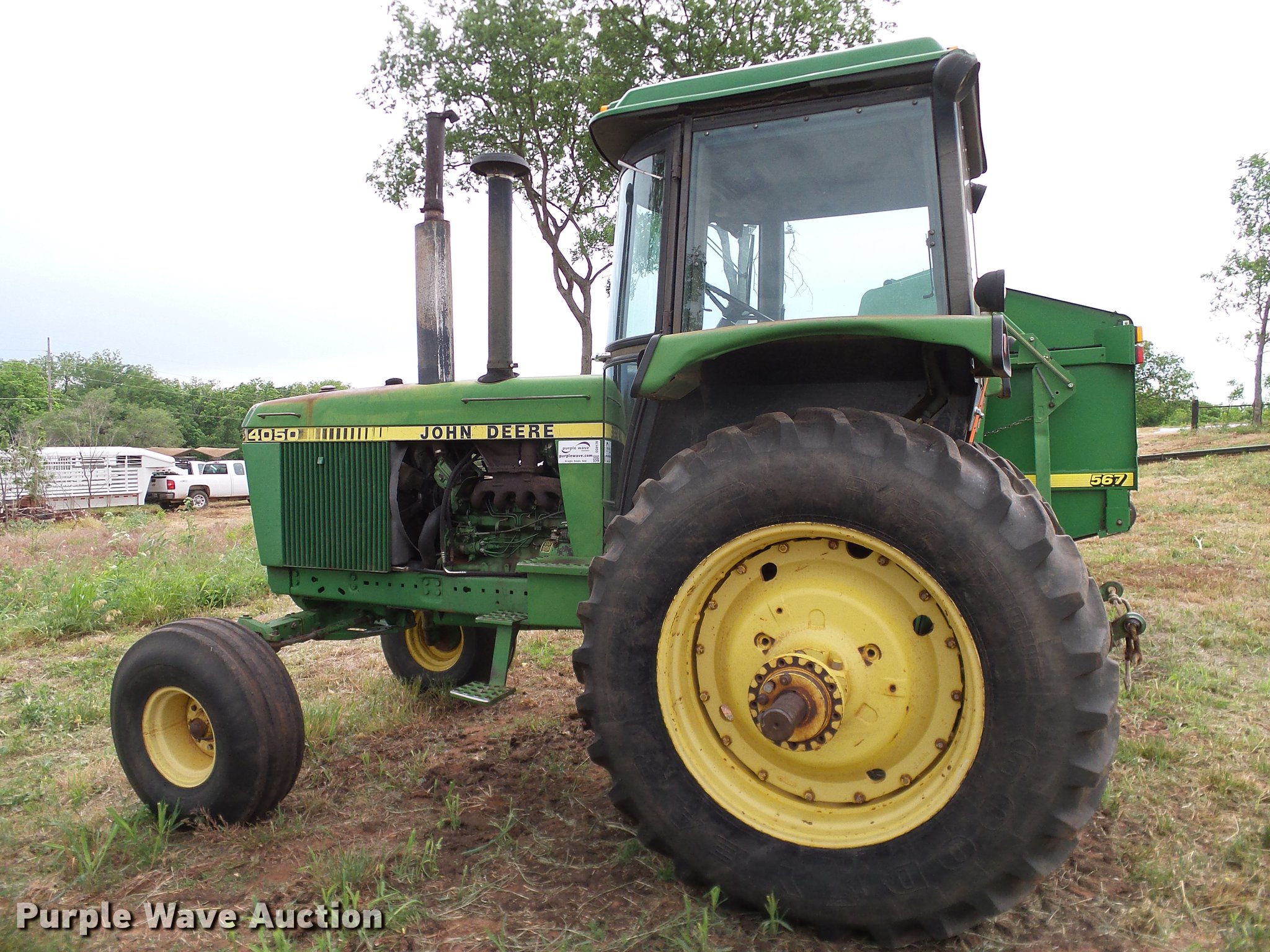 Purple Wave is selling a used Tractor in Oklahoma. This item is a John Deere 4050 tractor with the following: 7,602 hours on meter, John Deere L3599R-001 six cylinder turbo diesel engine, Serial CD63597791289, Powershift transmission, 15F-4R gears, AC and heat, Tilt steering wheel, AM/FM, Suspension seat, Joystick loader controls, Seven pin outlet, 540 PTO, ISO electrical outlet, (2) front hydraulic remotes, (3) rear hydraulic remotes, 11.00-16 front tires, 480/80R38 rear tires, Sale# 1902-KP, Serial RWA4050P008846