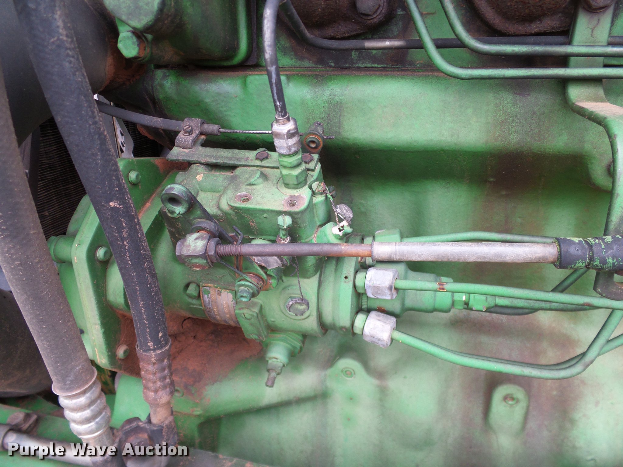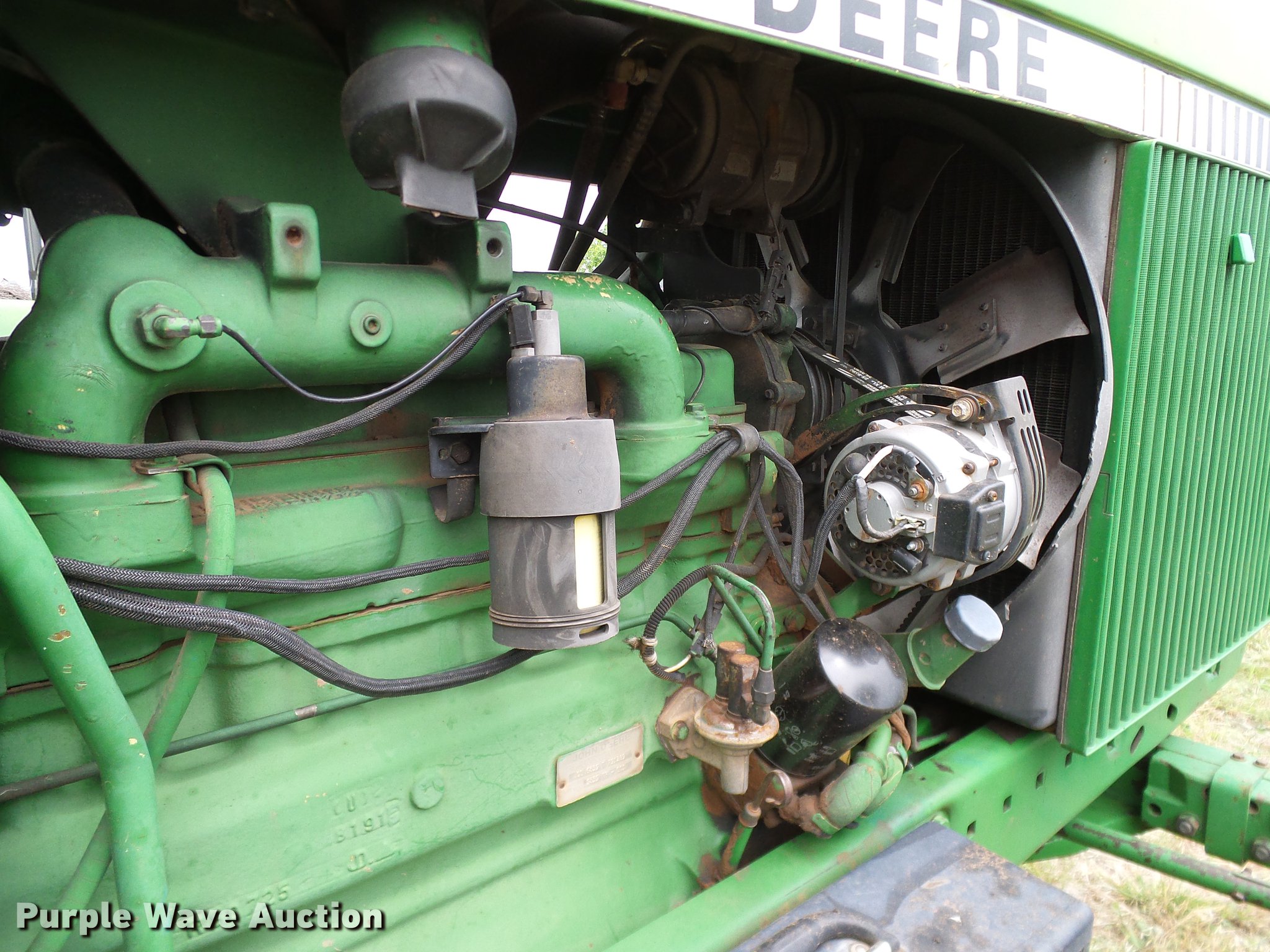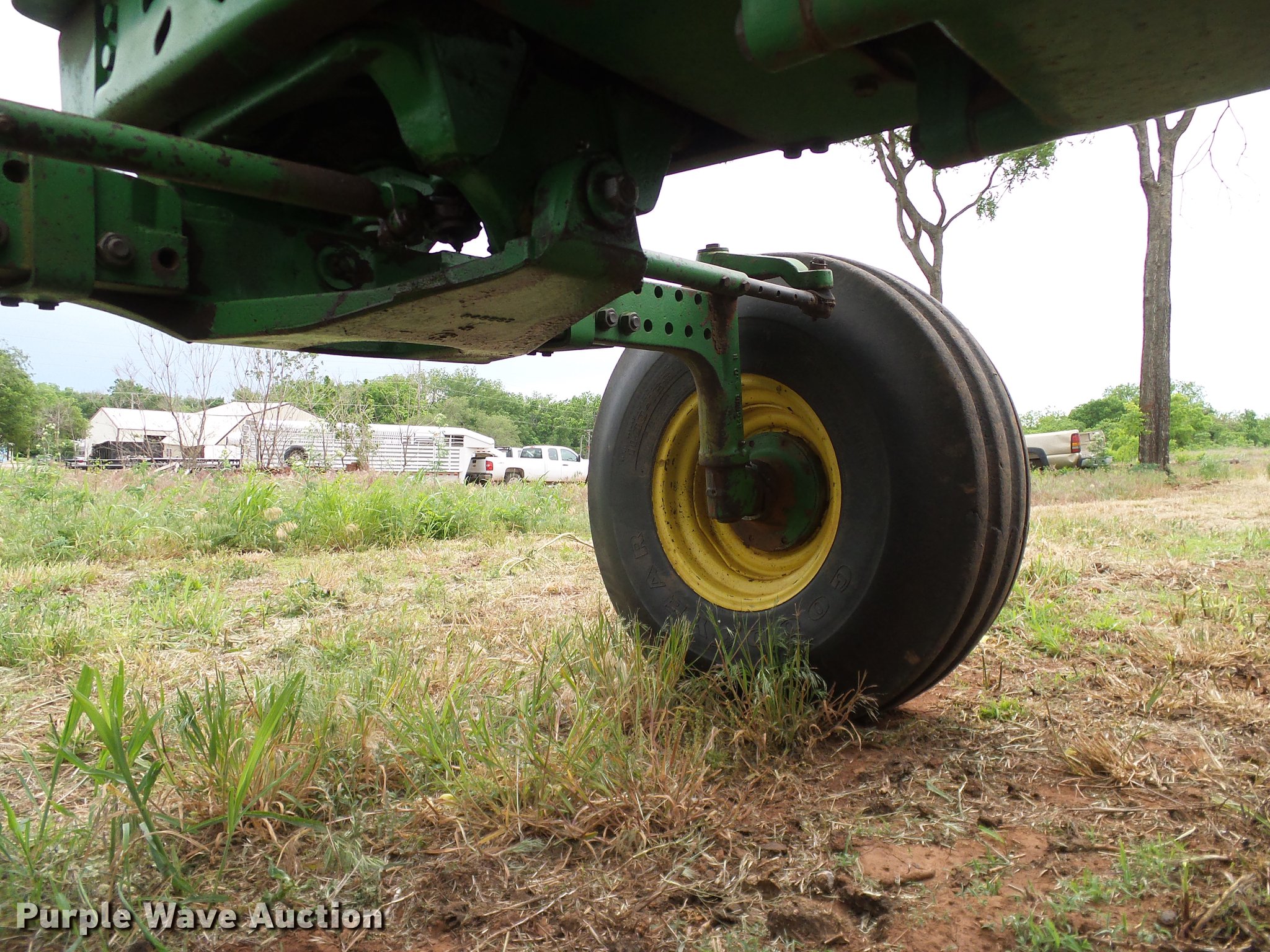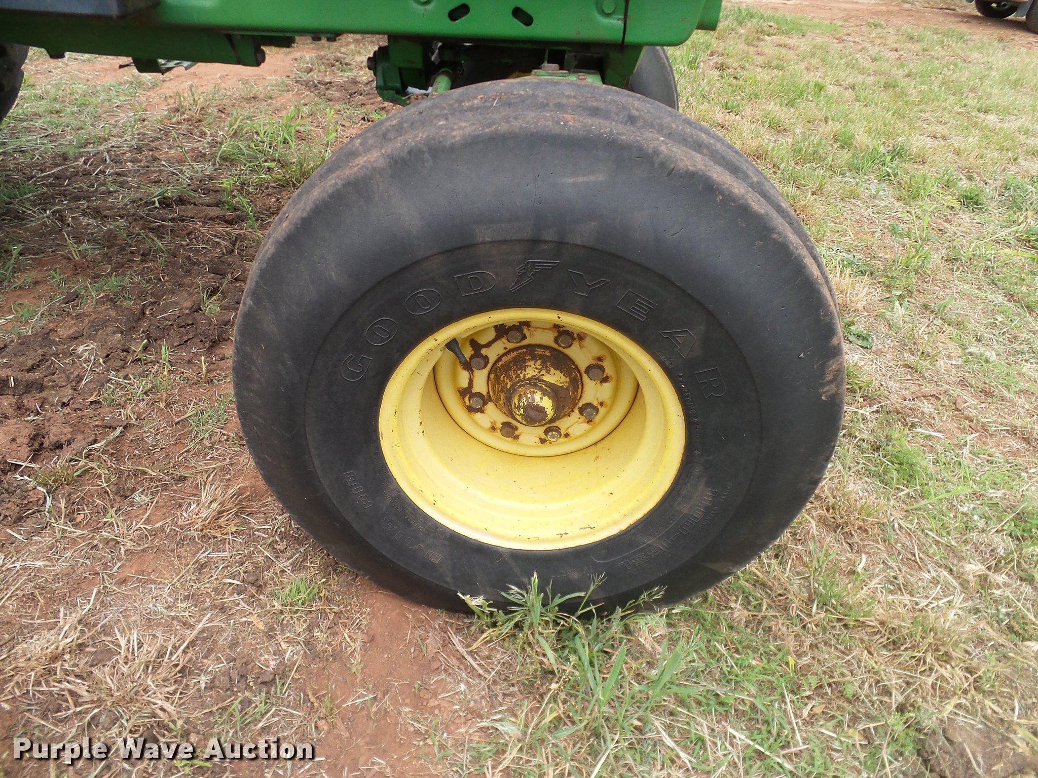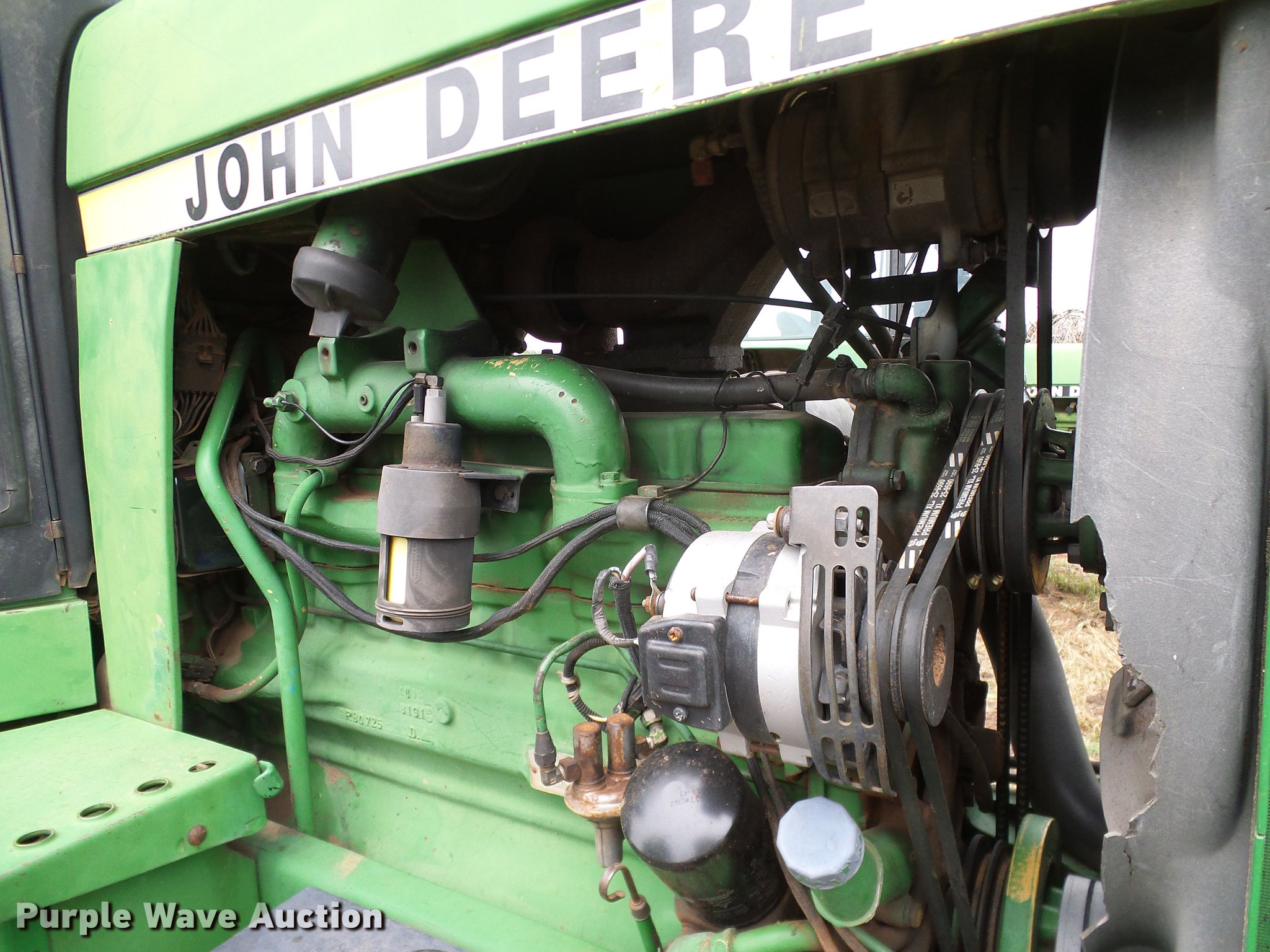 Purple Wave is selling a used Tractor in Oklahoma. This item is a John Deere 4050 tractor with the following: 7,602 hours on meter, John Deere L3599R-001 six cylinder turbo diesel engine, Serial CD63597791289, Powershift transmission, 15F-4R gears, AC and heat, Tilt steering wheel, AM/FM, Suspension seat, Joystick loader controls, Seven pin outlet, 540 PTO, ISO electrical outlet, (2) front hydraulic remotes, (3) rear hydraulic remotes, 11.00-16 front tires, 480/80R38 rear tires, Sale# 1902-KP, Serial RWA4050P008846