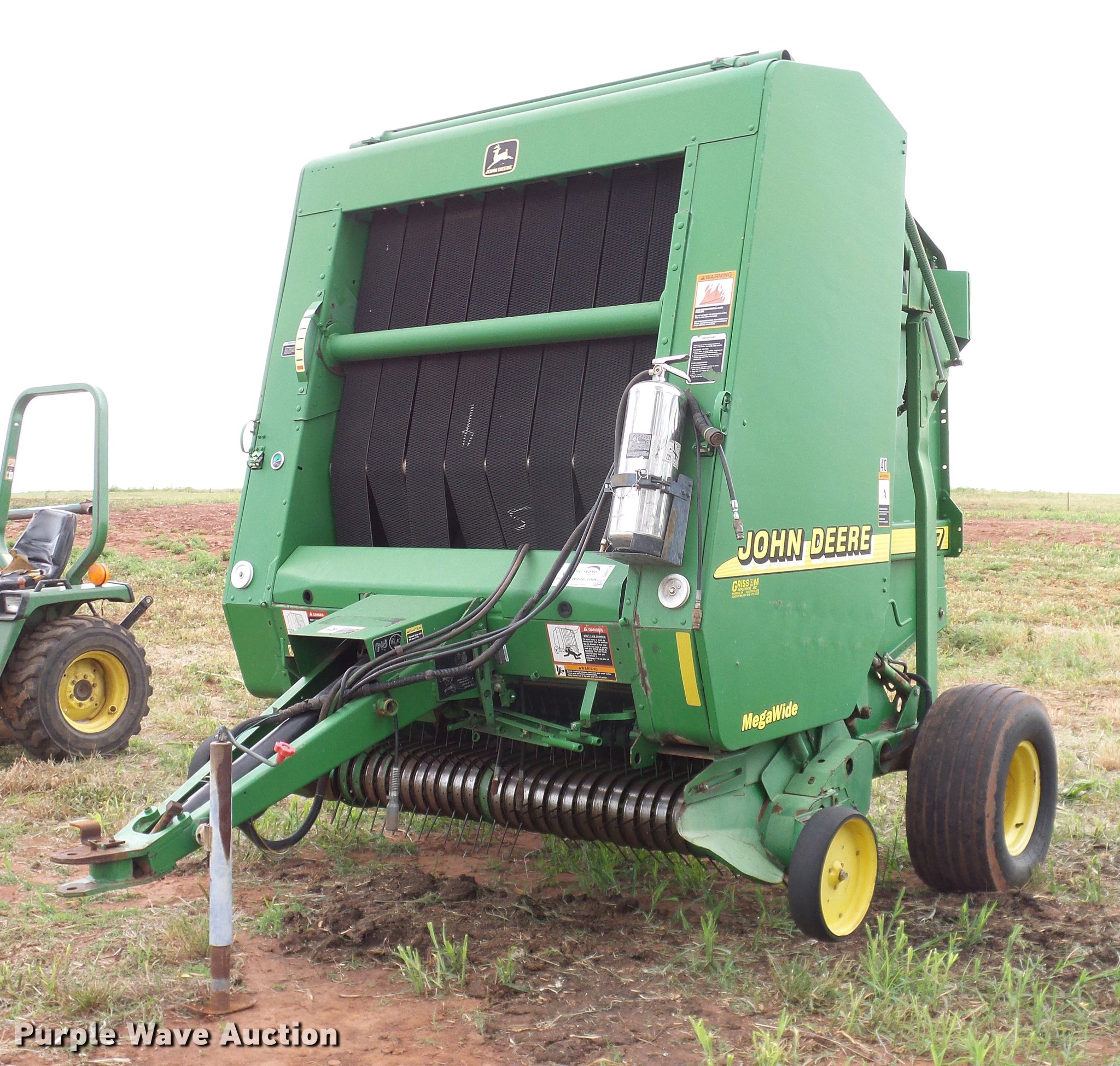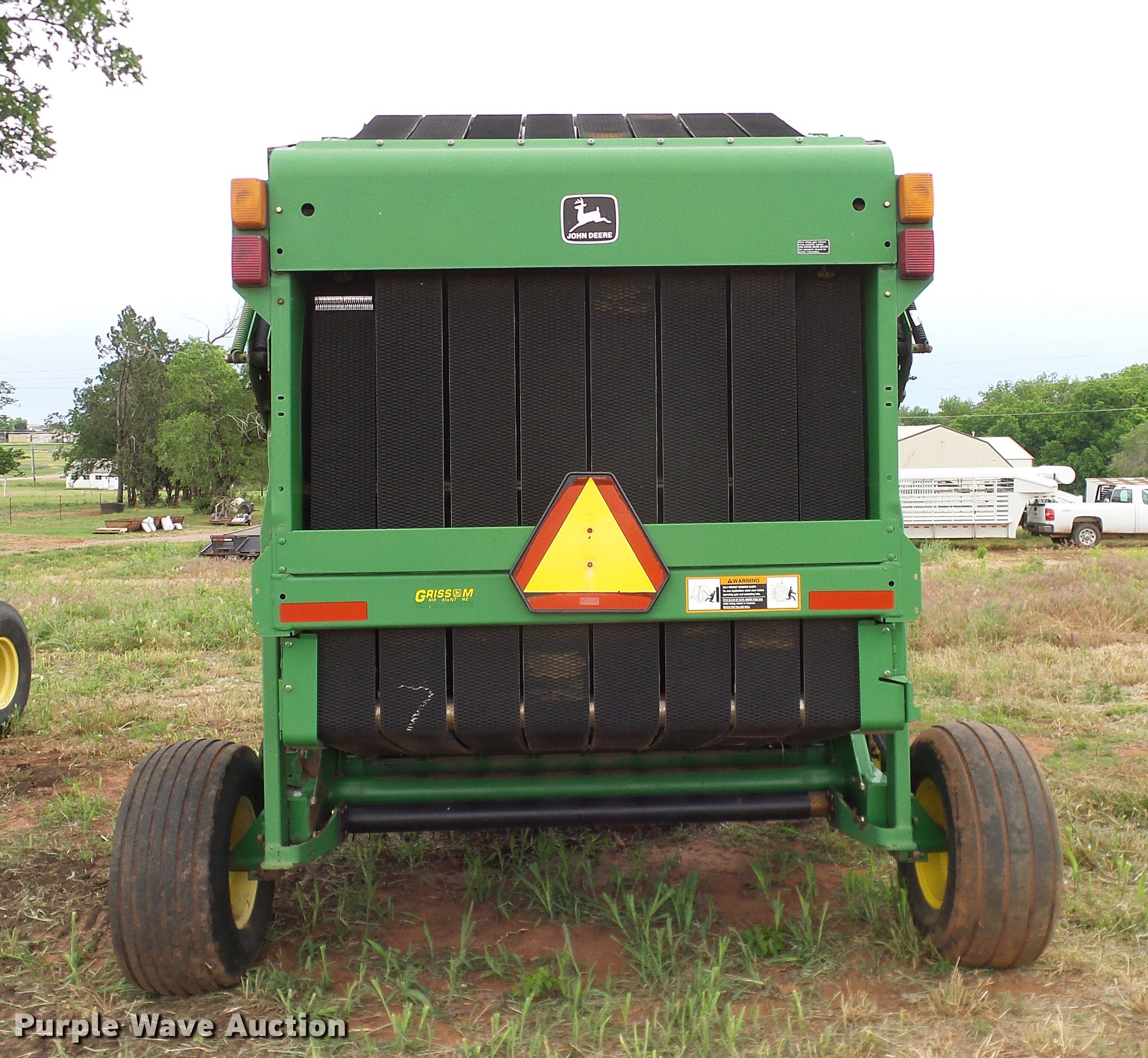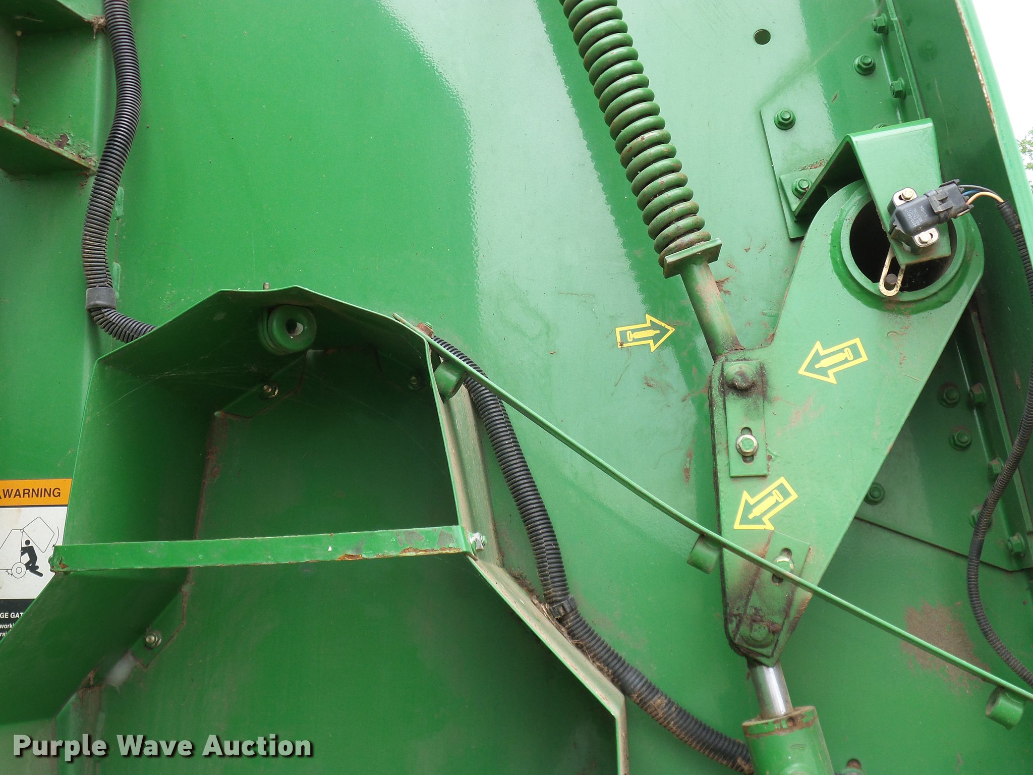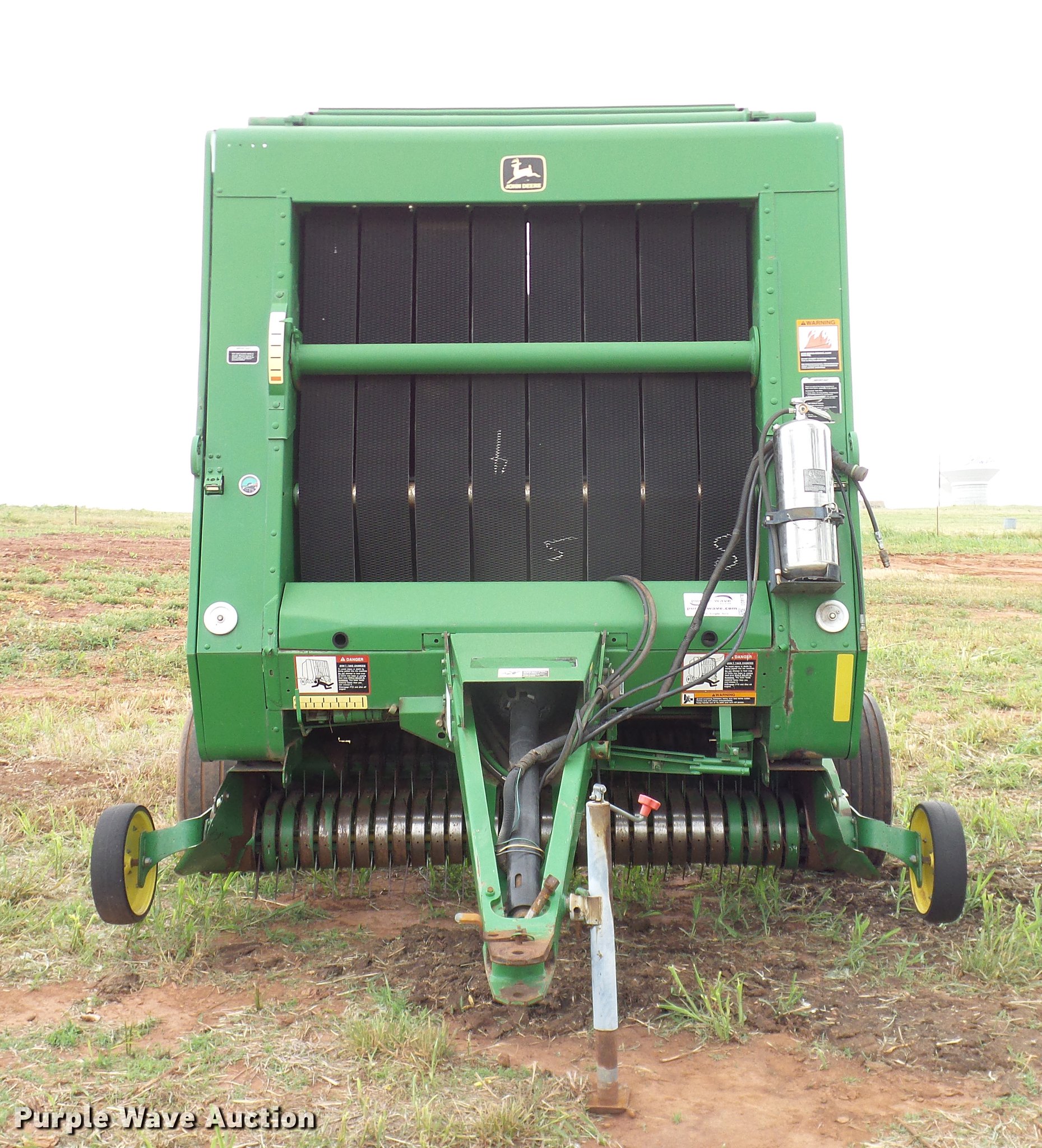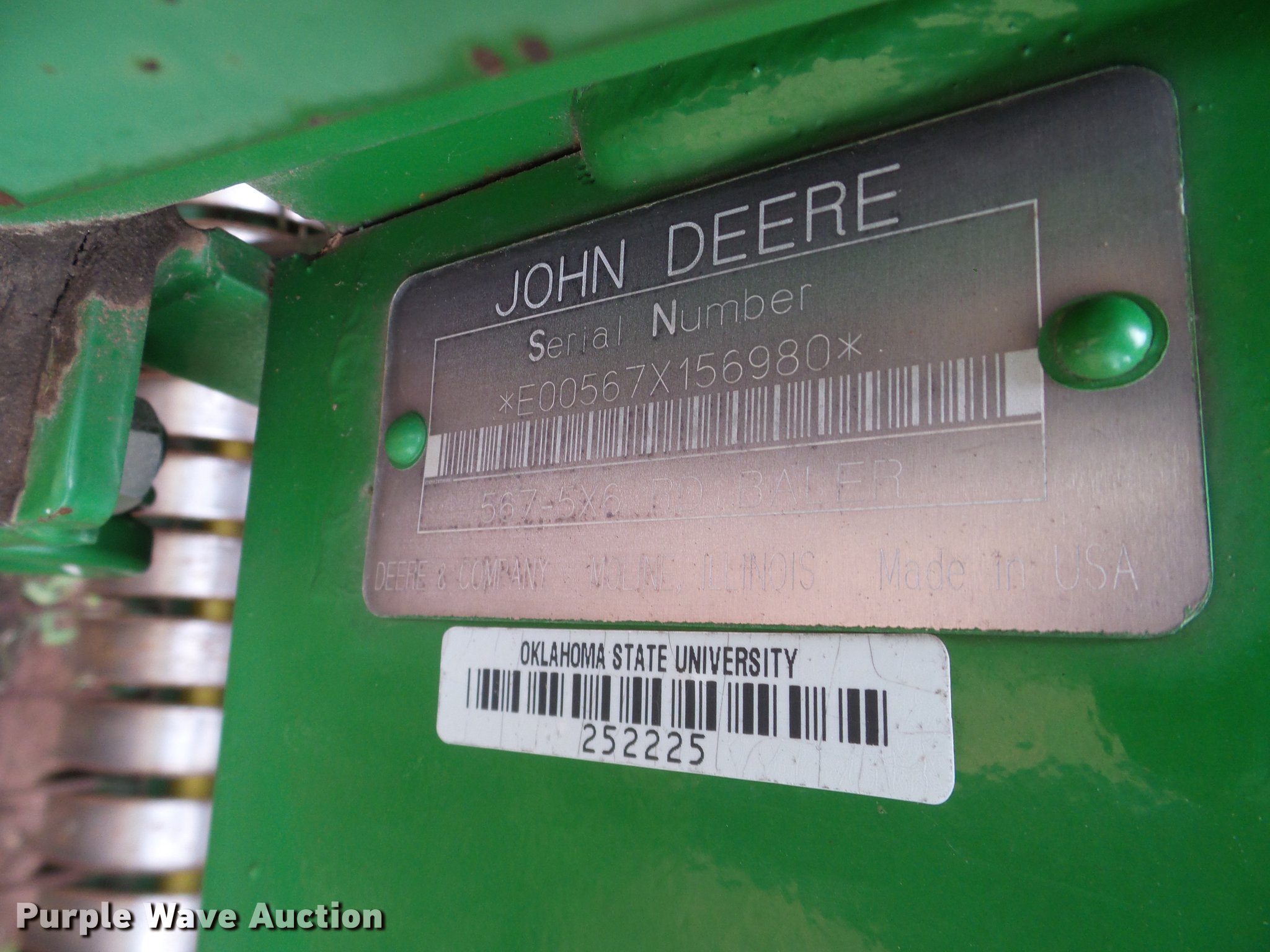 Purple Wave is selling a used Round Baler in Oklahoma. This item is a 2001 John Deere 567 Mega Wide round baler with the following: 12,833 bale count, 5' x 6' bale capacity, 78"W pickup, Hydraulic pickup lift, Gauge wheels, John Deere monitor, Twin twine tie, 540 PTO, Pin hitch, 31x13.5-15 tires, Sale# 1902-KP, Serial E00567X156980, Unit# 40