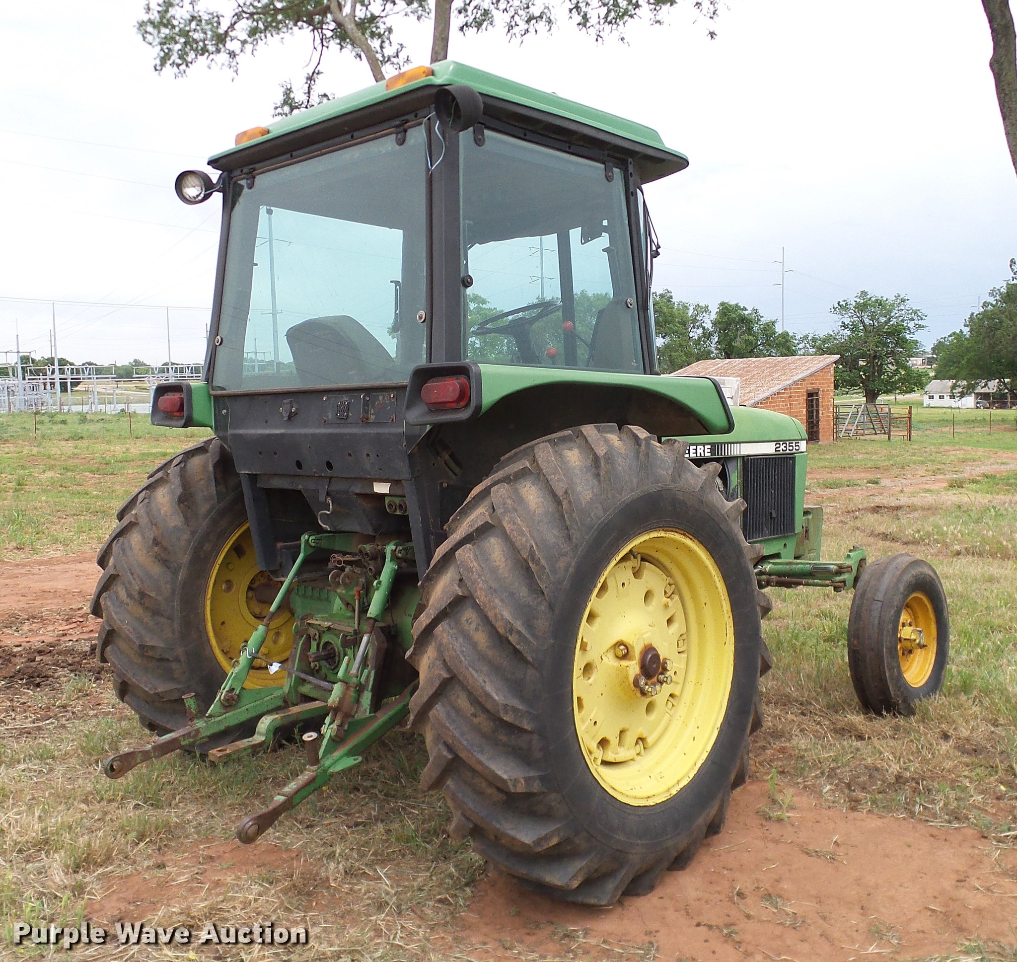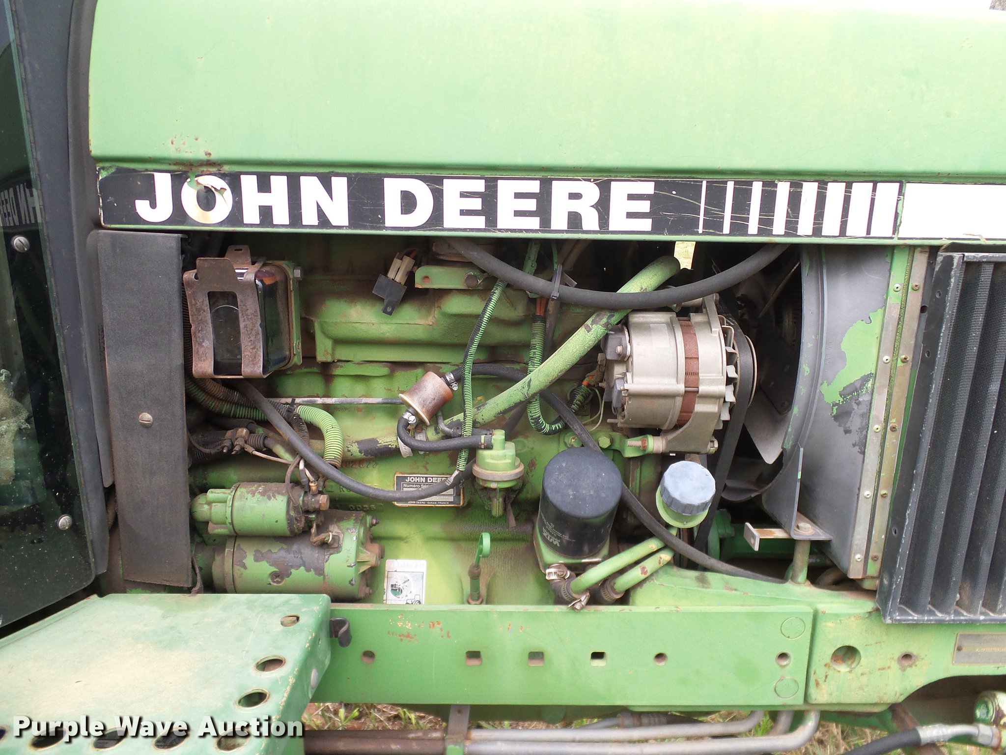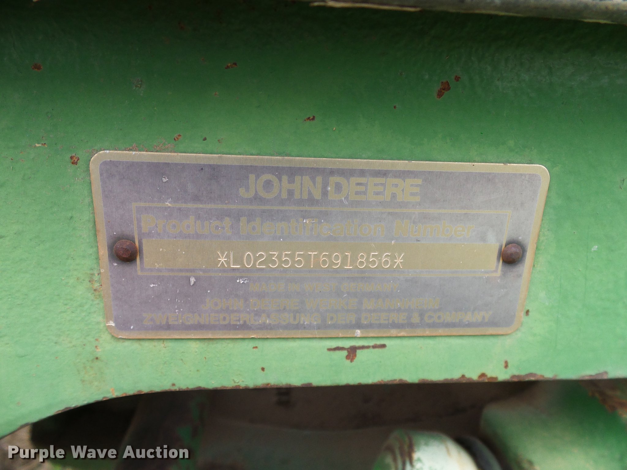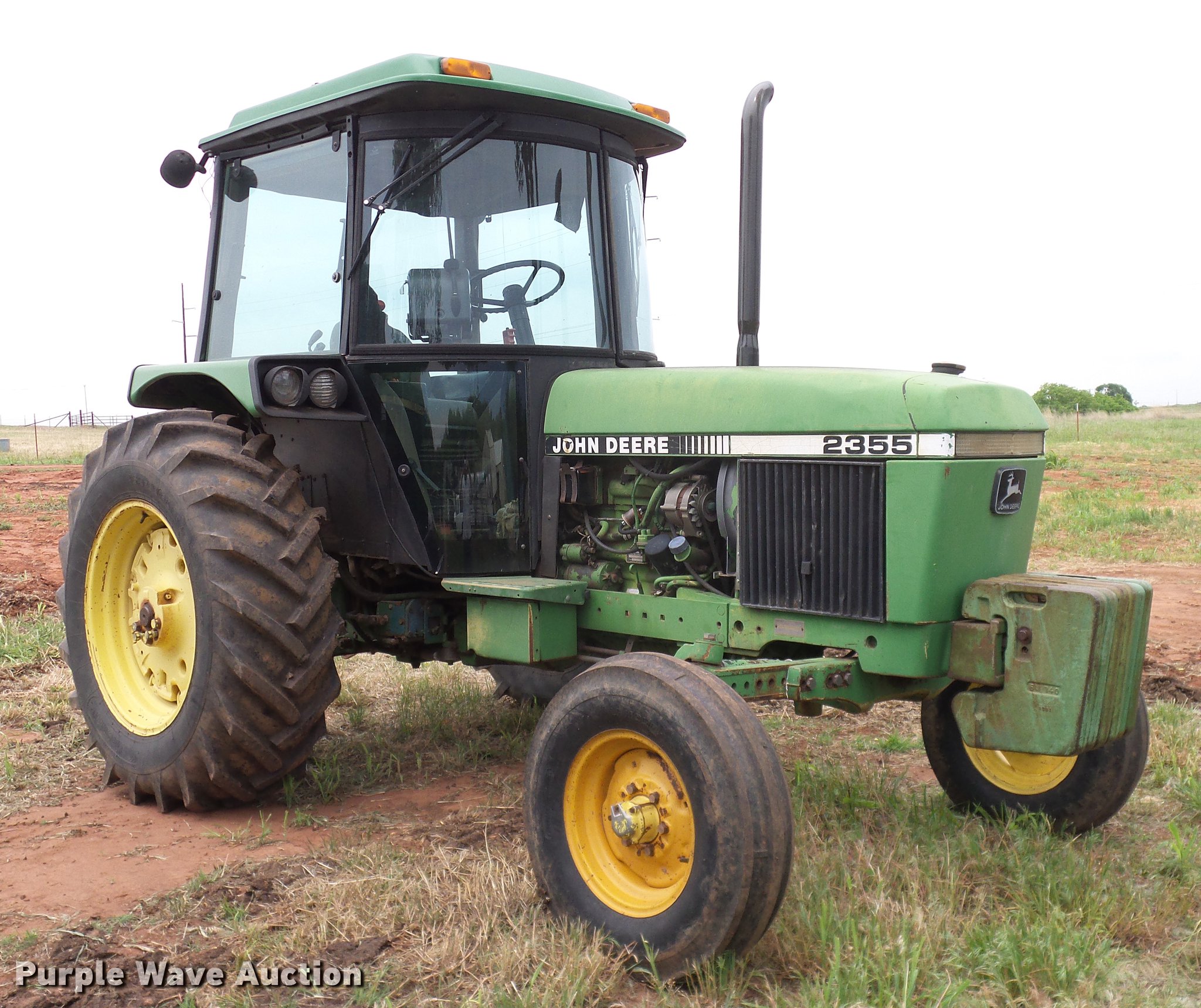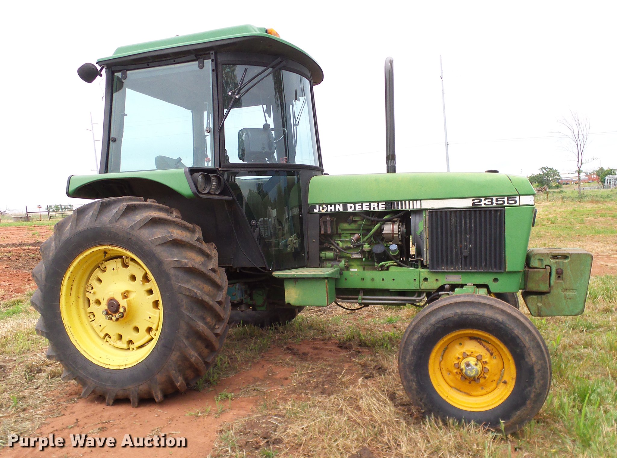 Purple Wave is selling a used Tractor in Oklahoma. This item is a 1990 John Deere 2355 tractor with the following: 5,180 hours on meter, 3.9L four cylinder diesel engine, Model 4239DL-010, 67 kW, Serial CD4239D866714, Collar shift transmission, 8F-4R gears, AC and heat, Tilt steering wheel, AM/FM, Suspension seat, Three point, Top link, Seven pin outlet, 540 PTO, (3) rear hydraulic remotes, (6) suitcase weights, 7.50-16 front tires, 16.7-30 rear tires, Sale# 1902-KP, Serial L02344T691856