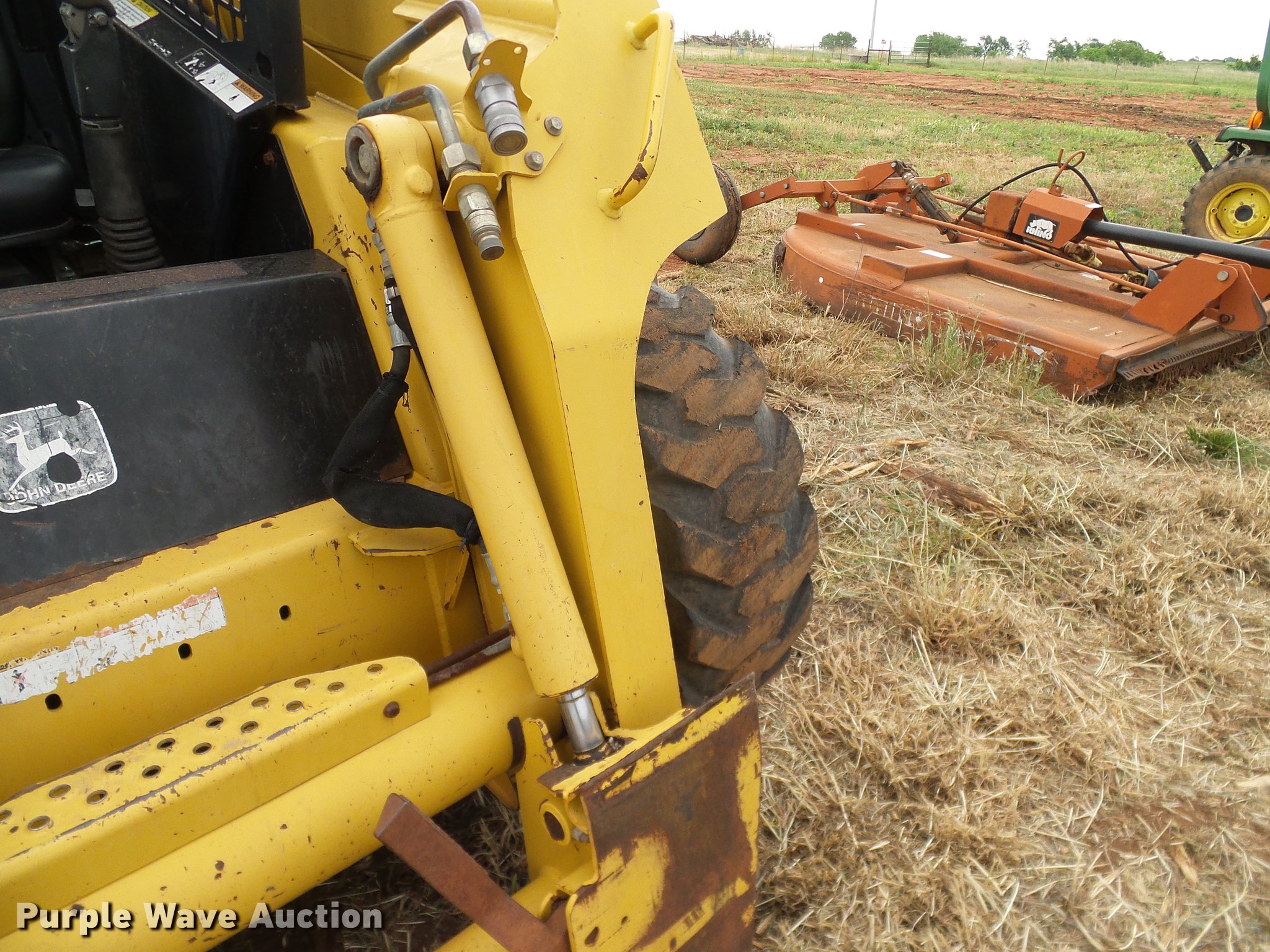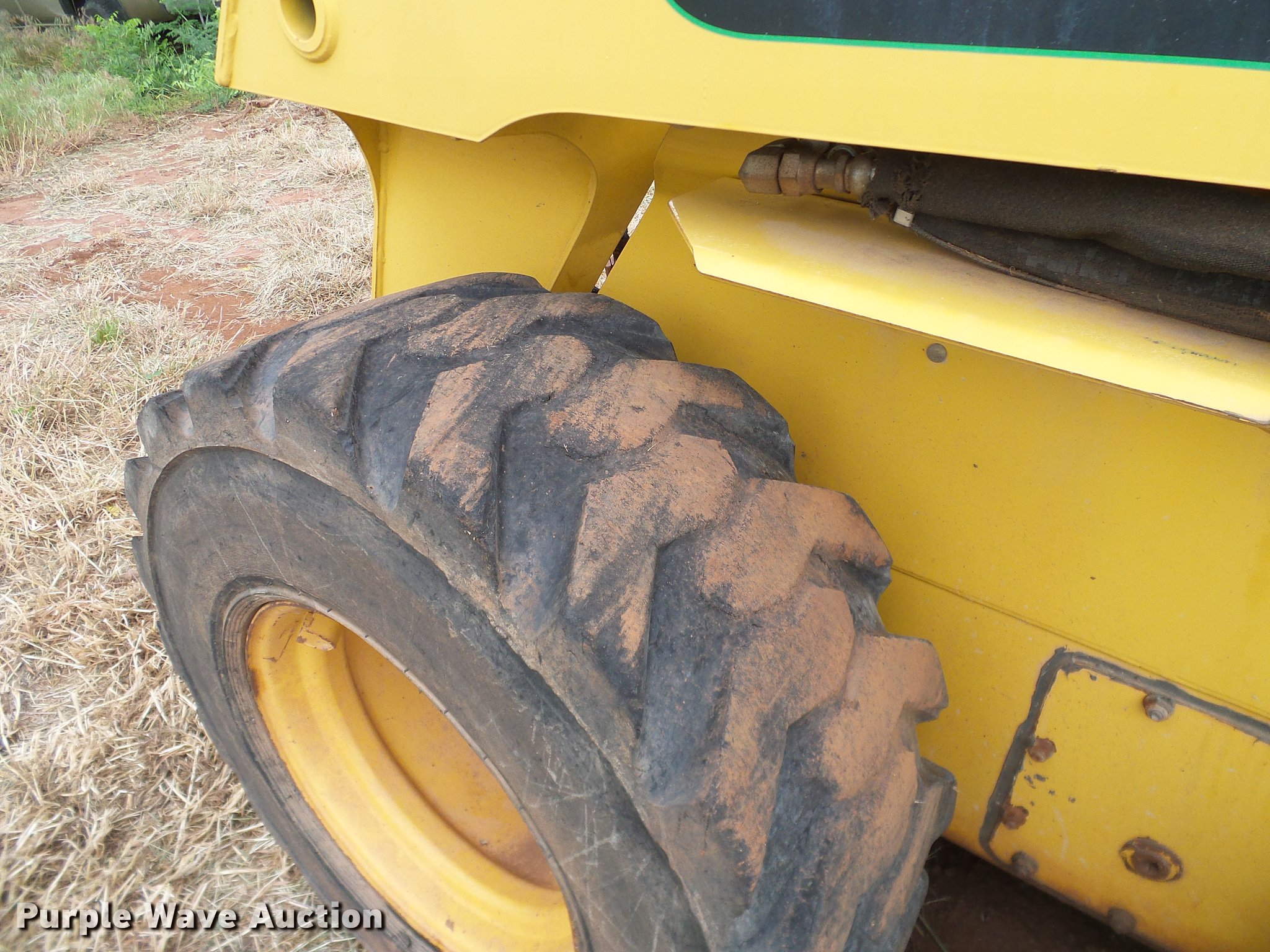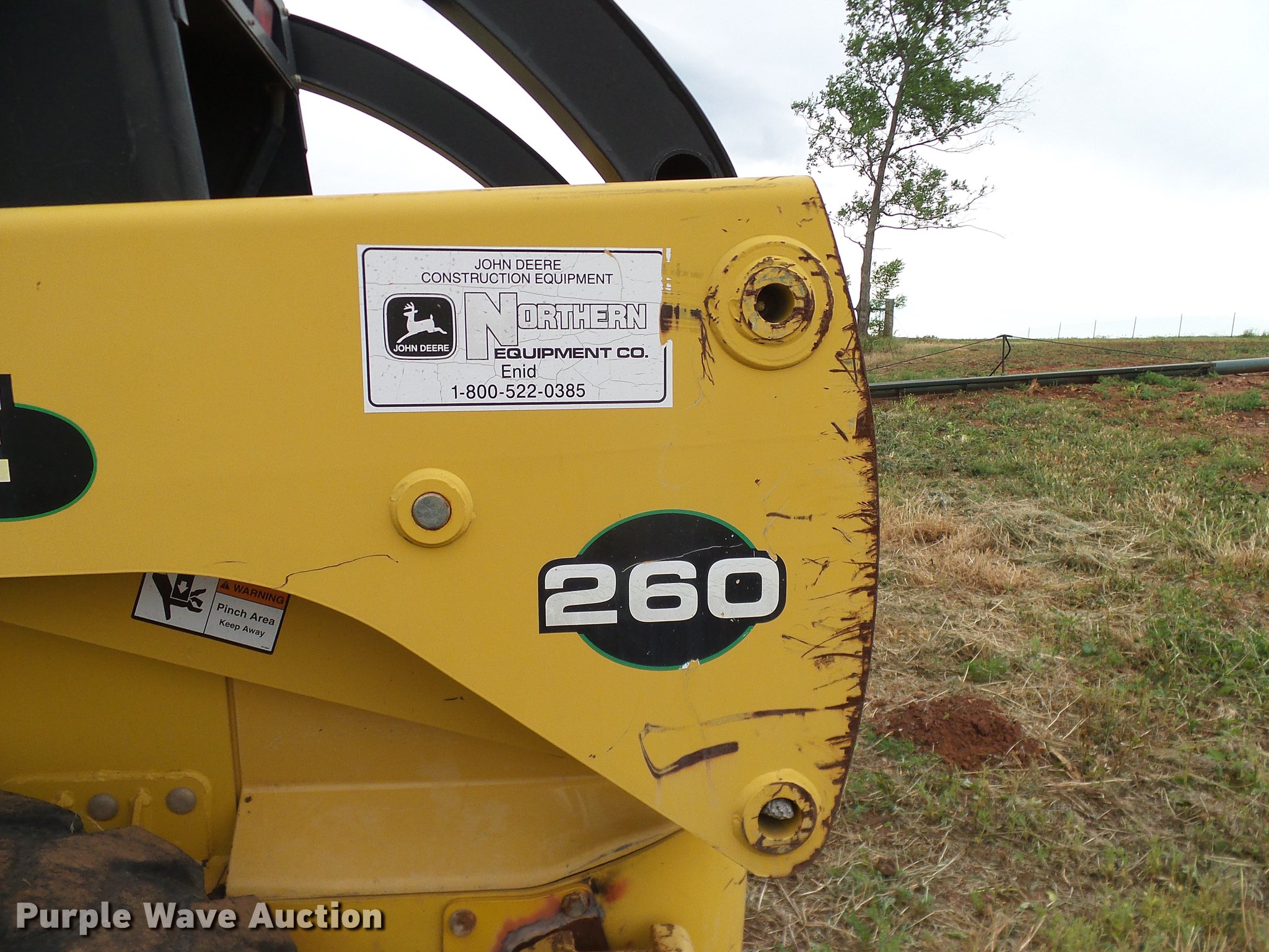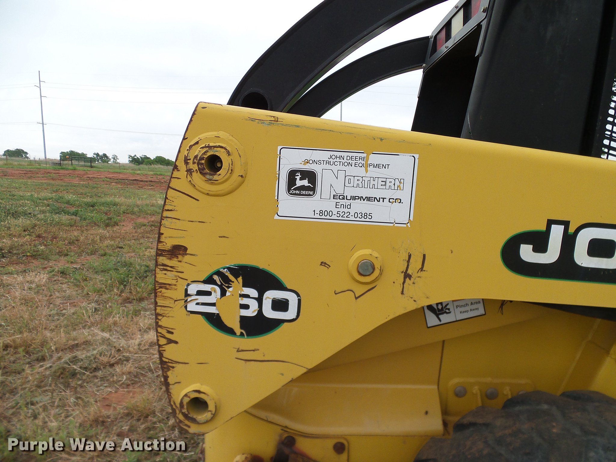 Purple Wave is selling a used Skid Steer Loader in Oklahoma. This item is a 2000 John Deere 260 skid steer with the following: 108 hours on meter, Hour meter has been replaced, Total hours unknown, John Deere three cylinder turbo diesel engine, Hydrostatic transmission, EROPS, Hand and foot controls, EMS panel, Front and rear work lights, Auxiliary hydraulics, Manual quick coupler, (7) removable counterweights, 14-17.5 tires, Sale# 1902-KP, Serial KV0260A260065