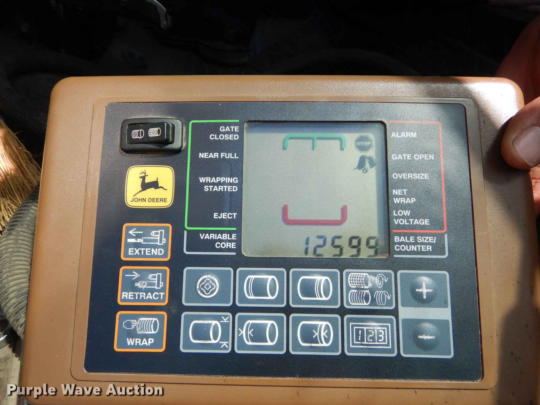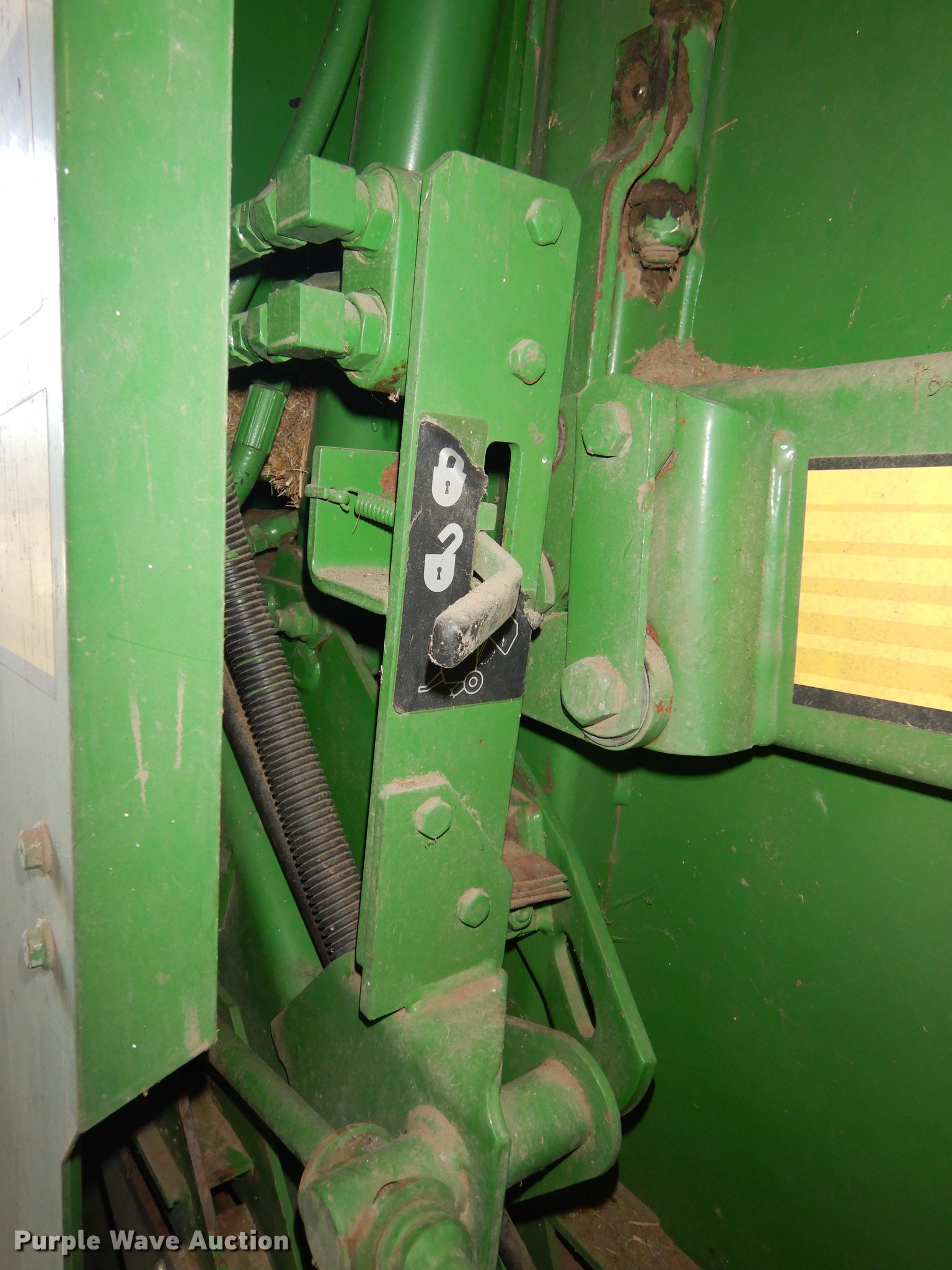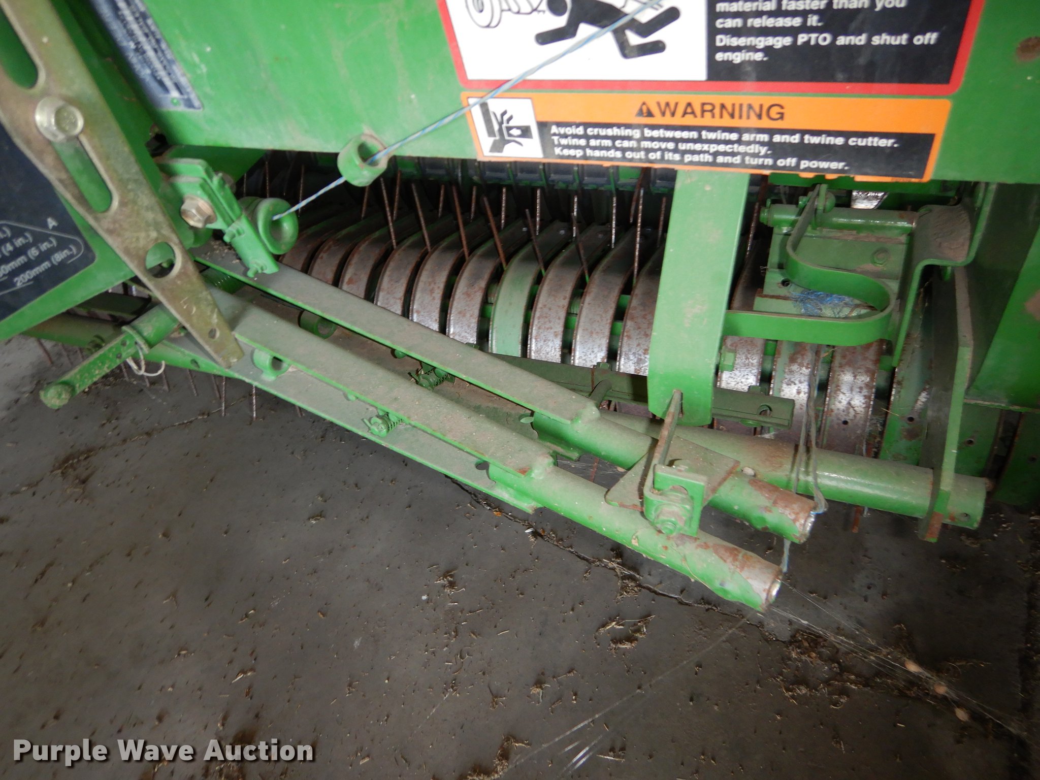 Purple Wave is selling a used Round Baler in Kansas. This item is a 2003 John Deere 567 Mega Wide round baler with the following: 12,599 bale count, 5' x 6' bale capacity, 6'W pickup, Hydraulic pickup lift, Gauge wheels, John Deere Bale Trak Plus RE179717 monitor, Serial 12613, Twin twine tie, Variable core unit, 540 PTO, Pin hitch, Firestone 31x13.50-15 tires, Unit has not been used in four to five years, Serial E00567X197807