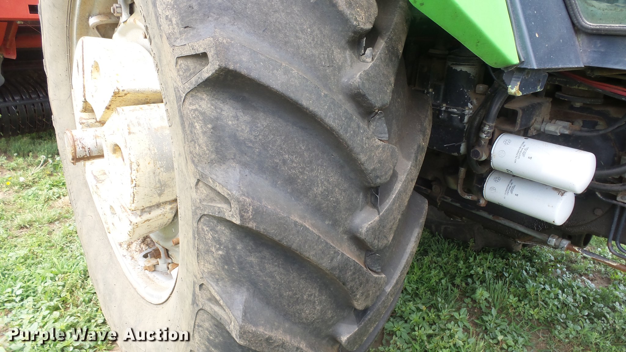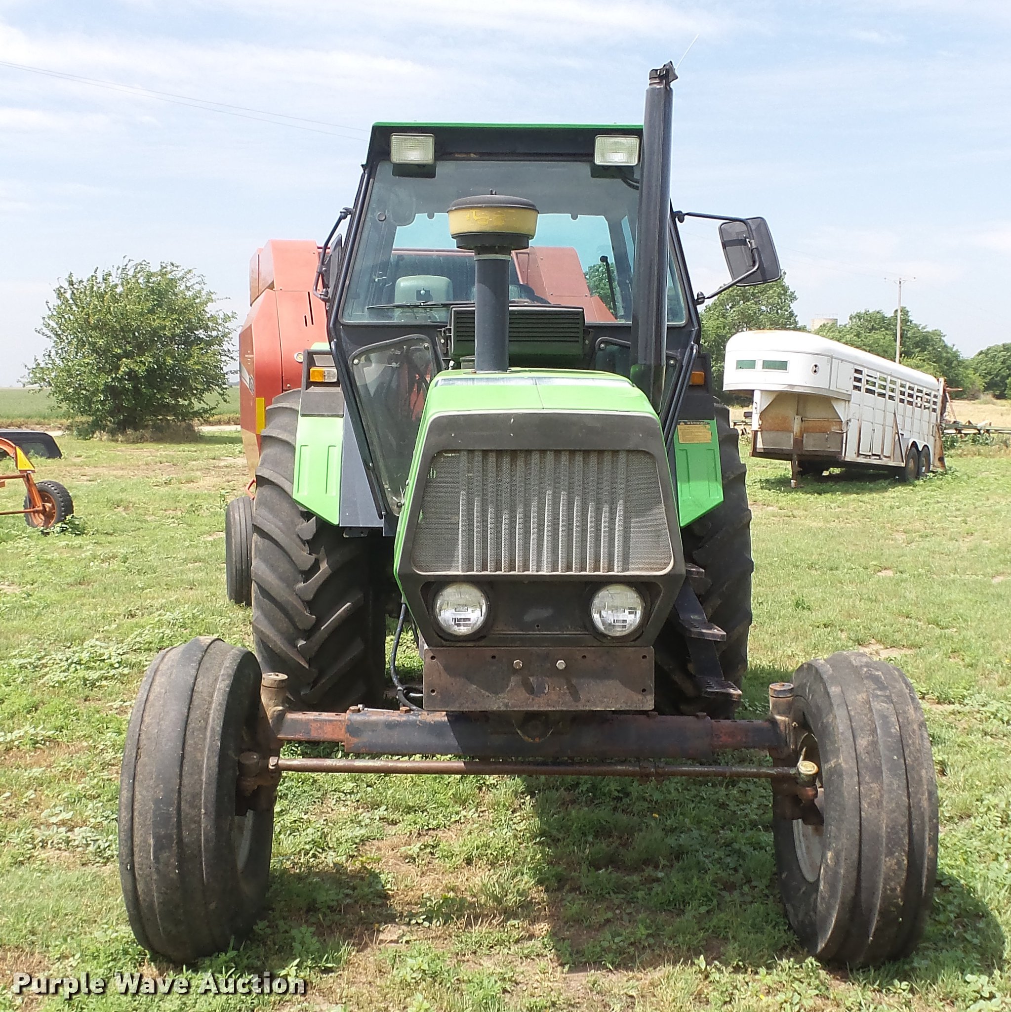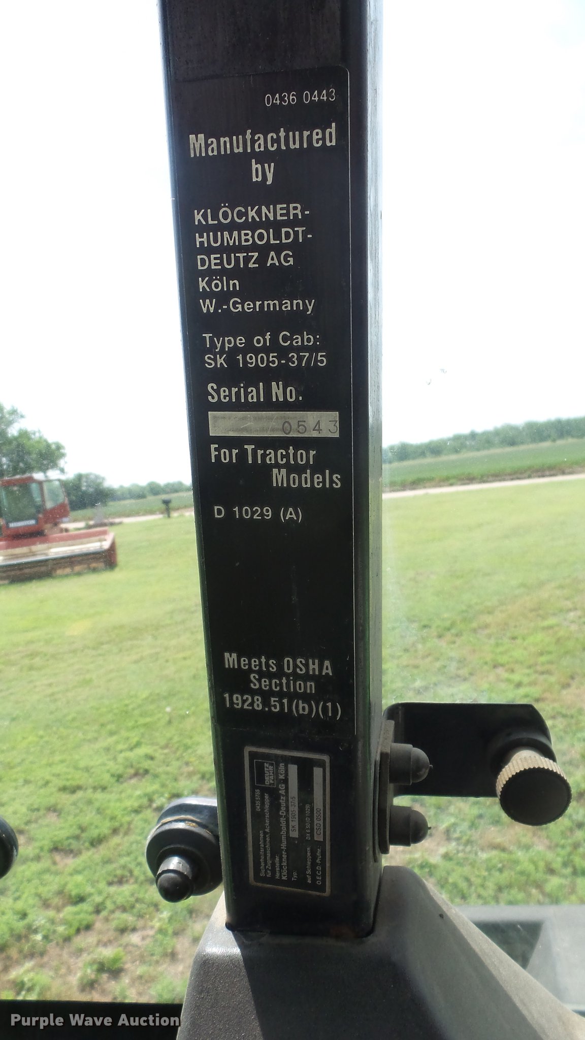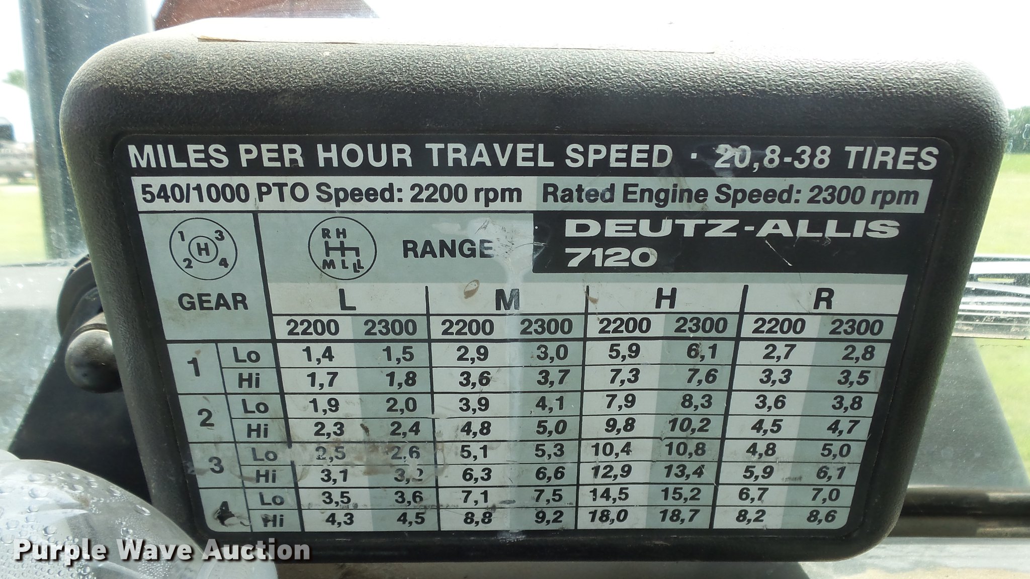 Purple Wave is selling a used Tractor in Kansas. This item is a 1986 Deutz Allis 7120 tractor with the following: Unknown hours on meter, Deutz 6.1L six cylinder turbo diesel engine, Powermatic transmission, 24F-8R gears, AC and heat, AM/FM/CD, Work lights, Three point, 540/1000 PTO, (2) rear hydraulic remote sets, Rear wheel weights, 11.00-16 front tires, 20.8-38 rear tires, Baler not included, Serial 74403087