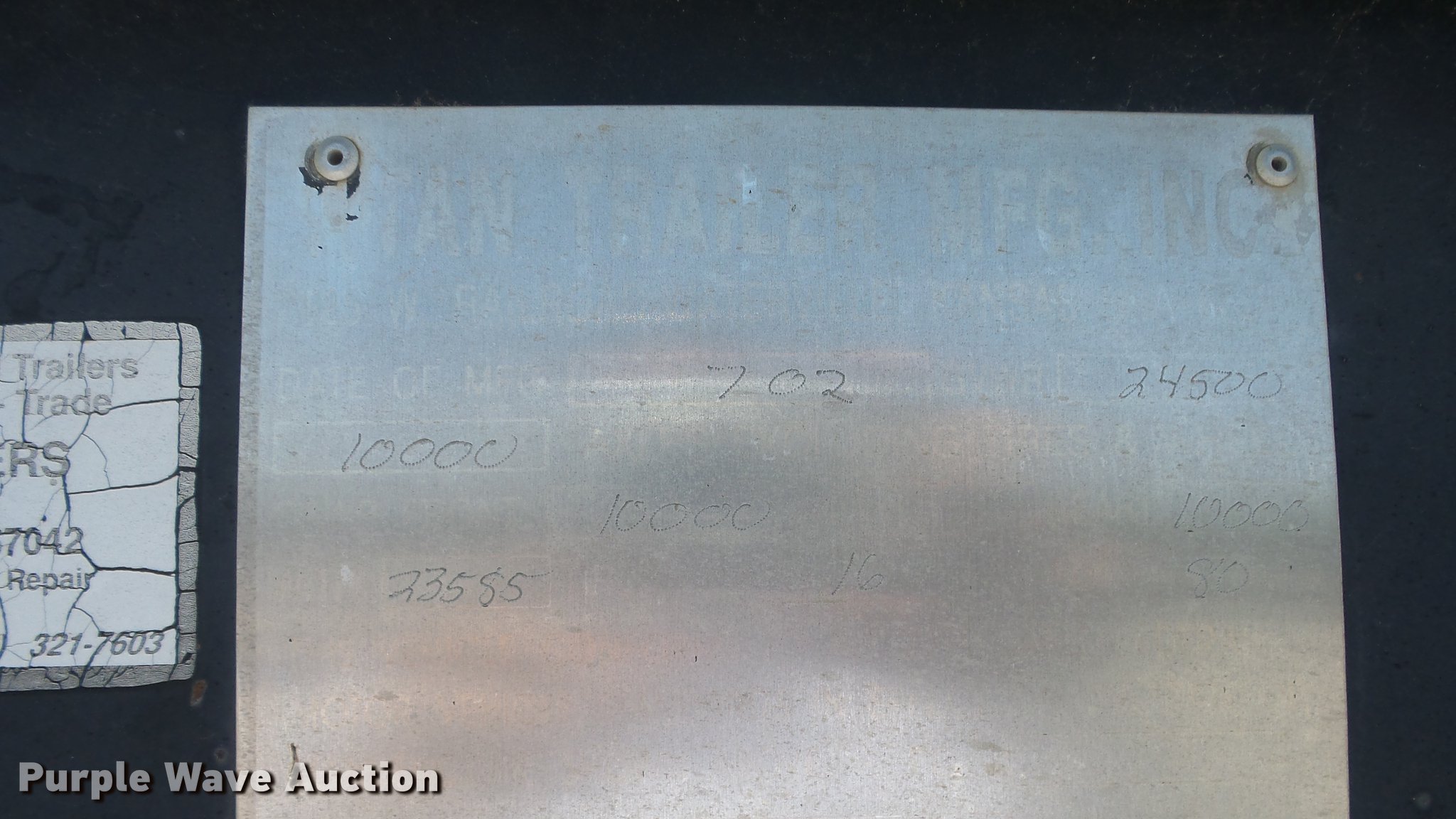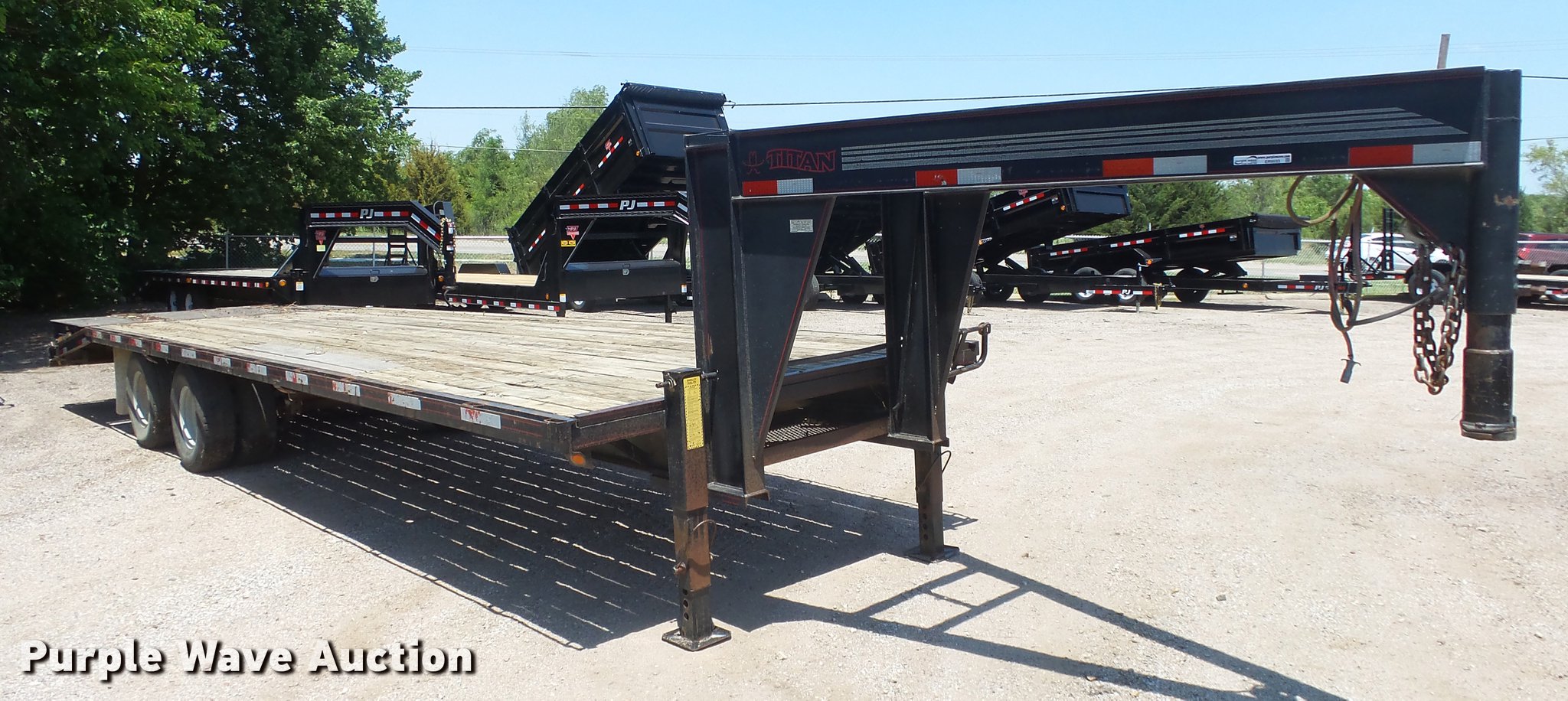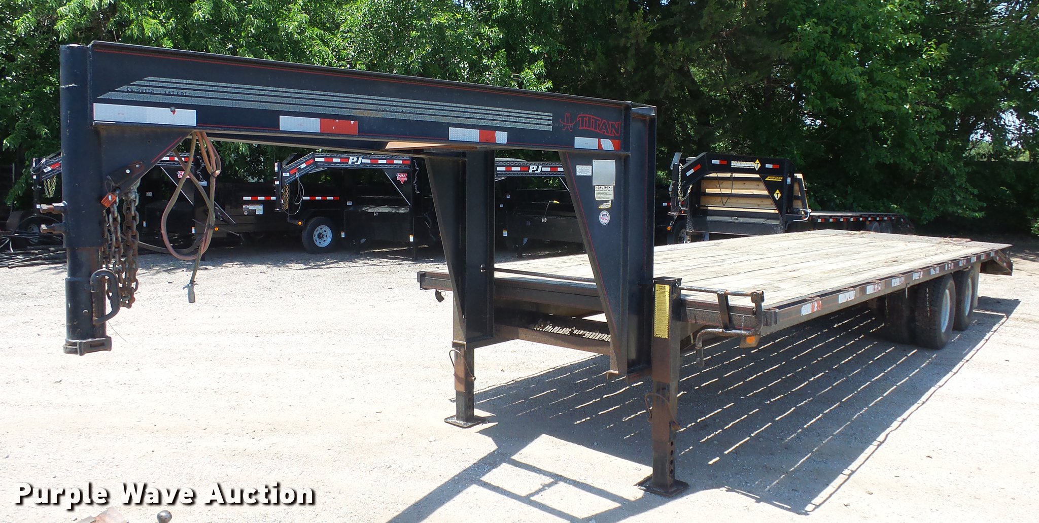 Purple Wave is selling a used Equip. Trailer in Kansas. This item is a 2003 Titan equipment trailer with the following: 29' overall length, 24'L x 102"W wood deck, 5'L dovetail, 5'L x 19"W ramps, Gooseneck hitch, Dual leg landing gear, Spring suspension, Tandem axle, 235/85R16 tires