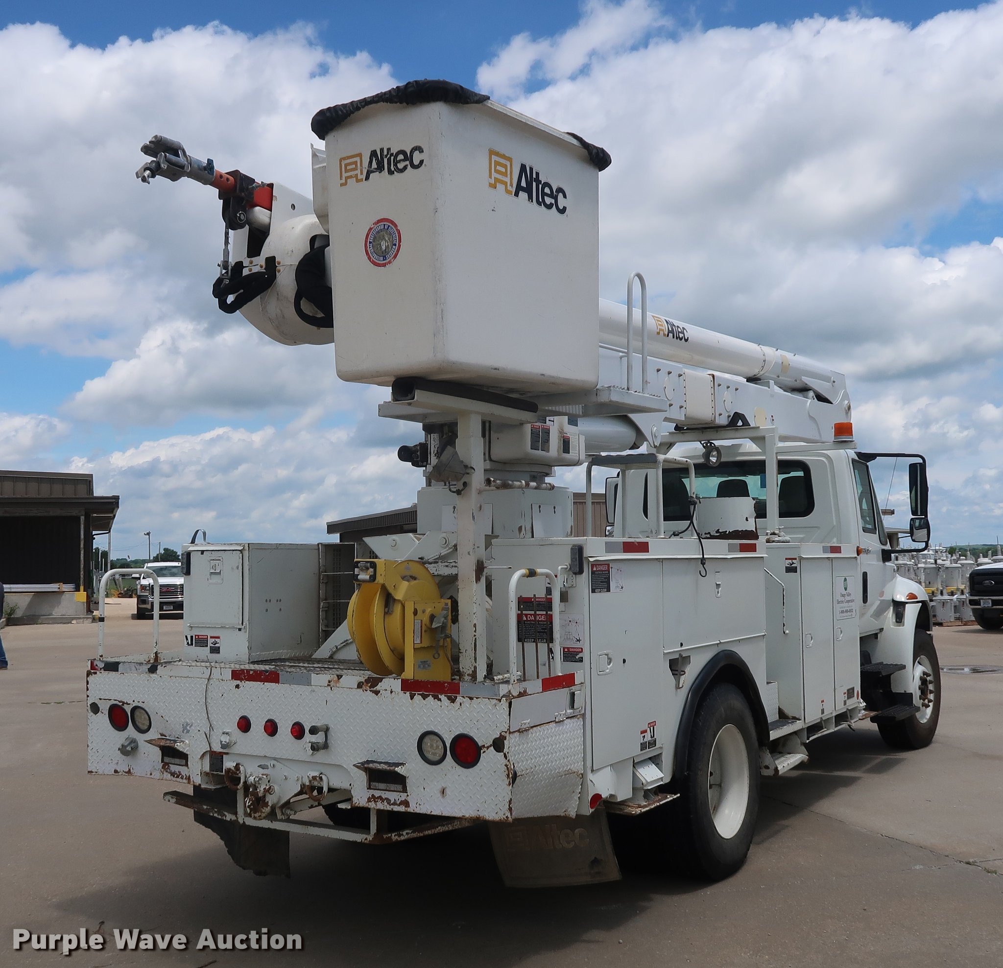 Purple Wave is selling a used Crane Truck in Missouri. This item is a 2010 International DuraStar 4400 bucket truck with the following: 78,055 miles on odometer, 2,320 hours on meter, Intenational MaxxForce DT466 7.6L L6 turbo diesel engine, Eaton Fuller 10 speed manual transmission, Single axle, AC and heat, Cruise, AM/FM/CD, Air suspension seat, Altec utlity bed, Shelving, Slide-out drawers, Altec AAA55E boom, 700 lbs maximum lift capacity, 55' maximum lift height, Ground and remote boom controls, Knuckle boom, (4) outriggers, Serial 0709EM0688, Pinlte hitch, Spring suspension, Air brakes, 315/80R22.5 front tires, 11R22.5 rear tires, GVWR 33,000 lbs
