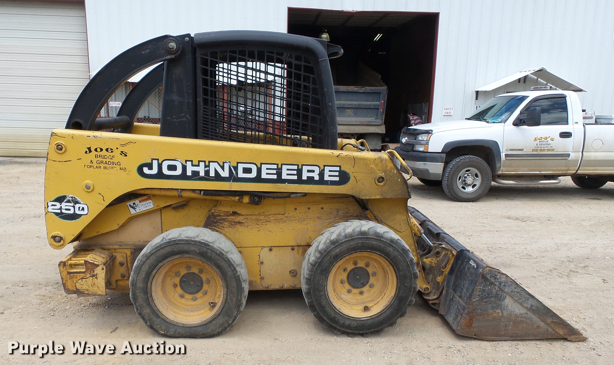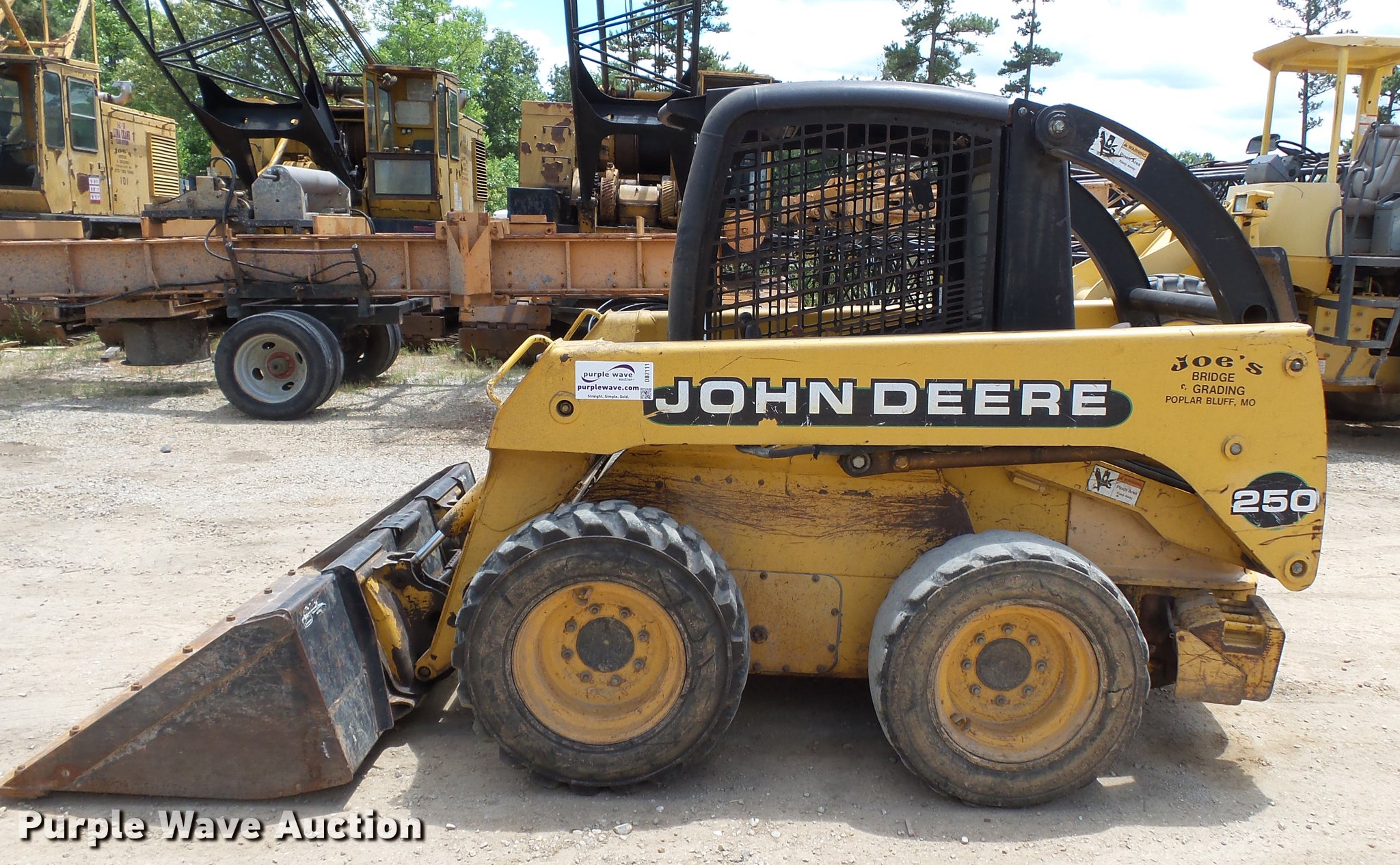 Purple Wave is selling a used Skid Steer Loader in Missouri. This item is a 1999 John Deere 250 skid steer with the following: 1,163 hours on meter, John Deere 3029T three cylinder turbo diesel engine, 65 HP, Hydrostatic transmission, Open station/canopy, Hand and foot controls, Spring suspension seat, Front work lights, John Deere 72"W bucket, Bolt-on cutting edge, Manual quick coupler, High Flow auxiliary hydraulics, Counter weights, 10-16.5 tires, Serial V0250A150372