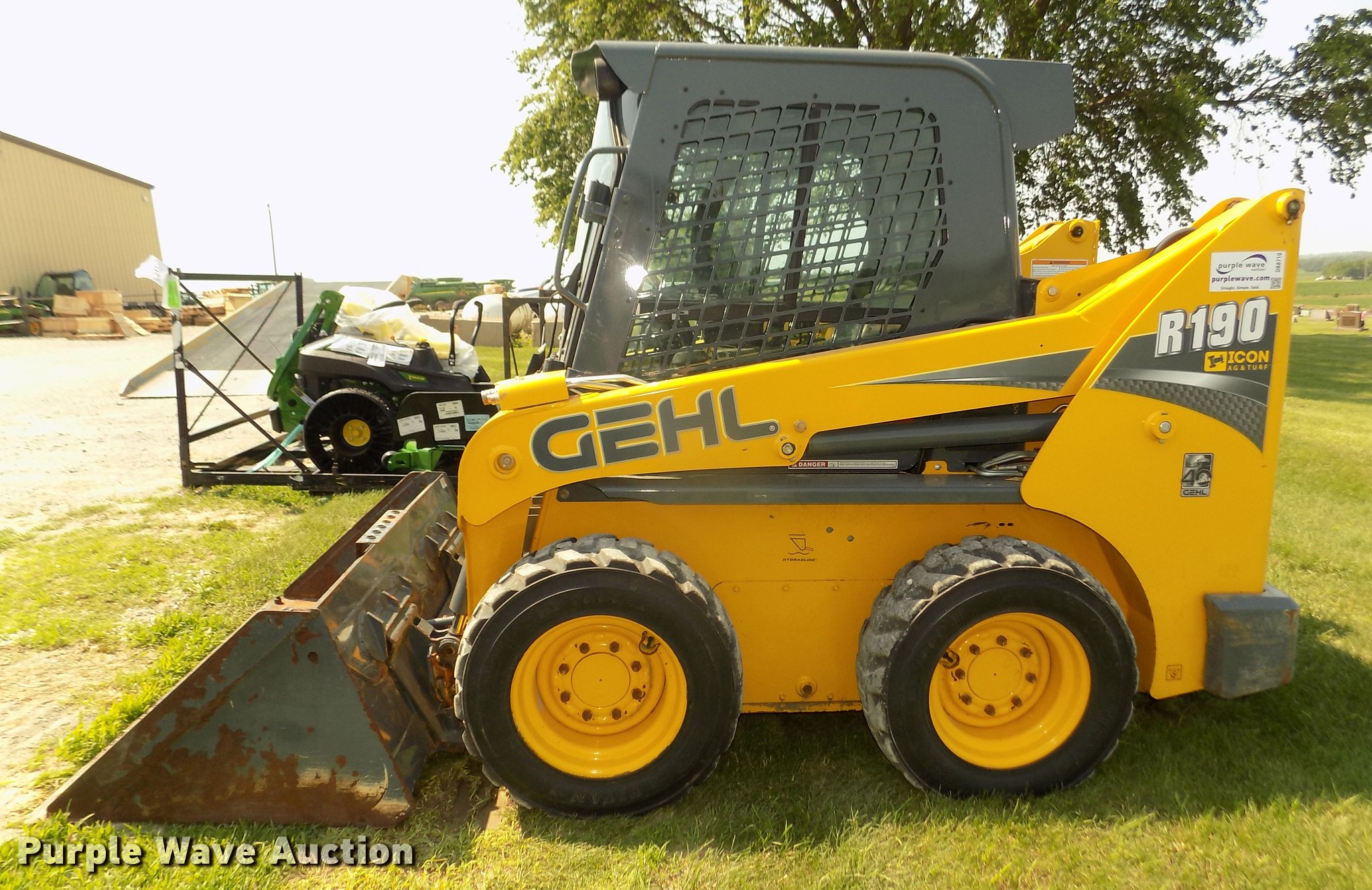 Purple Wave is selling a used Skid Steer Loader in Iowa. This item is a 2014 Gehl R190 skid steer with the following: 769 hours on meter, Yanmar 4TNV98C-MNS 3.319L four cylinder diesel engine, 69 HP, Serial 02482, Hydrostatic transmission, EROPS, Heat, Joystick controls, Spring suspension seat, Front and rear work lights, 66"W low profile bucket, 19 cu.ft. capacity, Auxiliary hydraulics, 1,900 lbs rated operating capacity, Titan 10-16.5 tires, 6,880 lbs tare weight, Serial GHL0R190H00171457