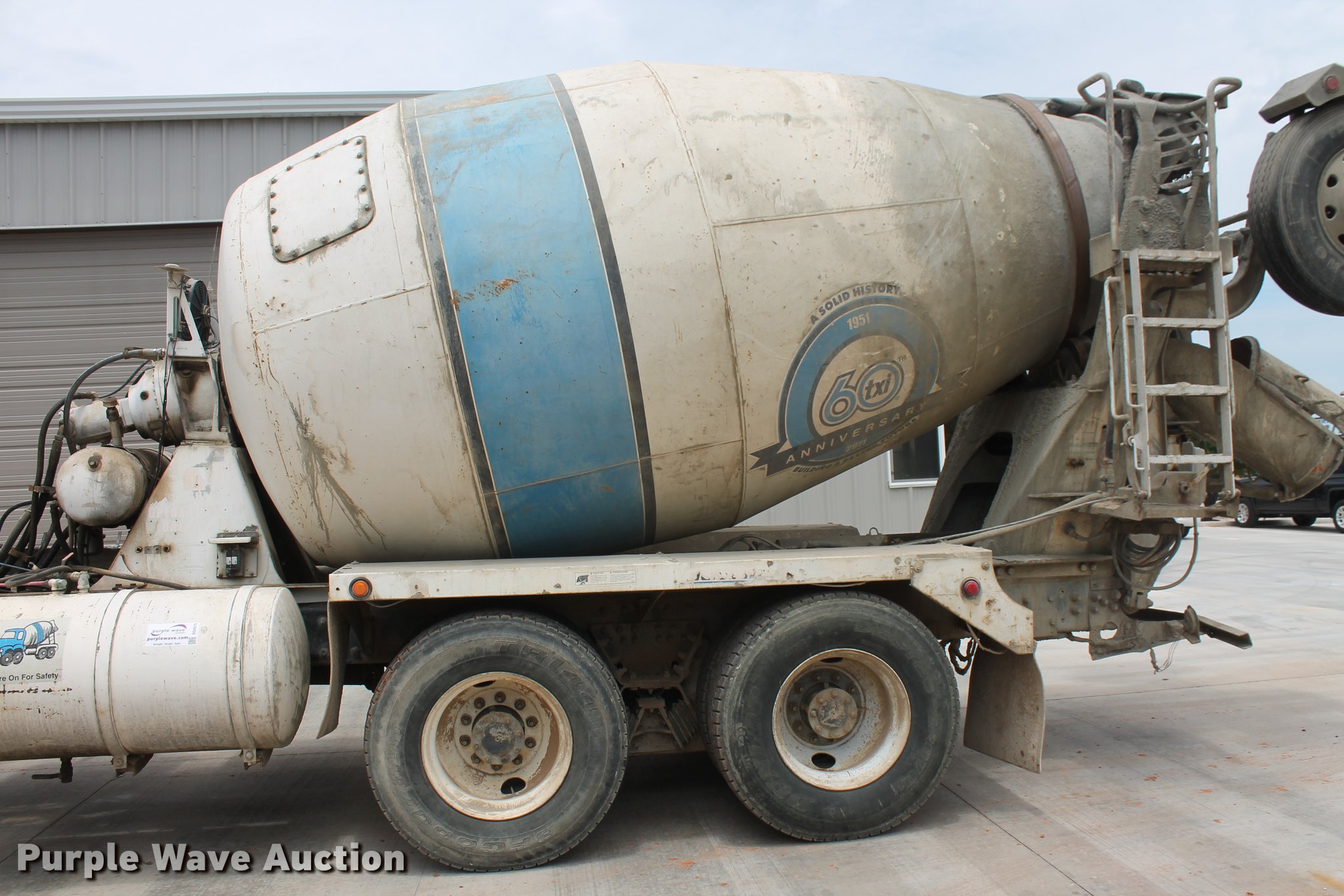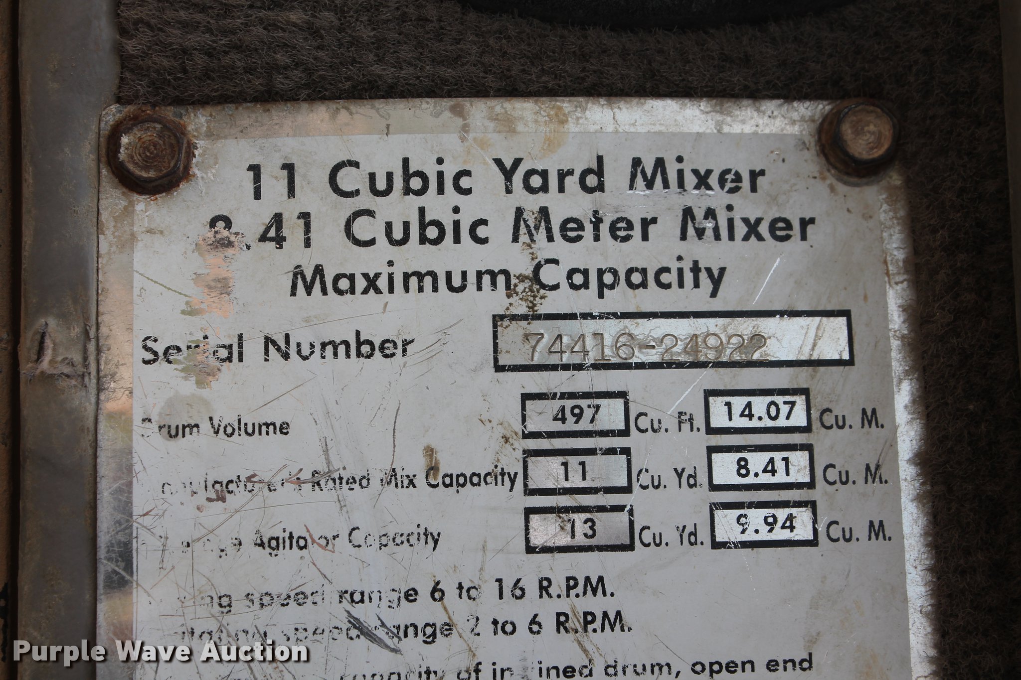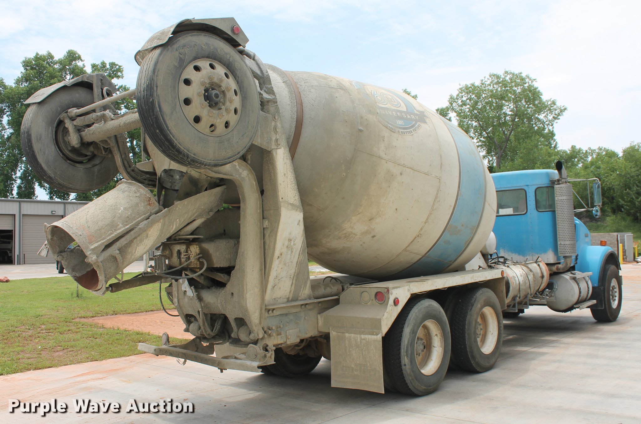 Purple Wave is selling a used Ready Mix or Pump Truck in Oklahoma. This item is a 2006 Kenworth W900B ready mix truck with the following: 56,838 miles on odometer, 3,460 hours on meter, Cummins ISM 10.8L L6 turbo diesel engine, 355 HP, Serial 351232, Automatic transmission, Tandem axle, Full differential lock, AC and heat, AM/FM, Cruise, Power passenger window, Heated mirrors, Air suspension seat, Air ride cab, Exterior visor, McNeilus mixer bed, 11 cu.yd capacity, Rear drum controls, (3) steel chute extensions, 150 gallon water tank, Ladder, Rear discharge, Single fuel tank, 5:38 gear ratio, 248" wheelbase, Spring over walking beam suspension, Air brakes, Engine brake, 425/65R22.5 front tires, 11R22.5 rear tires, GVWR 79,200 lbs, FAWR 20,000 lbs, IAWR 23,000 lbs, RAWR 23,000 lbs, Lift axle GAWR 13,200 lbs