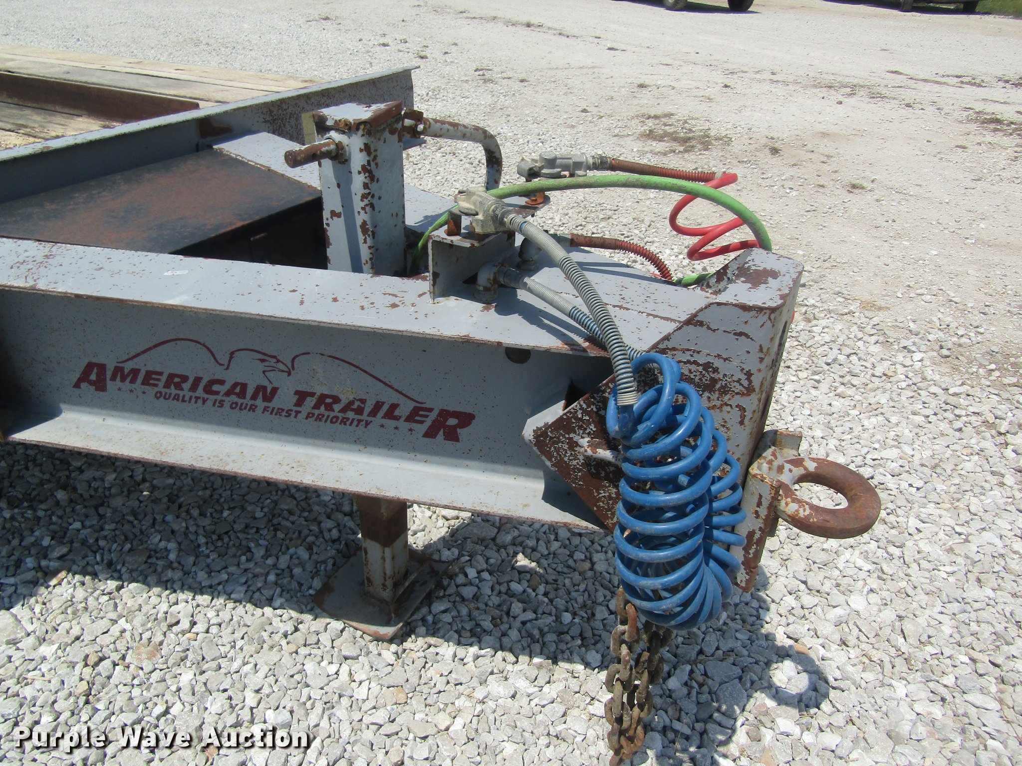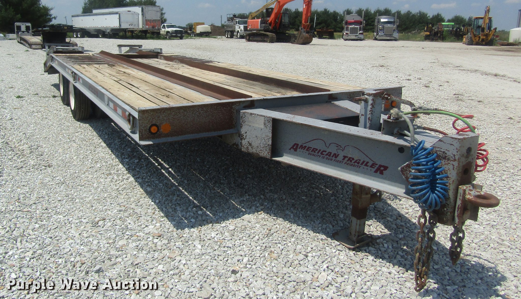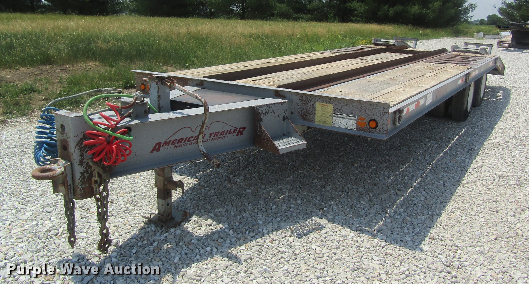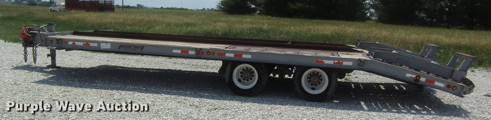 Purple Wave is selling a used Equip. Trailer in Missouri. This item is a 2002 American equipment trailer with the following: 30' overall length, 20'L x 102"W deck, 5'L beavertail, 5'L ramps, Pintle hitch, Single leg landing gear, Spring suspension, Air brakes, Tandem axle, Steel wheels, 215/75R17.5 tires