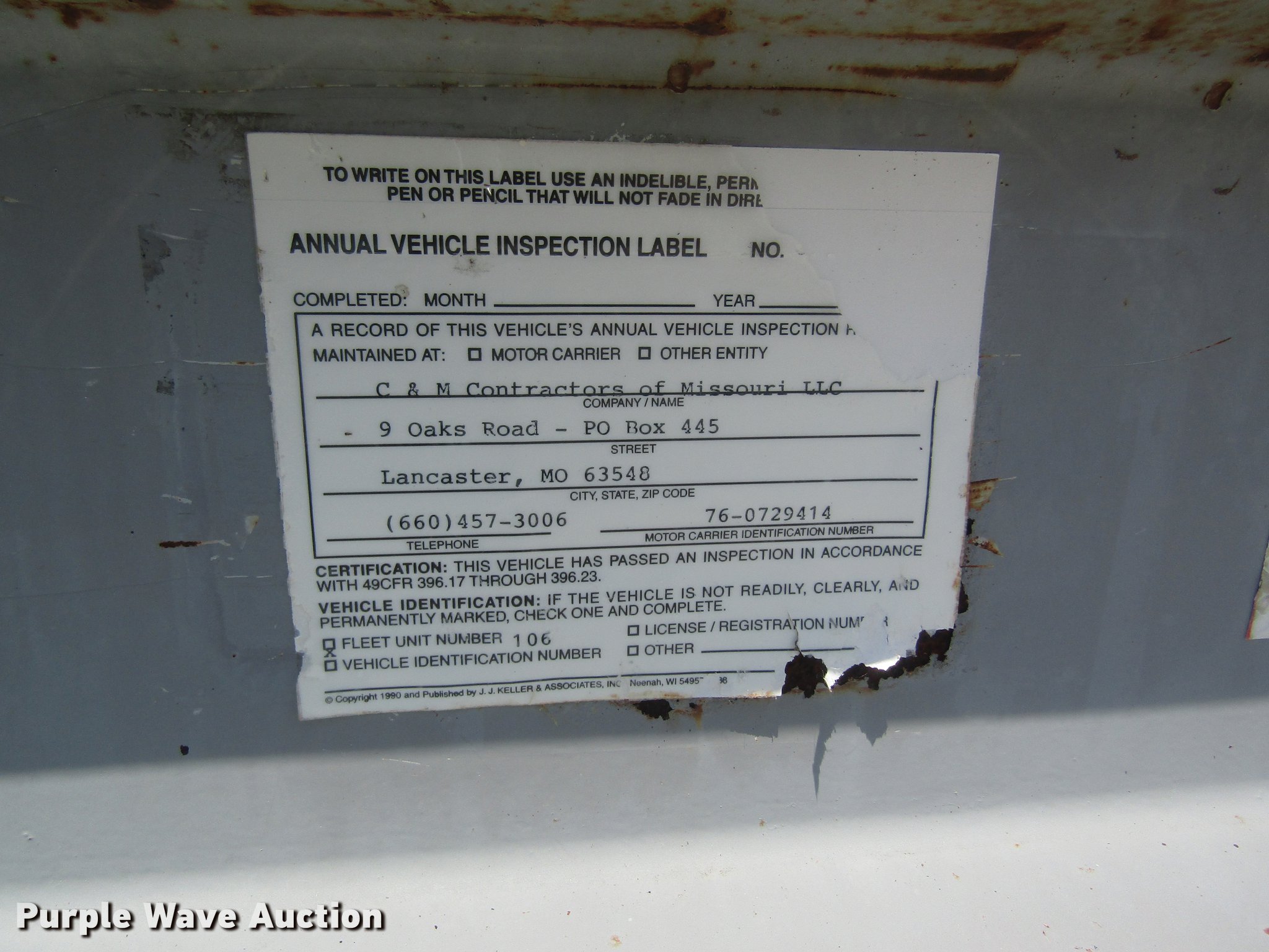 2002 American equipment trailer. 30' overall length, 20'L x 102"W deck, 5'L beavertail, 5'L ramps, Pintle hitch, Single leg landing gear, Spring suspension, Air brakes, Tandem axle, Steel wheels, 215/75R17.5 tires. Missouri title. 1A9HF302421572064. C & M Contractors. 15790 State Hwy 63. Lancaster, MO 63548