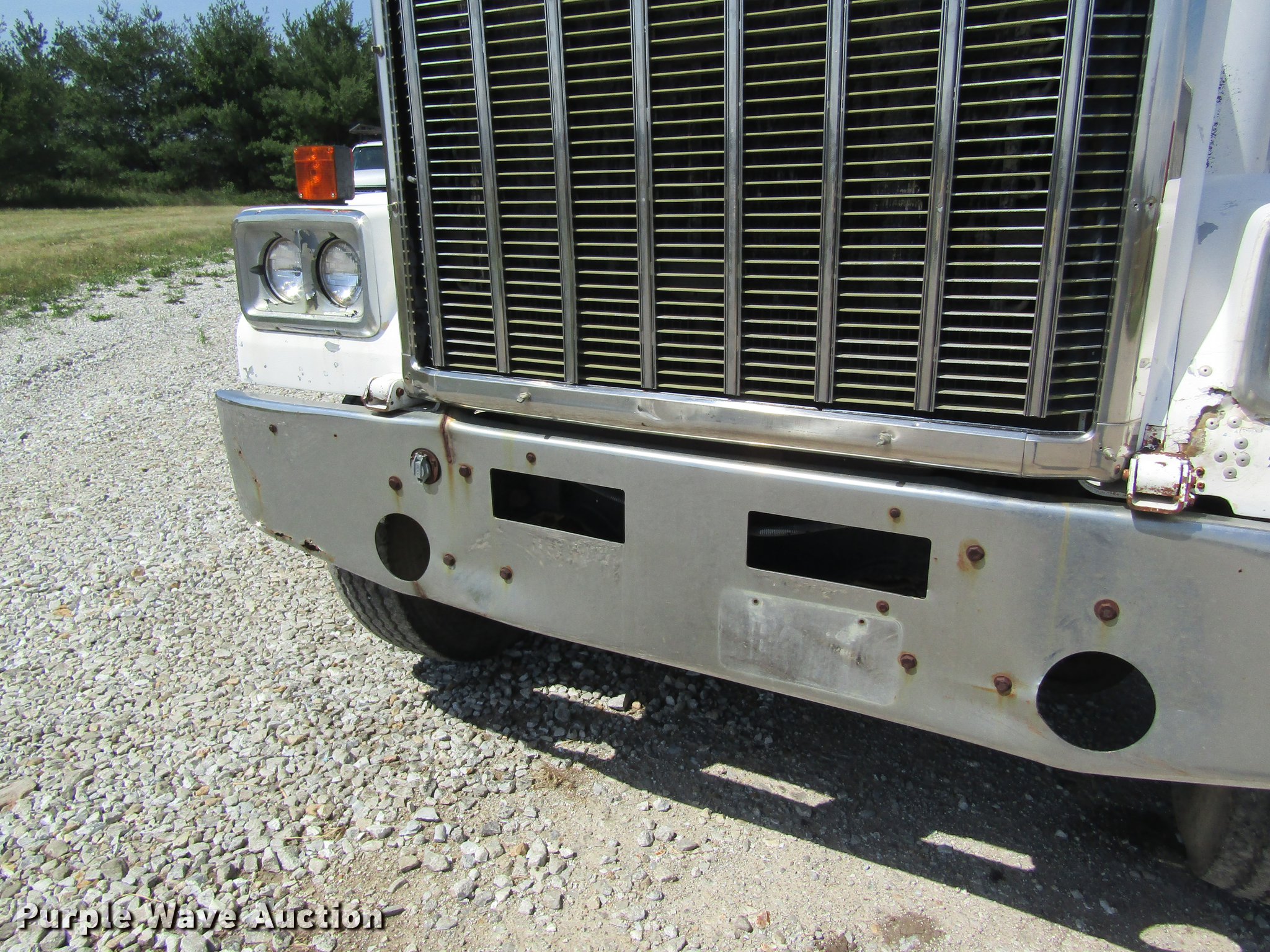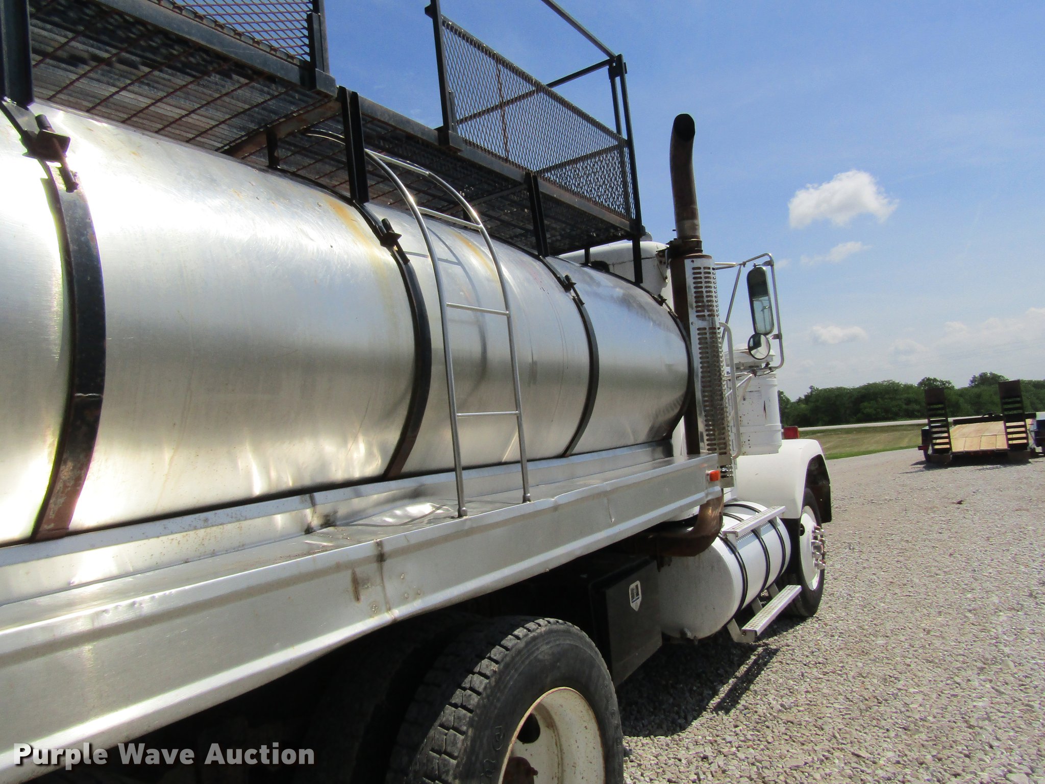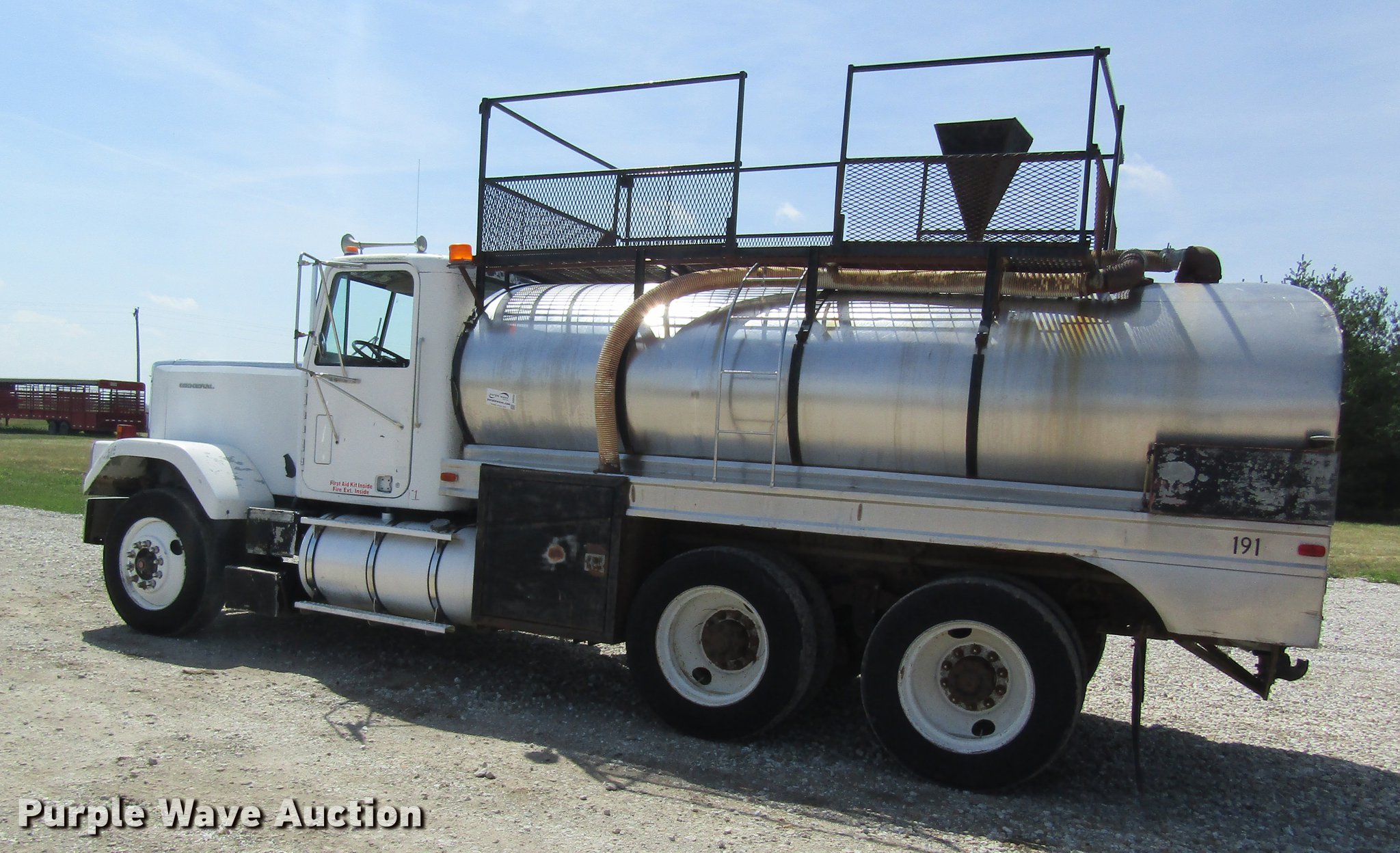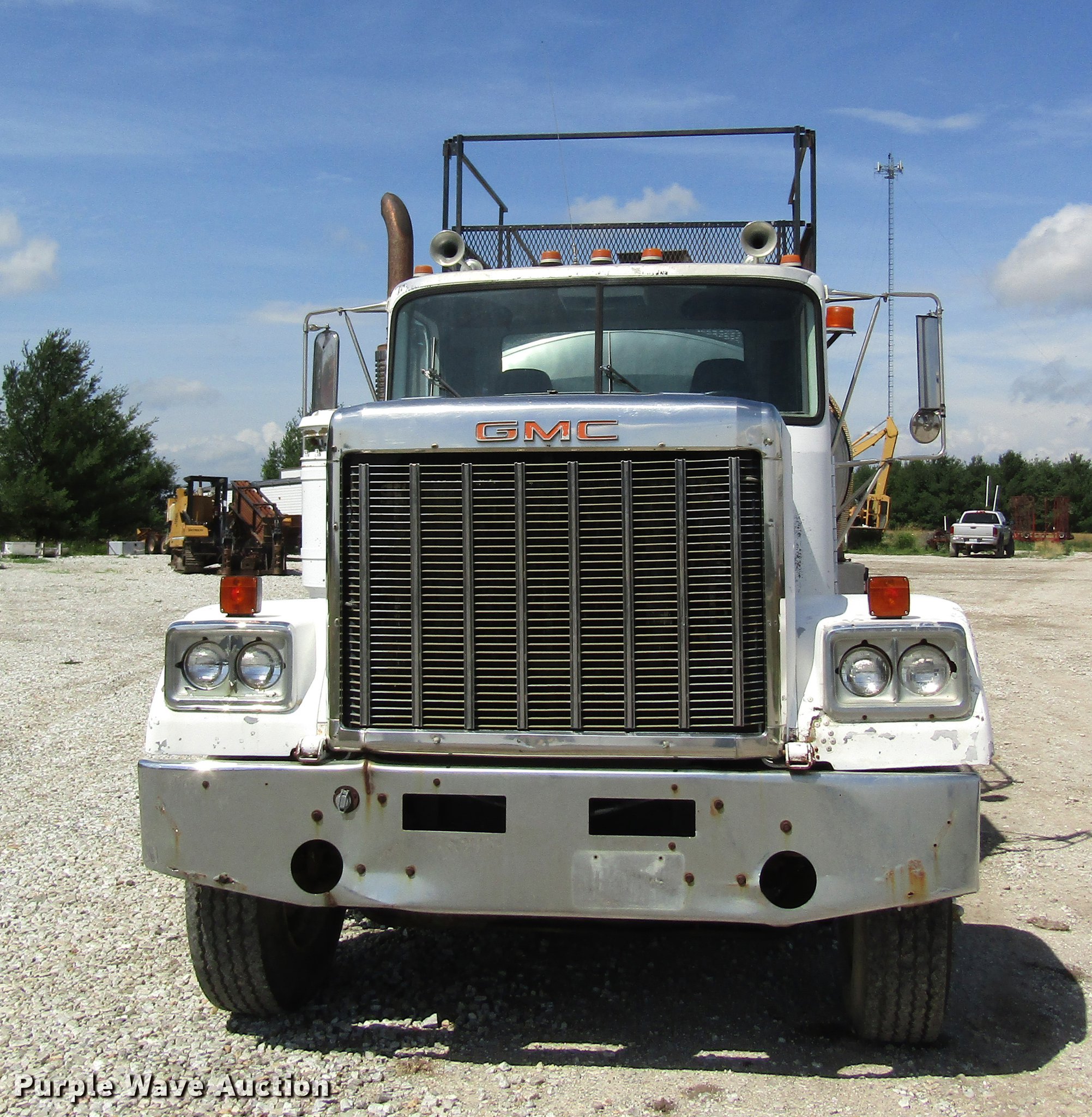 1986 GMC General tank truck. 352,487 miles on odometer, Cummins NTC 14.0L L6 turbo diesel engine, Eaton Fuller nine manual transmission, Tandem axle, Heat, Air suspension, 15'L tank 2,200 gallon capacity, Rear hose reel, Rear discharge, Top fill, Toolbox, Ladder, Dual fuel tanks, Single exhaust stack, Pintle hitch, Trailer wiring, Spring suspension, Air brakes, 285/75R24.5 tires, GVWR 49,000 lbs. Missouri title. 1GDT9F4C7GV510316. C & M Contractors. 15790 State Hwy 63. Lancaster, MO 63548