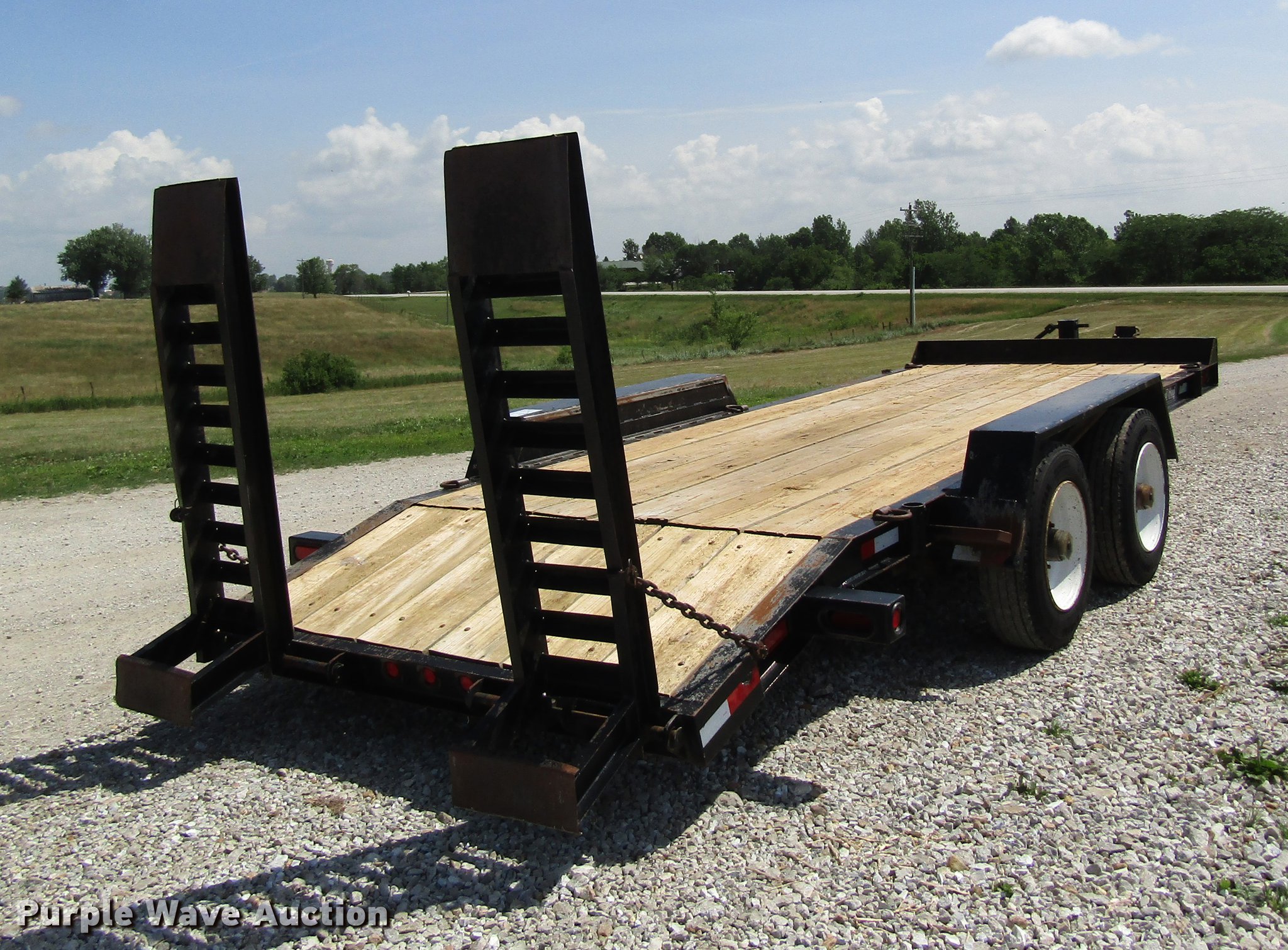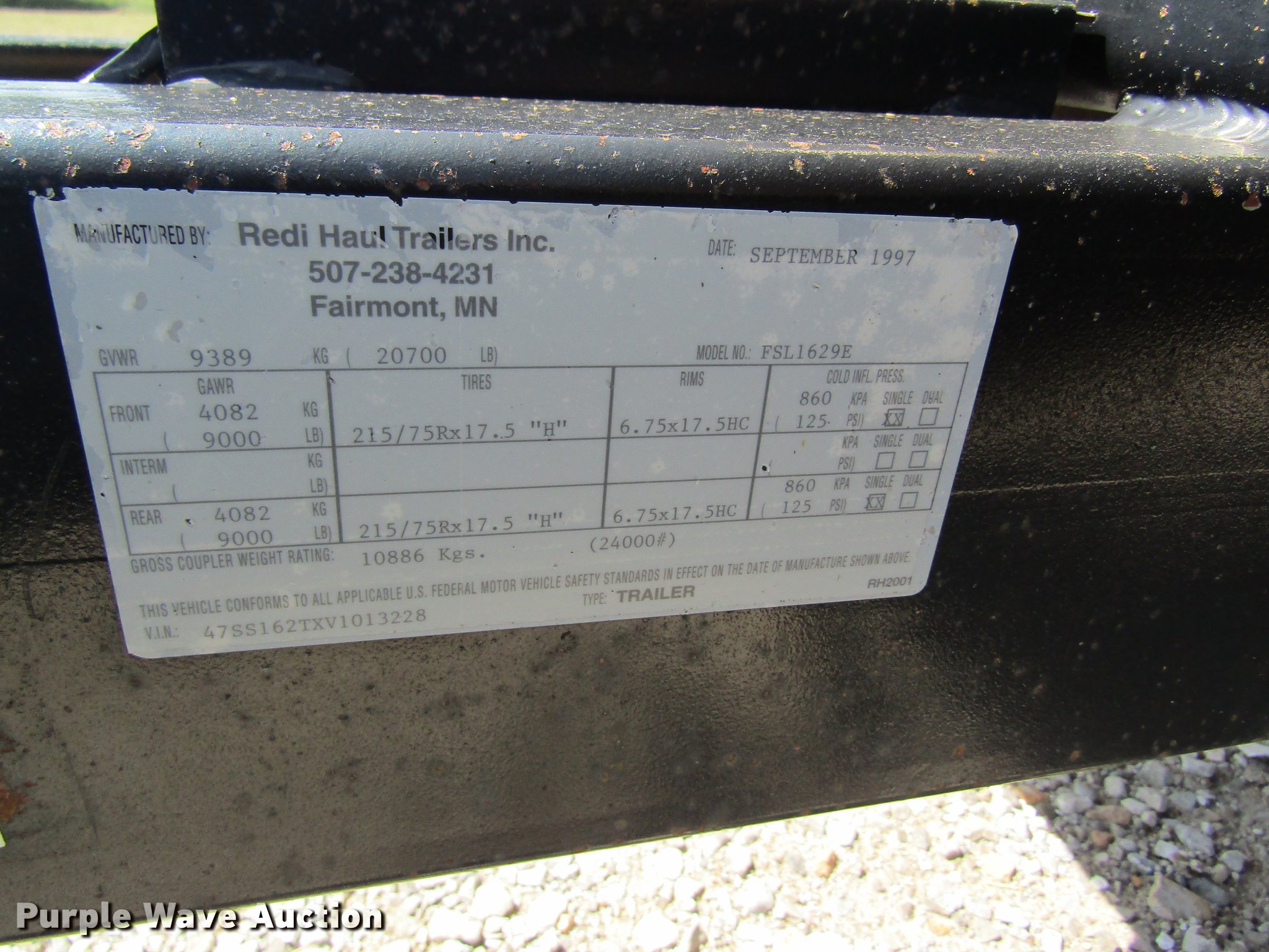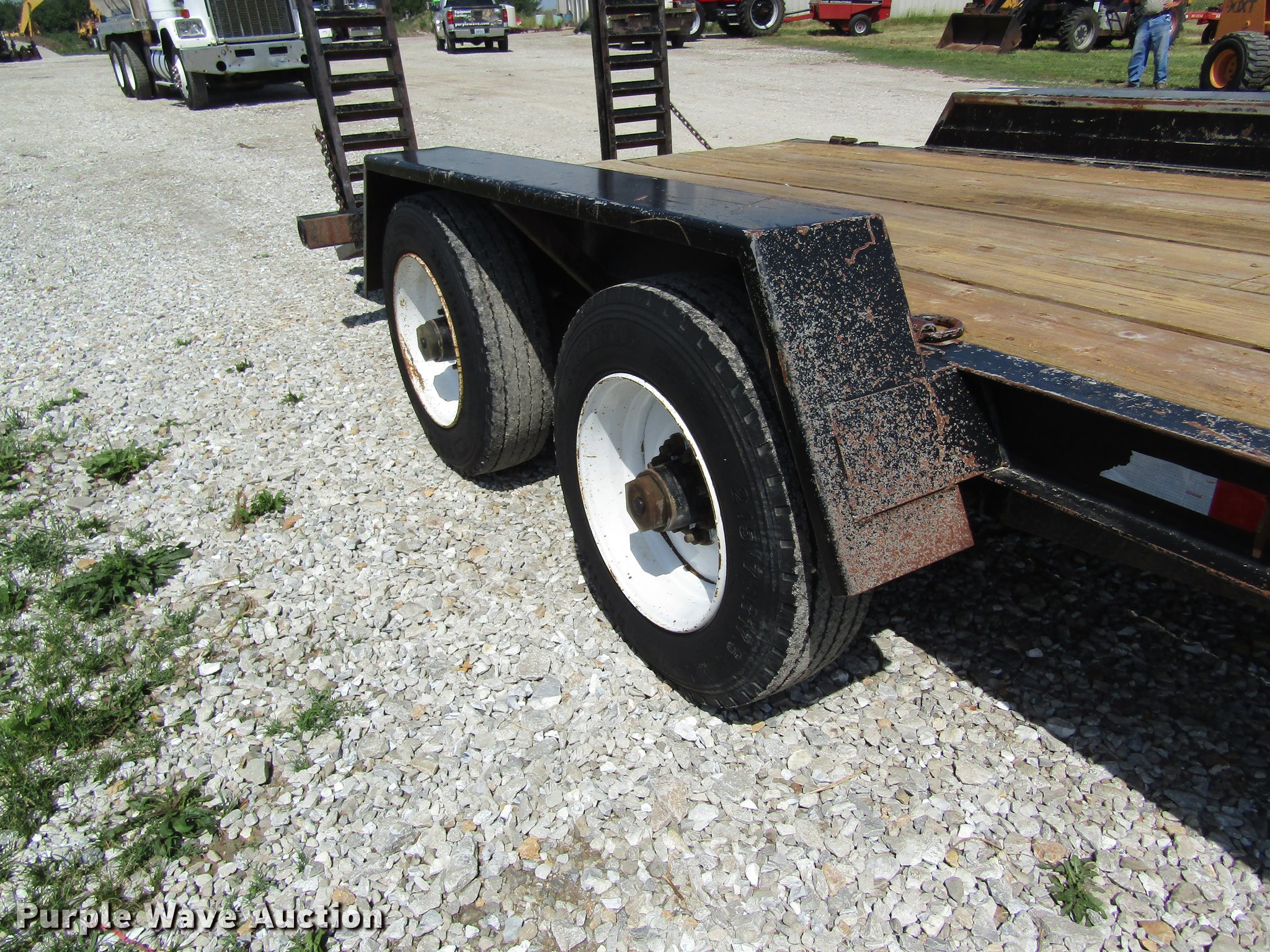 Purple Wave is selling a used Equip. Trailer in Missouri. This item is a 1997 Redi Haul FSL1629E equipment trailer with the following: 25' overall length, 16'L x 78"W wood deck, 81"W I.D., 3'L dovetail, 5'L ramps, D-ring tie downs, Pintle hitch, Single leg landing gear, Spring suspension, Elecrtic brakes, Steel wheels, 215/75R17.5 tires, GVWR 20,700 lbs