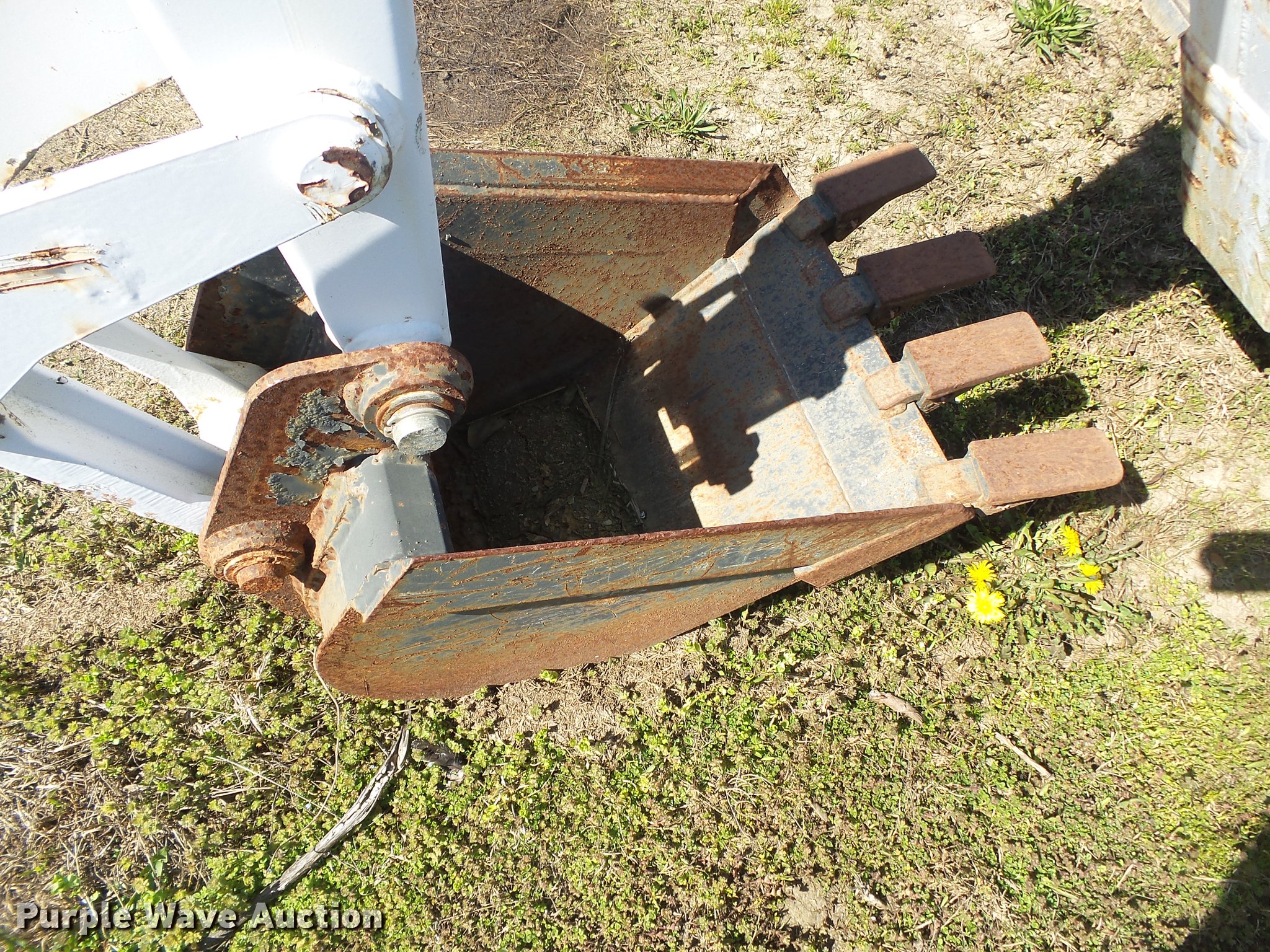 Purple Wave is selling a used Skid Steer Attach. in Missouri. This item is a Bobcat 607 skid steer backhoe attachment with the following: Two stick controls, 16"W bucket, (4) bolt-on teeth, Pin-on, 38" pin to pin stick length, Hydraulic stabilizers, Boom and stick hydraulic cylinder shaft rusted, Serial 775002378
