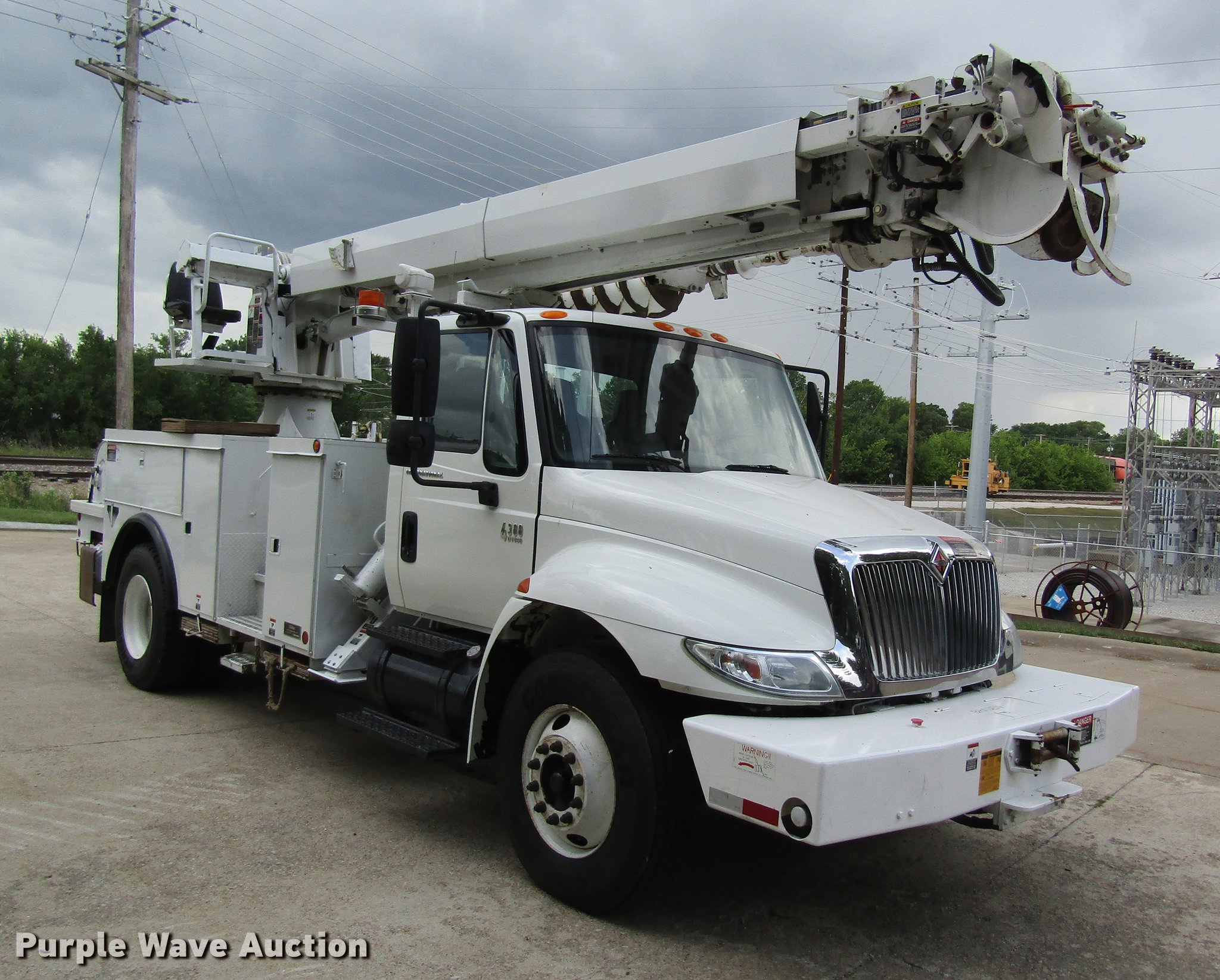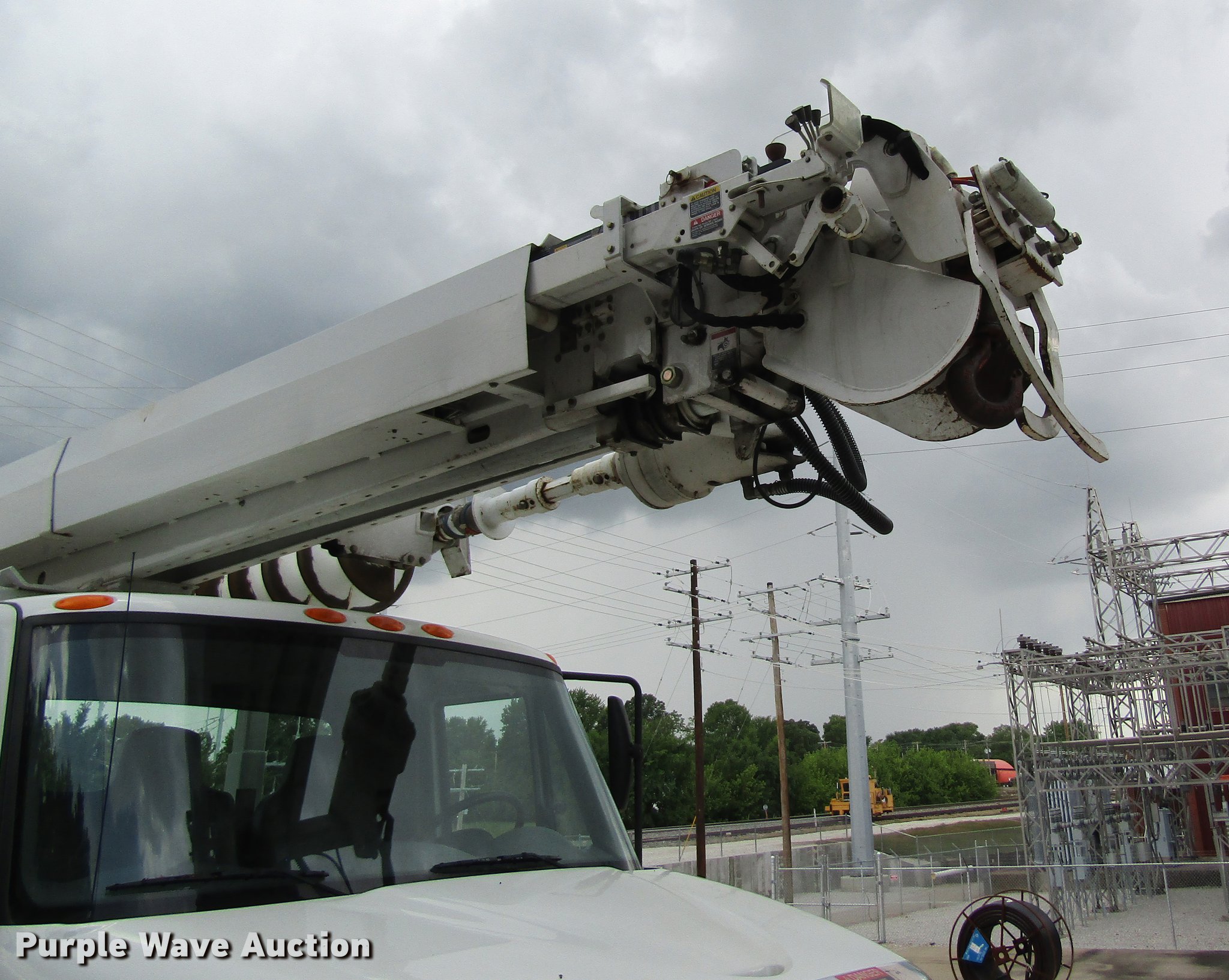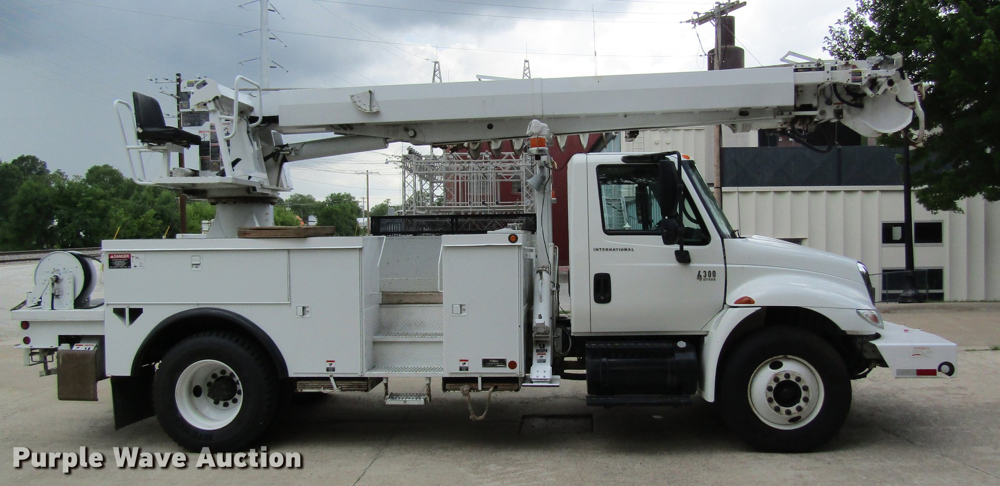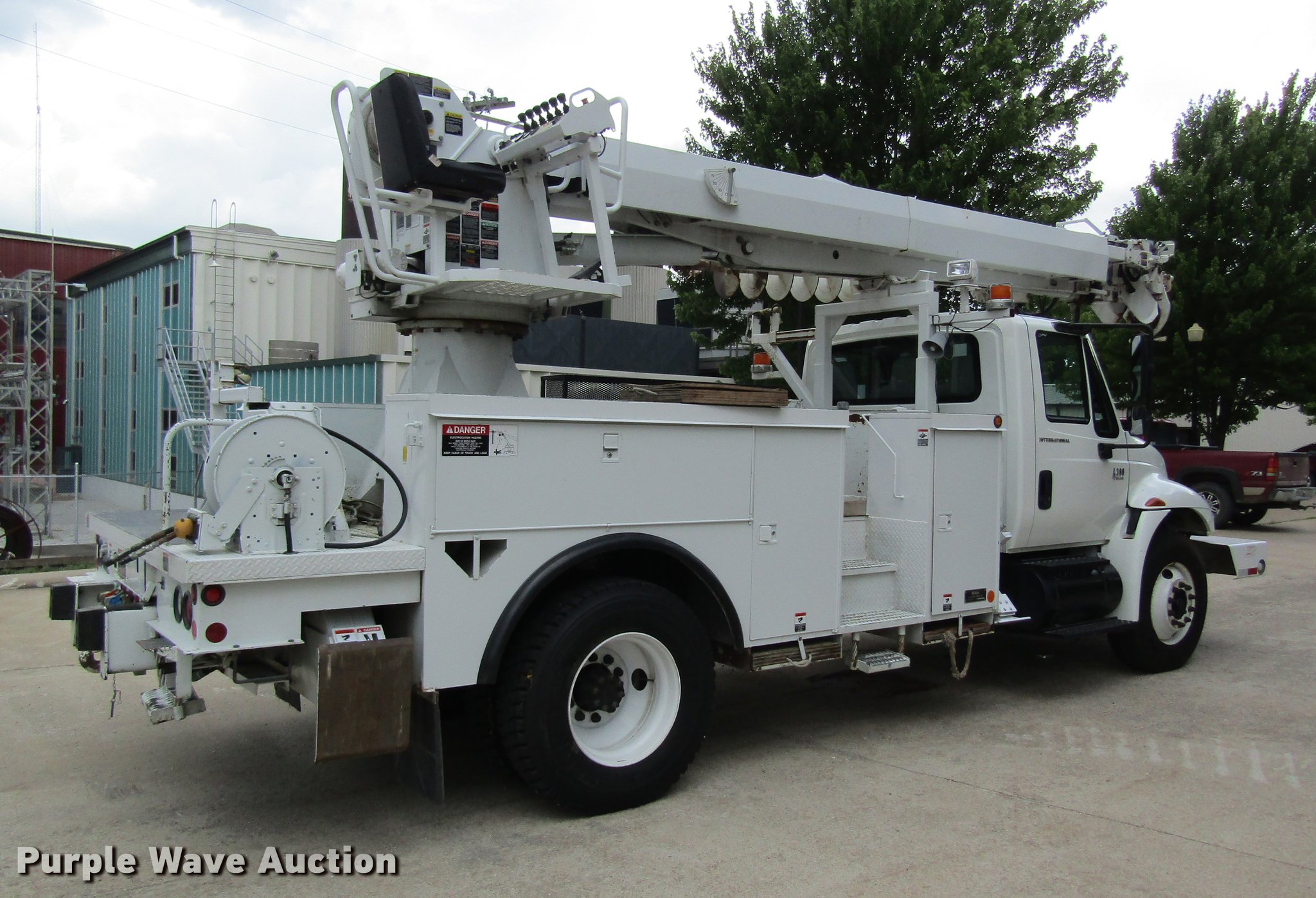 Purple Wave is selling a used Digger Derrick Truck in Missouri. This item is a 2004 International 4300 digger derrick truck with the following: 34,506 miles on odometer, 4,043 hours on meter, International DT466 7.6L L6 turbo diesel engine, Automatic transmission, Single axle, AC and heat, Cruise, AM/FM, Suspension seat, Beacon light, PTO, Altec service bed, 15'L, Shelving, Braden winch, Serial 372164228, Altec DM47 digger derrick, 12,000 lbs max lift capacity, 47' max lift height, Platform boom controls, Boom rotation, Pole guide, Telescopic boom, 18" diameter auger, Rope material handler, (4) outriggers, Serial 1203DV02631, Single fuel tank, Spring suspension, Air brakes, 11R22.5 tires