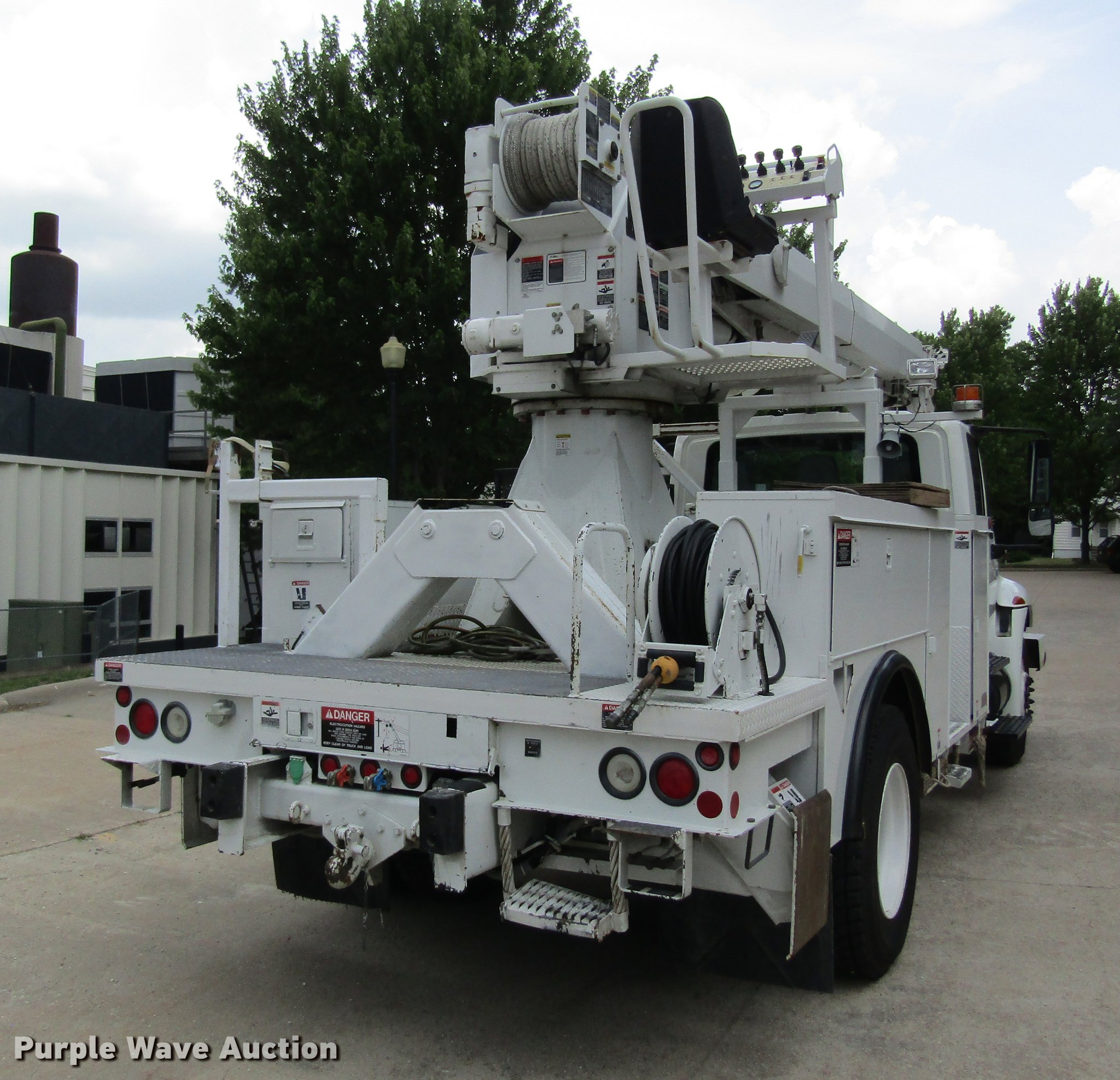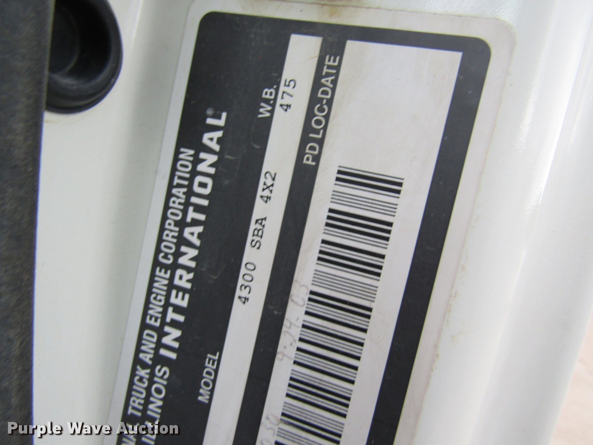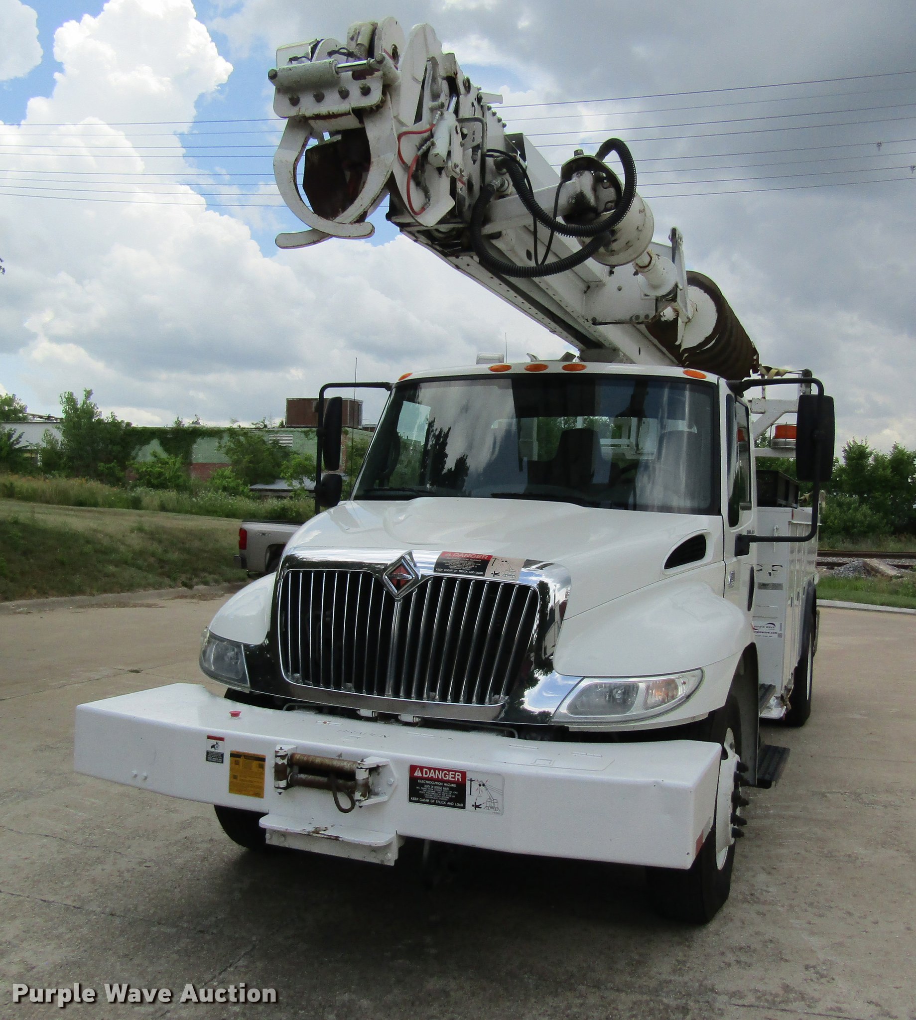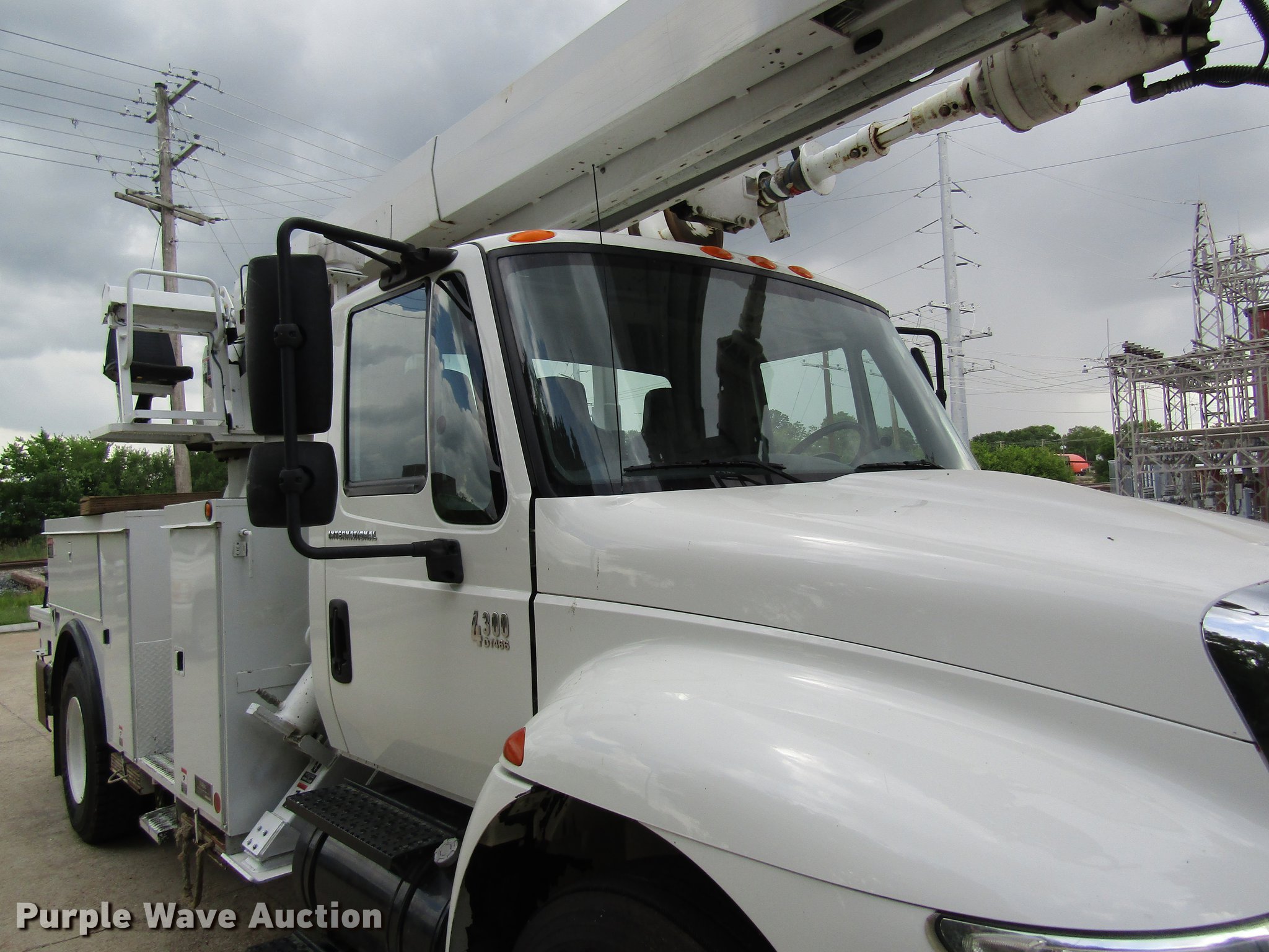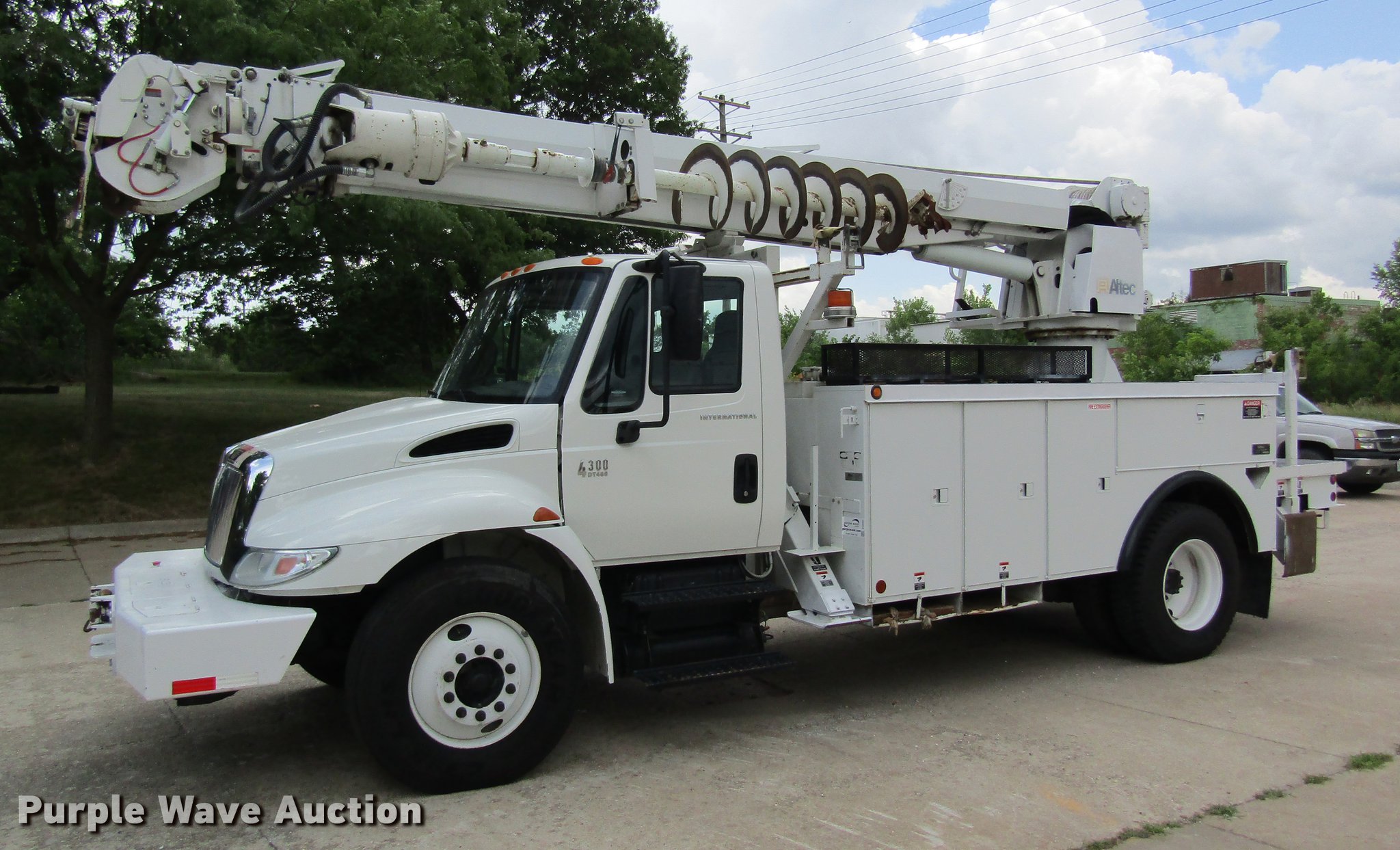 Purple Wave is selling a used Digger Derrick Truck in Missouri. This item is a 2004 International 4300 digger derrick truck with the following: 34,506 miles on odometer, 4,043 hours on meter, International DT466 7.6L L6 turbo diesel engine, Automatic transmission, Single axle, AC and heat, Cruise, AM/FM, Suspension seat, Beacon light, PTO, Altec service bed, 15'L, Shelving, Braden winch, Serial 372164228, Altec DM47 digger derrick, 12,000 lbs max lift capacity, 47' max lift height, Platform boom controls, Boom rotation, Pole guide, Telescopic boom, 18" diameter auger, Rope material handler, (4) outriggers, Serial 1203DV02631, Single fuel tank, Spring suspension, Air brakes, 11R22.5 tires