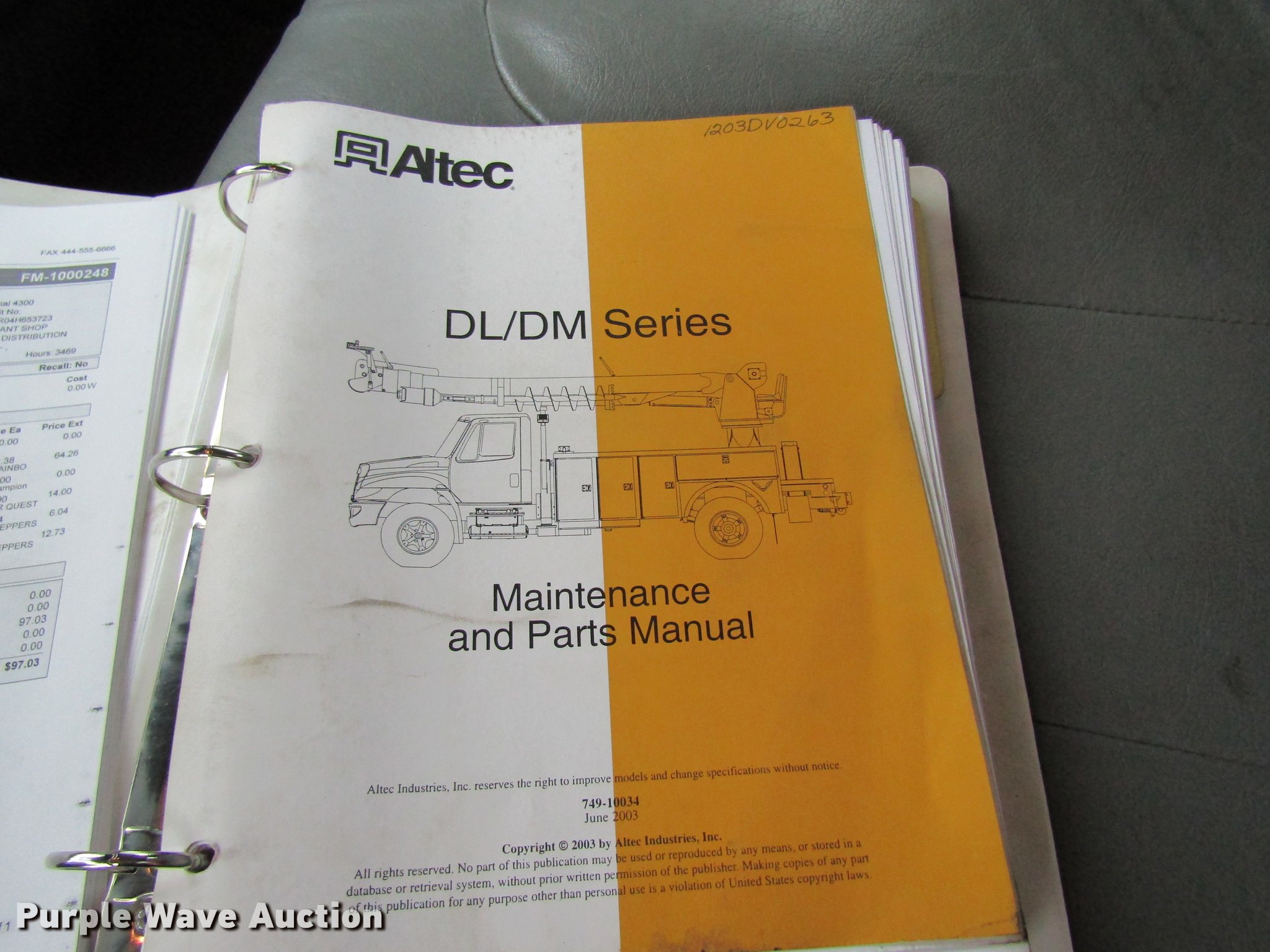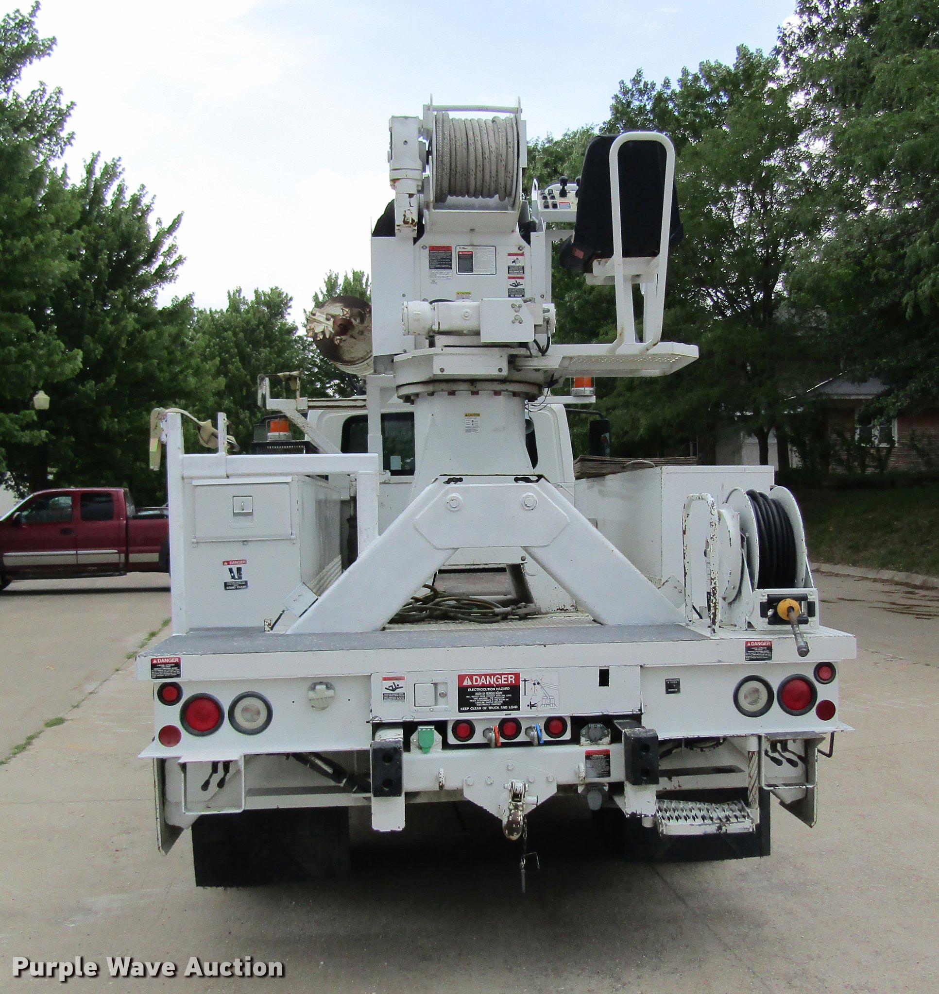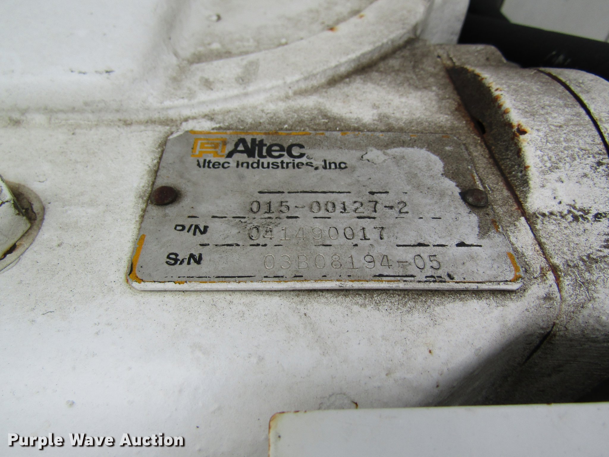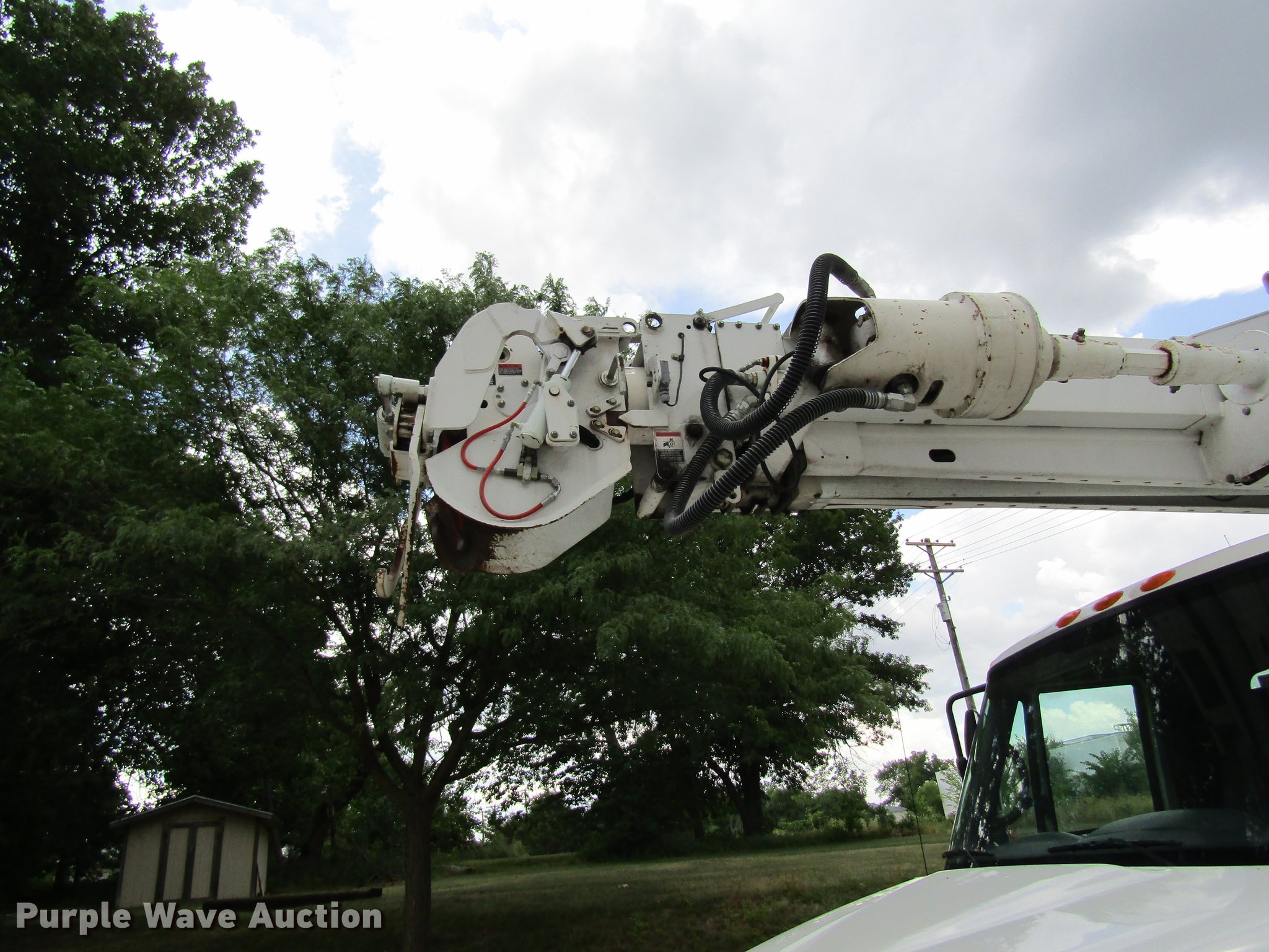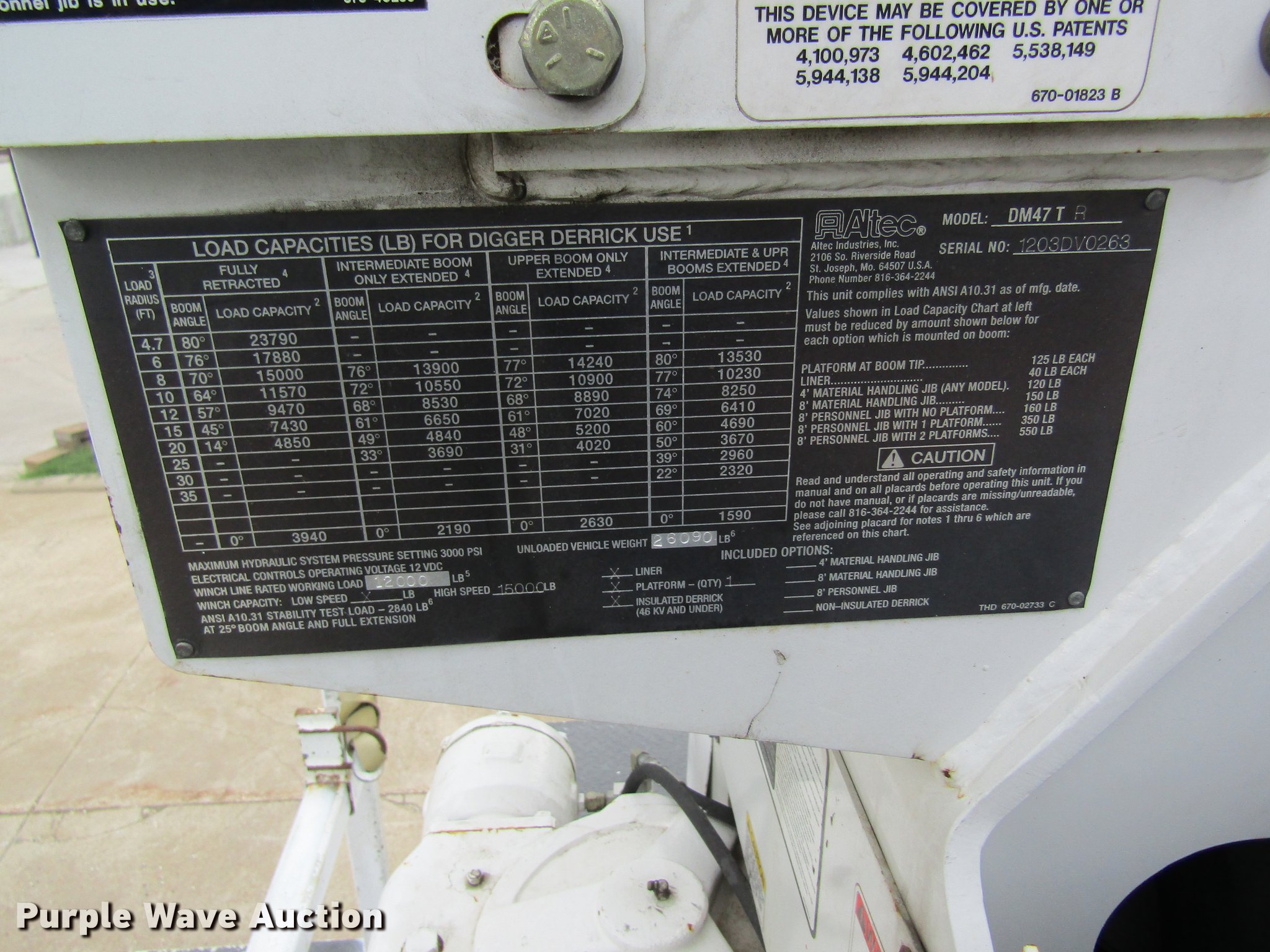 Purple Wave is selling a used Digger Derrick Truck in Missouri. This item is a 2004 International 4300 digger derrick truck with the following: 34,506 miles on odometer, 4,043 hours on meter, International DT466 7.6L L6 turbo diesel engine, Automatic transmission, Single axle, AC and heat, Cruise, AM/FM, Suspension seat, Beacon light, PTO, Altec service bed, 15'L, Shelving, Braden winch, Serial 372164228, Altec DM47 digger derrick, 12,000 lbs max lift capacity, 47' max lift height, Platform boom controls, Boom rotation, Pole guide, Telescopic boom, 18" diameter auger, Rope material handler, (4) outriggers, Serial 1203DV02631, Single fuel tank, Spring suspension, Air brakes, 11R22.5 tires