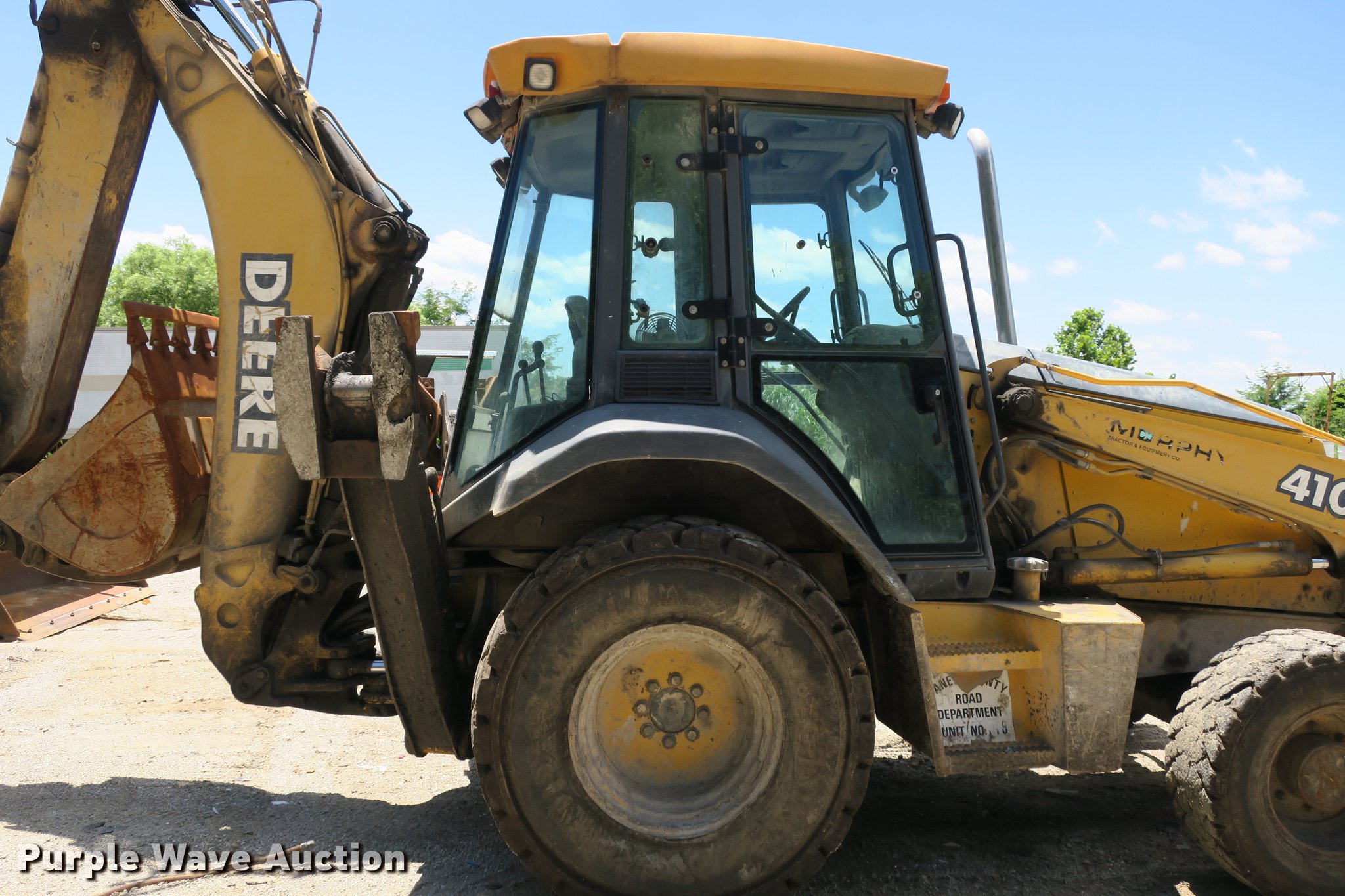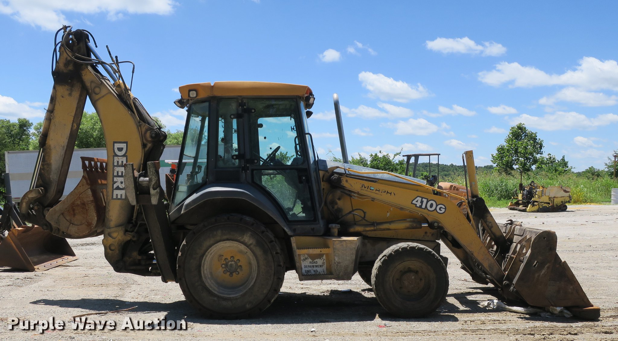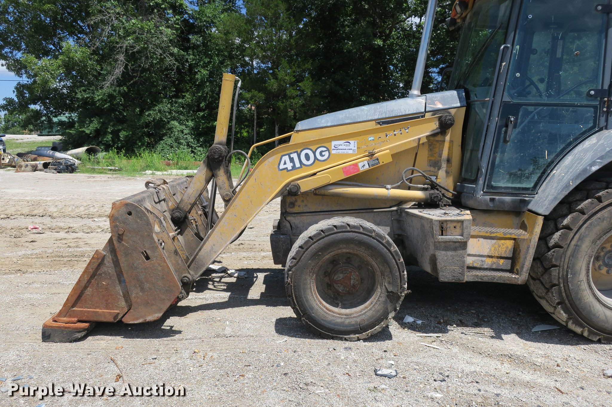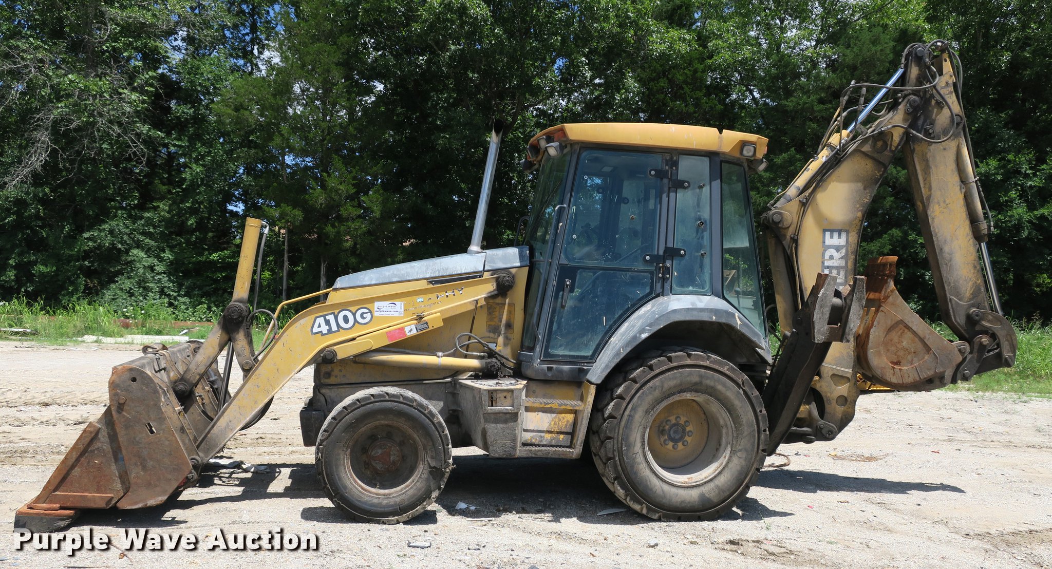 Purple Wave is selling a used Tractor Loader Backhoe in Missouri. This item is a 2003 John Deere 410G backhoe with the following: Unknown hours on meter, John Deere 4045TT082 4.5L four cylinder turbo diesel engine, Powershift transmission, 4F-4R gears, Four wheel drive, Differential lock, EROPS, Heat, AM/FM, Suspension seat, Wobble stick backhoe controls, Front and rear work lights, 84"W loader bucket, 1.25 cu. yd. capacity, Bolt-on cutting edge, Manual quick coupler, Four-in-one bucket, Extendable stick, 24"W backhoe bucket, Weld-on cutting edge, (5) teeth, Front counter weights, 12.5/80-18 front tires, 19.5-24 rear tires, Non-operational extendable stick, No hydraulic cylinder, Chain welded shut, Serial T0410GX913891