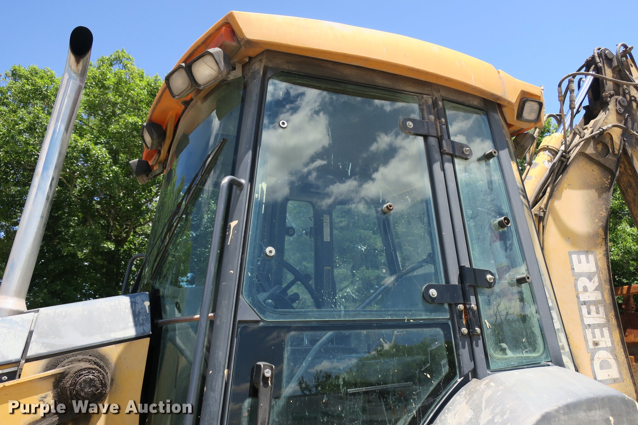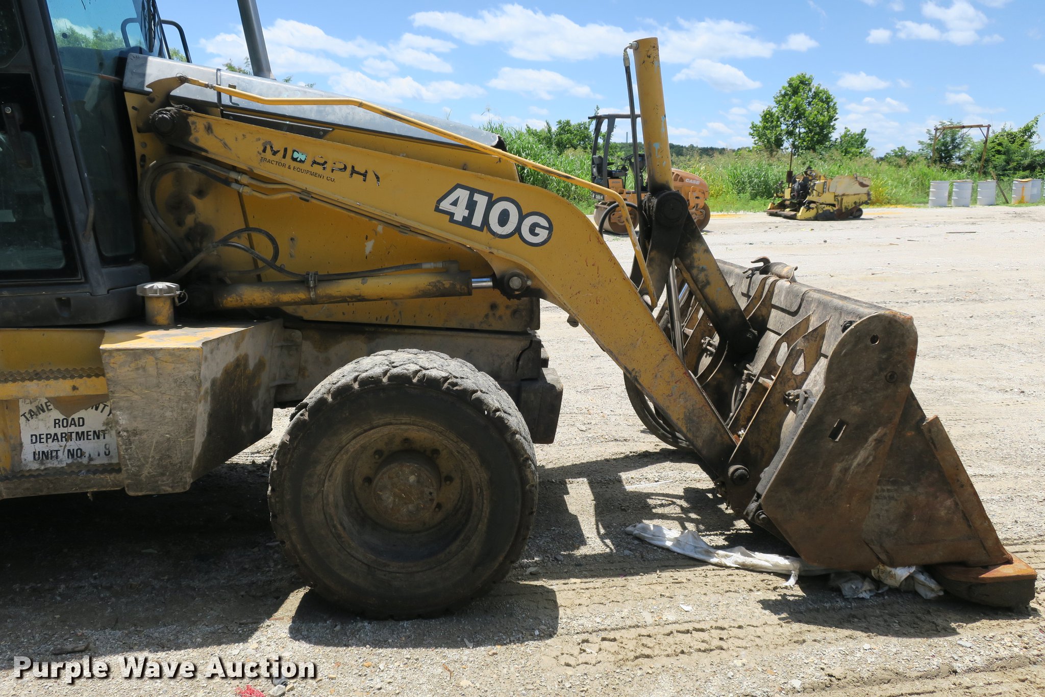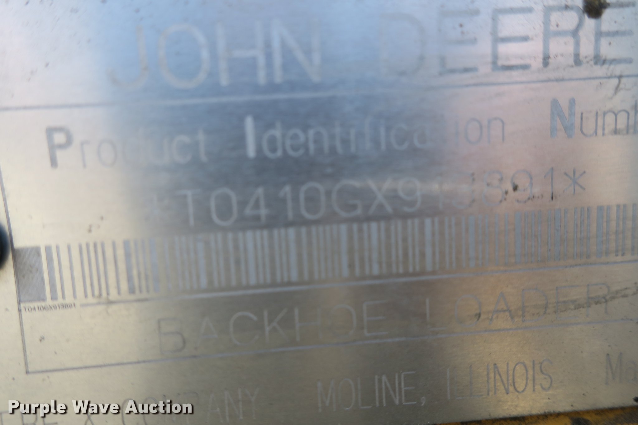 Purple Wave is selling a used Tractor Loader Backhoe in Missouri. This item is a 2003 John Deere 410G backhoe with the following: Unknown hours on meter, John Deere 4045TT082 4.5L four cylinder turbo diesel engine, Powershift transmission, 4F-4R gears, Four wheel drive, Differential lock, EROPS, Heat, AM/FM, Suspension seat, Wobble stick backhoe controls, Front and rear work lights, 84"W loader bucket, 1.25 cu. yd. capacity, Bolt-on cutting edge, Manual quick coupler, Four-in-one bucket, Extendable stick, 24"W backhoe bucket, Weld-on cutting edge, (5) teeth, Front counter weights, 12.5/80-18 front tires, 19.5-24 rear tires, Non-operational extendable stick, No hydraulic cylinder, Chain welded shut, Serial T0410GX913891