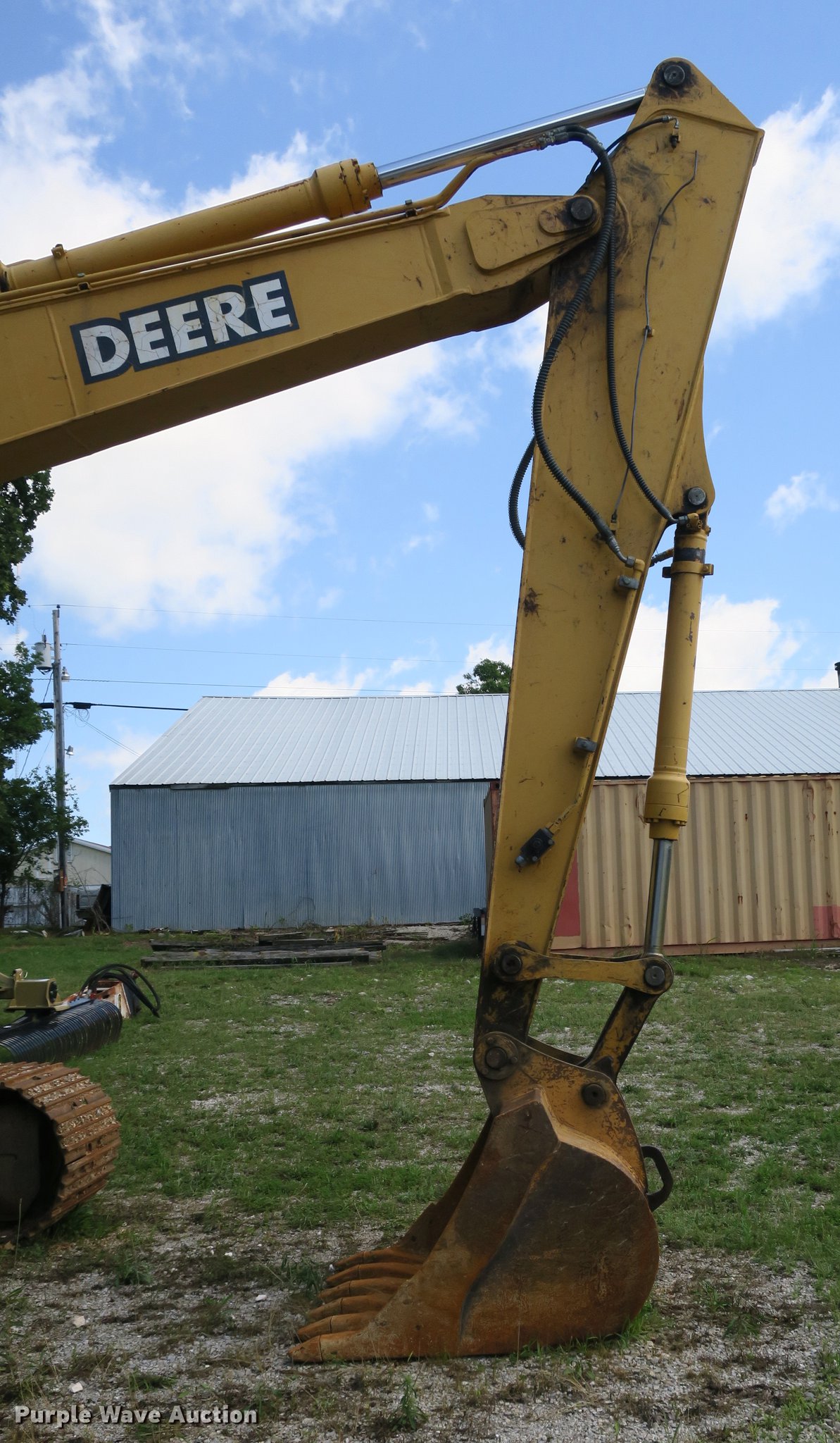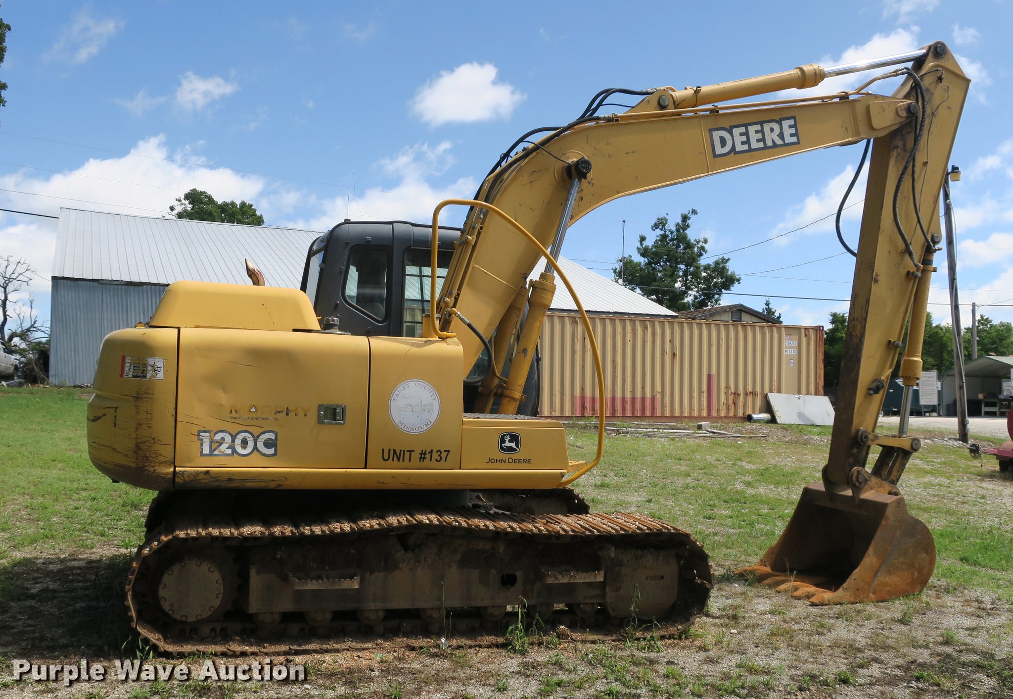 Purple Wave is selling a used Hydraulic Excavator in Missouri. This item is a 2004 John Deere 120C excavator with the following: 5,190 hours on meter, John Deere 4.5L diesel engine, Hydrostatic transmission, AM/FM, Suspension seat, Standard boom, 41"W pin-on bucket, Weld-on cutting edge, (6) bolt-on teeth, One way auxiliary hydraulics, 24"W steel triple grouser track pads, Unknown operating condition, Battery dead, Hydraulic pump damaged, Serial FF120CX034288