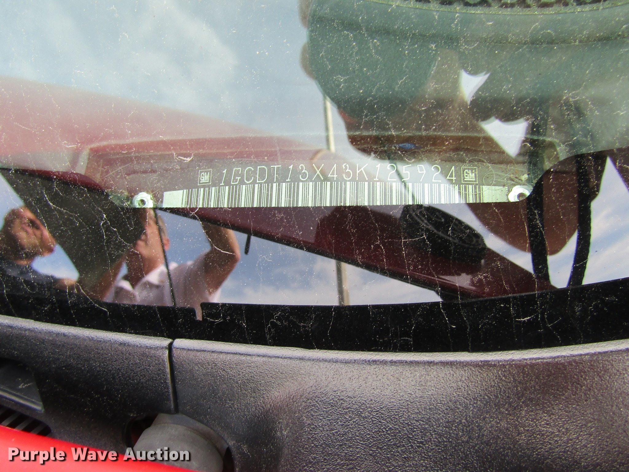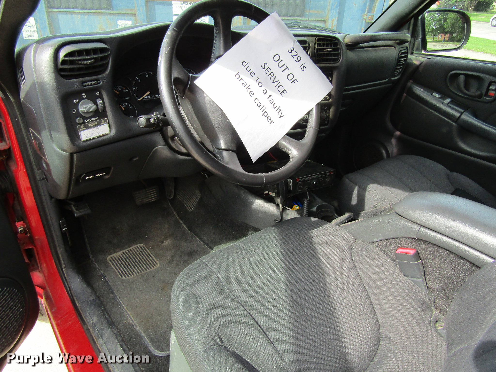 Purple Wave is selling a used Compact Pickup or Van in Iowa. This item is a 2003 Chevrolet S10 Crew Cab pickup truck with the following: 68,779 miles on odometer, 2,968 hours on meter, 4.3L V6 OHV 12V gas engine, Automatic transmission, AC, Tilt, Cruise, AM/FM/CD, Power windows, locks, and mirrors, Cloth interior, Front tow hooks, 235/70R15 tires, CB not included, Brake caliper possibly needs to be replaced, Contents not included, Previously used as K9 arson inspection unit