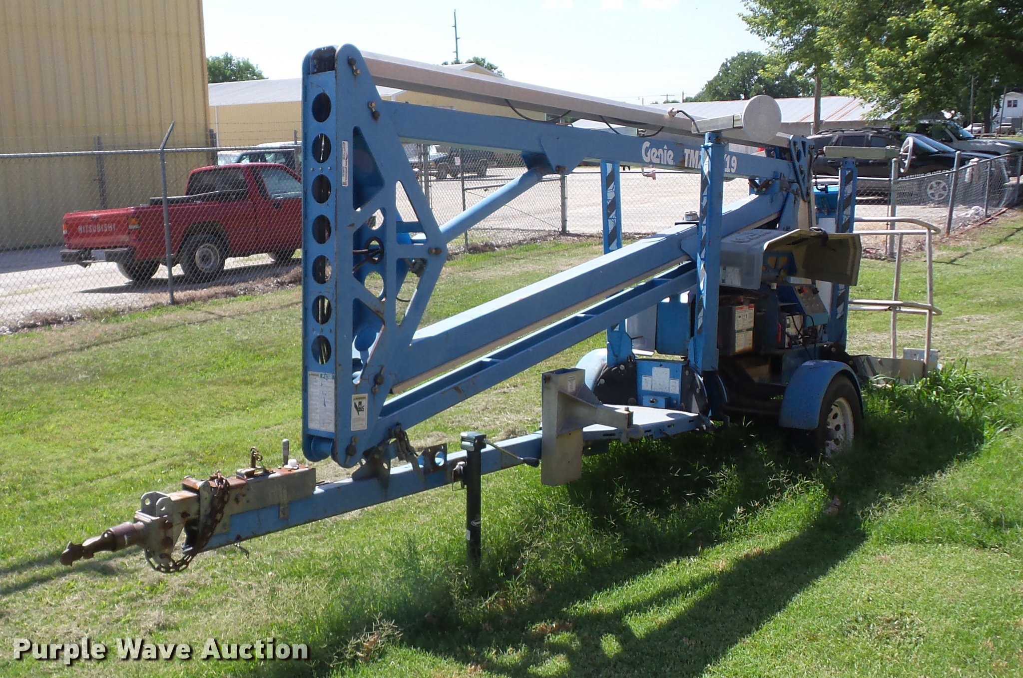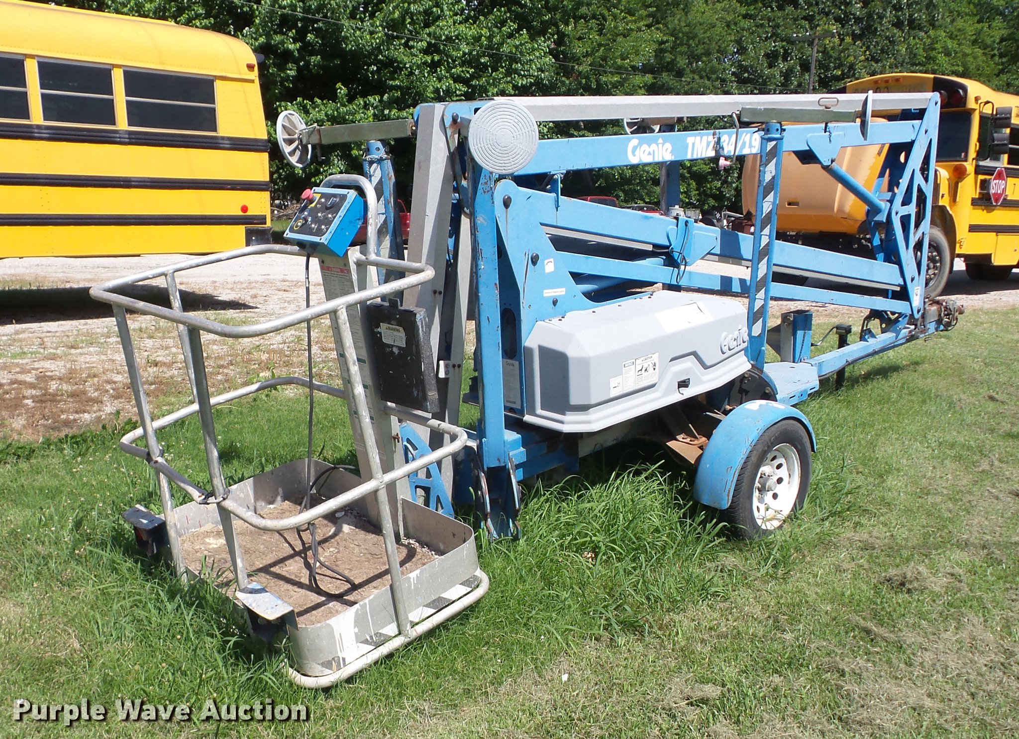Purple Wave is selling a used Boom Lift in Kansas. This item is a Genie TMZ-34-19 boom lift with the following: 24V electric operation, 500 lbs max lift capacity, 90 lbs max side force, Platform controls, Hydraulic platform rotation, Non-operational unit, Batteries need replaced, P195/75R14 tires