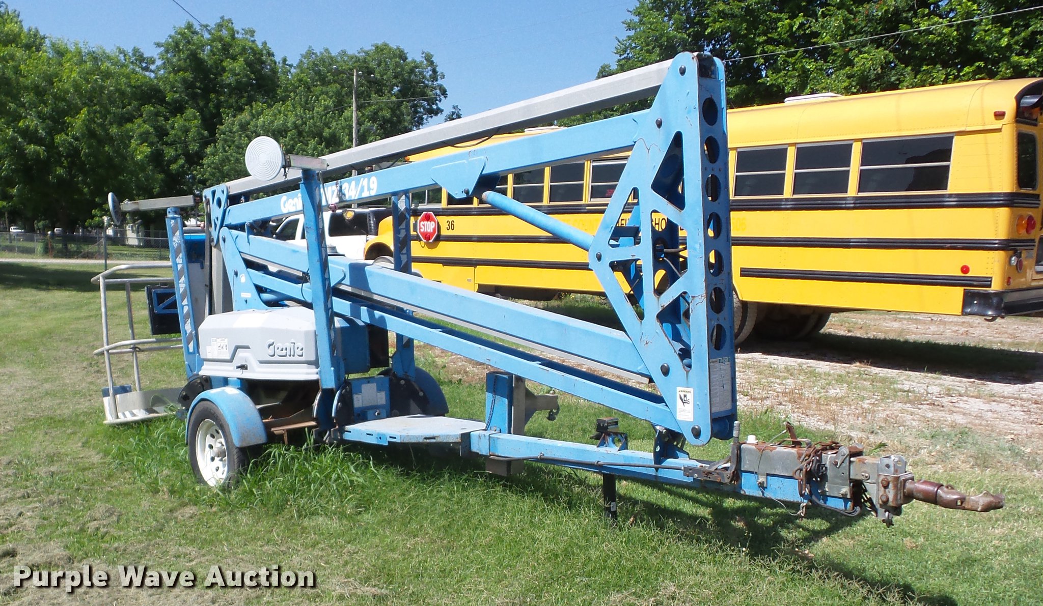 Genie TMZ-34-19 boom lift. 24V electric operation, 500 lbs max lift capacity, 90 lbs max side force, Platform controls, Hydraulic platform rotation, Non-operational unit, Batteries need replaced, P195/75R14 tires. USD 506. 1019 E 6th St. Altamont, KS 67330