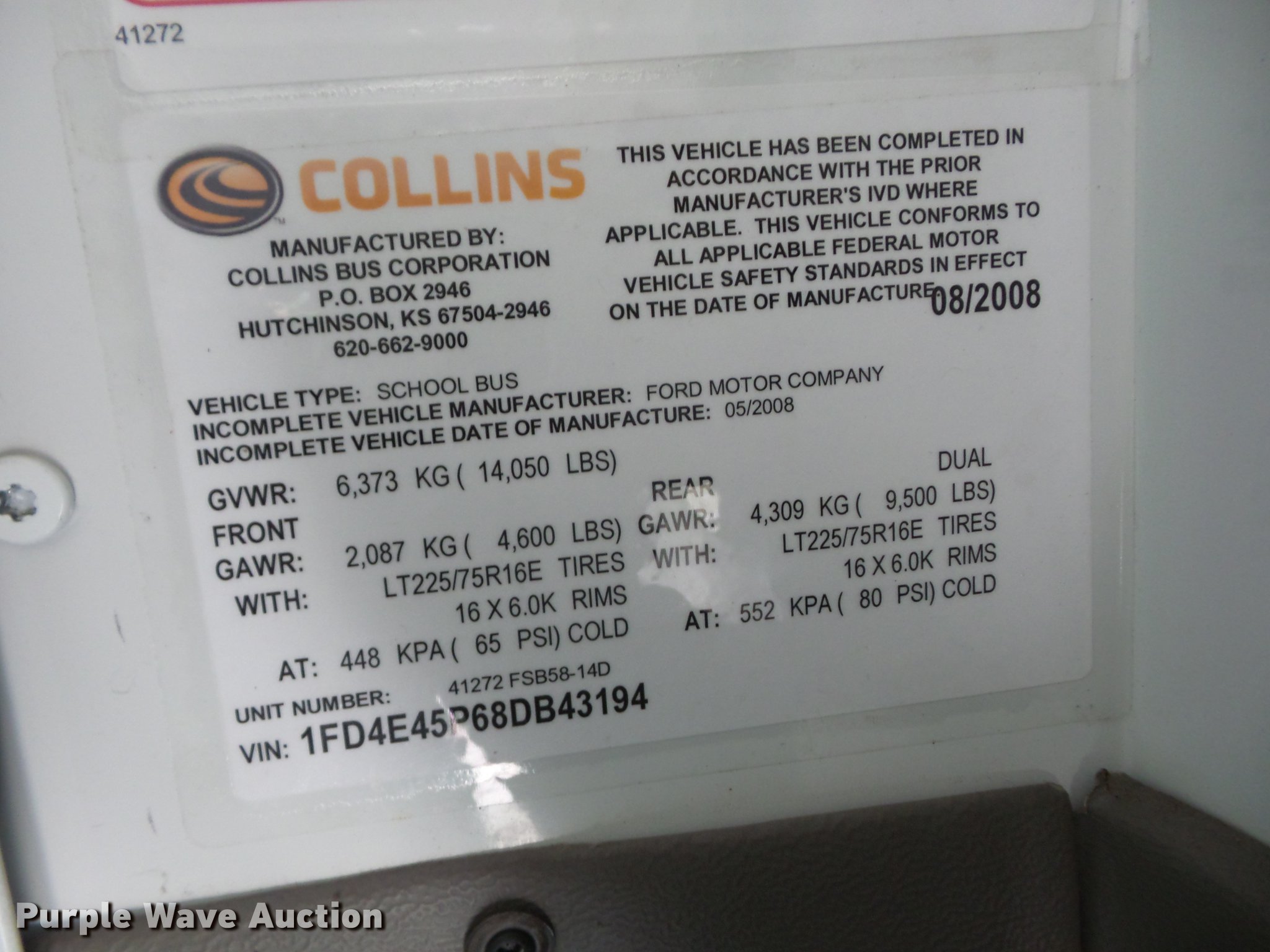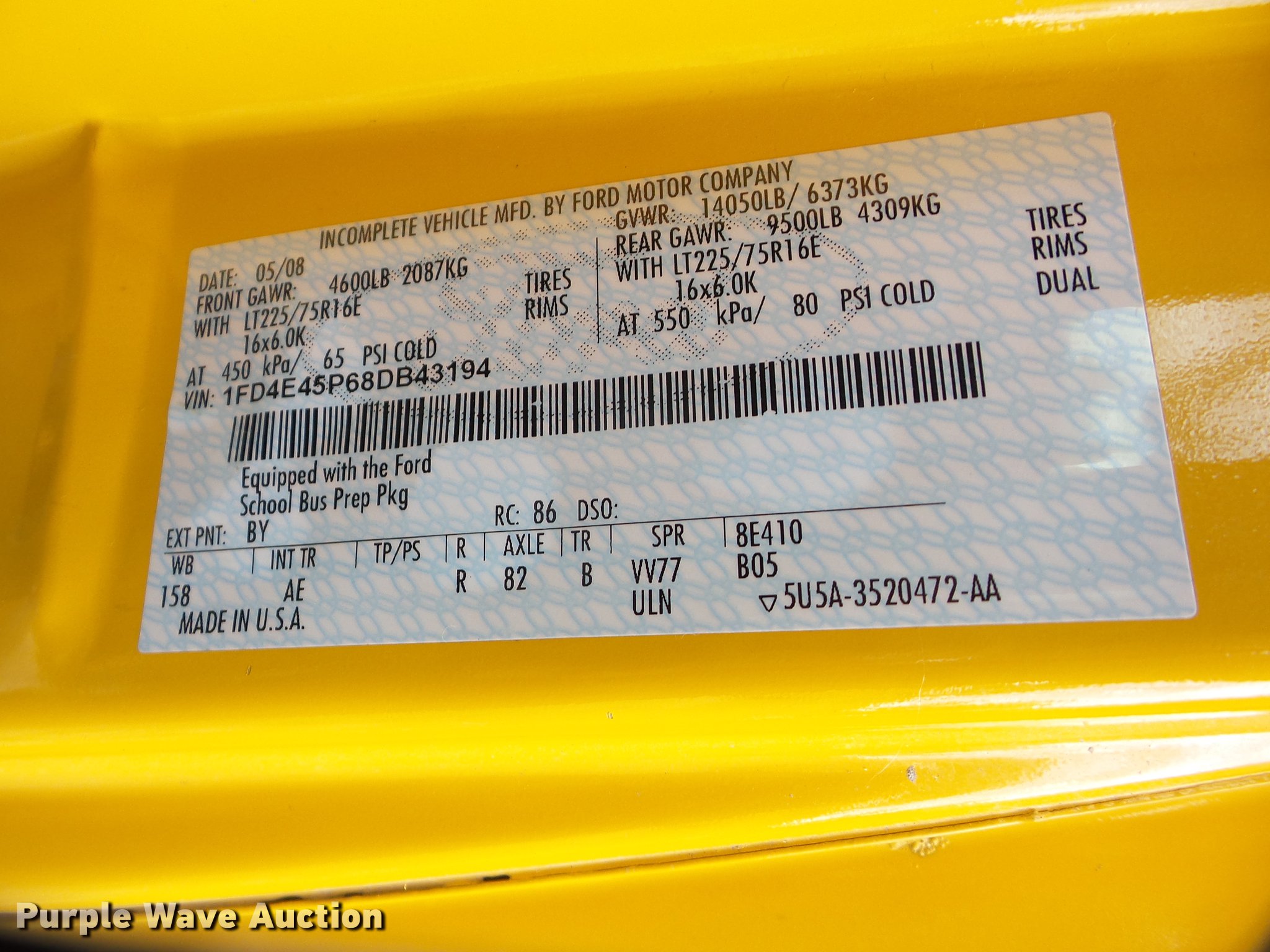 Purple Wave is selling a used Bus in Kansas. This item is a 2008 Ford Econoline E450 school bus with the following: 129,879 miles on odometer, 6.0L V8 OHV 32V turbo diesel engine, Automatic transmission, Single axle, AC and heat, Rear AC, AM/FM, Heated mirrors, 21 passenger capacity, (20) child safety seats, Ceiling, front, rear, and side emergency exits, Lighted stop sign, Spring suspension, Hydraulic brakes, LT225/75R16 tires, GVWR 14,050 lbs, Unit# 1