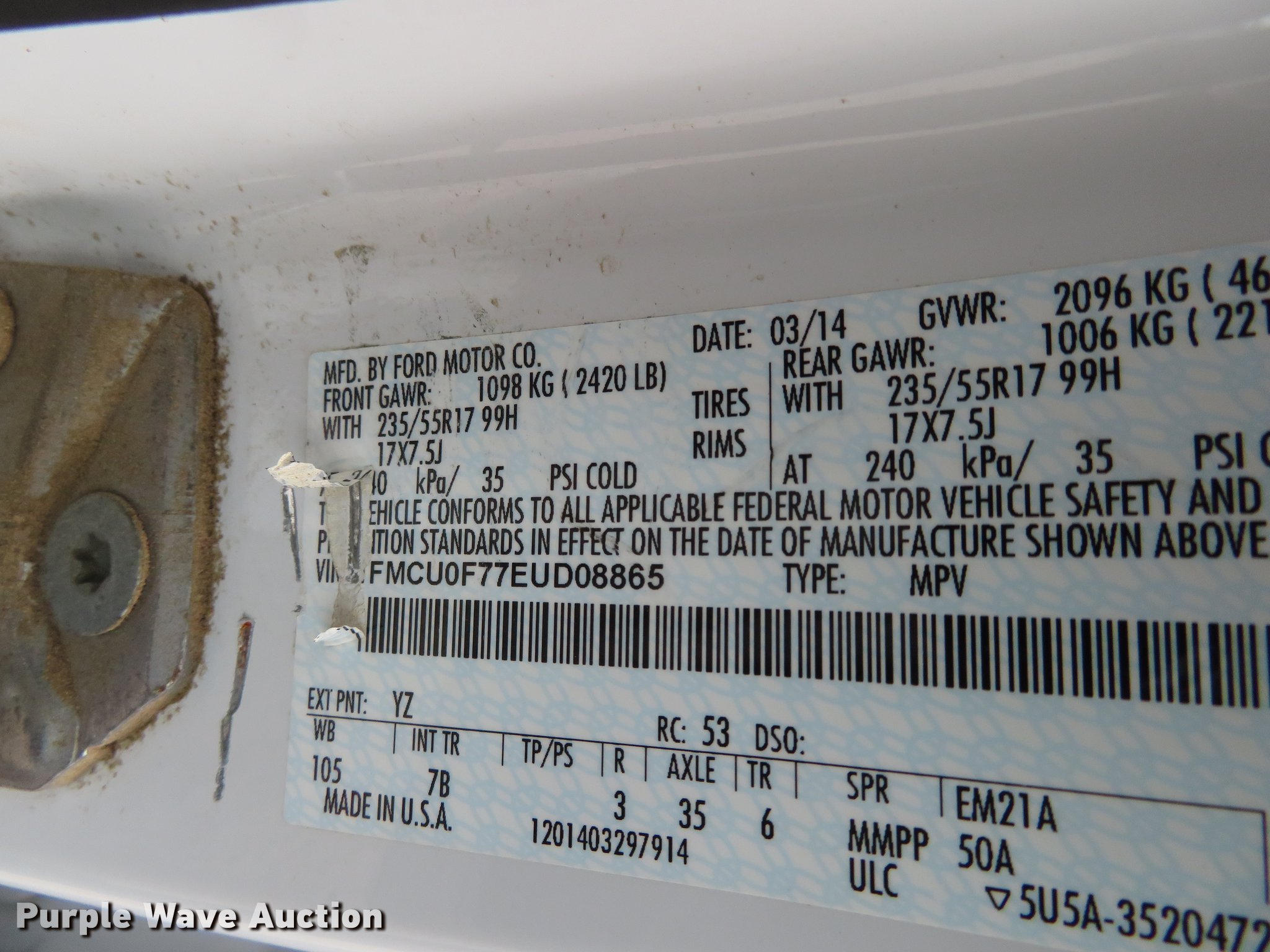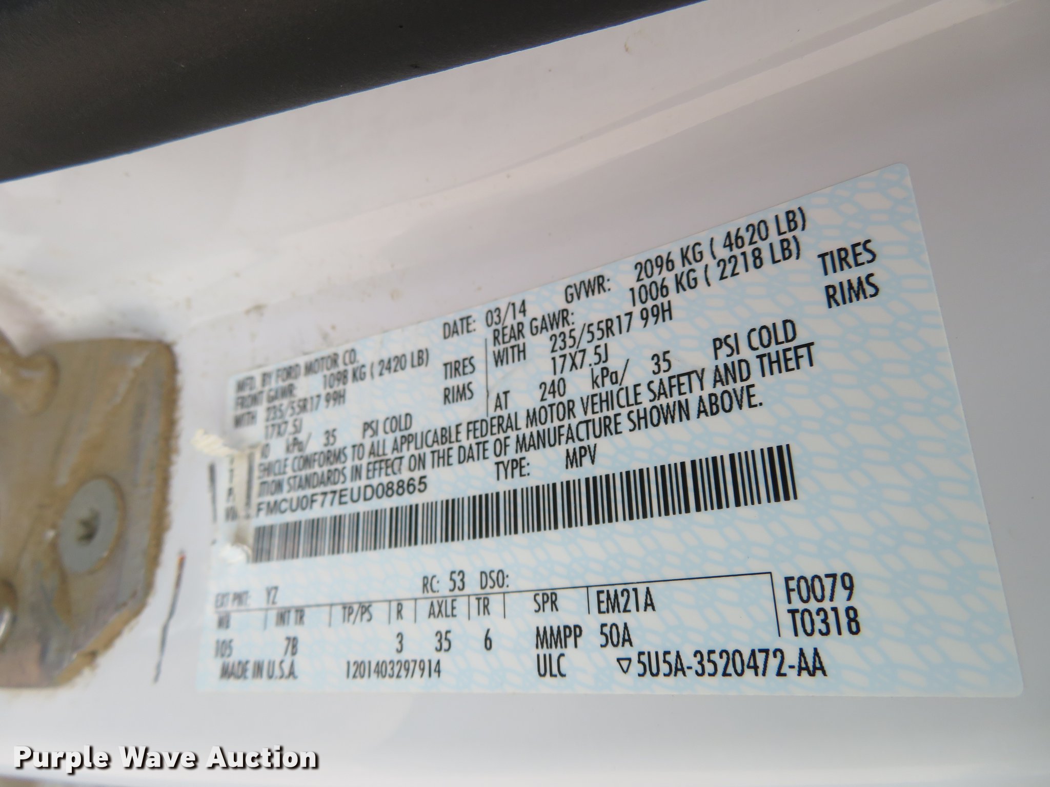 Purple Wave is selling a used Passenger Vehicle in Kansas. This item is a 2014 Ford Escape SUV with the following: 102,923 miles on odometer, 2.5L L4 DOHC 16V gas engine, Automatic transmission, AC and heat, Tilt, Cruise, AM/FM/Cd, Power windows and locks, Cloth interior, 295/55R17 tires