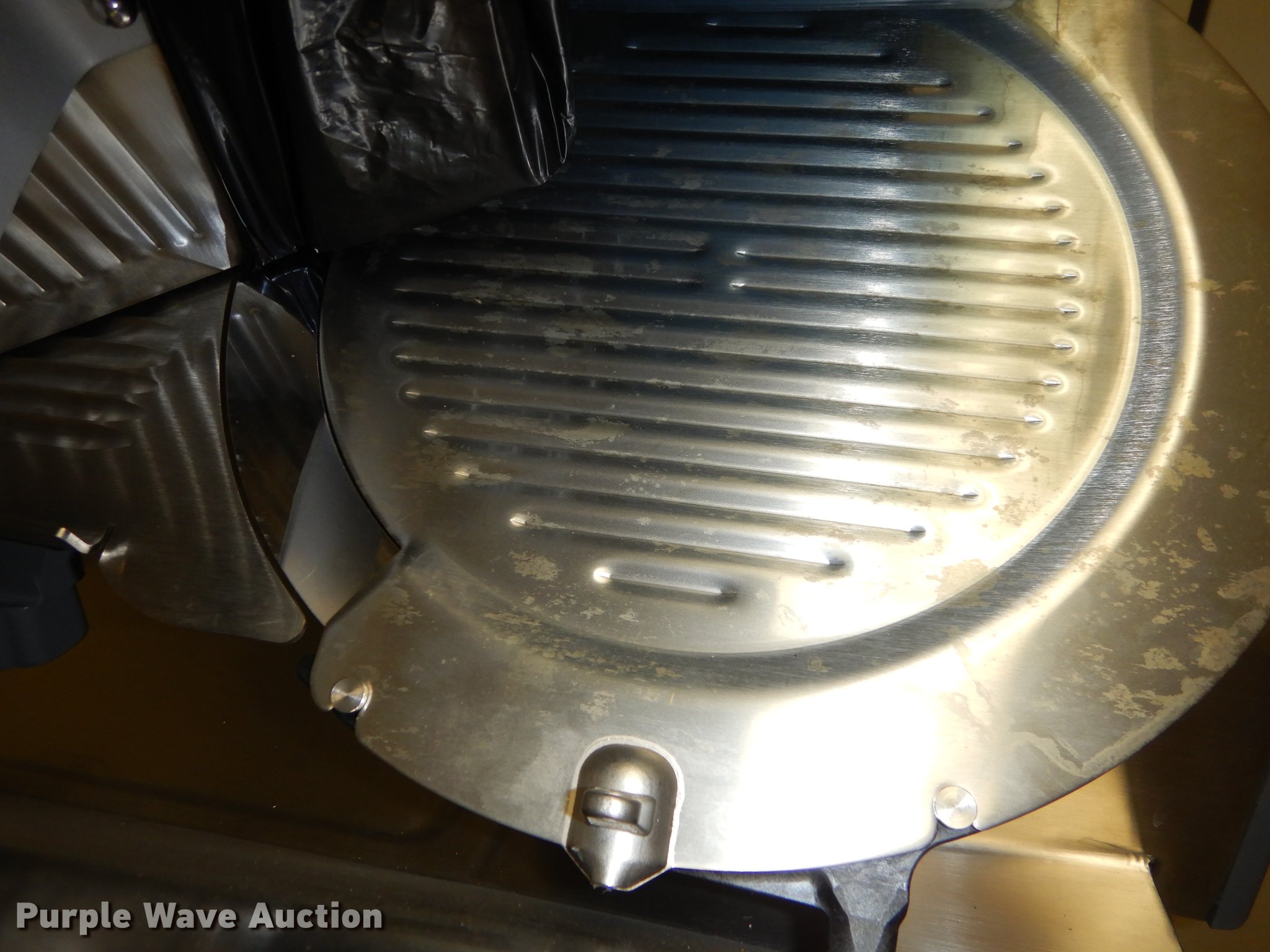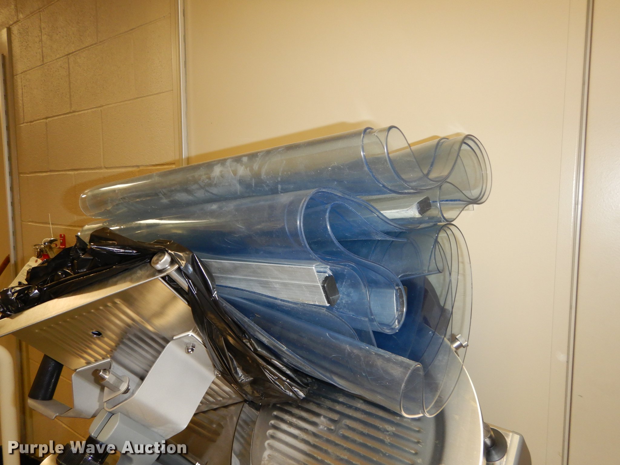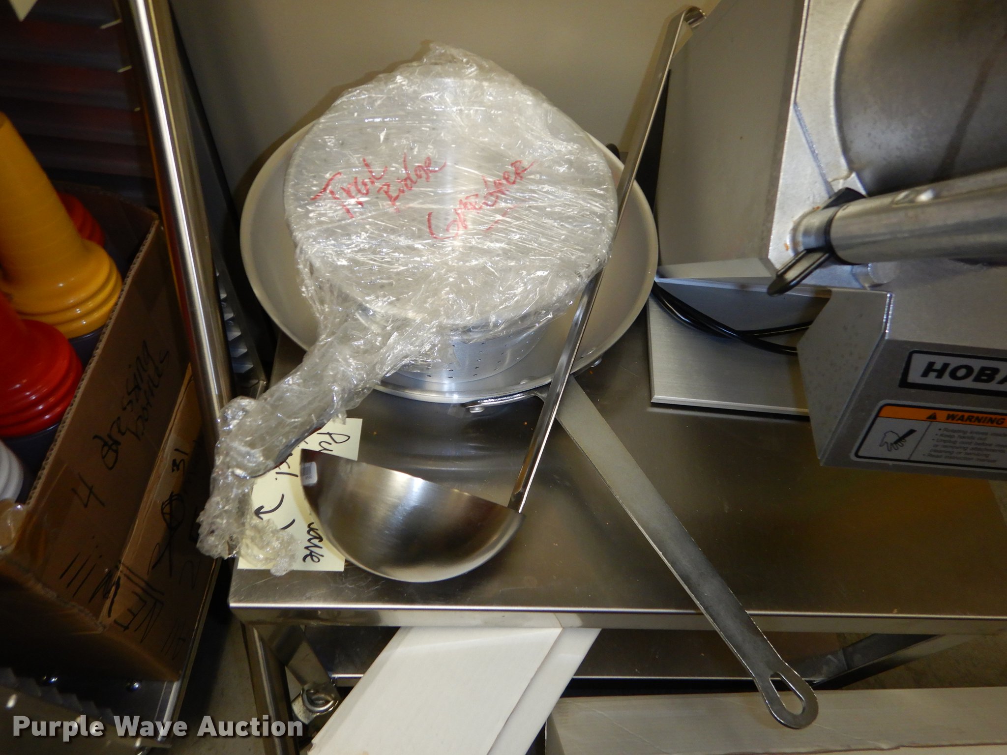 Purple Wave is selling a used Restaurant Equip. in Kansas. This item is a Kitchen equipment with the following: (2) roll carts, (3) Clear VU stripless door curtains, Globe meat slicer, Model 3850N, 12" blade, XL whisk, Ladle, Pan, Strainer, Hobart slicer/shredder and more, (6) attachments, Unit# TRMS