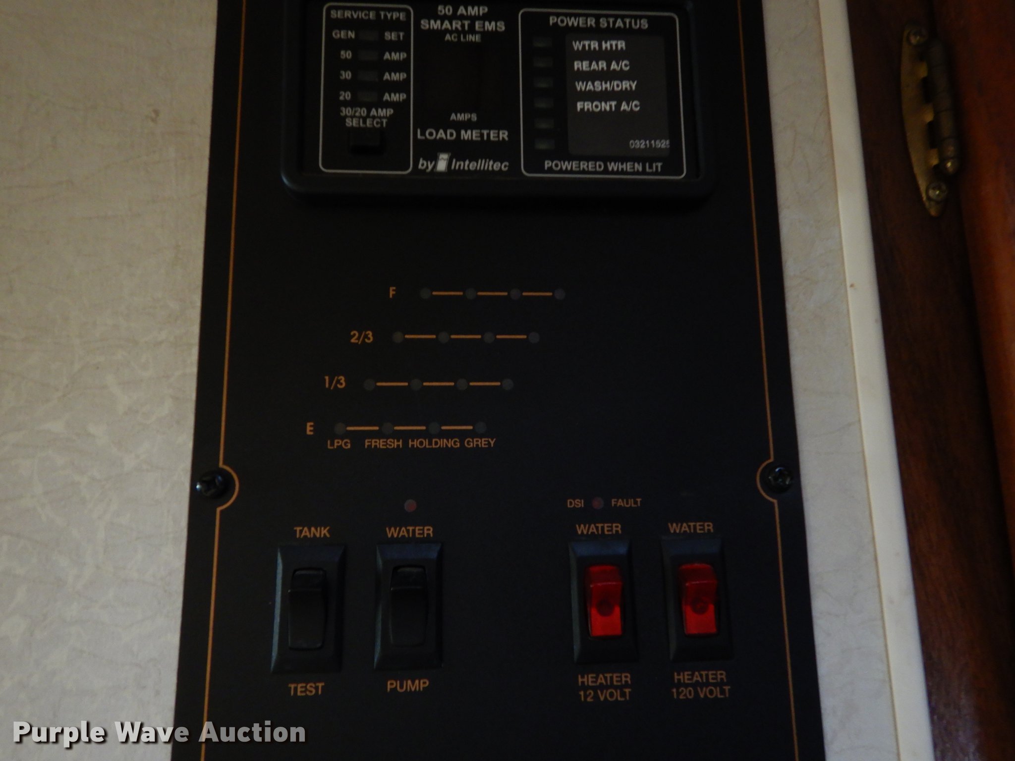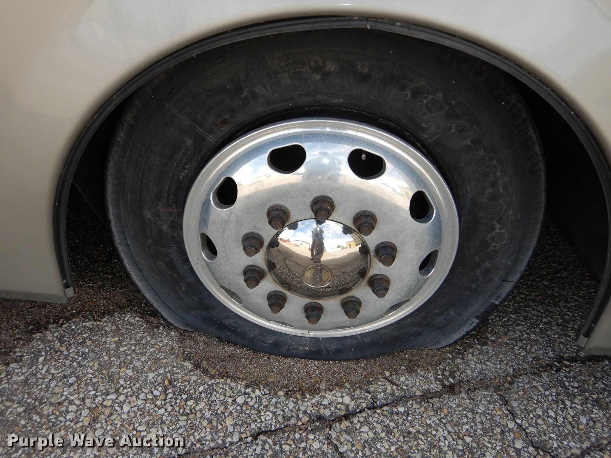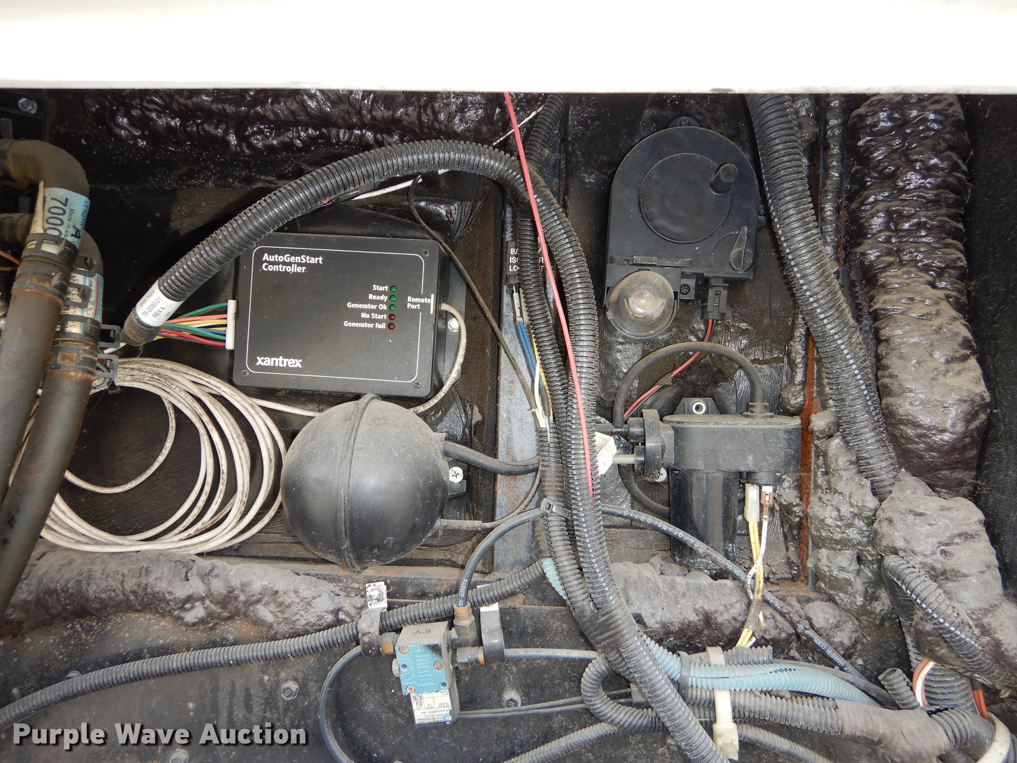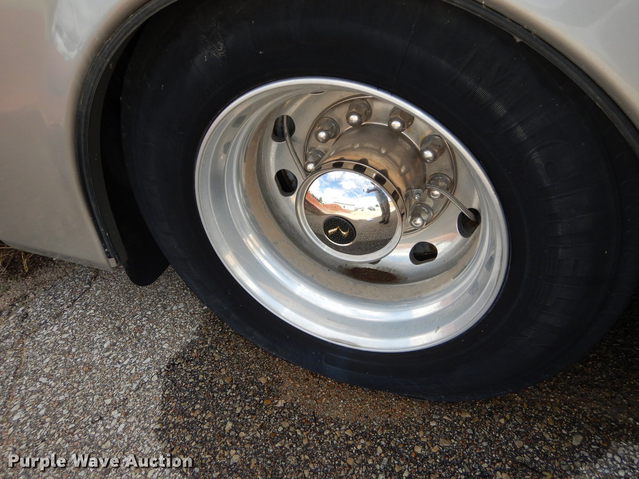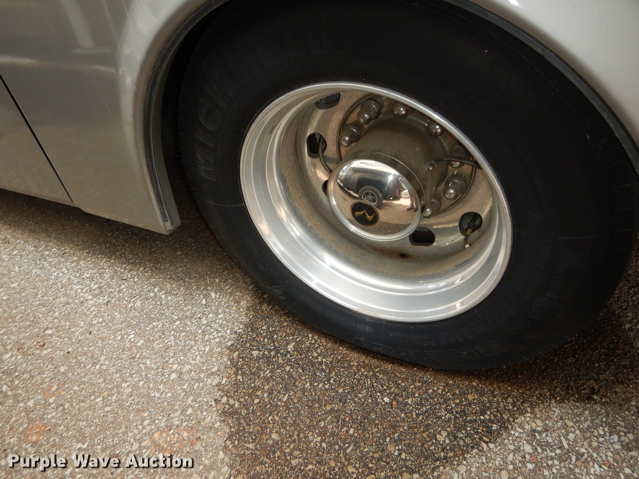 Purple Wave is selling a used RV in Kansas. This item is a 2002 Monaco Road Master Diplomat RV with the following: 79,591 miles on odometer, 8.3L L6 diesel engine, Allison automatic transmission, 39'L, AC and heat, Tilt, Telescoping steering wheel, Cruise, AM/FM/CD, Power and heated mirrors, Cloth interior, Jensen rear view camera, Fog lights, (2) slide-outs, Super slide-out platform, (8) canopies, (2) Sharp televisions, Couch, Fold-up table with two chairs, Office desk, Carpet, vinyl, and linoleum flooring, Storage cabinets, Kitchen, Stainless steel sink, Convection sensor microwave, Coffee maker, Wedgewood three burner stove, Norcold refrigerator/freezer with ice maker, Bathroom, Shower, Toilet, Sink, Storage, Bedroom, Bed, Storage, Mirrored closet, (3) patio chairs, Freedom combintation inverter/charger, Duo Therm roof AC unit, Floor heat vents, Bicycle rack, (2) bicycles, Trek and Schwinn,, Water tank system, Fresh, City, Waste, Onan 7500 Quiet generator, Model 7.5HDKAJ11456, 3,708 hours on meter, Diesel engine, Single phase, 7.5 kW, RVA JII leveling system, Receiver hitch, Trailer wiring, Air brakes, Samson 275/70R22.5 tires, GVWR 32,000 lbs, 21'L wheel base, Owners manual, Dead battery, Flat tire and off wheel, Additional tire included, Unit will not start
