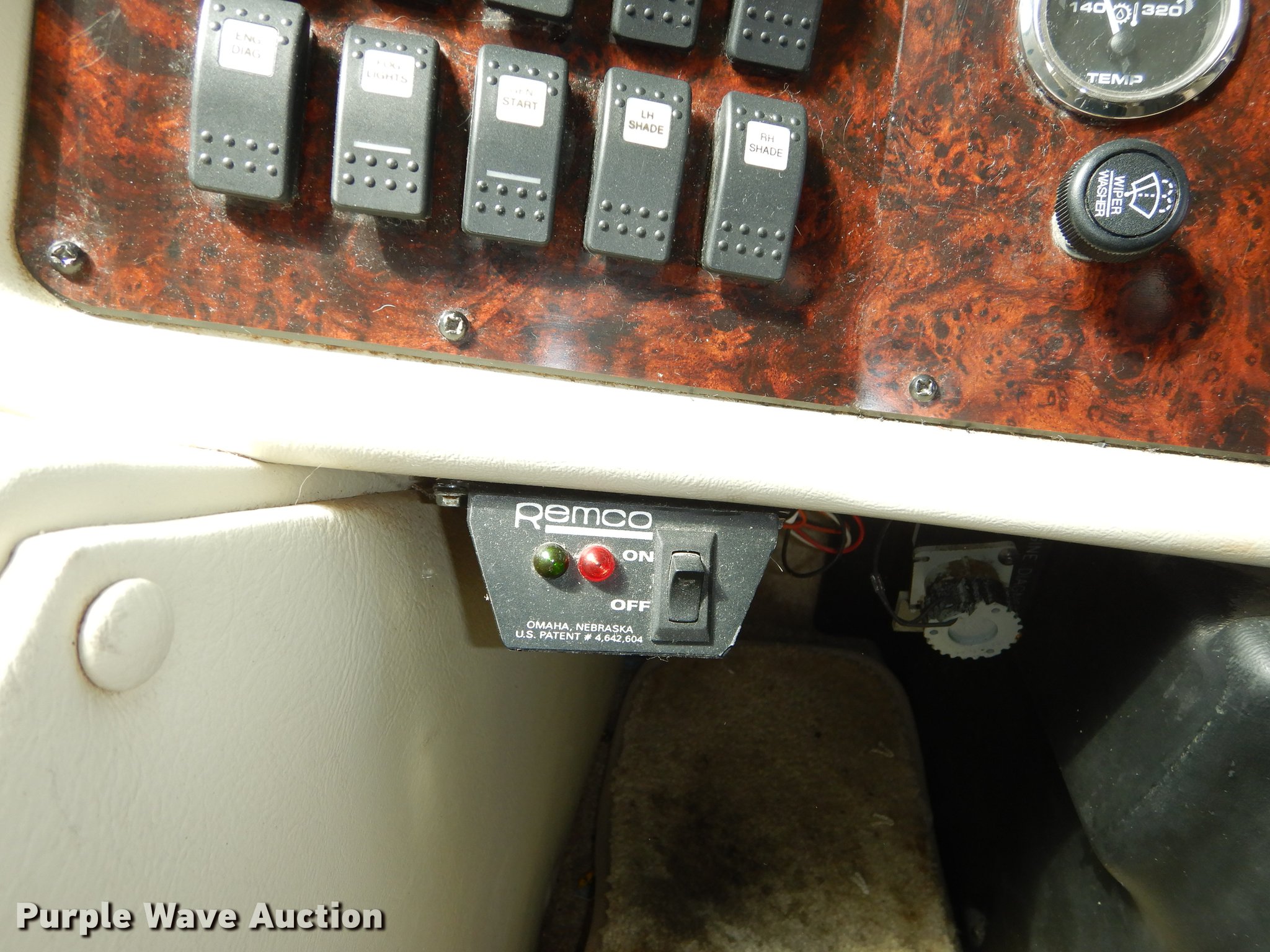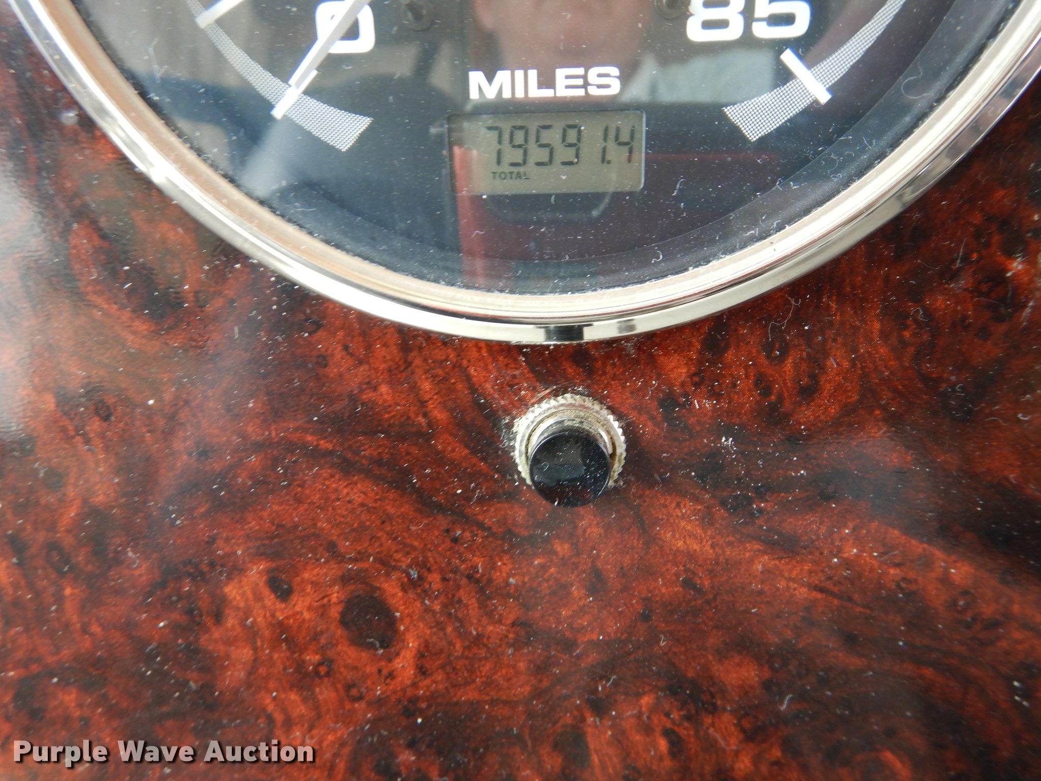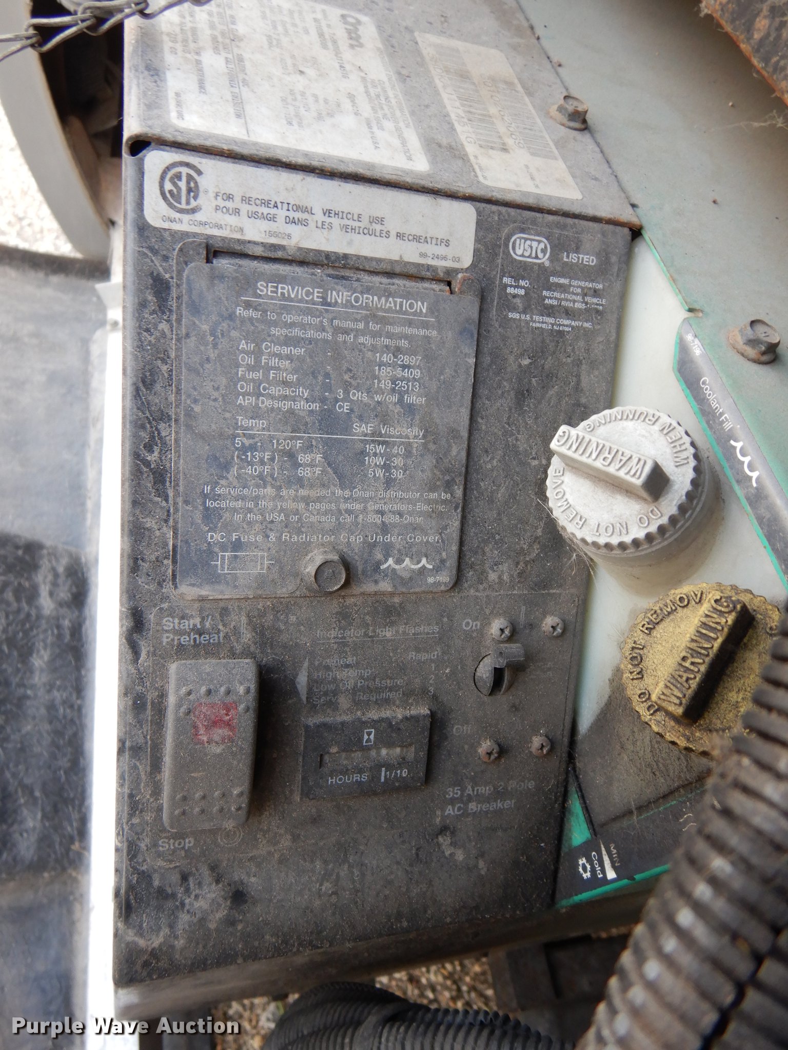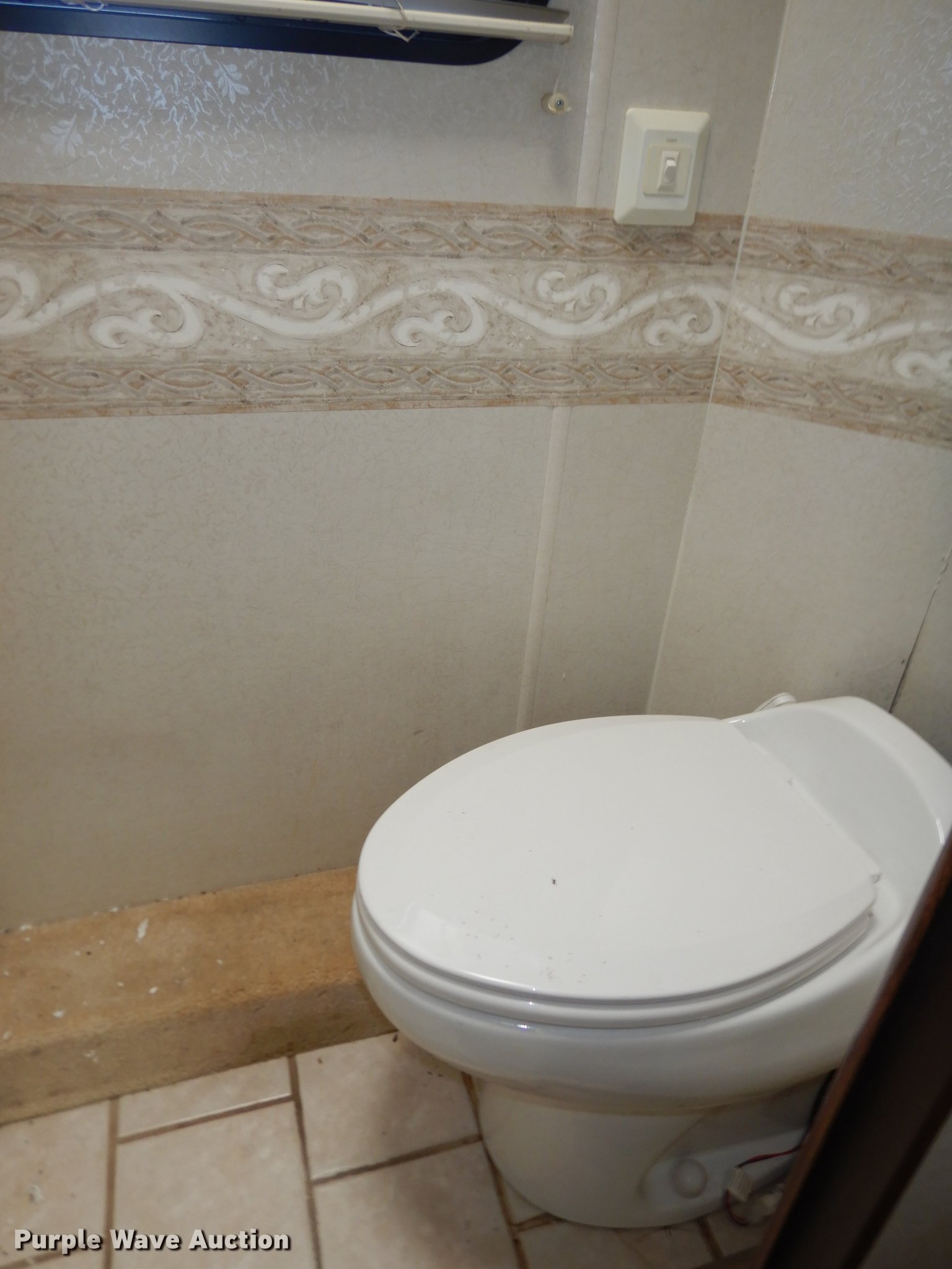 Purple Wave is selling a used RV in Kansas. This item is a 2002 Monaco Road Master Diplomat RV with the following: 79,591 miles on odometer, 8.3L L6 diesel engine, Allison automatic transmission, 39'L, AC and heat, Tilt, Telescoping steering wheel, Cruise, AM/FM/CD, Power and heated mirrors, Cloth interior, Jensen rear view camera, Fog lights, (2) slide-outs, Super slide-out platform, (8) canopies, (2) Sharp televisions, Couch, Fold-up table with two chairs, Office desk, Carpet, vinyl, and linoleum flooring, Storage cabinets, Kitchen, Stainless steel sink, Convection sensor microwave, Coffee maker, Wedgewood three burner stove, Norcold refrigerator/freezer with ice maker, Bathroom, Shower, Toilet, Sink, Storage, Bedroom, Bed, Storage, Mirrored closet, (3) patio chairs, Freedom combintation inverter/charger, Duo Therm roof AC unit, Floor heat vents, Bicycle rack, (2) bicycles, Trek and Schwinn,, Water tank system, Fresh, City, Waste, Onan 7500 Quiet generator, Model 7.5HDKAJ11456, 3,708 hours on meter, Diesel engine, Single phase, 7.5 kW, RVA JII leveling system, Receiver hitch, Trailer wiring, Air brakes, Samson 275/70R22.5 tires, GVWR 32,000 lbs, 21'L wheel base, Owners manual, Dead battery, Flat tire and off wheel, Additional tire included, Unit will not start