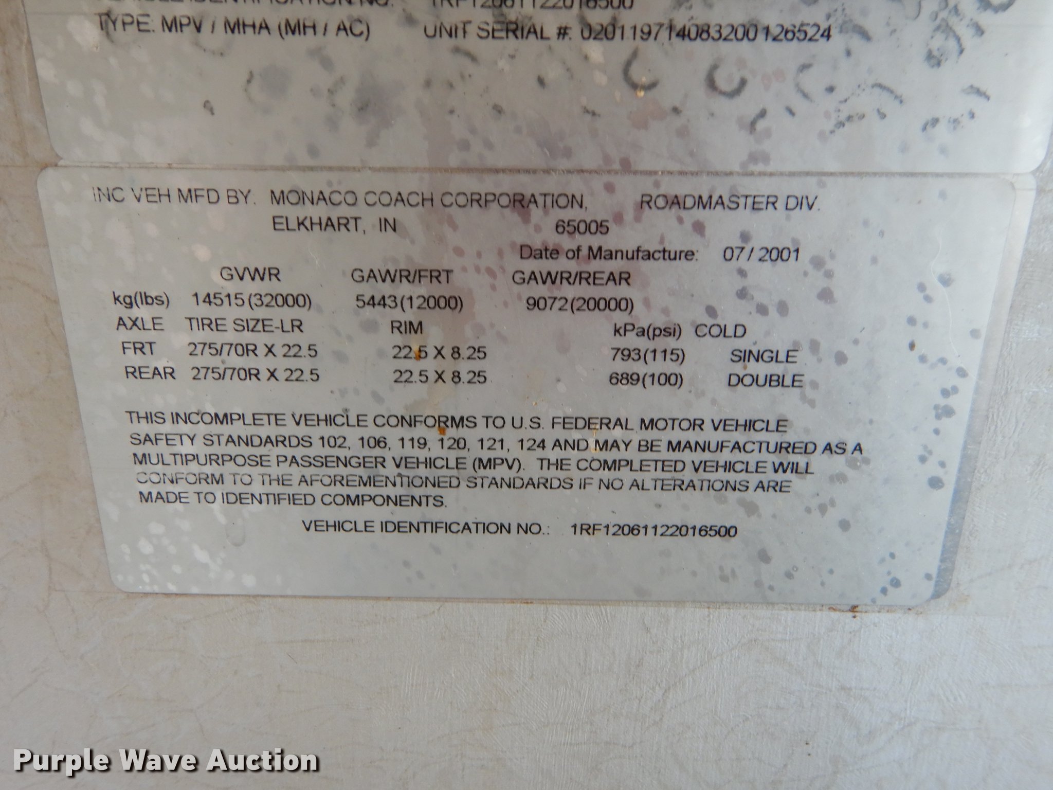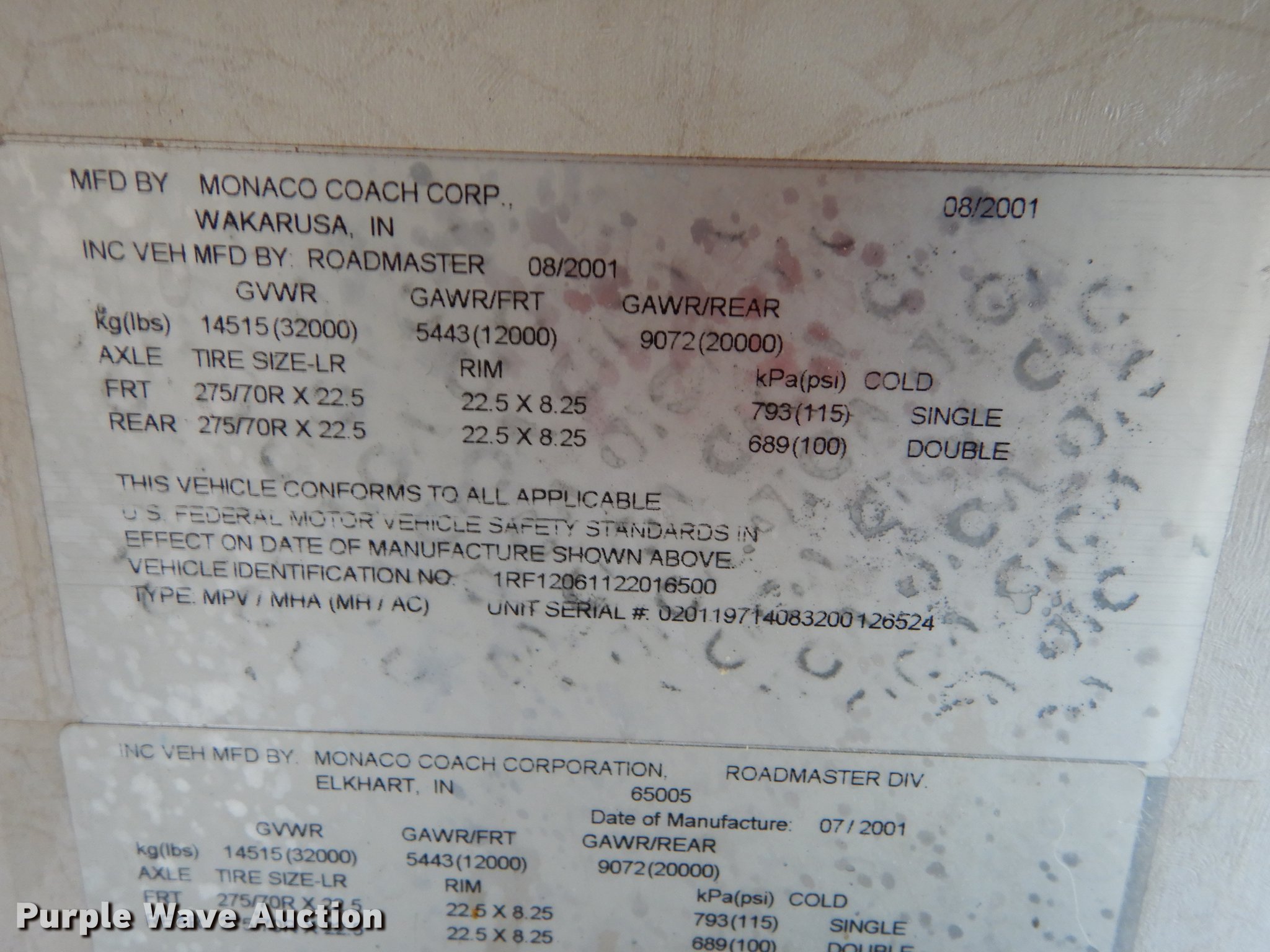 Take a look at this used 2002 Monaco Road Master Diplomat RV being sold on July 24th, 2018 in the SOLD! July 24 Seized Asset Auction made by Monaco. Take a look at all of the item information below or take a look at similar auctions for RV's.