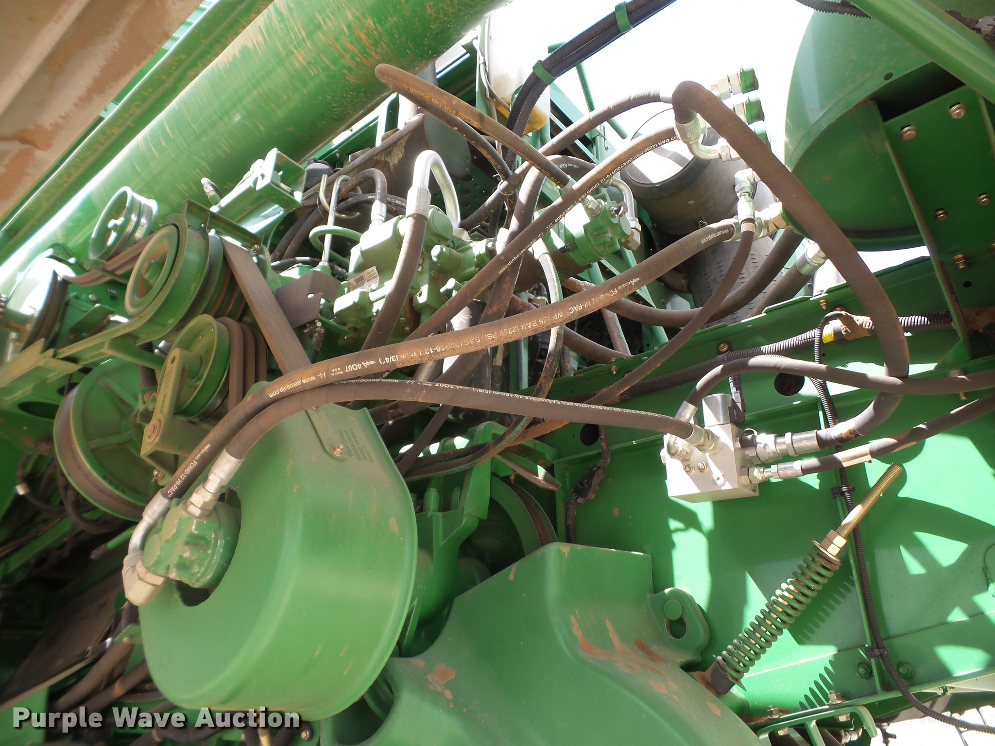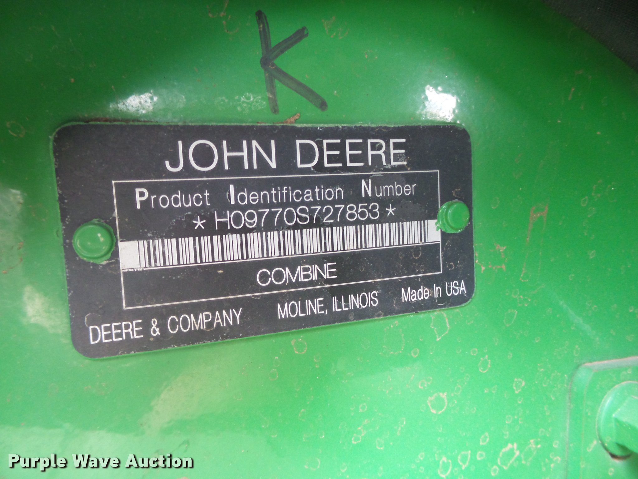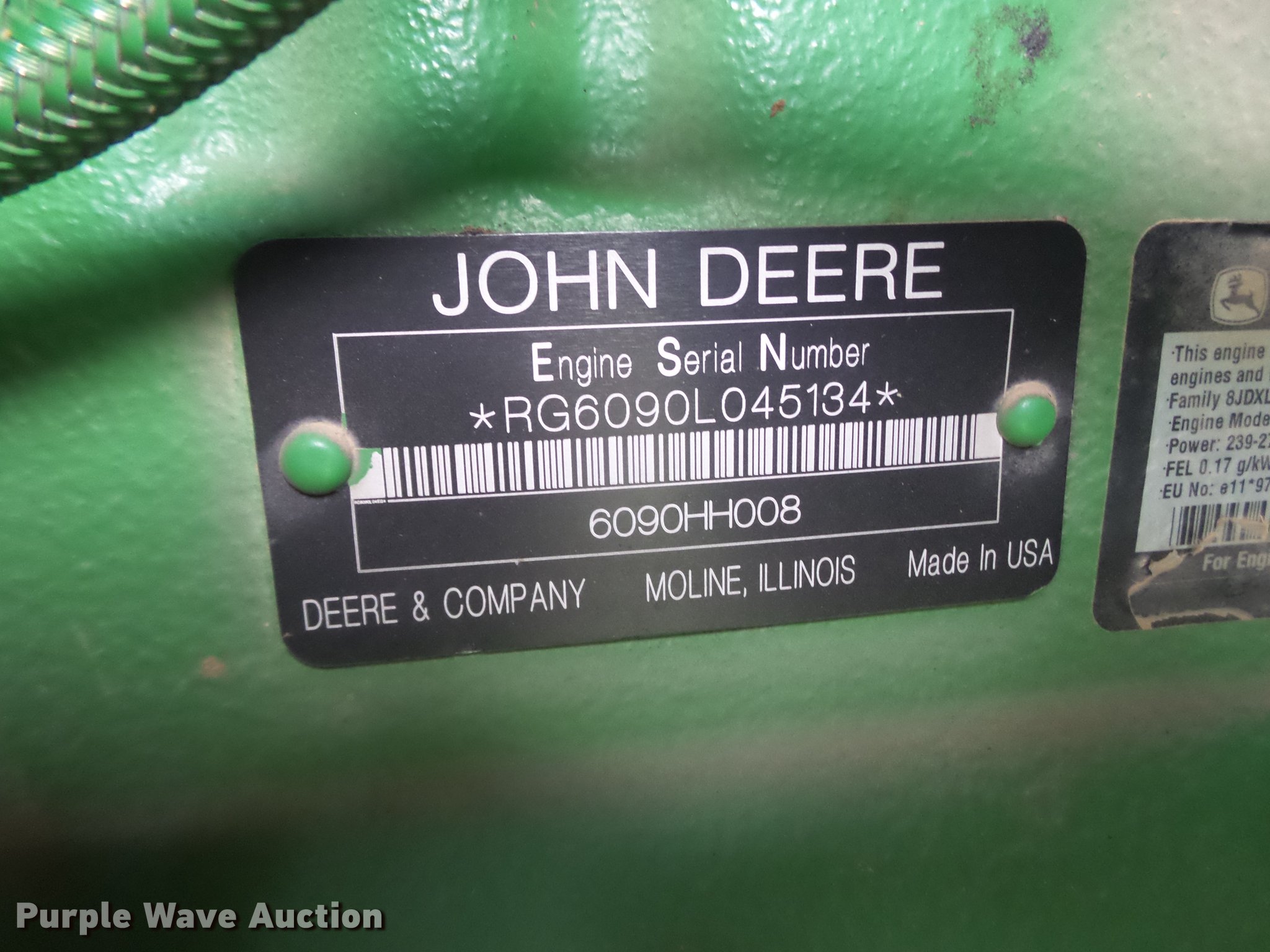 Purple Wave is selling a used Combine in Texas. This item is a 2008 John Deere 9770 combine with the following: 2,292 engine hours on meter, 1,499 separator hours on meter, John Deere 6090HH008 six cylinder turbo diesel engine, 360 HP, Serial RG6090L045134, Hydrostatic transmission, AC and heat, Tilt steering wheel, AM/FM, Air suspension seat, Instructor's seat, Shade, GreenStar ready, Single point header coupler, Feederhouse, Variable speed, Reverser, (4) sets of concaves, Round, Small wire, Large bar corn, Small wire sorghum, Chaff spreader, Straw chopper, Power tailboard, Bin extensions, Work lights, 250/45-32 front tires, 28L-26 rear tires, Operator manual, Serial H09770S727853