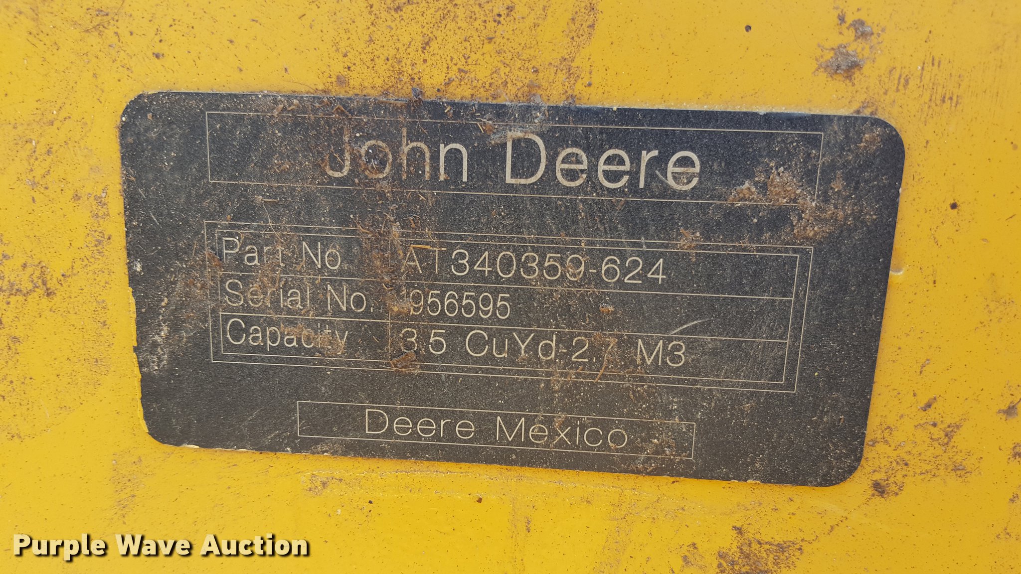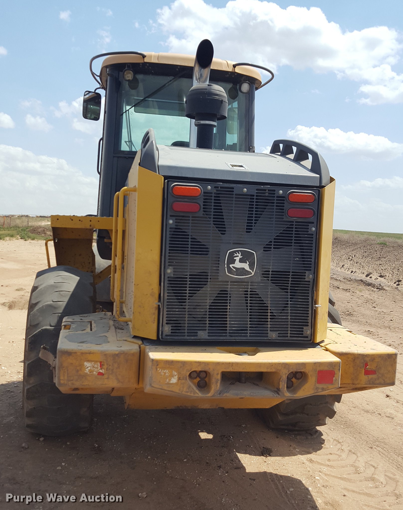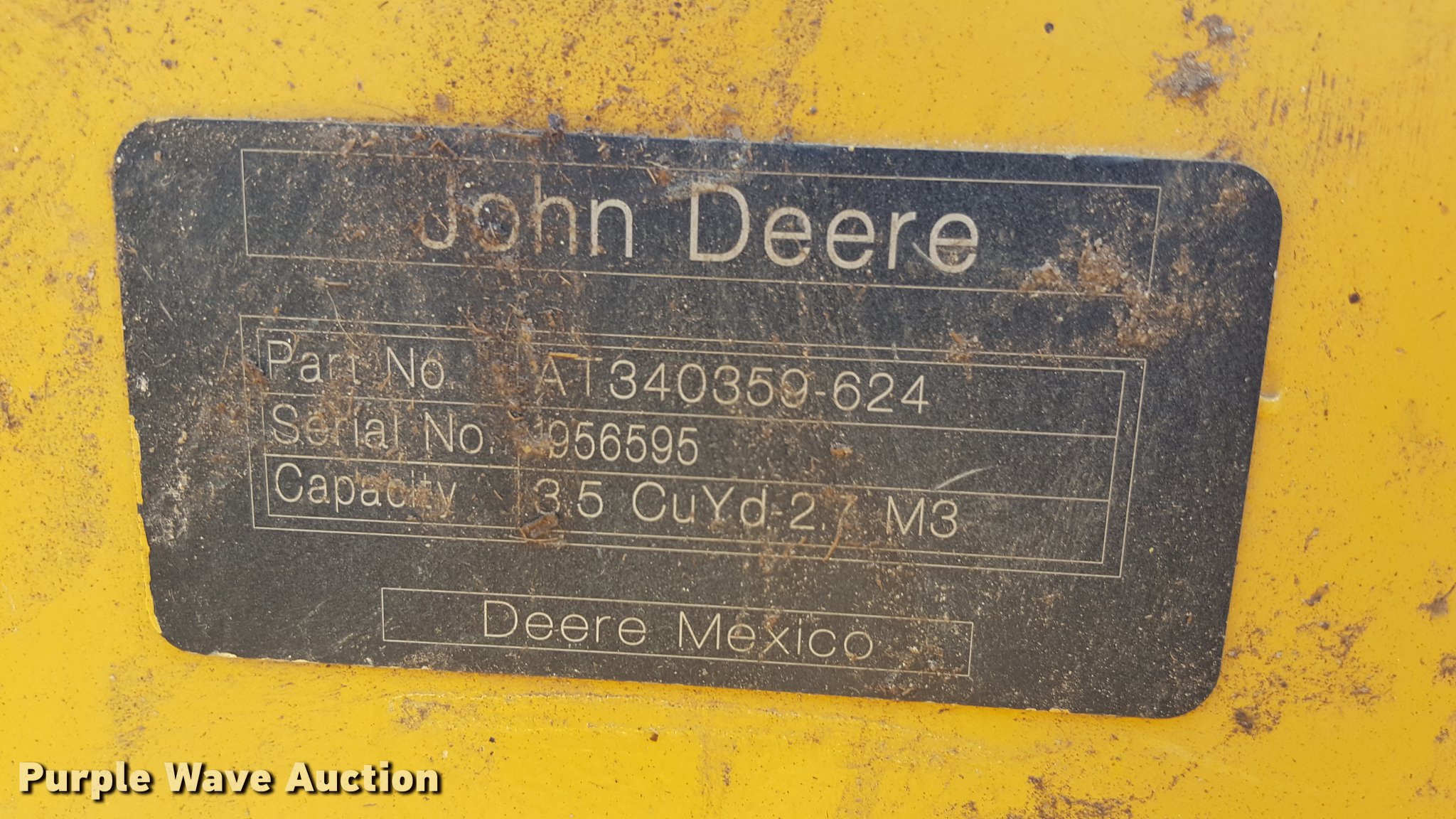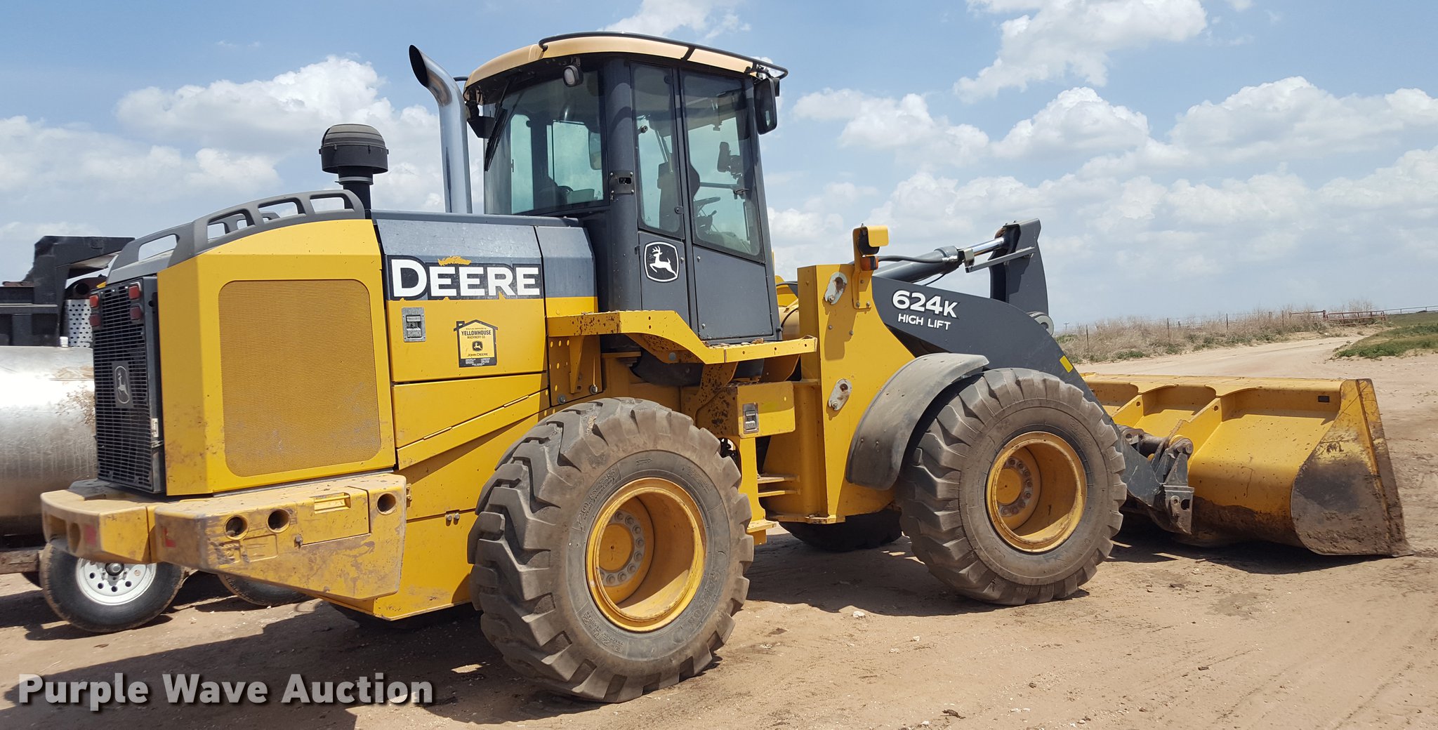 Purple Wave is selling a used Wheel Loader in Texas. This item is a 2010 John Deere 624K High Lift wheel loader with the following: 9,938 hours on meter, John Deere six cylinder turbo diesel engine, Powershift transmission, Front differential lock, Enclosed cab, AC and heat, Tilt steering wheel, AM/FM, Joystick bucket controls, Air suspension seat, Front and rear work lights, Wipers, Ride control, Backup alarm, John Deere 105"W bucket, Bolt-on cutting edge, 3.5 cu. yd. capacity, Self-leveling, Front auxiliary hydraulics, 20.5-25 tires, Serial 1DW624KHVA0630810