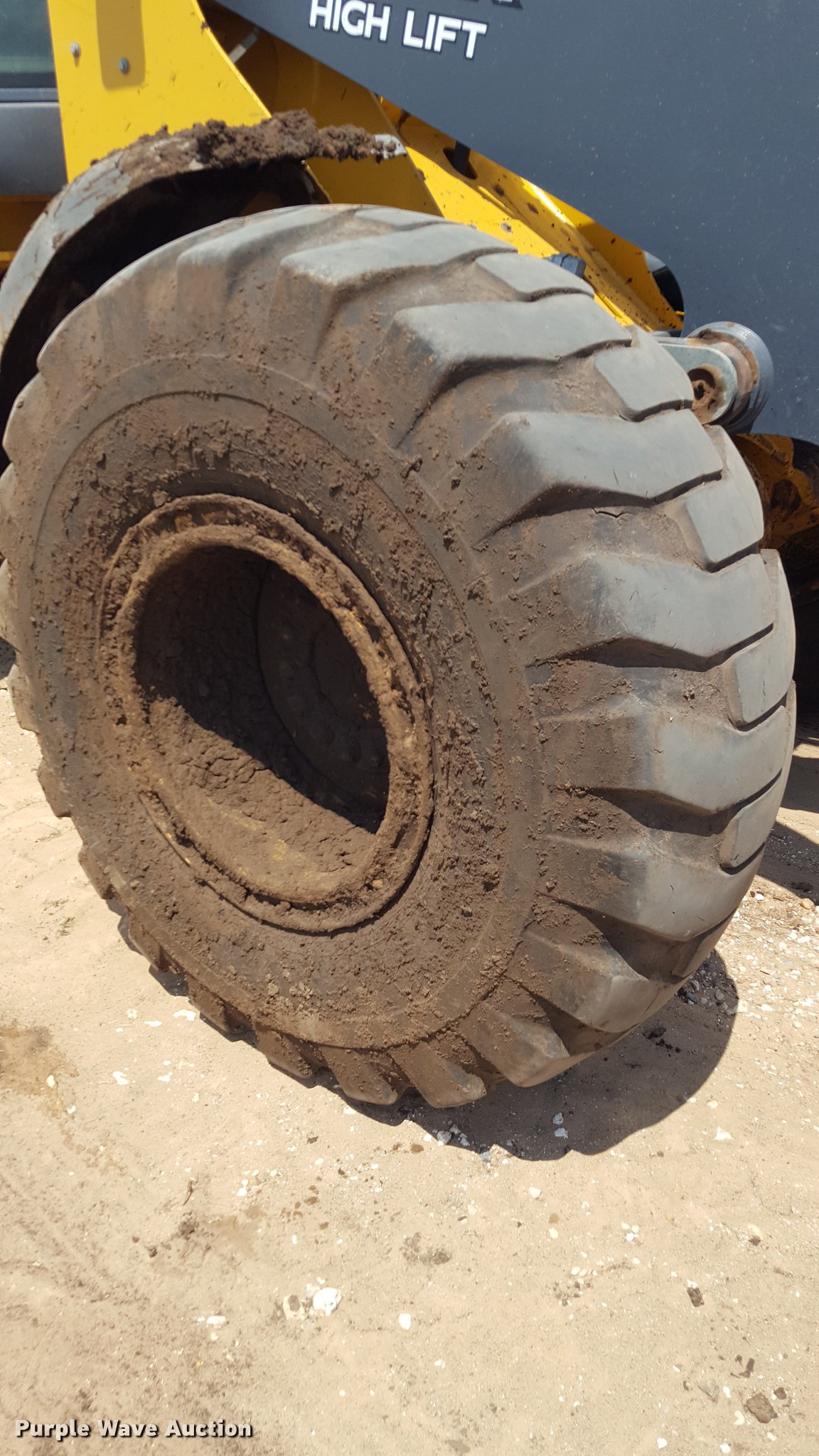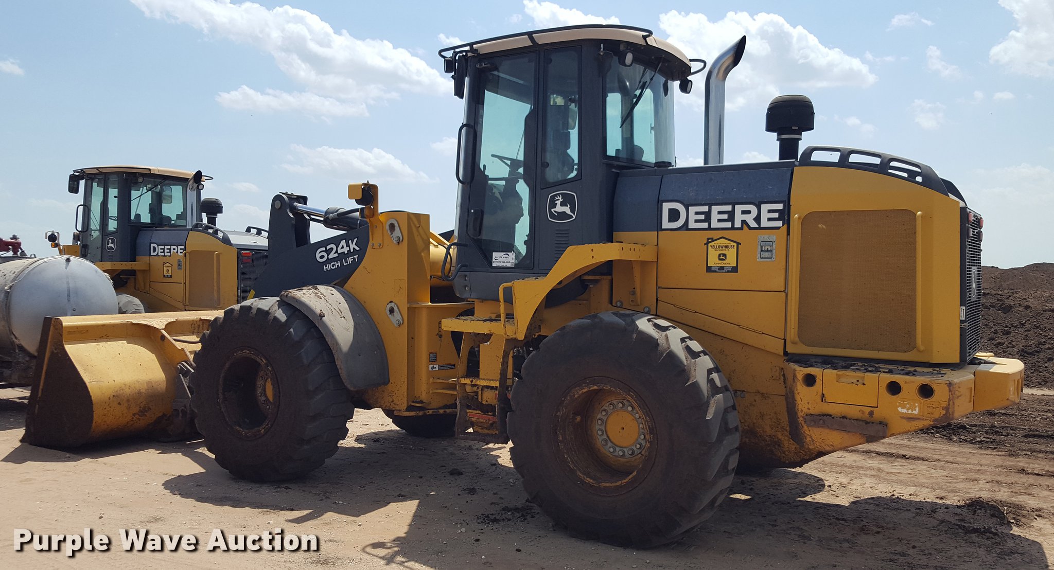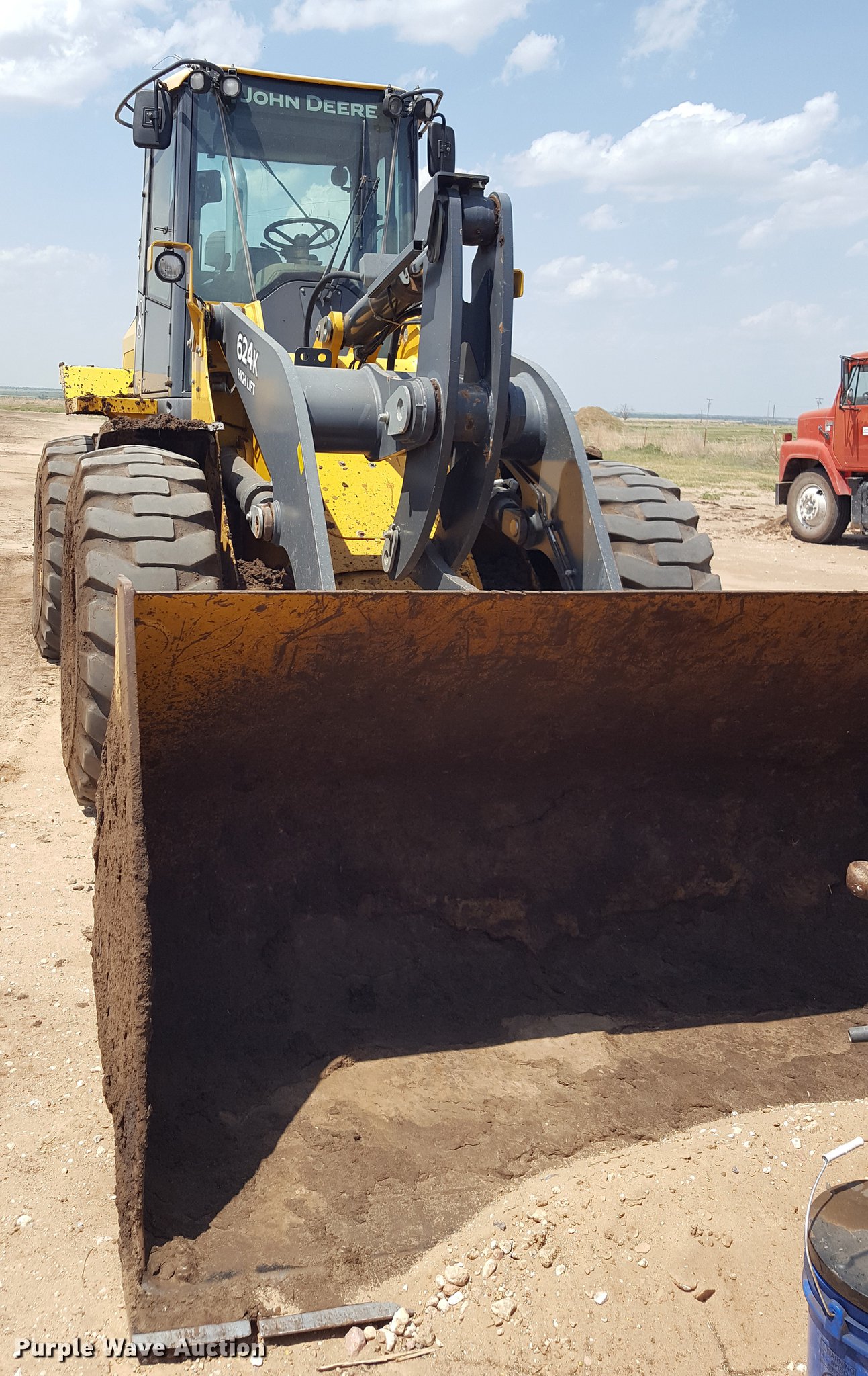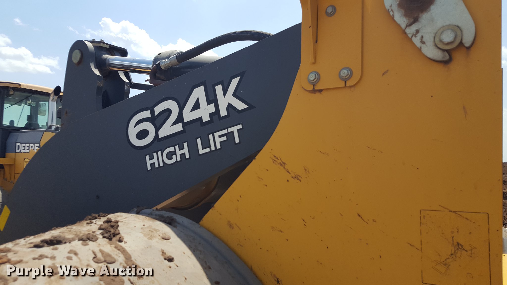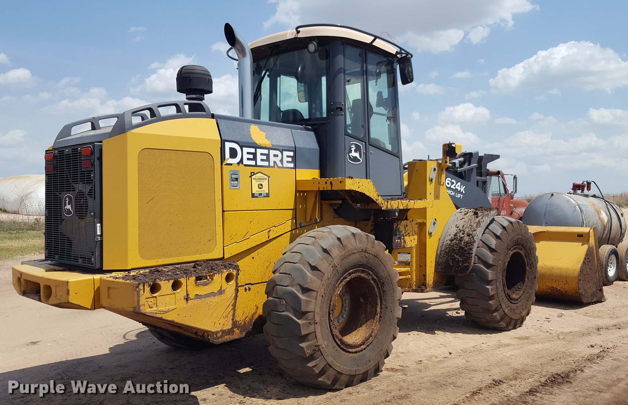Purple Wave is selling a used Wheel Loader in Texas. This item is a 2010 John Deere 624K High Lift wheel loader with the following: 9,781 hours on meter, John Deere 6068HDW79 6.8L six cylinder turbo diesel engine, 129 kW, Powershift transmission, Front differential lock, Enclosed cab, AC and heat, AM/FM, Joystick bucket controls, Air suspension seat, Front work lights, Ride control, Backup alarm, 105"W bucket, Bolt-on cutting edge, Self-leveling, Front auxiliary hydraulics, 20.5-25 tires, Serial 1DW624KHLA0628641
