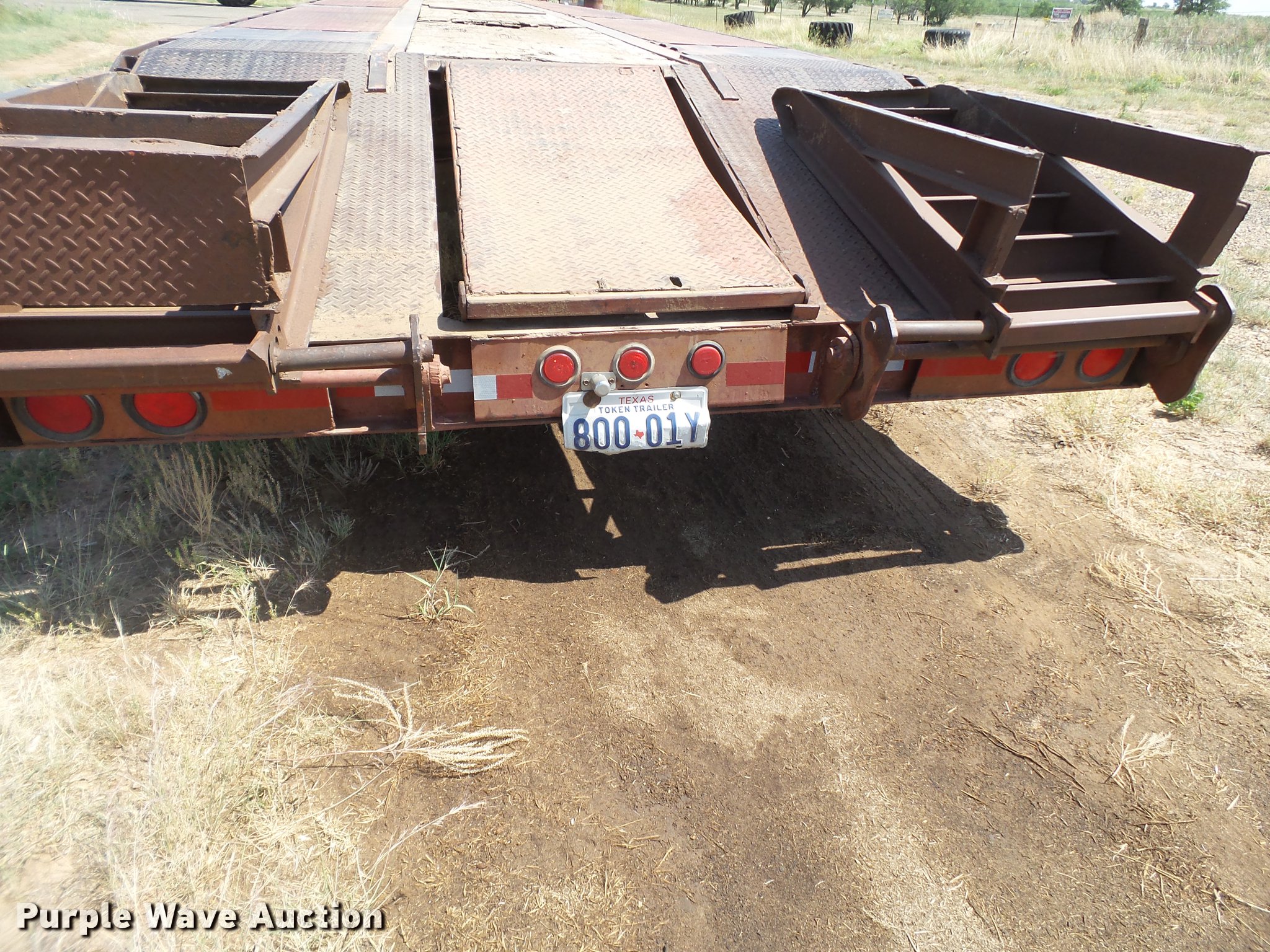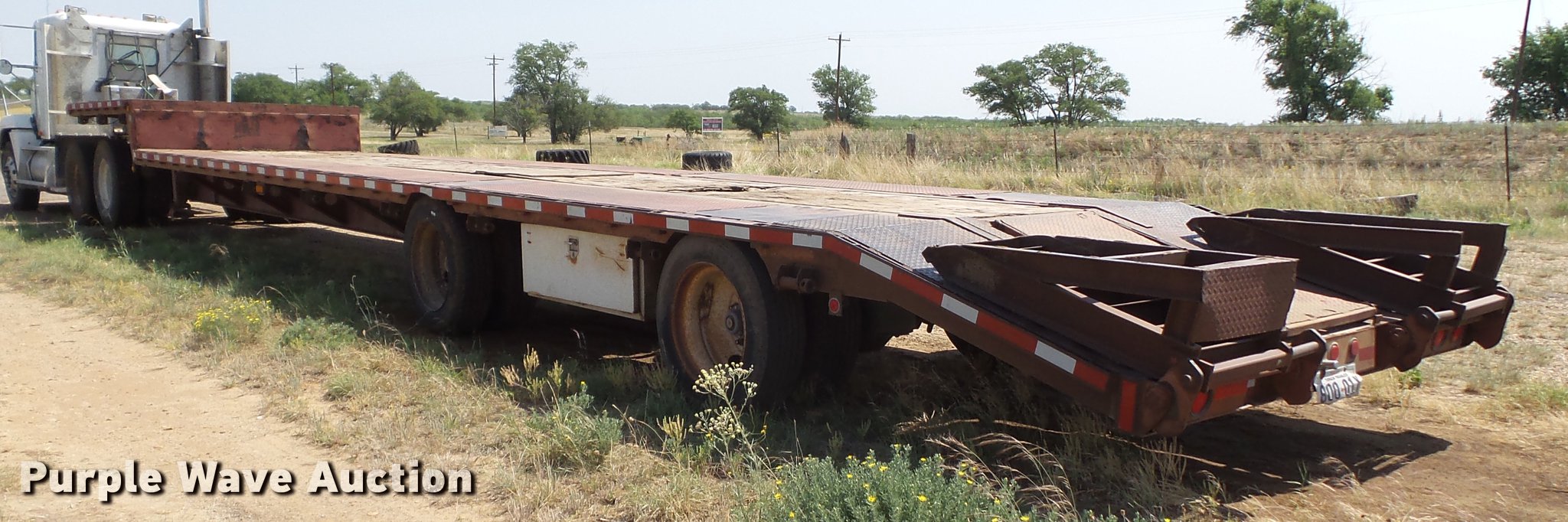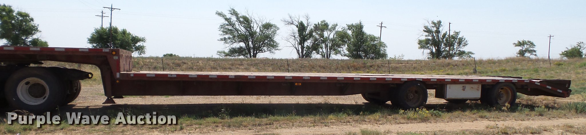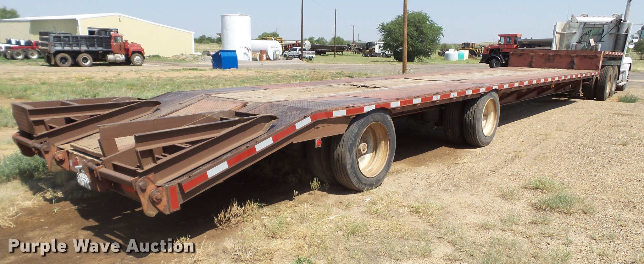 Purple Wave is selling a used Equip. Trailer in Texas. This item is a 1990 Trail King drop deck equipment trailer with the following: 53'L x 102"W, 124"L top deck, 37.5'L main deck, 5'L dovetail, 4'L ramps, Steel and wood deck, Stake pokcets, Under-mounted toolbox, Fifth wheel plate, Dual leg two speed landing gear, Air suspension, Air brakes, Tandem spread axle, Steel wheels, 225/70R22.5 tires