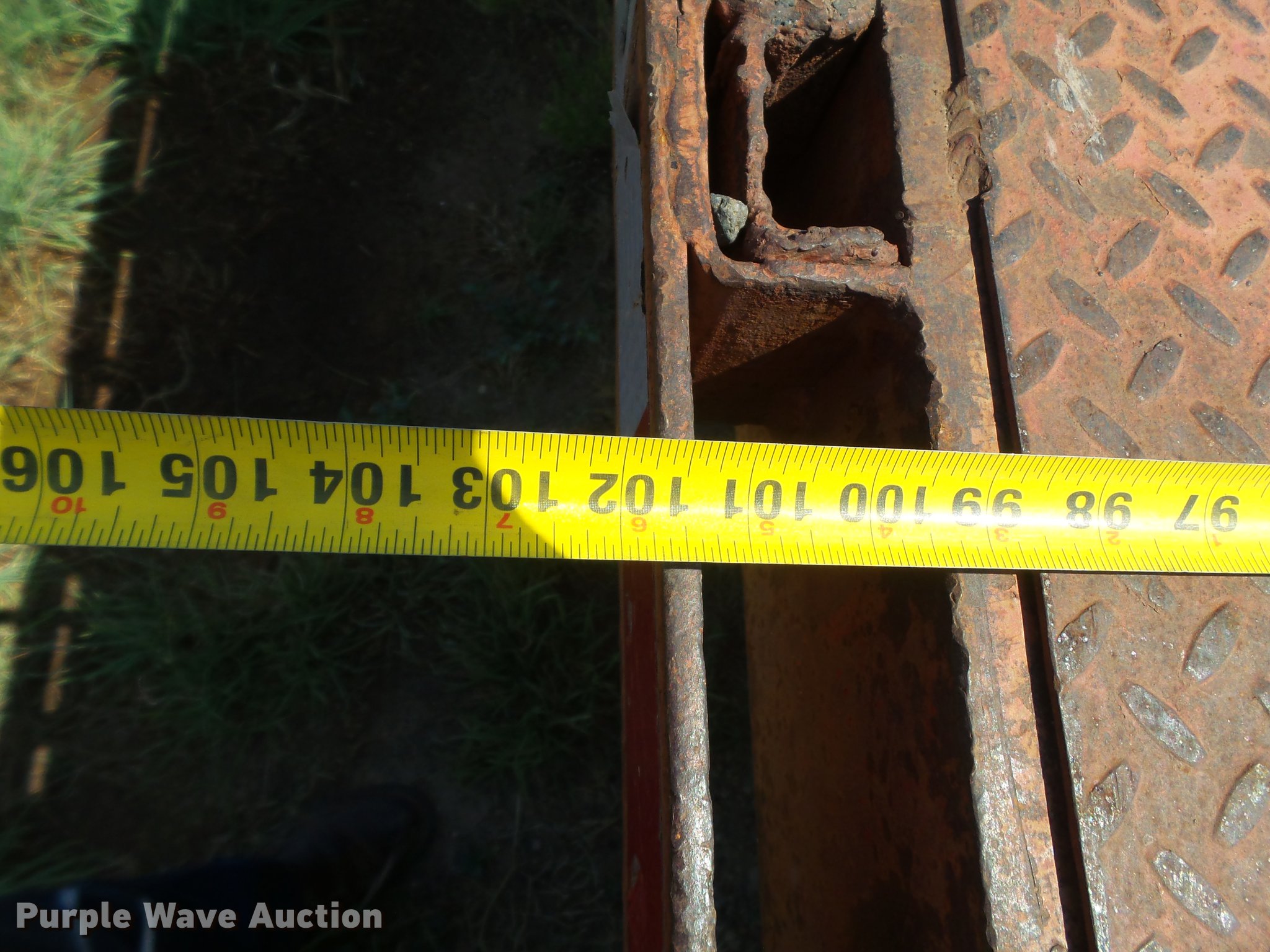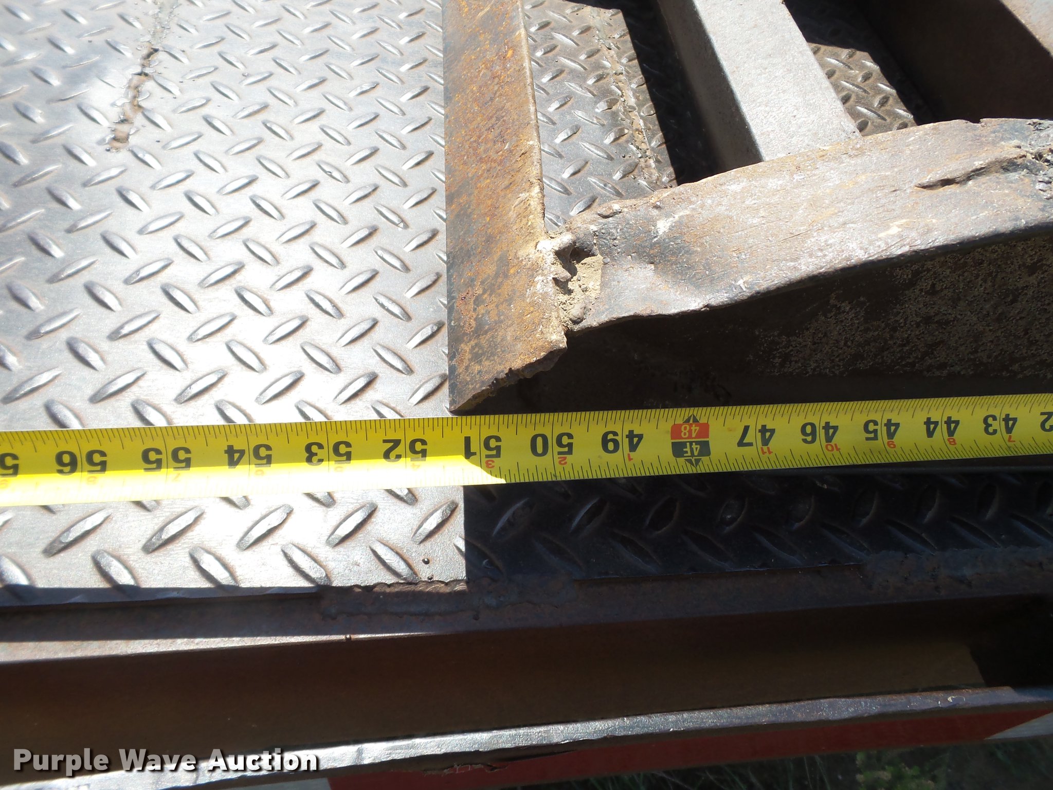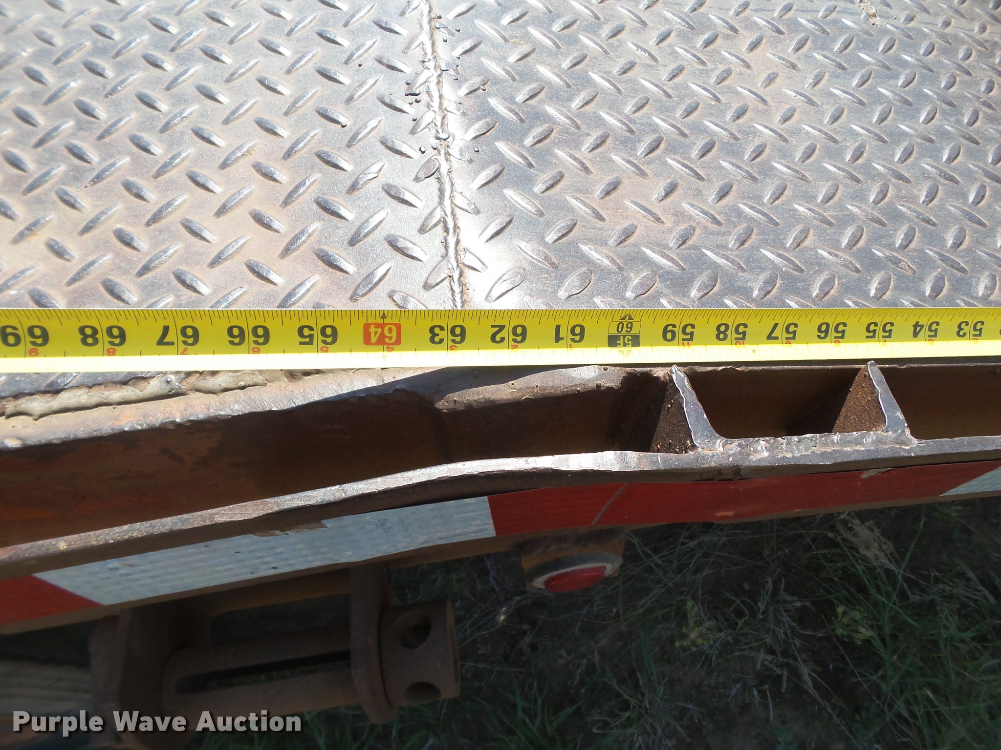 Purple Wave is selling a used Equip. Trailer in Texas. This item is a 1990 Trail King drop deck equipment trailer with the following: 53'L x 102"W, 124"L top deck, 37.5'L main deck, 5'L dovetail, 4'L ramps, Steel and wood deck, Stake pokcets, Under-mounted toolbox, Fifth wheel plate, Dual leg two speed landing gear, Air suspension, Air brakes, Tandem spread axle, Steel wheels, 225/70R22.5 tires