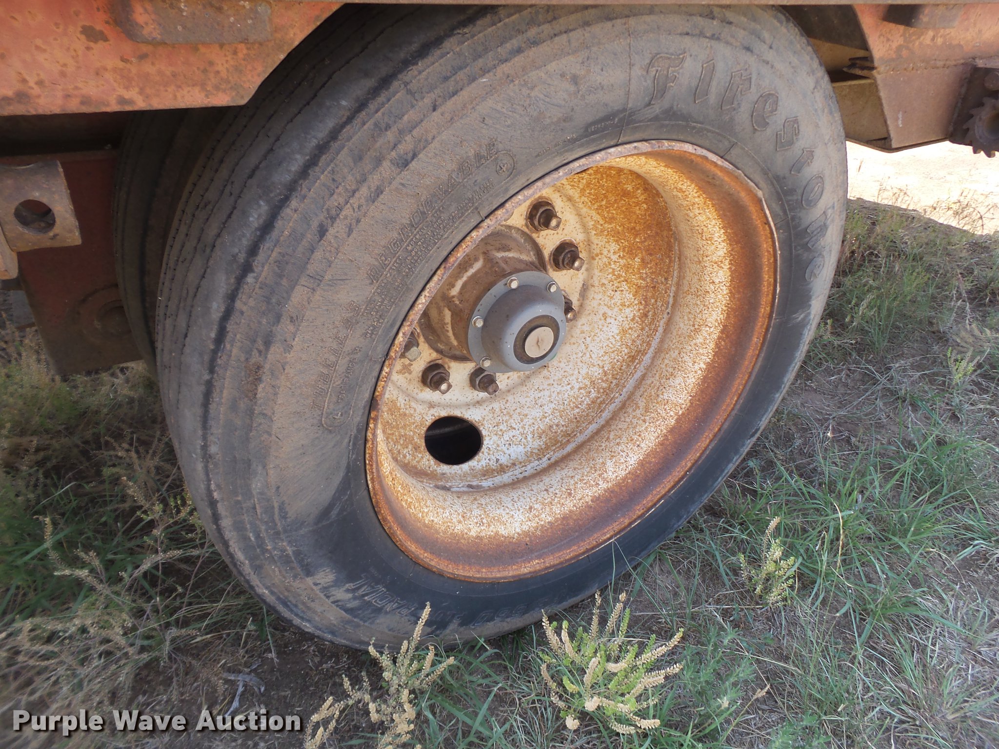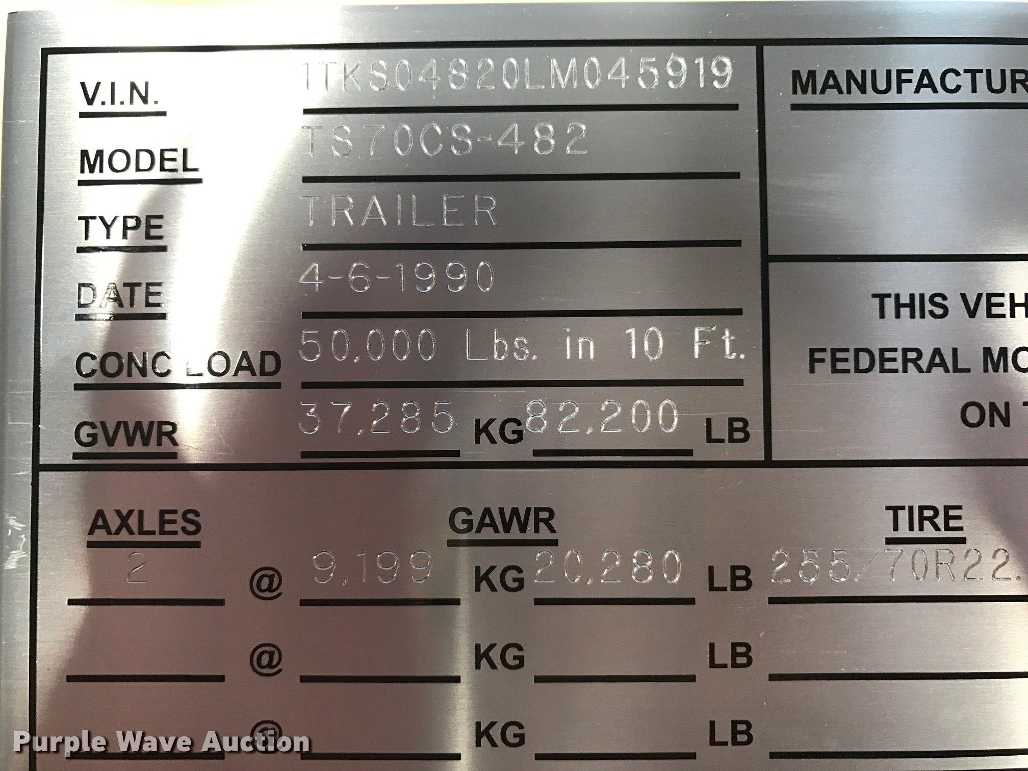 1990 Trail King drop deck equipment trailer. 53'L x 102"W, 124"L top deck, 37.5'L main deck, 5'L dovetail, 4'L ramps, Steel and wood deck, Stake pokcets, Under-mounted toolbox, Fifth wheel plate, Dual leg two speed landing gear, Air suspension, Air brakes, Tandem spread axle, Steel wheels, 225/70R22.5 tires. Texas title. Title has a lien that will be released following the close of the auction. Title distribution may be delayed up to 30 days from verification of funds. 1TKS04820LM045919. Rolling Plains Ag Compost Inc. - Open inspection July 24. Howardwick, TX 79226