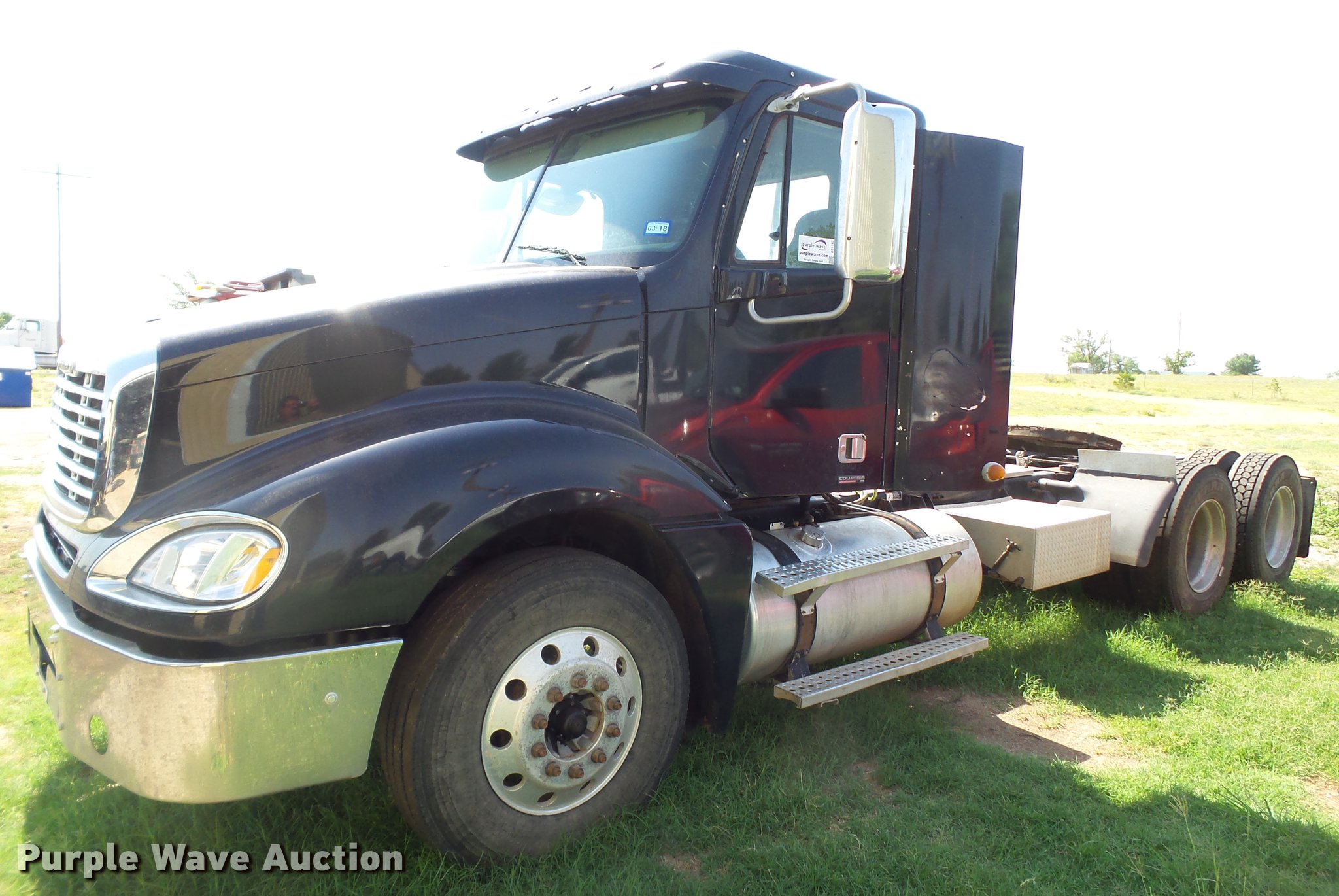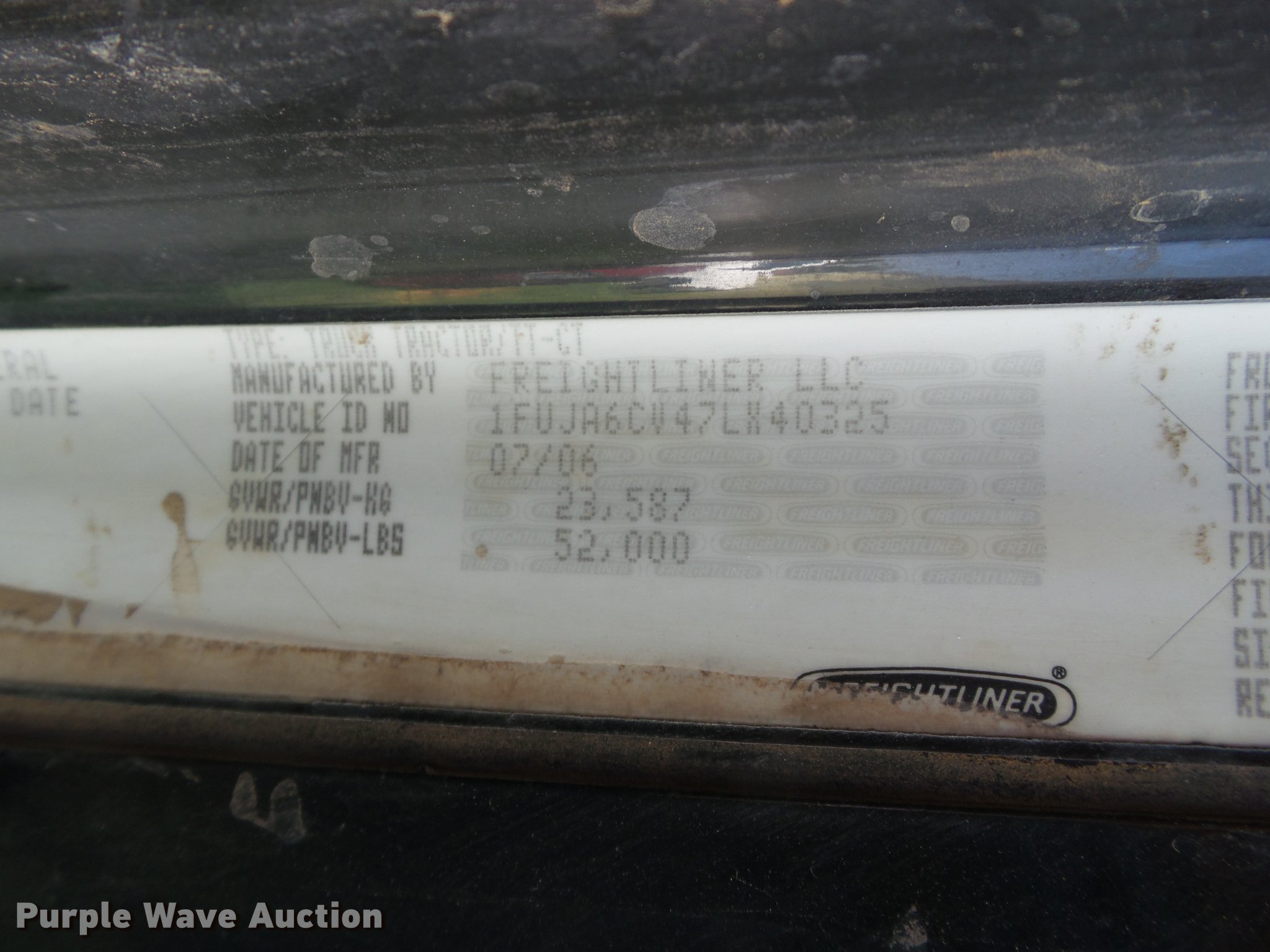 Purple Wave is selling a used Truck Tractor in Texas. This item is a 2007 Freightliner Columbia semi truck with the following: 861,440 miles on odometer, Mercedes Benz OM460LA 12.8L L6 turbo diesel engine, 450 HP, Eaton Fuller 13 speed manual transmission, Tandem axle, AC and heat, Crusie, AM/FM/CD, Power windows, Air suspension seat, Leather seat, PTO, Wet kit, Exterior visor, Front tow hooks, Single rear exhaust stack, Steel deck plate, Air operated sliding fifth wheel plate, Dual fuel tanks, Quarter fenders, Air suspension, Air brakes, 11R22.5 tires, GVWR 52,000 lbs, FAWR 12,000 lbs, IAWR 20,000 lbs, RAWR 20,000 lbs