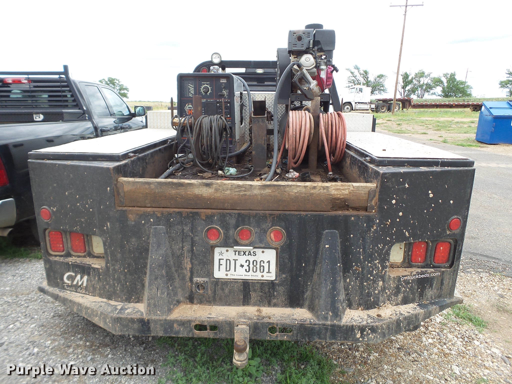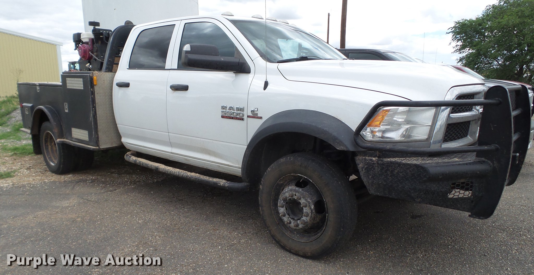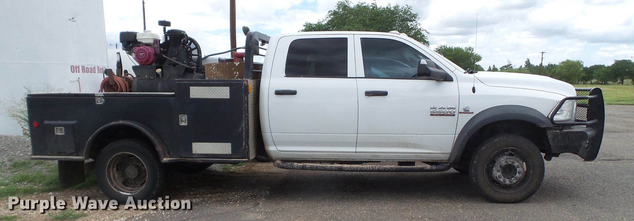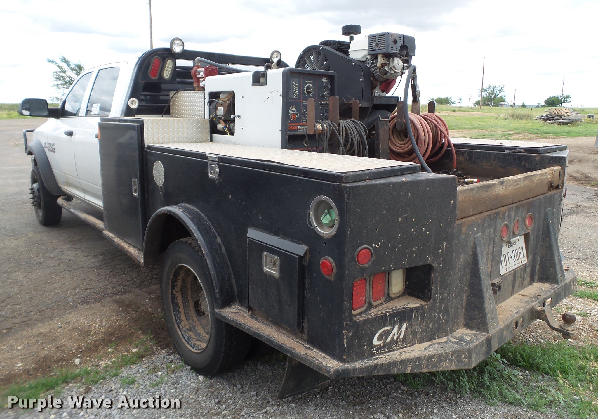 Purple Wave is selling a used Flat Bed Truck in Texas. This item is a 2014 Dodge Ram 5500 Crew Cab flatbed truck with the following: 165,512 miles on odometer, 6.7L L6 OHV 24V turbo diesel engine, Automatic transmission, Four wheel drive, AC and heat, Tilt, Cruise, AM/FM, Power windows, locks, and mirrors, Cloth interior, Front tow hooks, Running boards, Grill guard, CM flatbed, (6) compartments, Toolbox, Hobart Champion welder, 597 hours on meter, Gas engine, 10,000 watts, Leads, Air compressor, Honda GX390 gas engine, Electric start, Auxiliary fuel tank, 100 gallon capacity, Electric pump, Hose and nozzle,, Receiver hitch, Trailer wiring, 225/70R19.5 tires, Cracked windshield