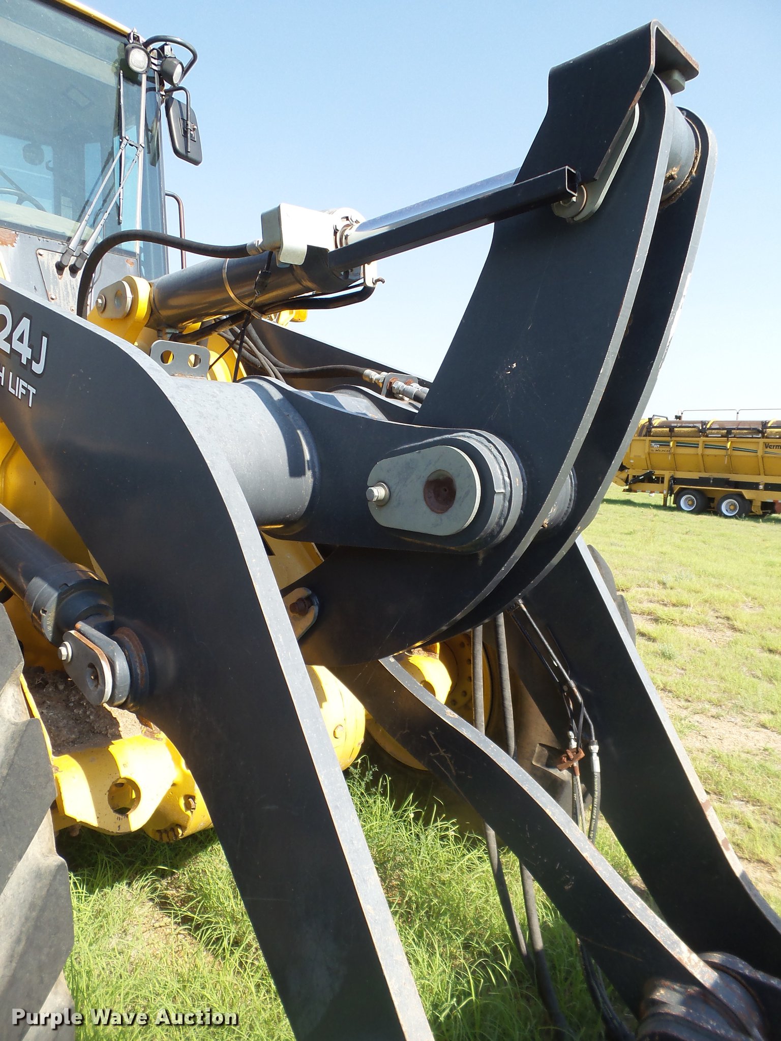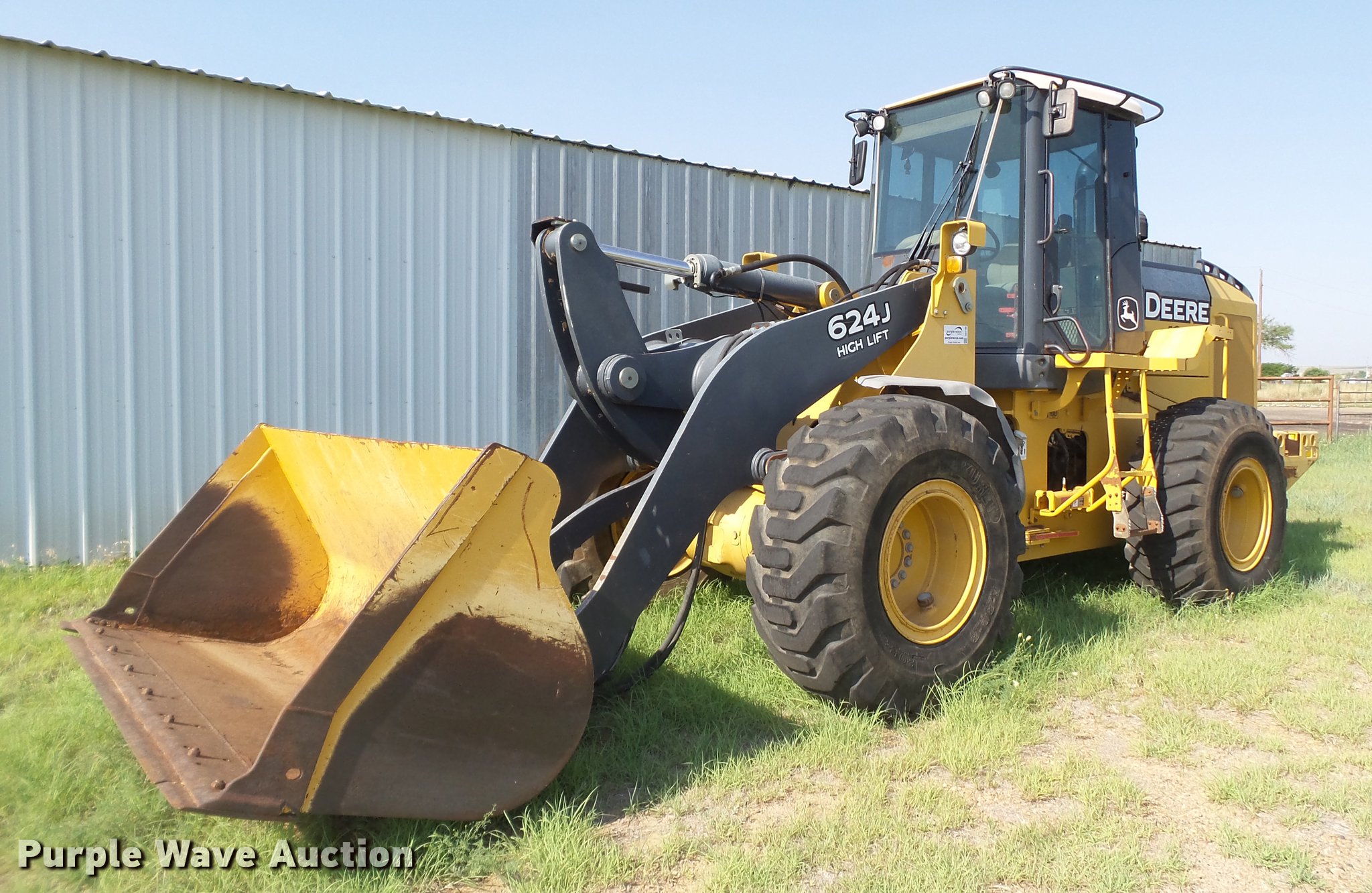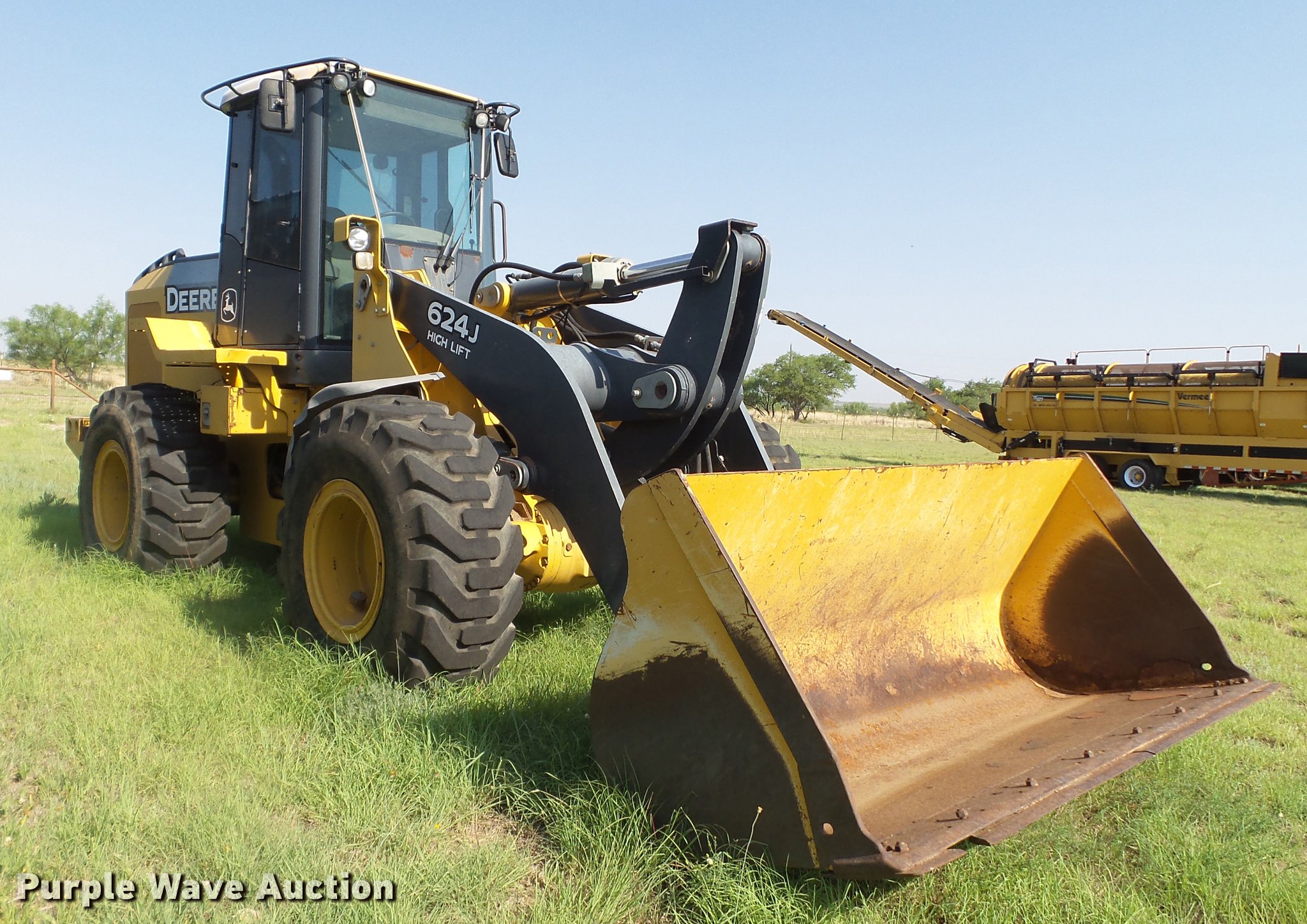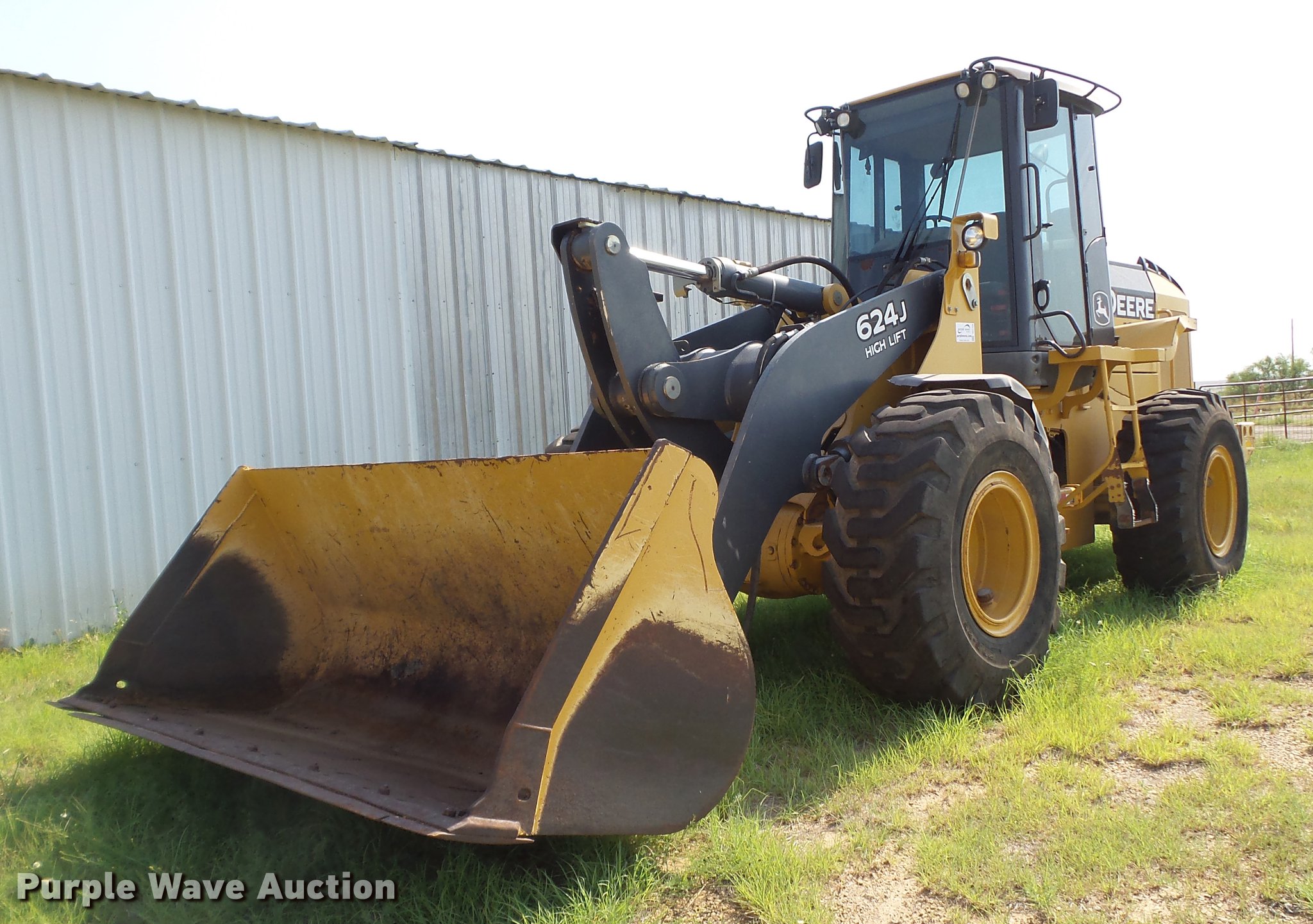 Purple Wave is selling a used Wheel Loader in Texas. This item is a 2007 John Deere 624J wheel loader with the following: 14,279 hours on meter, John Deere 6068L six cylinder turbo diesel engine, Serial SF6068L125197, Enclosed cab, AC and heat, AM/FM, Joystick bucket controls, Air suspension seat, Front and rear work lights, Backup alarm, John Deere AT340-353-544 bucket, 104"W, Bolt-on cutting edge, Three cu. yd. capacity, Self-leveling, Front auxiliary hydraulics, 20.5-25 tires, Serial DW624JH614977