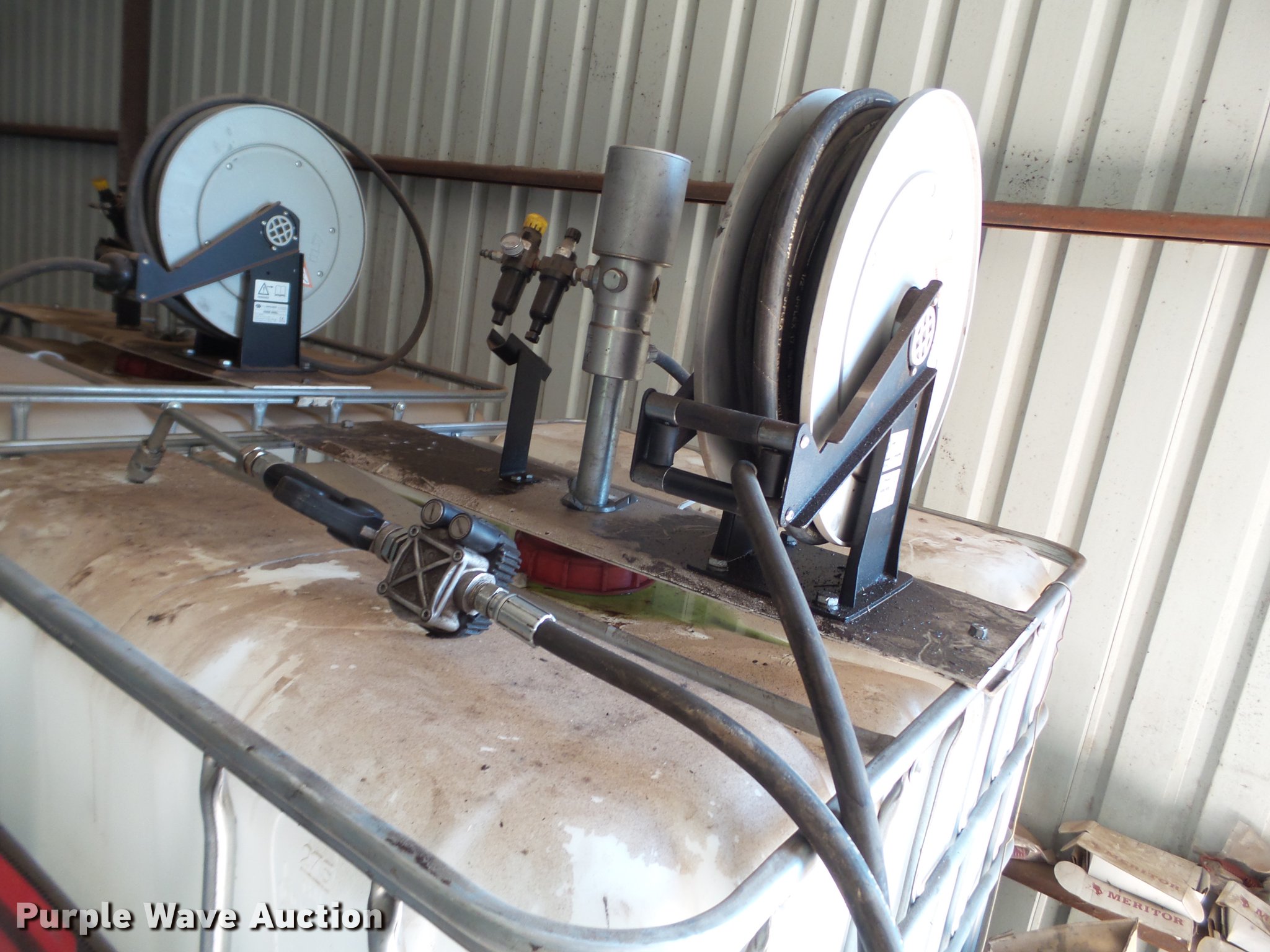 Purple Wave is selling a used Fuel and Lube in Texas. This item is a Shop oil service and containment system with the following: Hose reel, Metering nozzle, Air operated liquid dynamics oil pump, Ultra-1BC spill pallet plus with drain