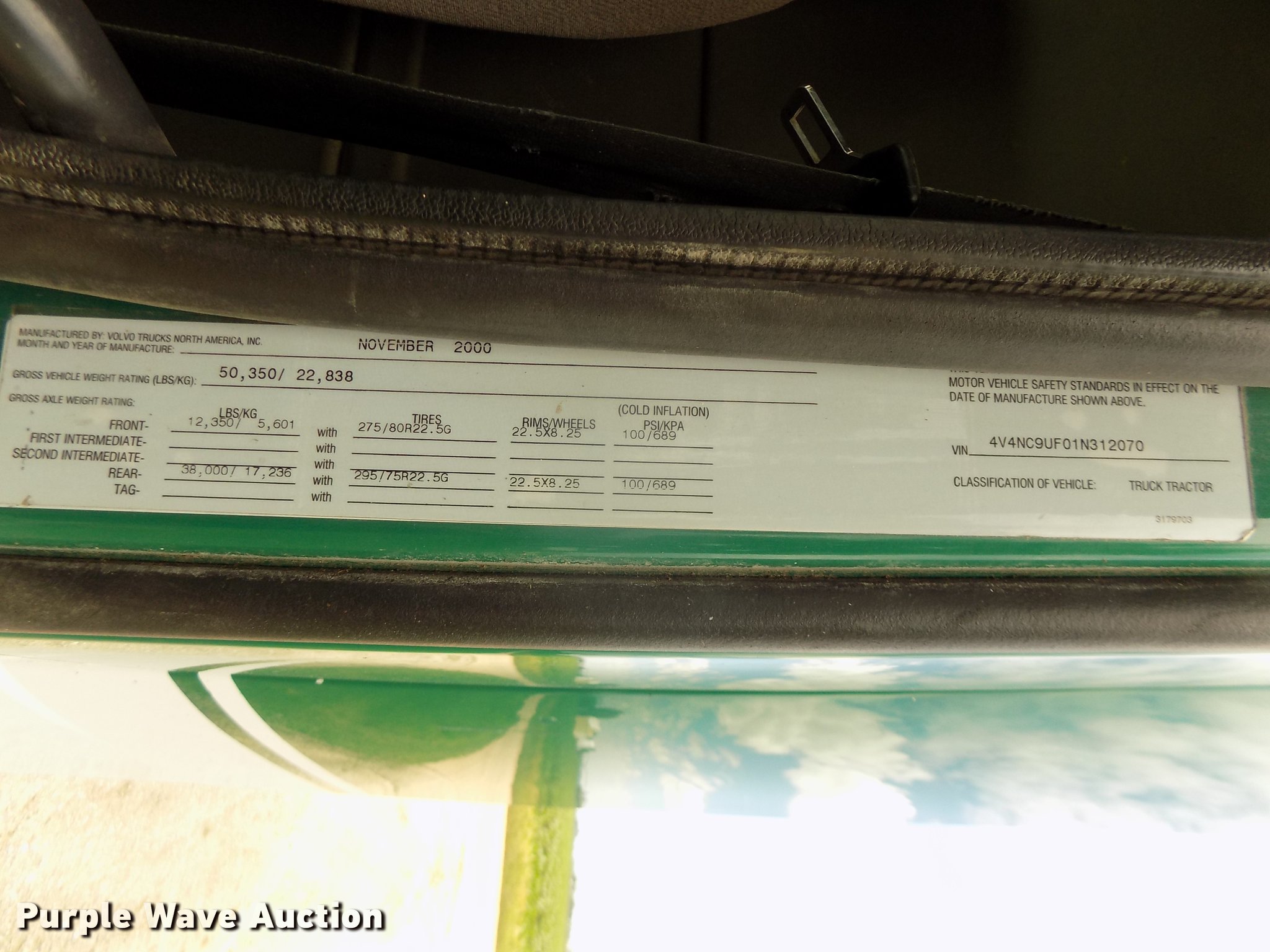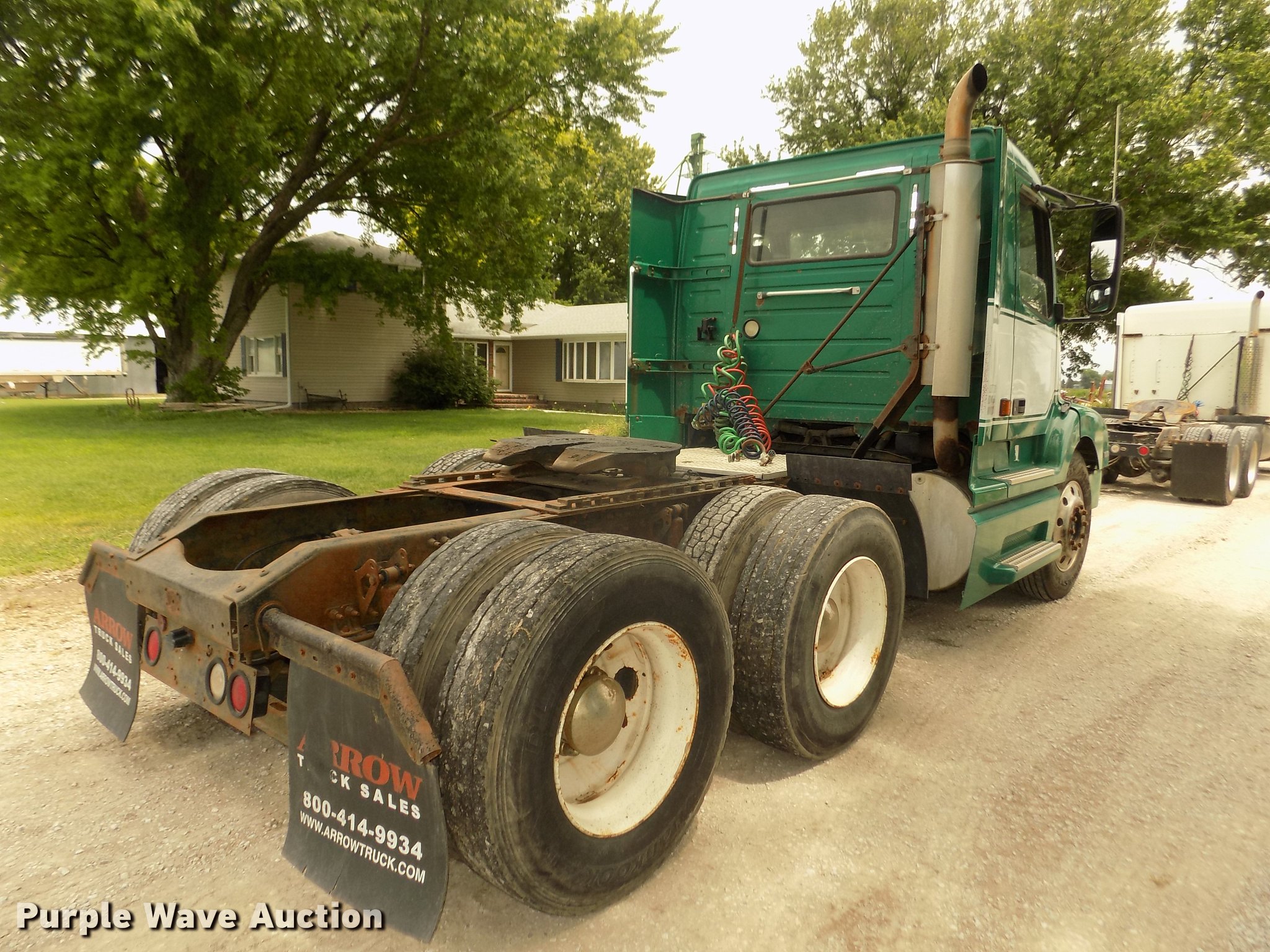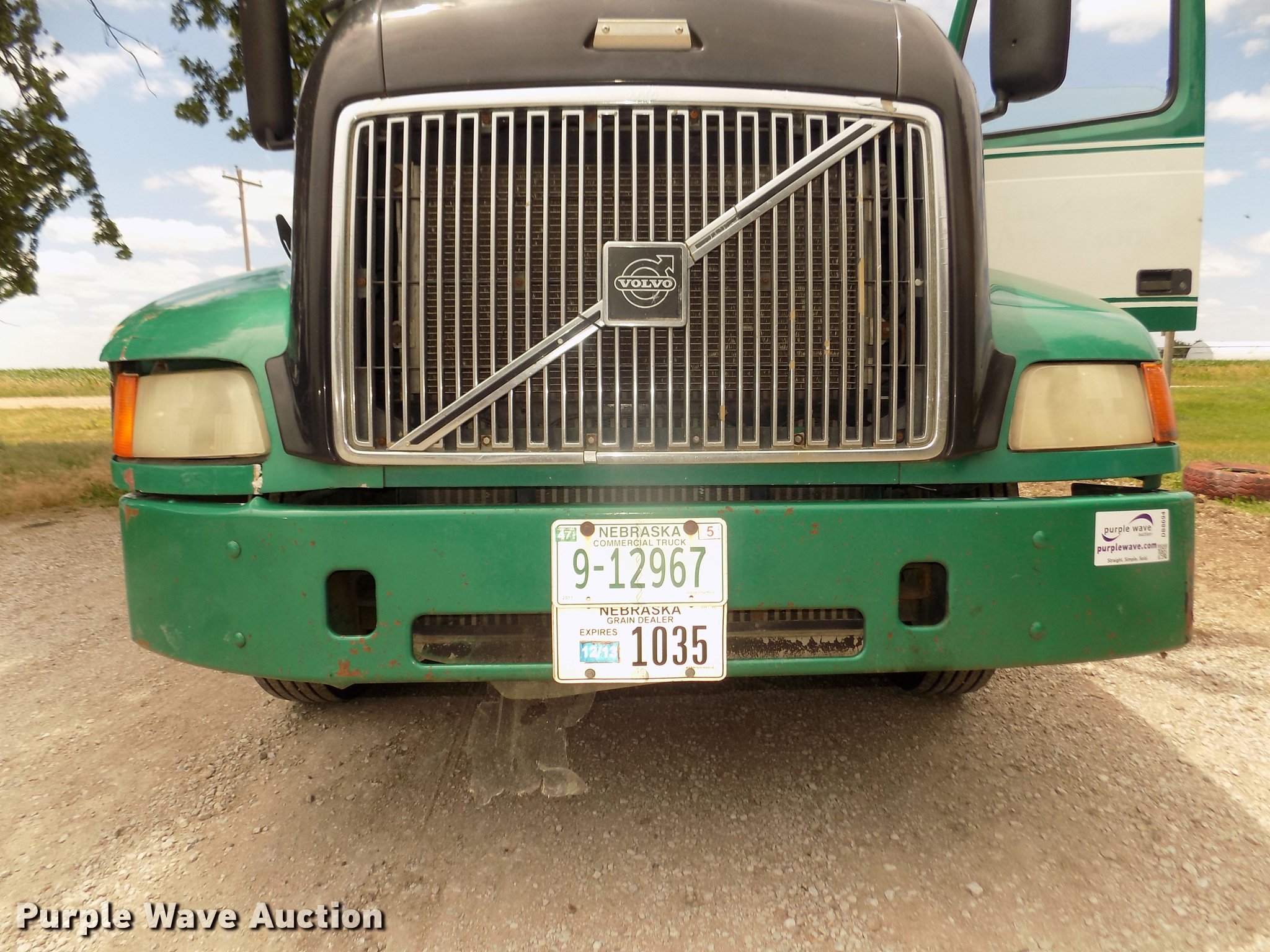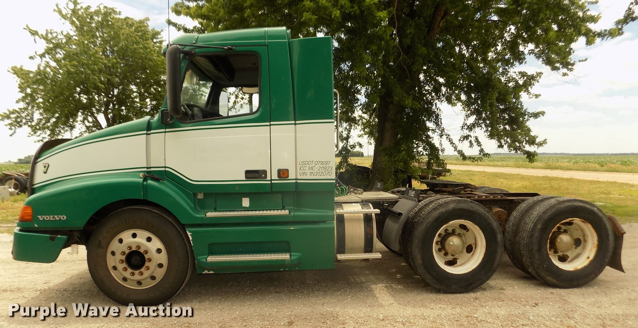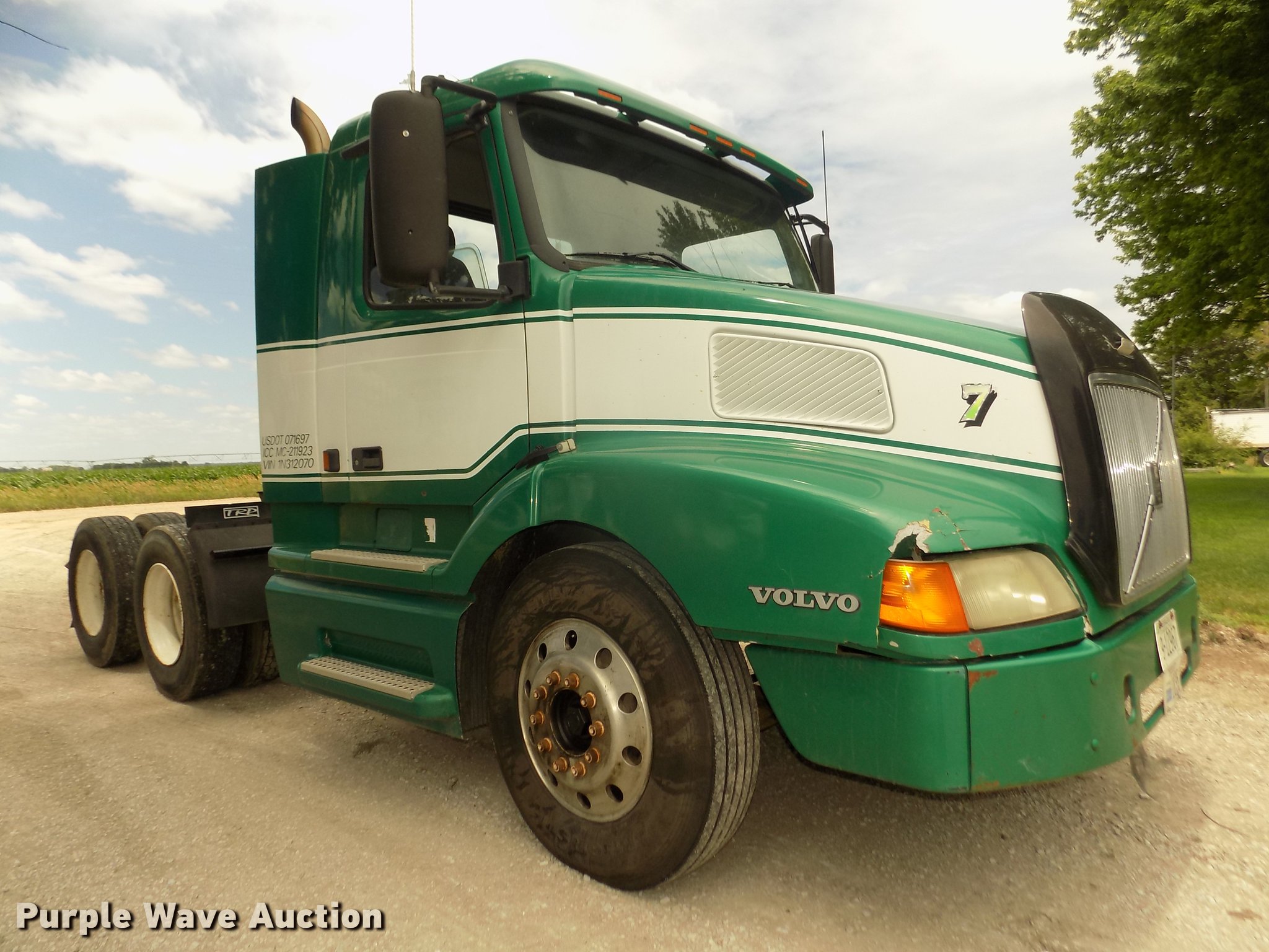 Purple Wave is selling a used Truck Tractor in Nebraska. This item is a 2001 Volvo VNL semi truck with the following: 696,510 miles on odometer, Cummins ISM 10.8L L6 turbo diesel engine, Manual transmission, Model RTL014913A135PE, Tandem axle, Inter-axle differential lock, AC and heat, AM/FM/CD, Power windows, Heated mirrors, Air suspension seat, Air ride cab, Block heater, Dump valves, Cab extenders, Overhead storage, Exterior visor, Single rear exhaust stack, Aluminum deck plate, Sliding fifth wheel plate, Quarter fenders, Mud flaps, 4:11 gear ratio, Air suspension, Air brakes, 160" wheelbase, Aluminum front wheels, Steel rear wheels, 11R24.5 tires, GVWR 50,350 lbs, FAWR 12,350 lbs, IAWR 19,000 lbs, RAWR 19,000 lbs, ABS light on, Check brake light on, Hood release handle bracket loose, Cracked windshield, Unit# 7