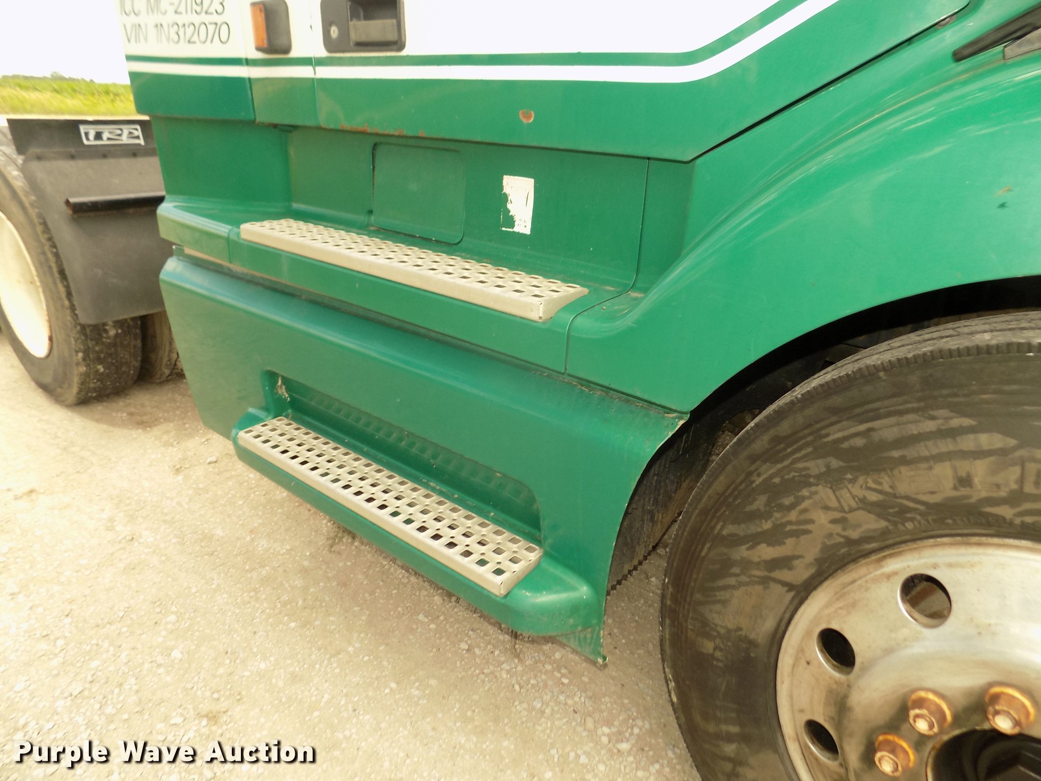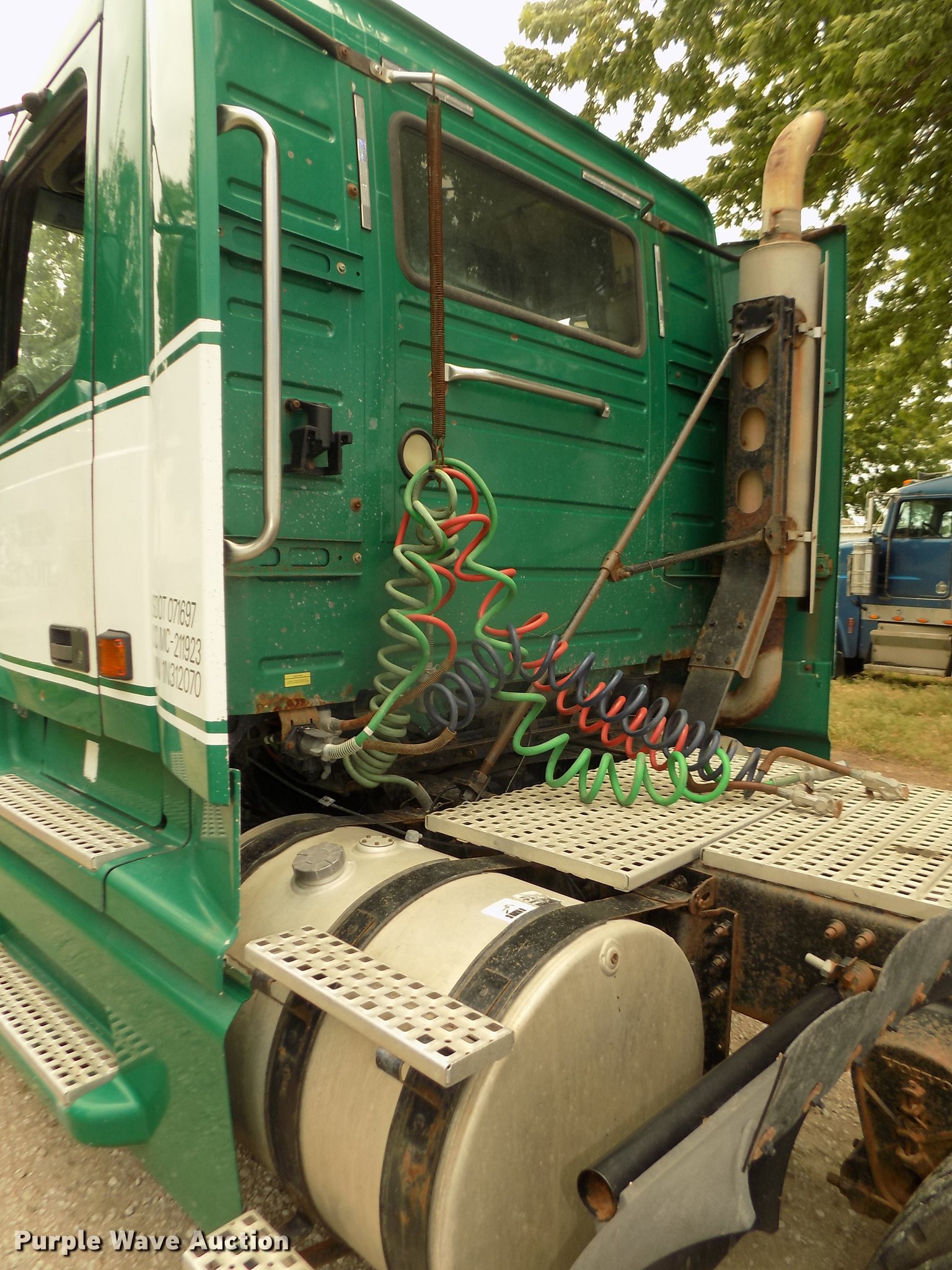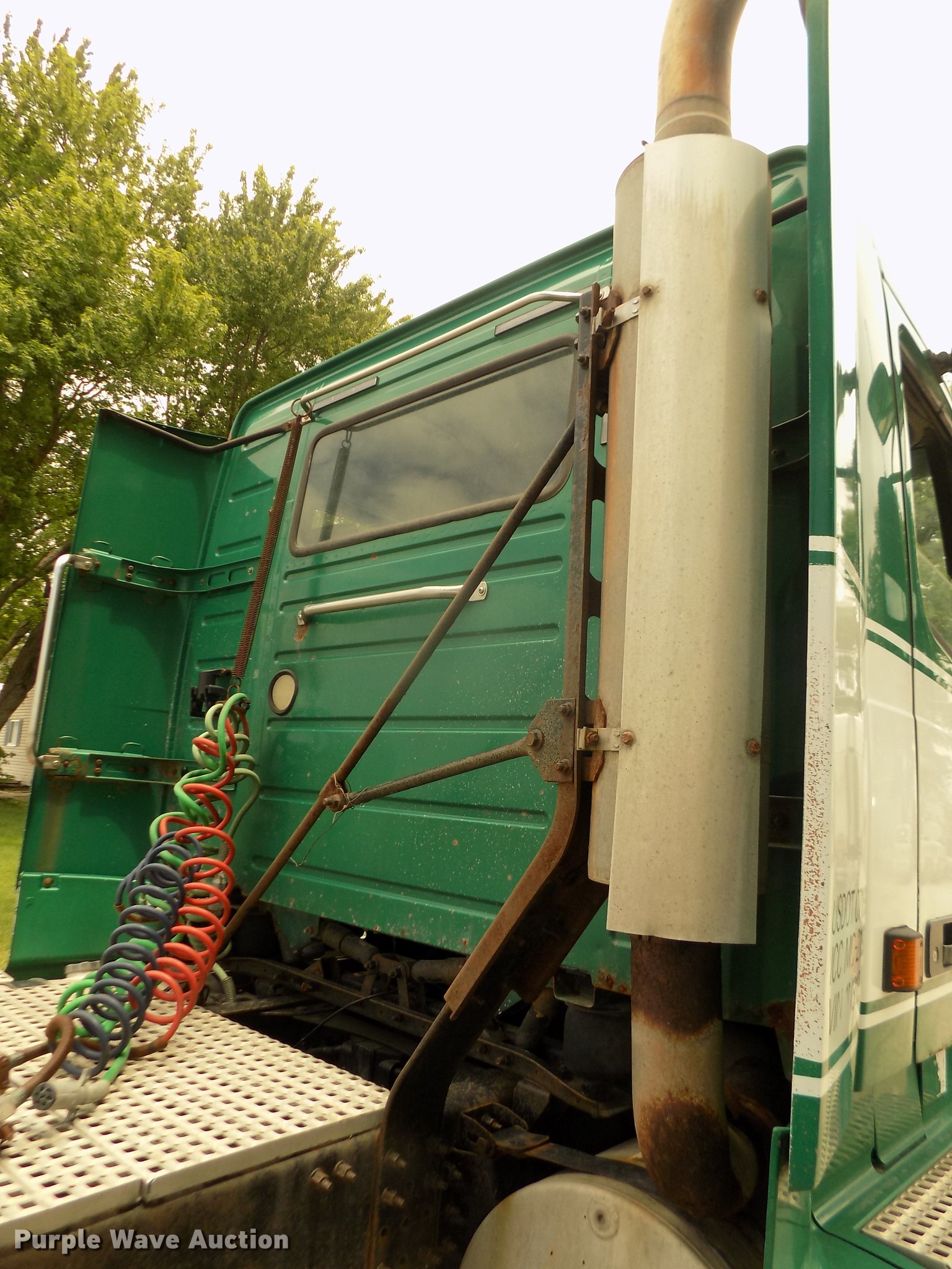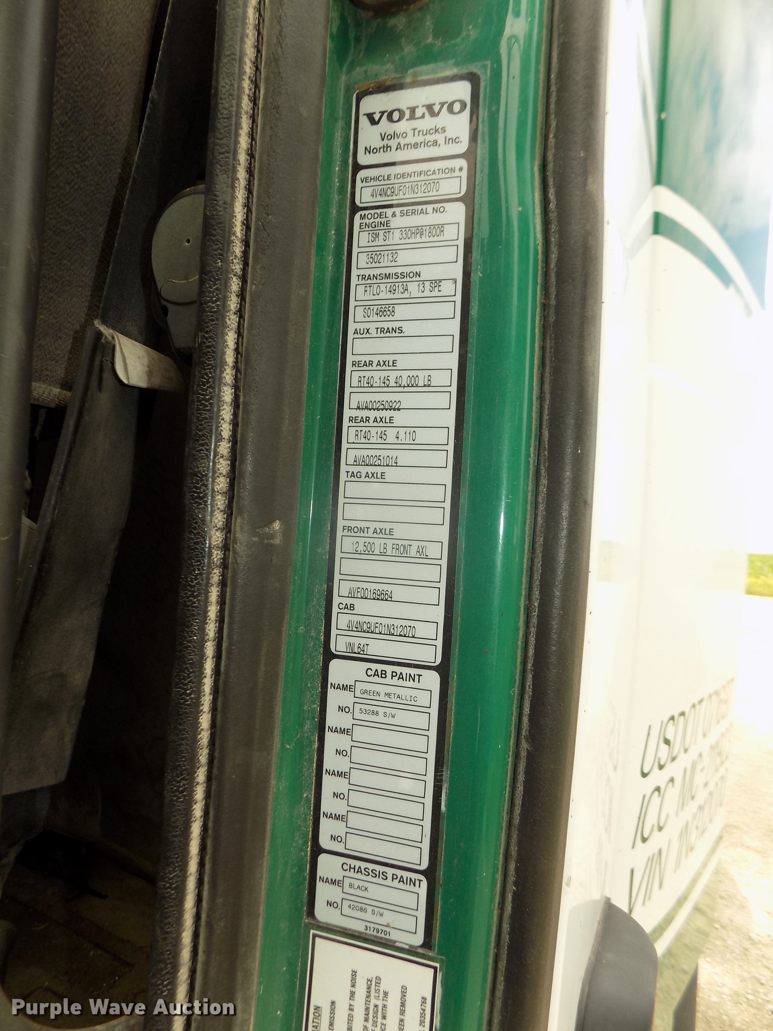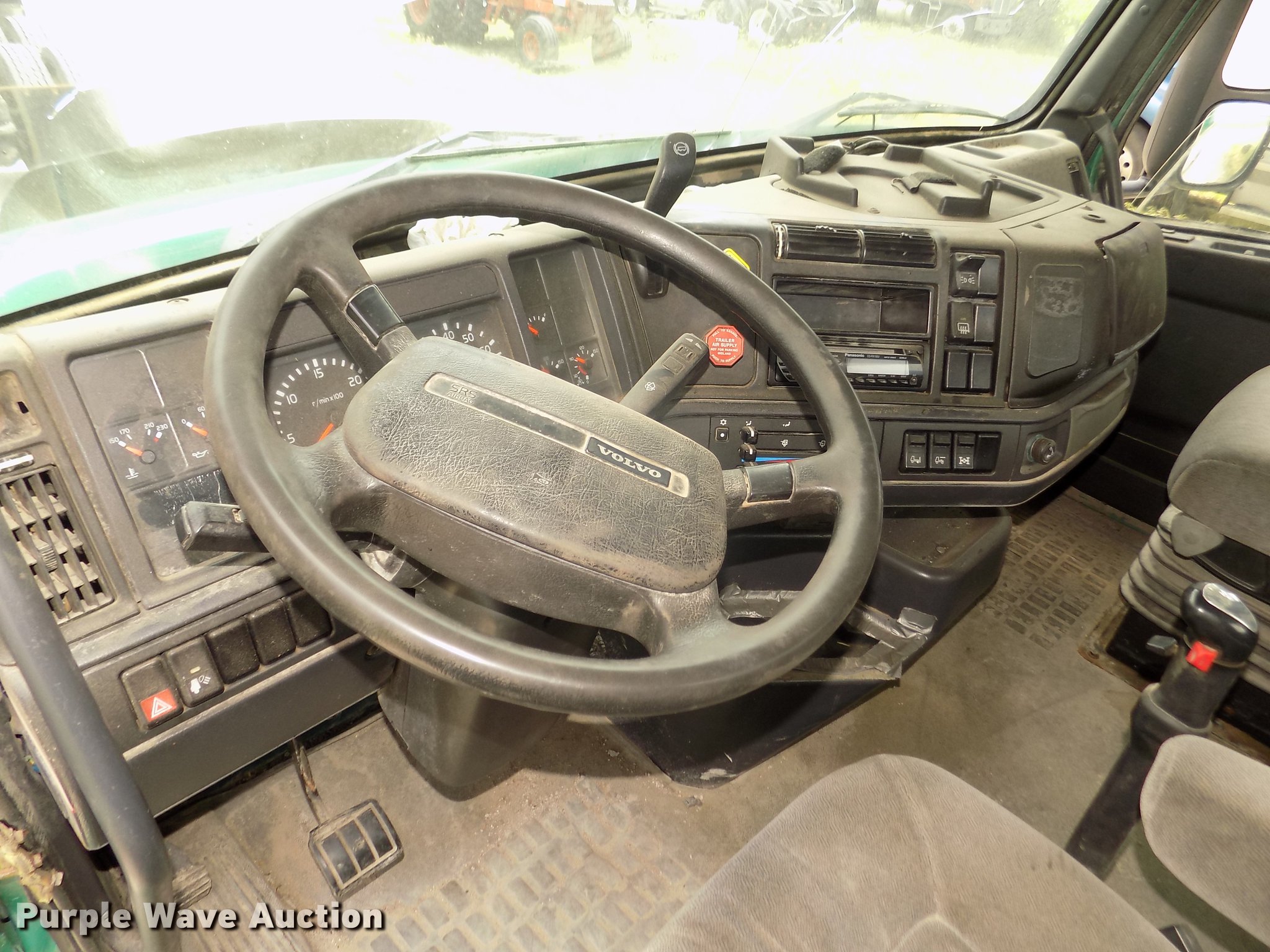 Purple Wave is selling a used Truck Tractor in Nebraska. This item is a 2001 Volvo VNL semi truck with the following: 696,510 miles on odometer, Cummins ISM 10.8L L6 turbo diesel engine, Manual transmission, Model RTL014913A135PE, Tandem axle, Inter-axle differential lock, AC and heat, AM/FM/CD, Power windows, Heated mirrors, Air suspension seat, Air ride cab, Block heater, Dump valves, Cab extenders, Overhead storage, Exterior visor, Single rear exhaust stack, Aluminum deck plate, Sliding fifth wheel plate, Quarter fenders, Mud flaps, 4:11 gear ratio, Air suspension, Air brakes, 160" wheelbase, Aluminum front wheels, Steel rear wheels, 11R24.5 tires, GVWR 50,350 lbs, FAWR 12,350 lbs, IAWR 19,000 lbs, RAWR 19,000 lbs, ABS light on, Check brake light on, Hood release handle bracket loose, Cracked windshield, Unit# 7