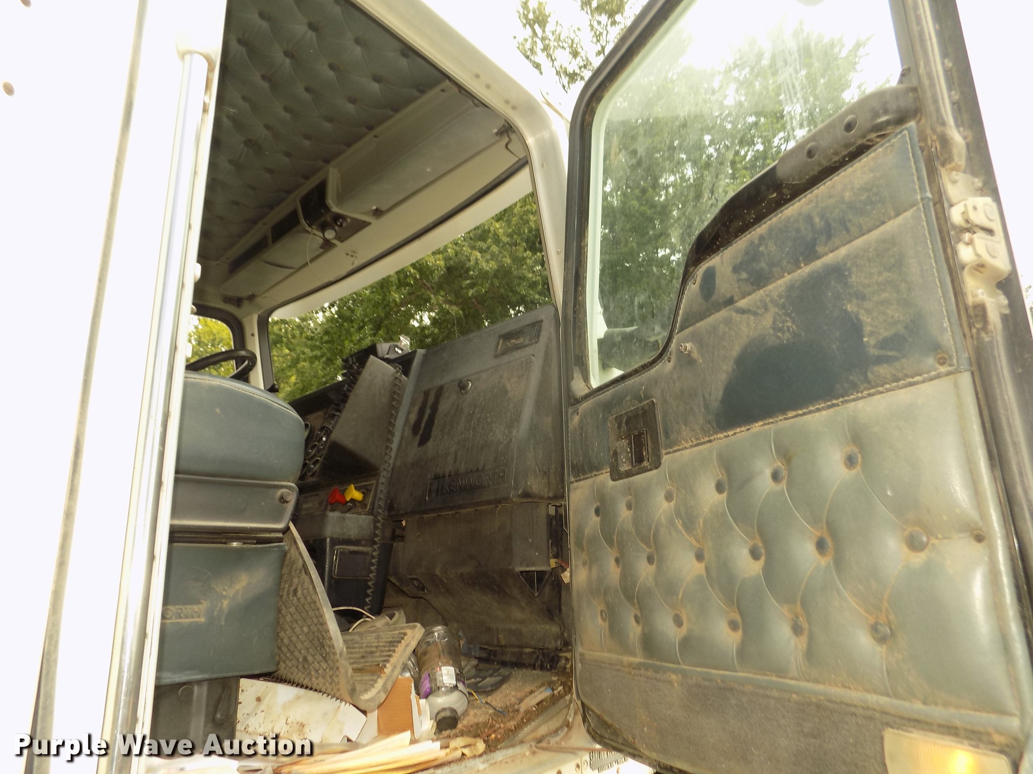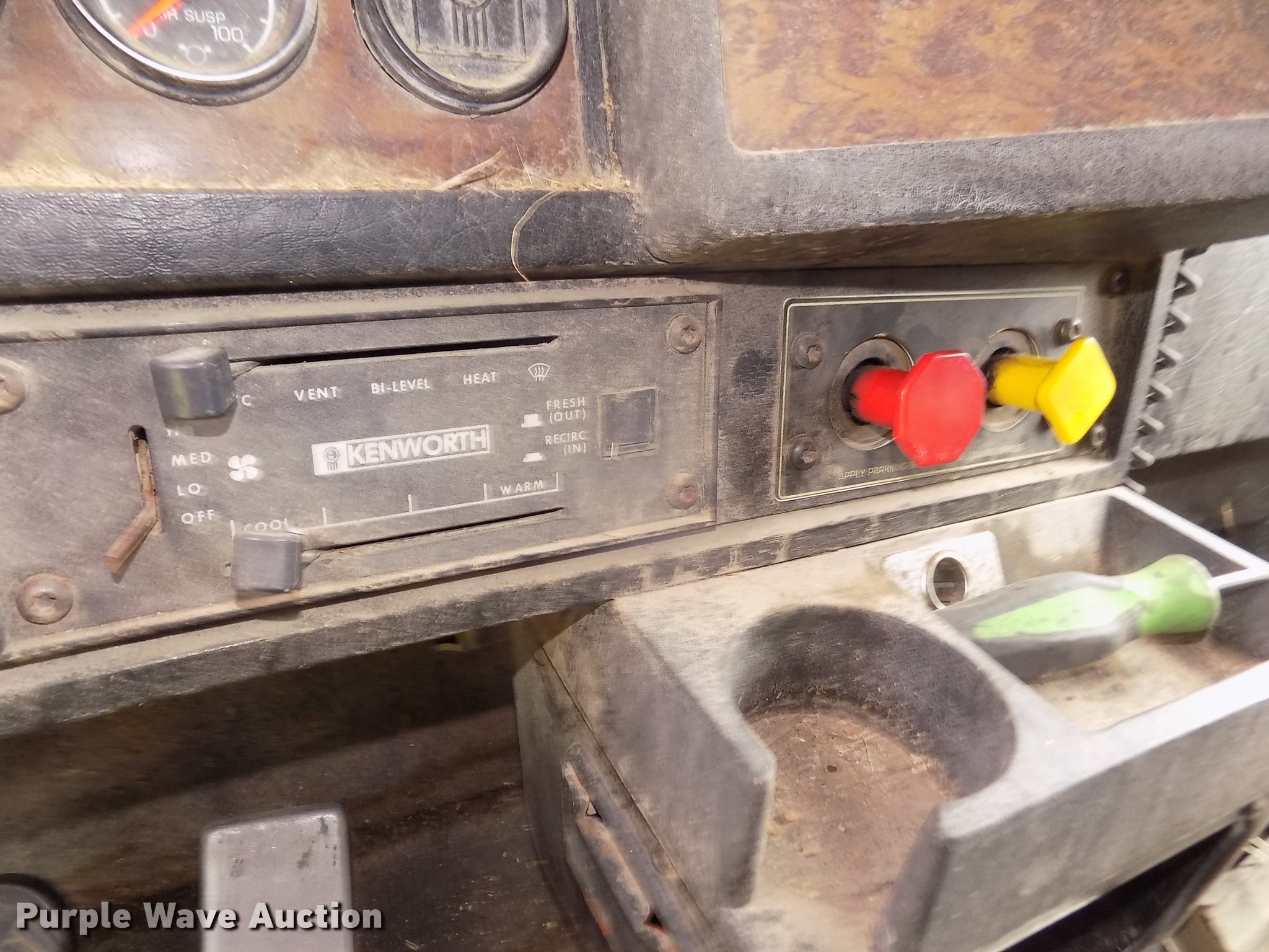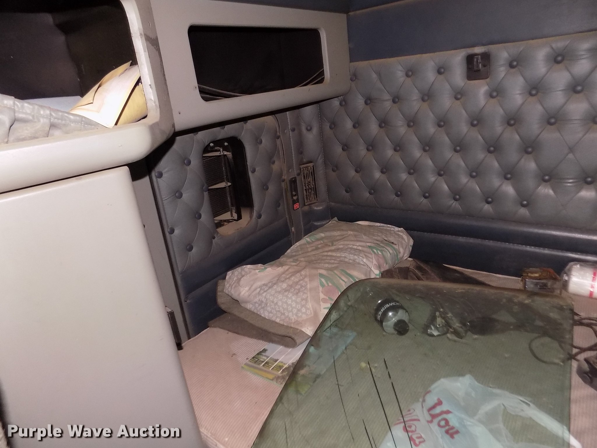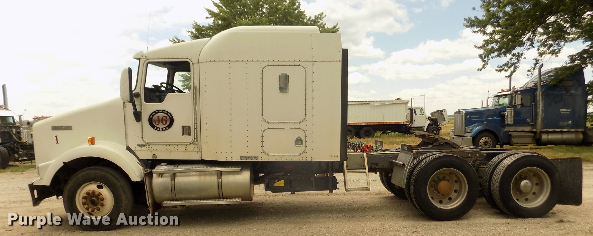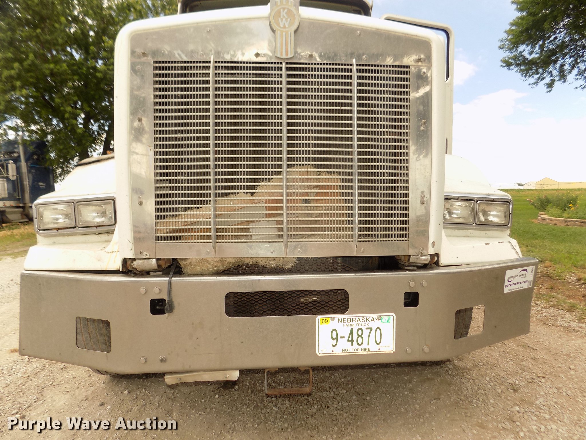 Purple Wave is selling a used Truck Tractor in Nebraska. This item is a 1996 Kenworth T800B semi truck with the following: 889,366 miles on odometer, Detroit Diesel Series 60 12.7L L6 turbo diesel engine, Manual transmission, Tandem axle, Inter-axle differential lock, AC and heat, Cruise, AM/FM/CD, Power and heated mirrors, Air suspension seat, Motorola CM200 radios, Block heater, Cab extenders, AeroCab sleeper, 60", Single bed, Rear climate control, Dump valves, Chrome bumper, Single rear exhaust stack, Aluminum deck plate, Sliding fifth wheel plate, Dual fuel tanks, Quarter fenders, Mud flaps, Air suspension, Air brakes, Engine brake, 240" wheelbase, Steel front wheels, Aluminum rear wheels, 11R22.5 front tires, 285/75R24.5 rear tires, Windshield missing, Steering wheel bent