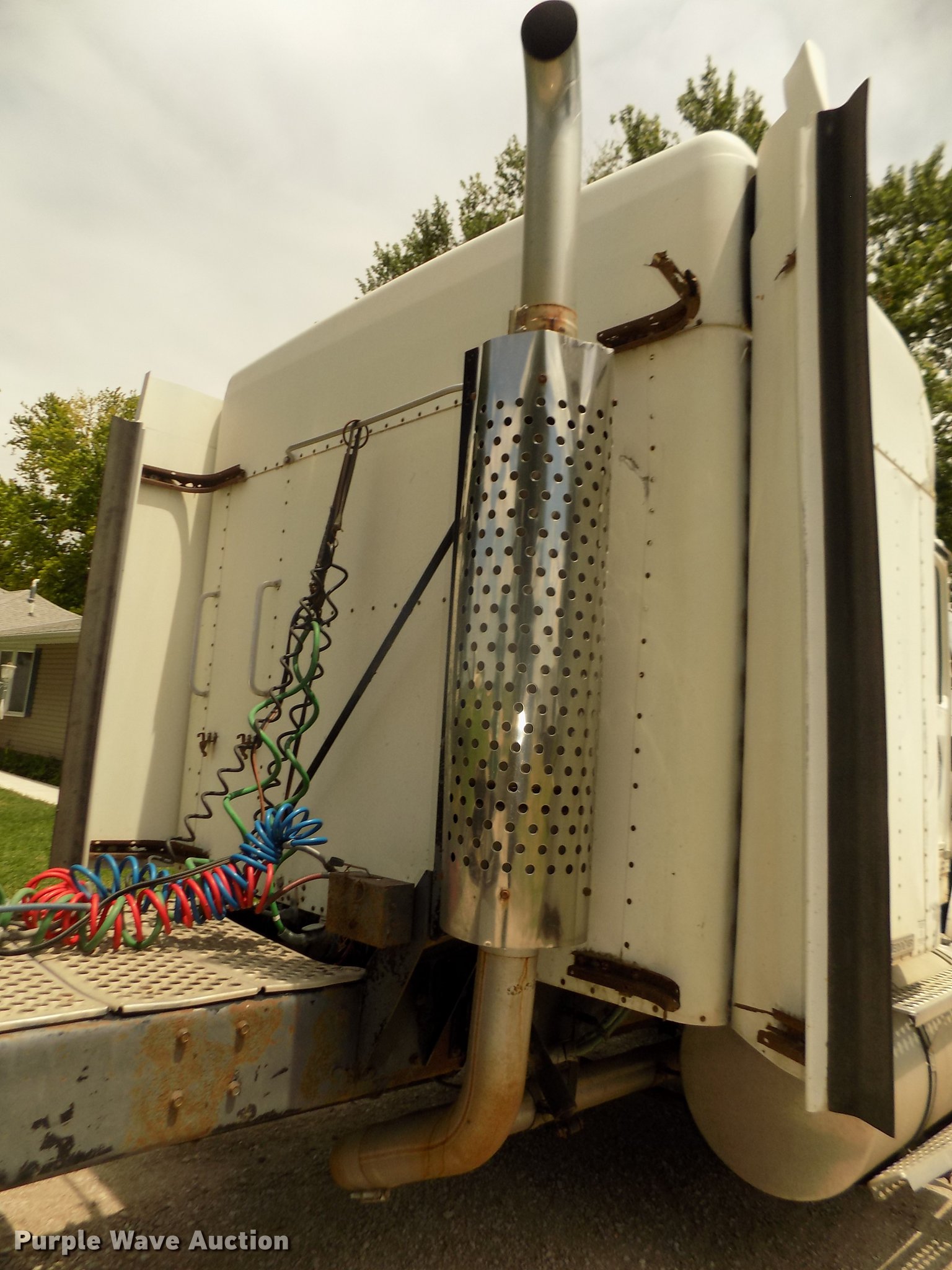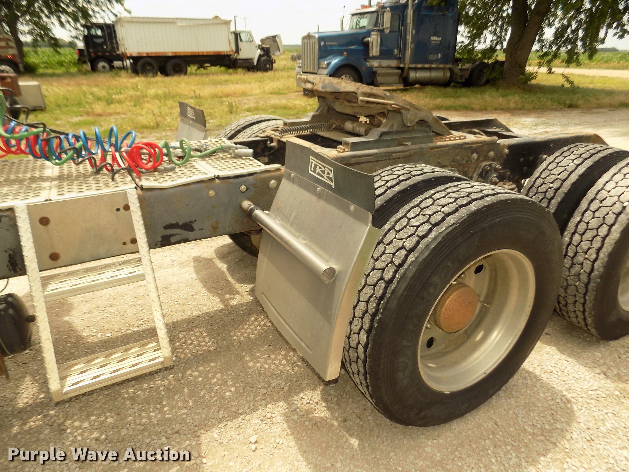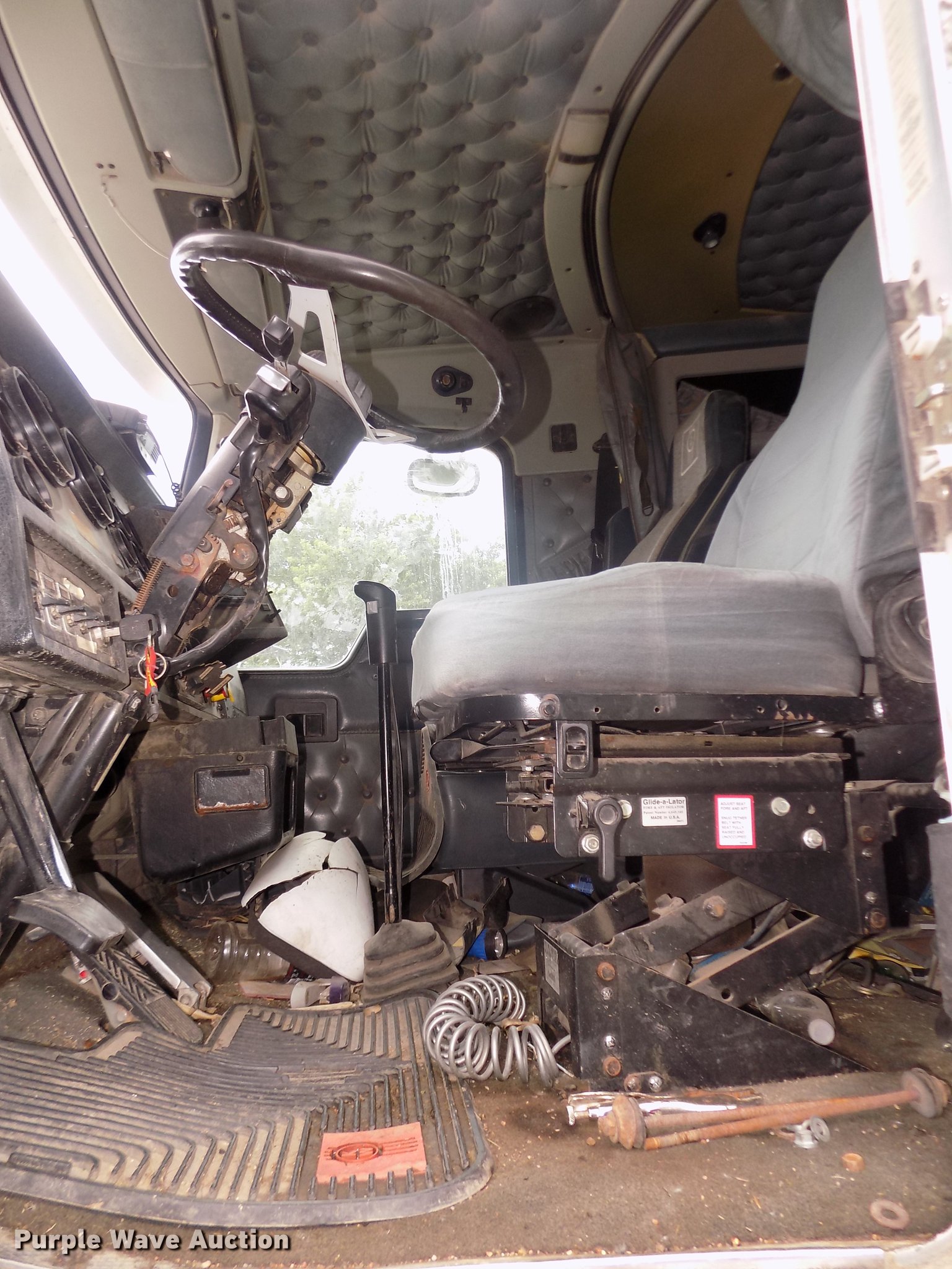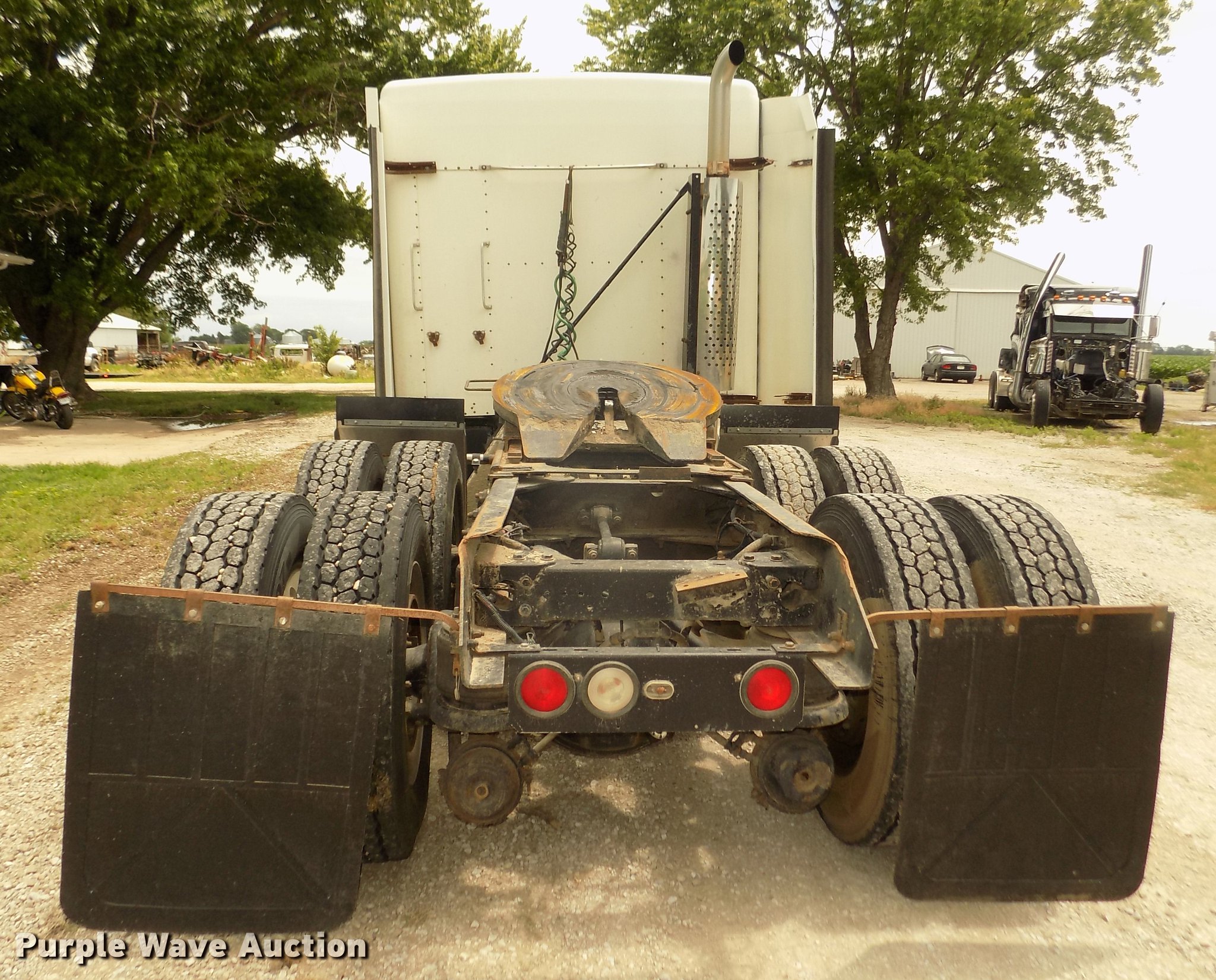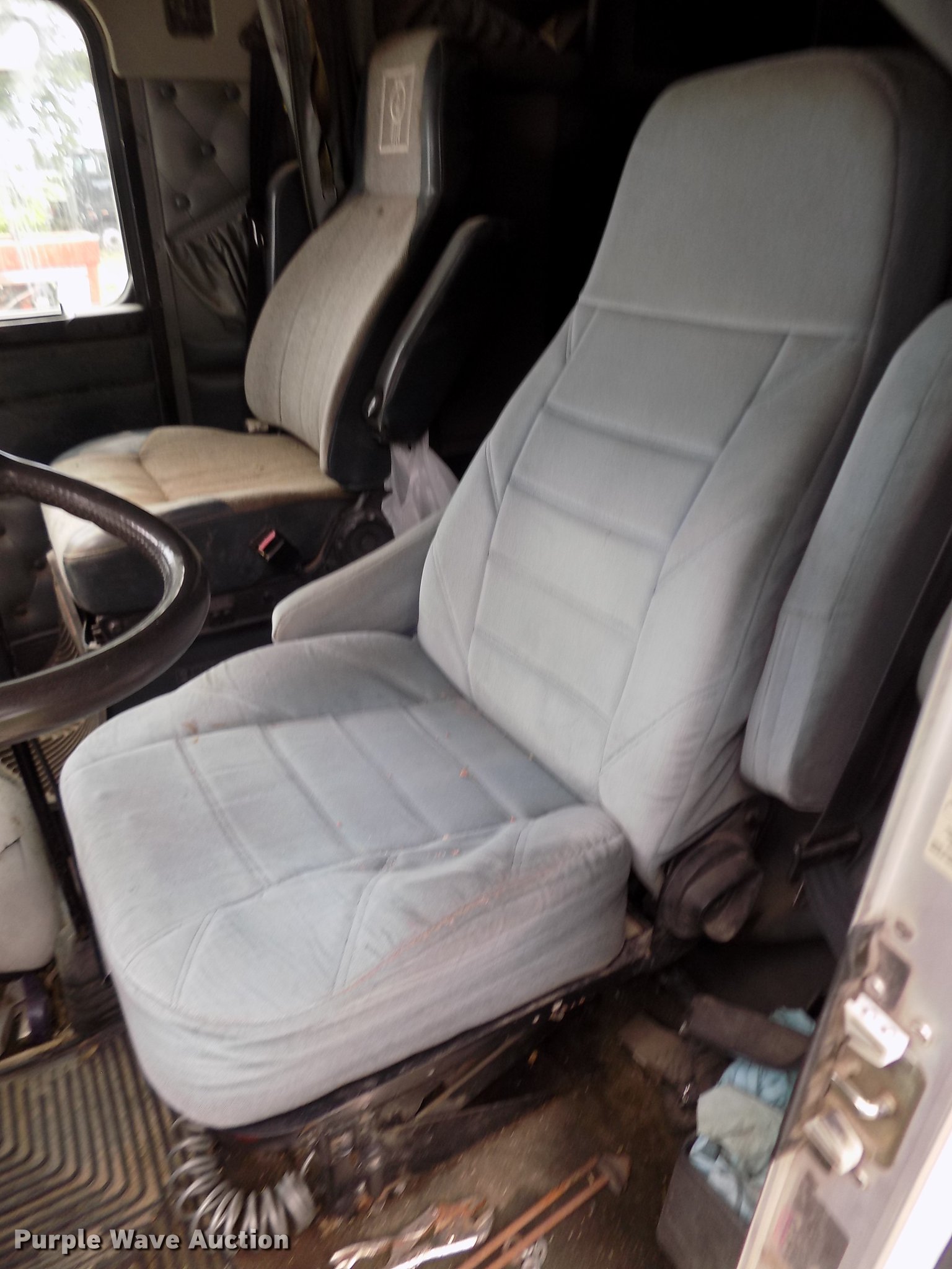 Purple Wave is selling a used Truck Tractor in Nebraska. This item is a 1996 Kenworth T800B semi truck with the following: 889,366 miles on odometer, Detroit Diesel Series 60 12.7L L6 turbo diesel engine, Manual transmission, Tandem axle, Inter-axle differential lock, AC and heat, Cruise, AM/FM/CD, Power and heated mirrors, Air suspension seat, Motorola CM200 radios, Block heater, Cab extenders, AeroCab sleeper, 60", Single bed, Rear climate control, Dump valves, Chrome bumper, Single rear exhaust stack, Aluminum deck plate, Sliding fifth wheel plate, Dual fuel tanks, Quarter fenders, Mud flaps, Air suspension, Air brakes, Engine brake, 240" wheelbase, Steel front wheels, Aluminum rear wheels, 11R22.5 front tires, 285/75R24.5 rear tires, Windshield missing, Steering wheel bent