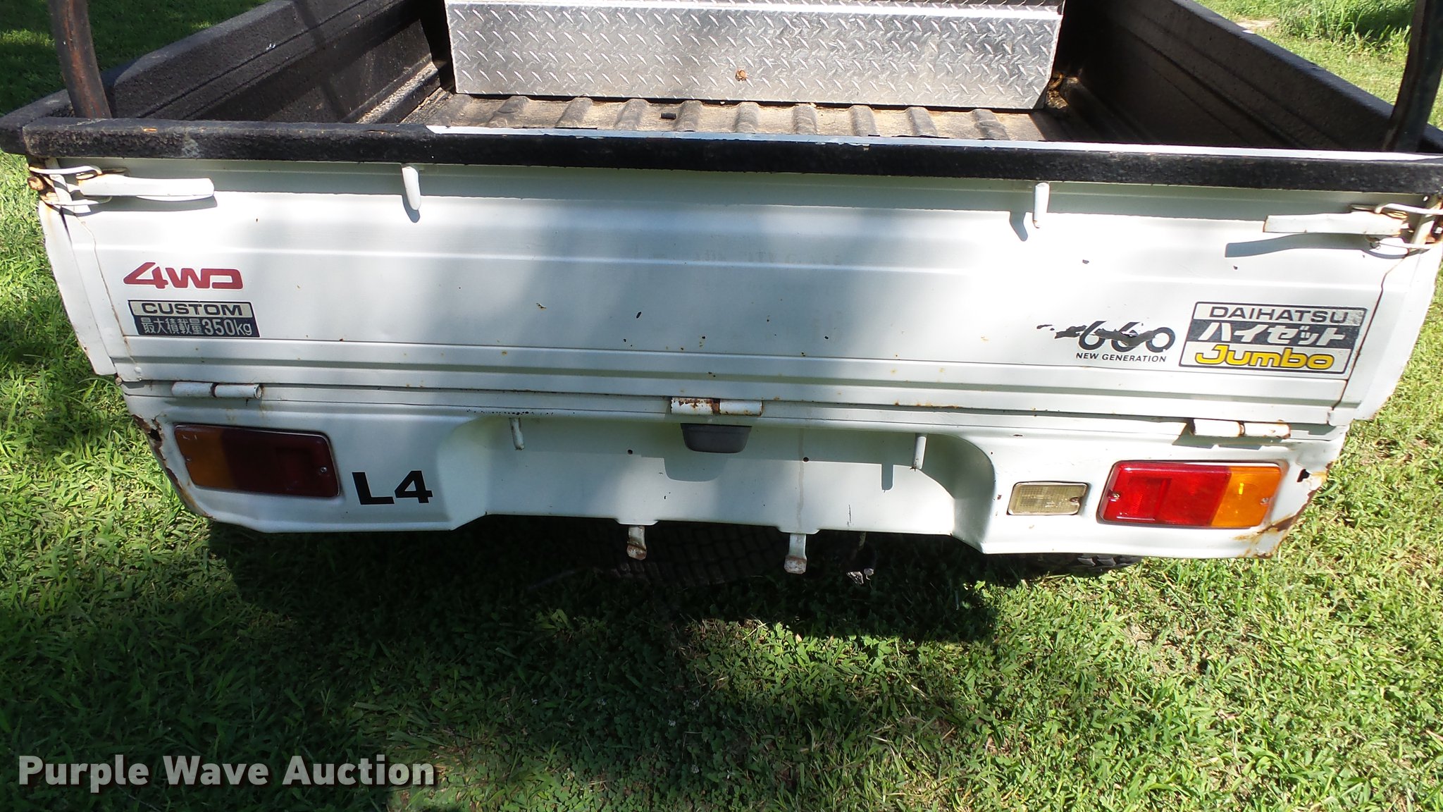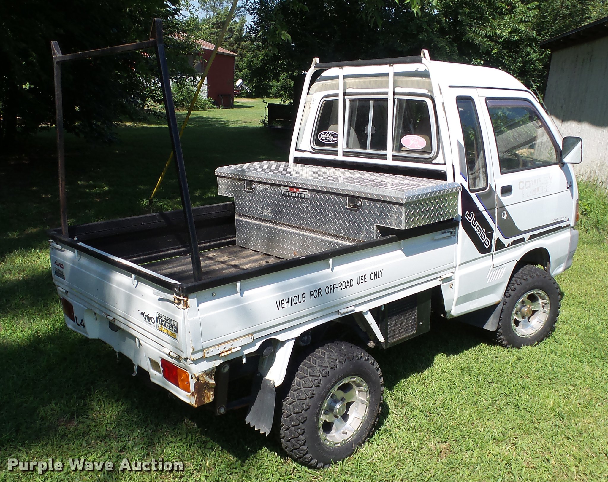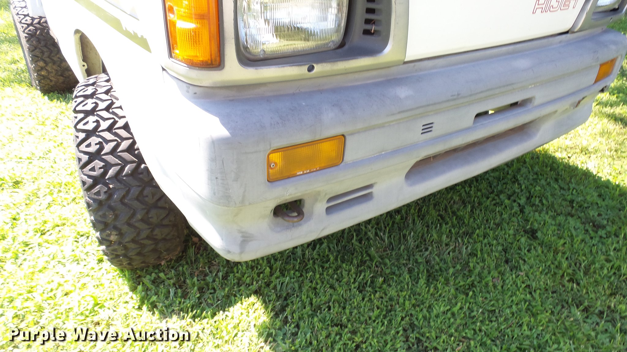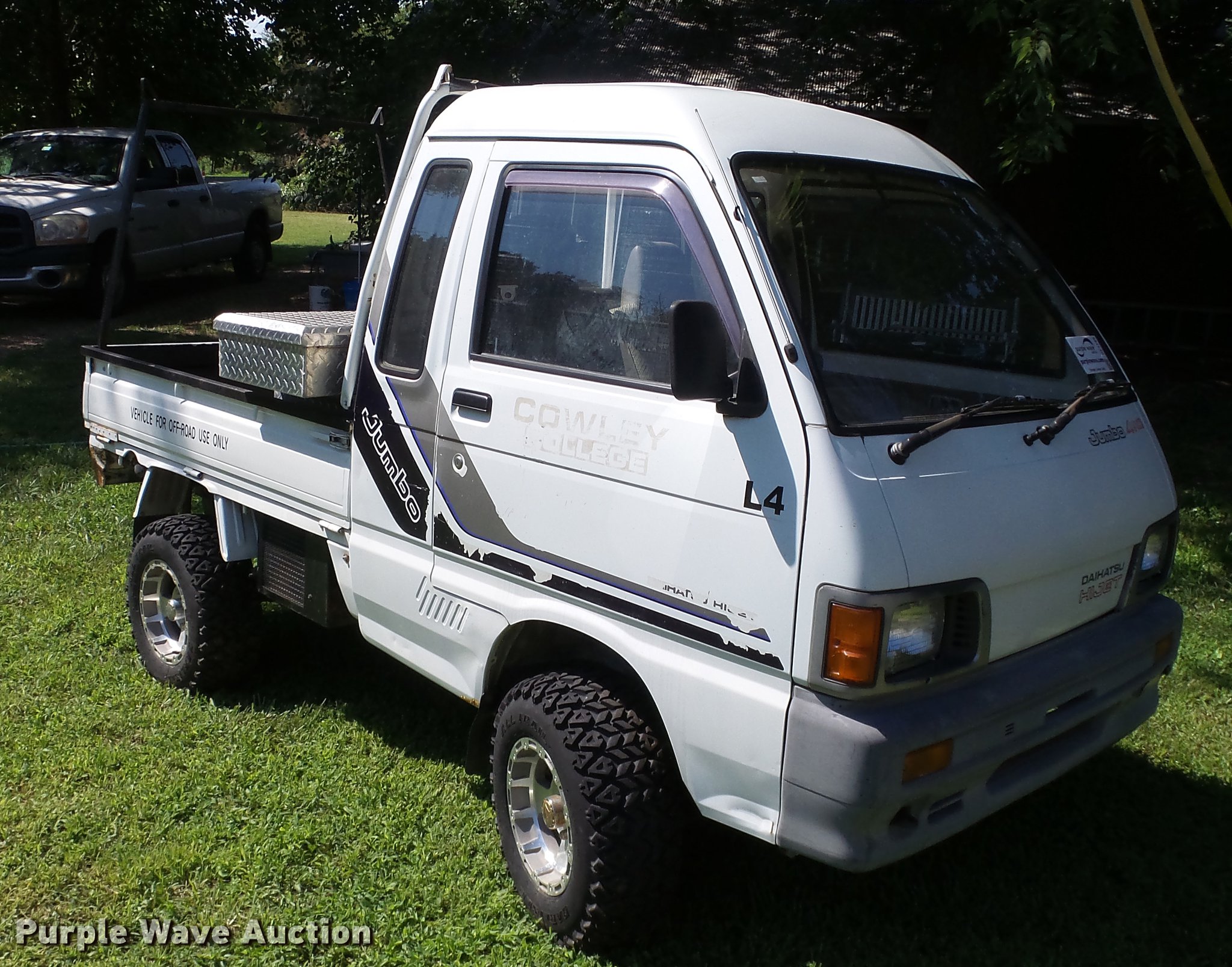 Purple Wave is selling a used Utility Vehicle in Kansas. This item is a 1991 Daihatsu HiJet mini truck with the following: 72,563 miles on odometer, Gas engine, Five speed manual transmission, Four wheel drive, Heat, AM/FM, Cloth interior, 66" x 54" bed, Toolbox, 23x8.00-12 tires